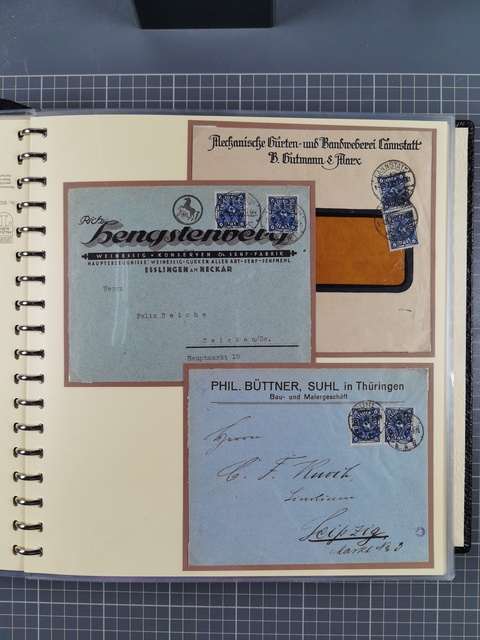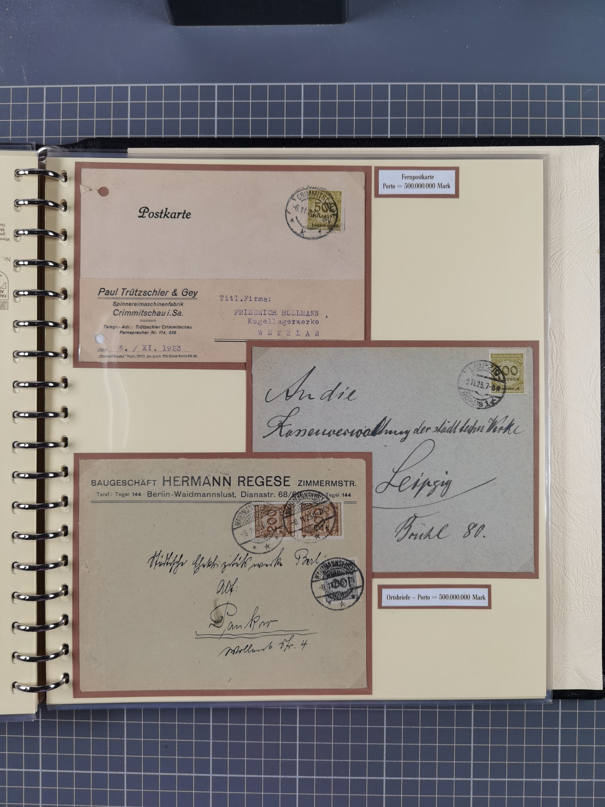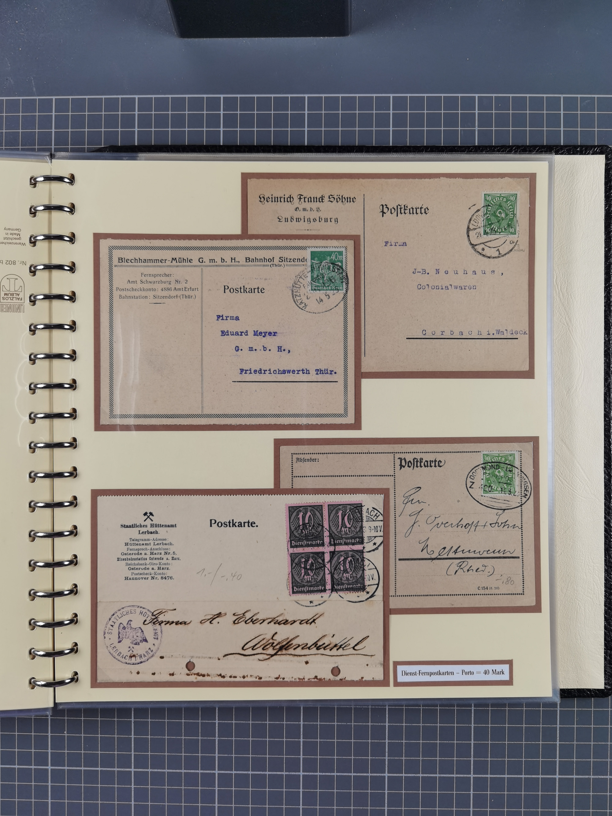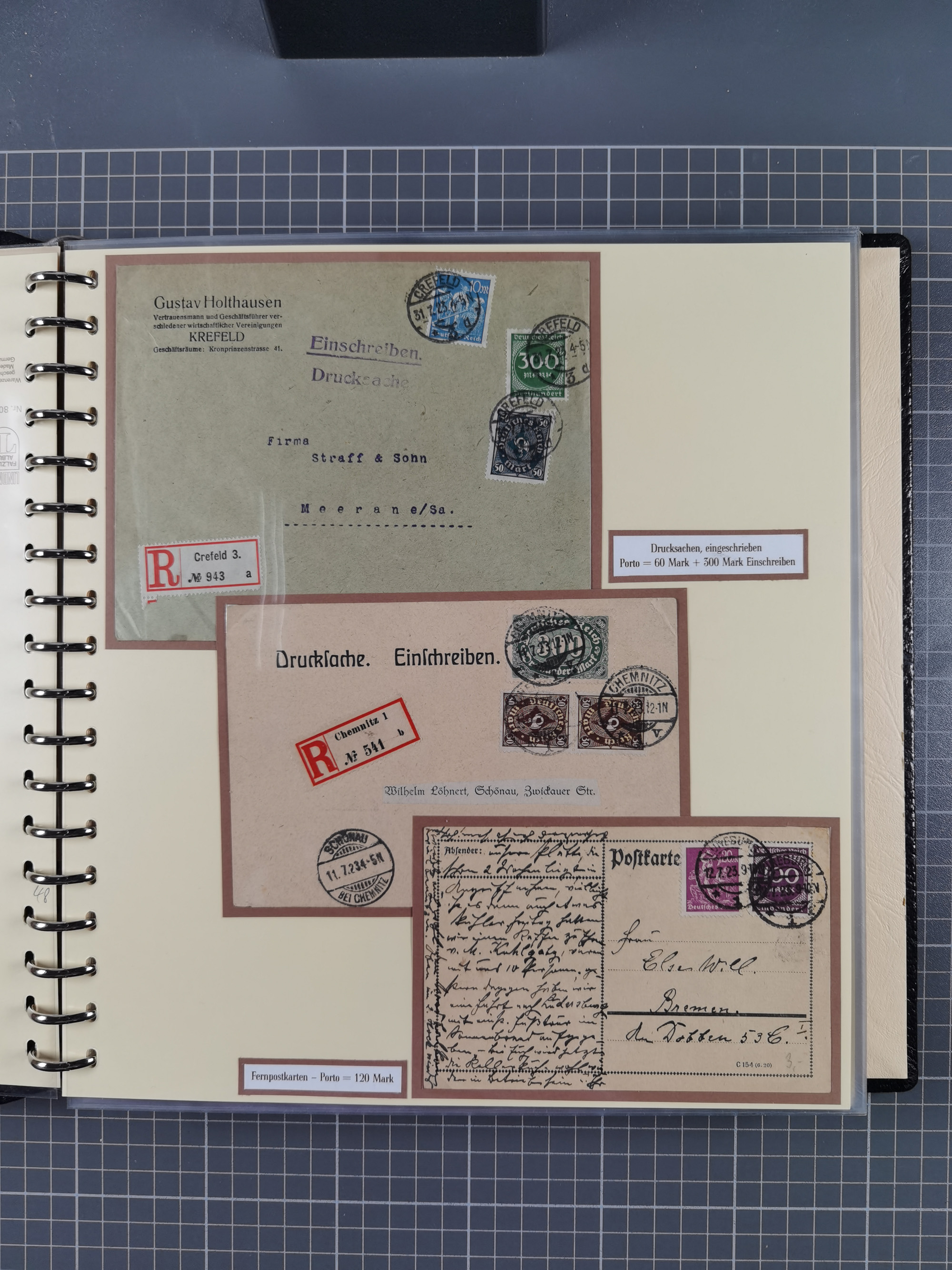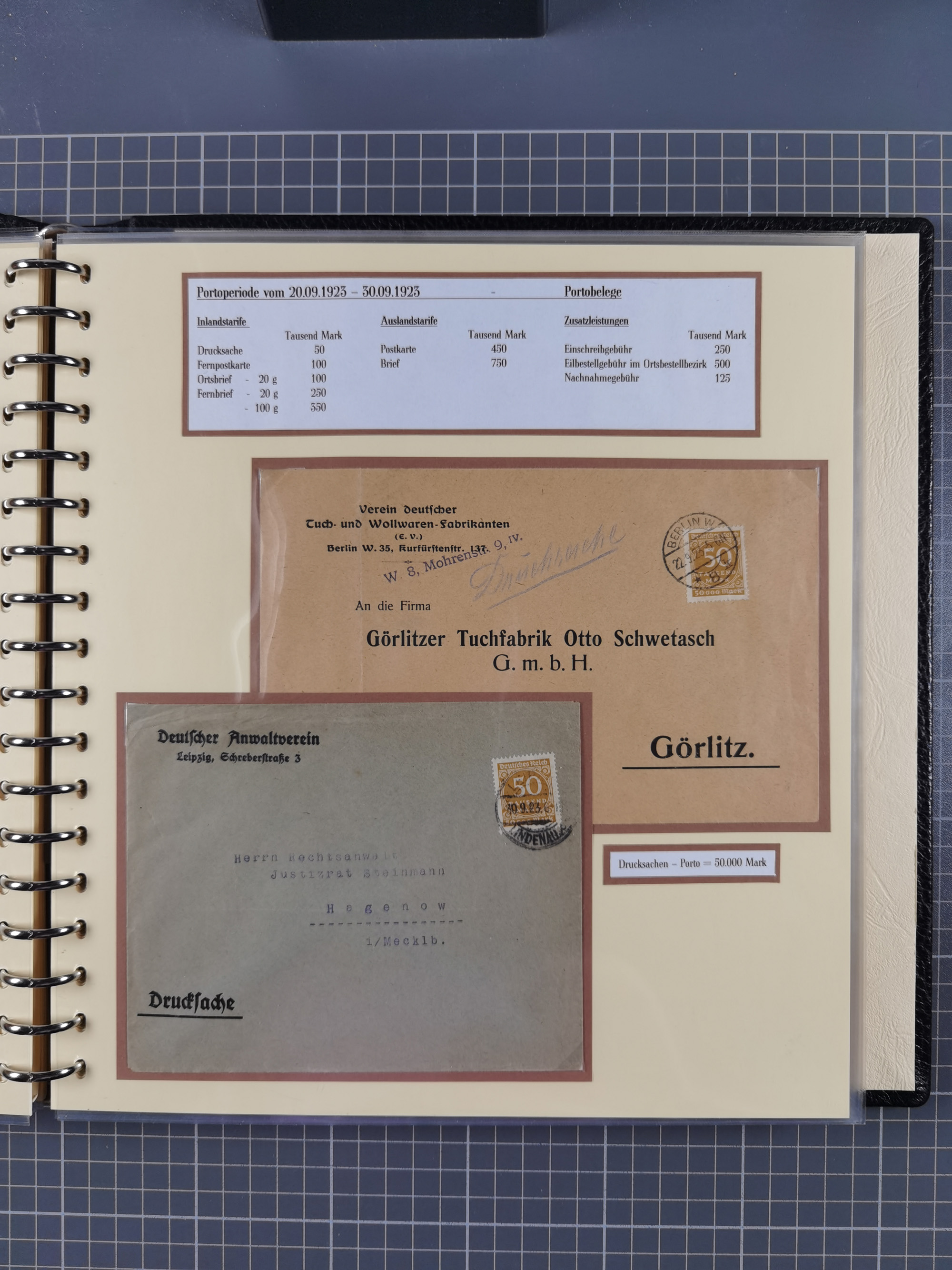 1872/1923, umfangreiche Sammlung mit ca. 800 Briefen,Karten und Ganzsachen. Am Anfang mit kleinem Teil “Hufeisentstempel”, ansonsten liegt der Schwerpunkt bei Infla mit Einzel- und Mehrfachfrankaturen, R-Briefen, Auslandspost, viel Hochinflation mit Dezember-Briefen und Portostufen. Alles auf selbst gestalteten Albenblättern in10 Alben