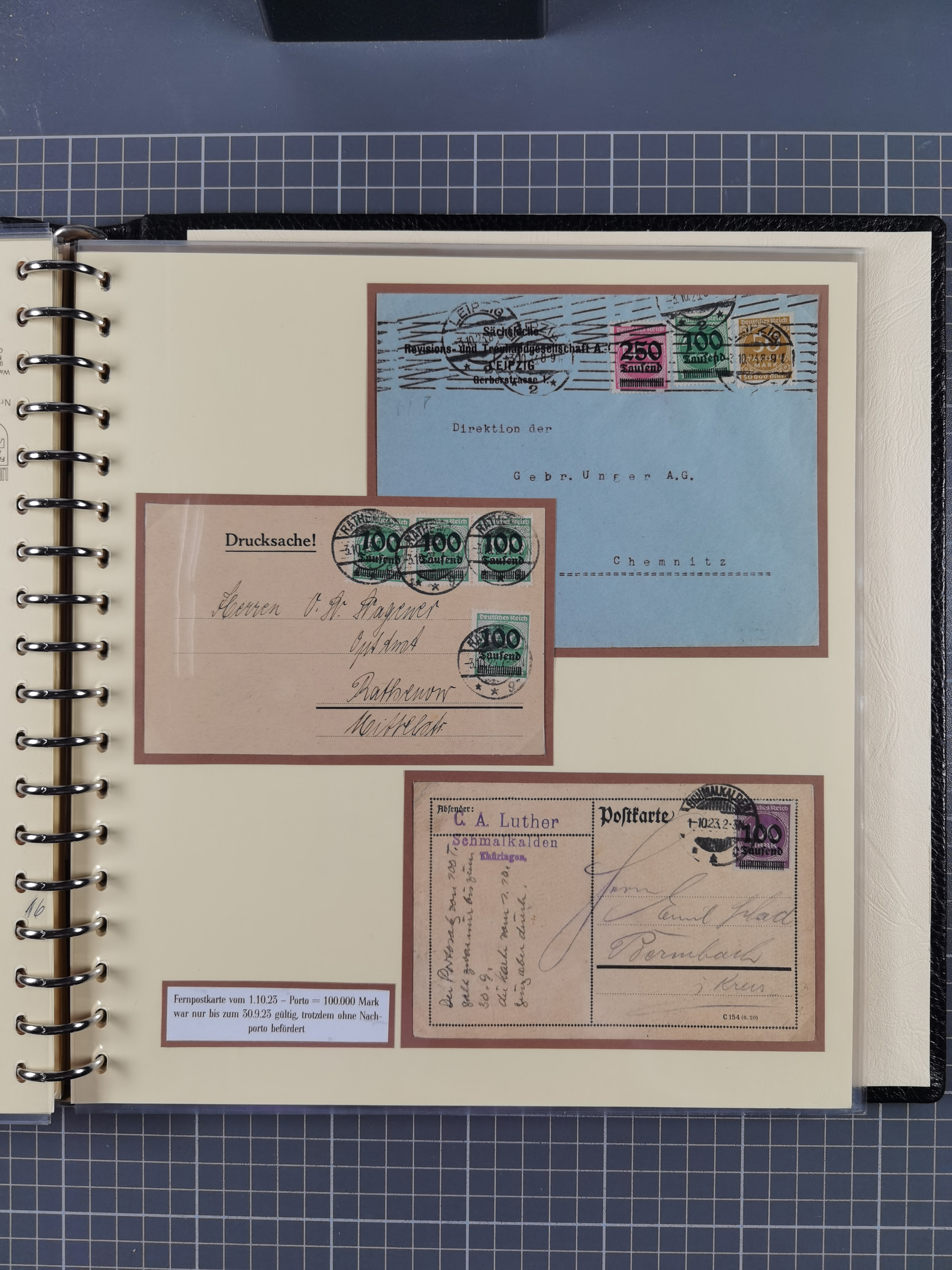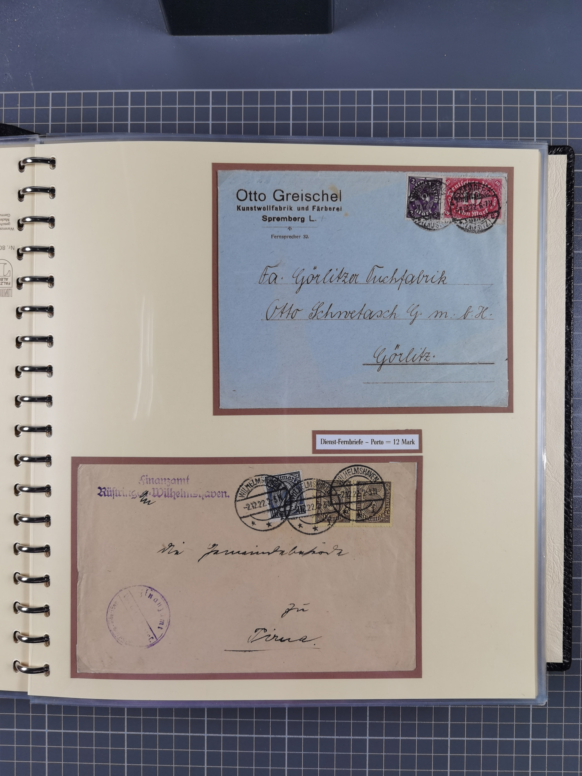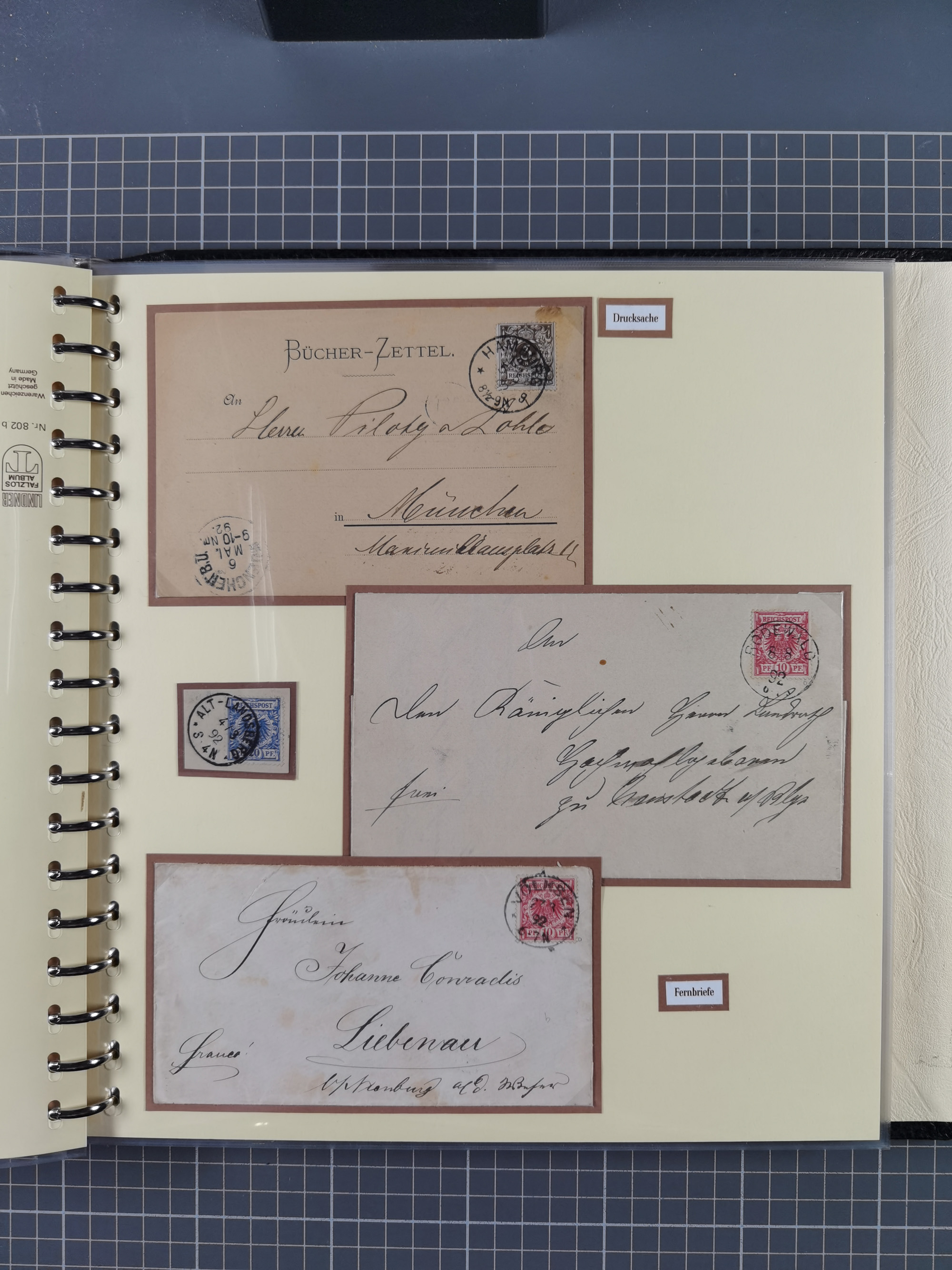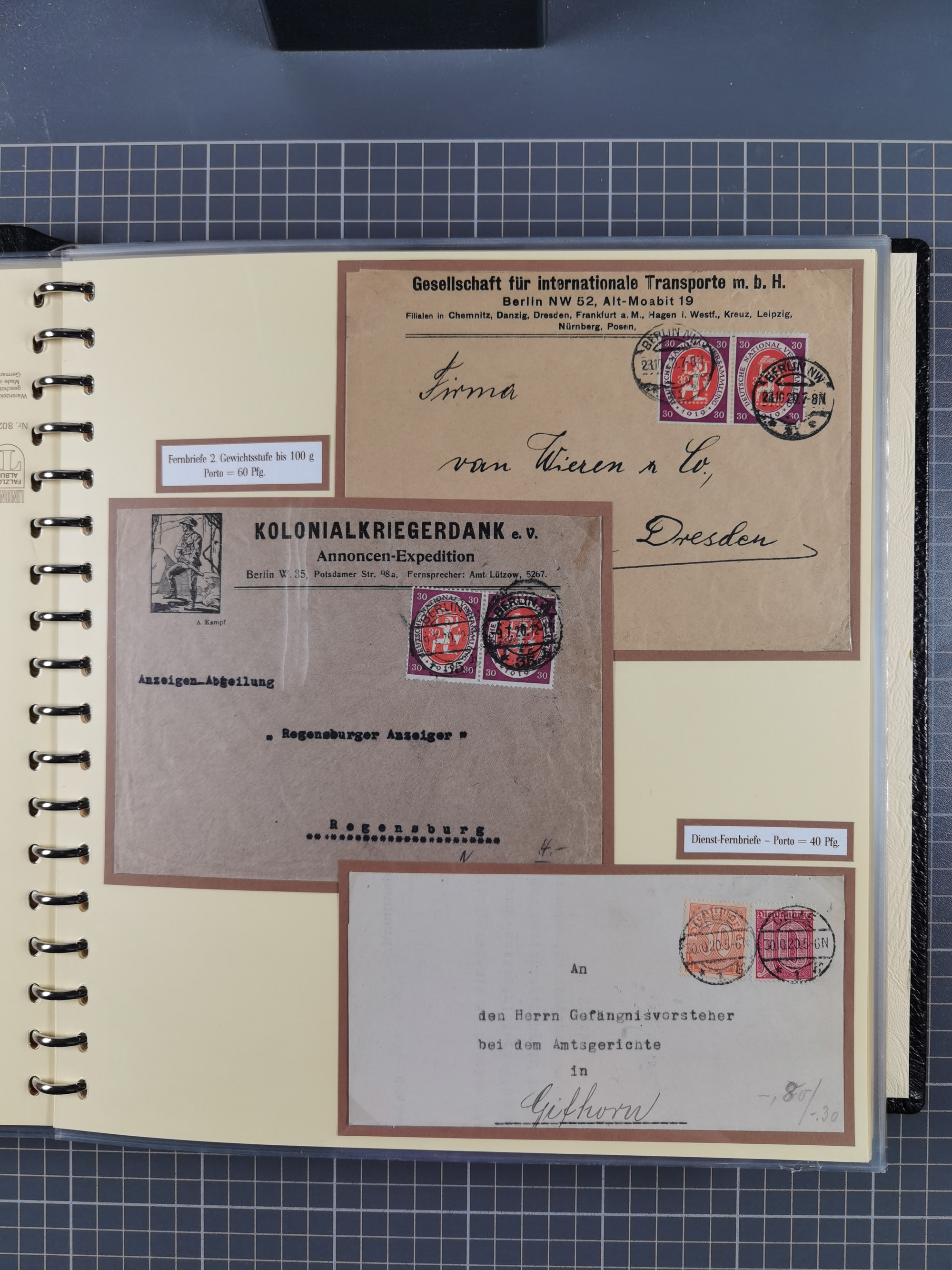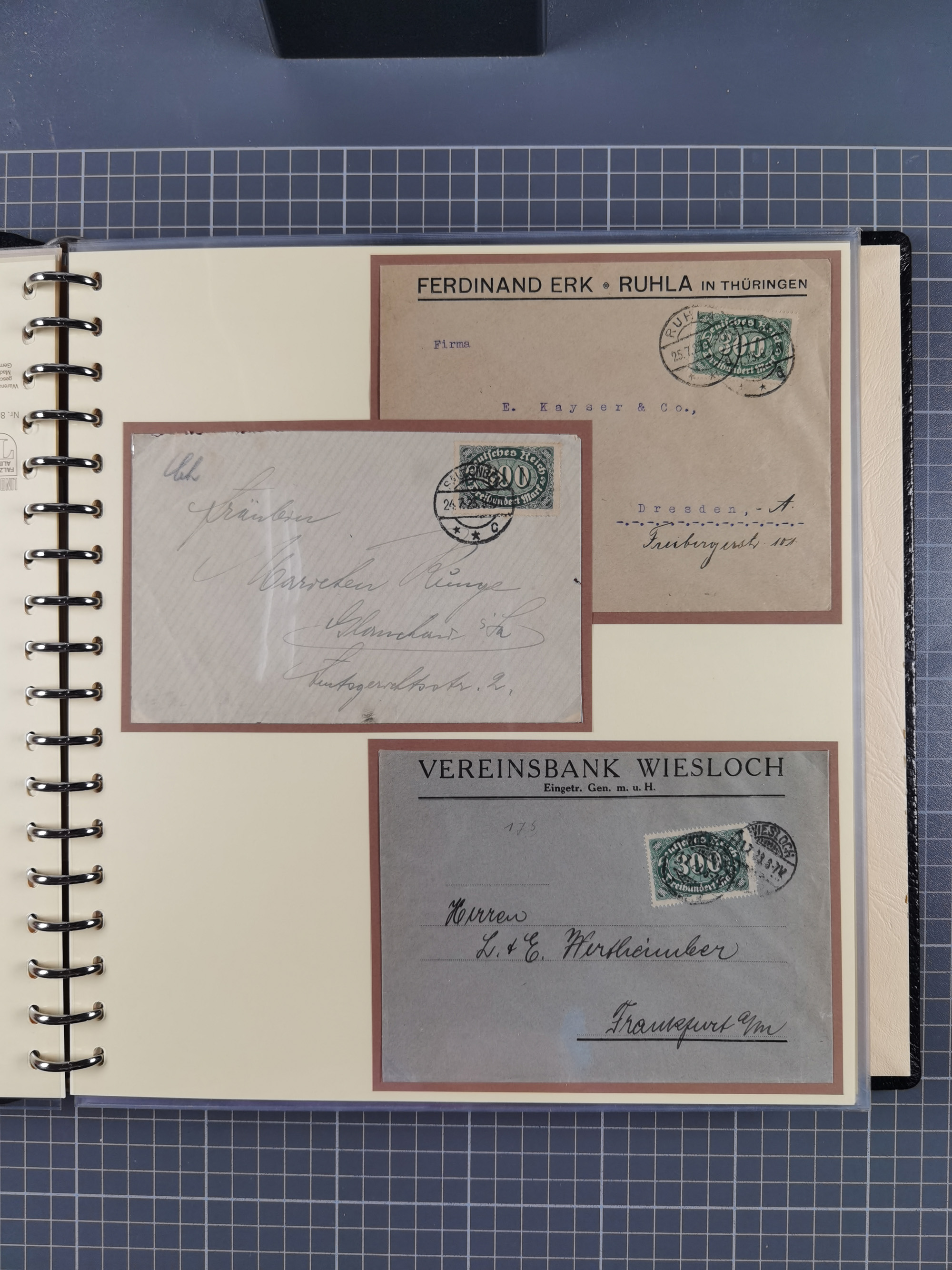 1872/1923, umfangreiche Sammlung mit ca. 800 Briefen,Karten und Ganzsachen. Am Anfang mit kleinem Teil “Hufeisentstempel”, ansonsten liegt der Schwerpunkt bei Infla mit Einzel- und Mehrfachfrankaturen, R-Briefen, Auslandspost, viel Hochinflation mit Dezember-Briefen und Portostufen. Alles auf selbst gestalteten Albenblättern in10 Alben