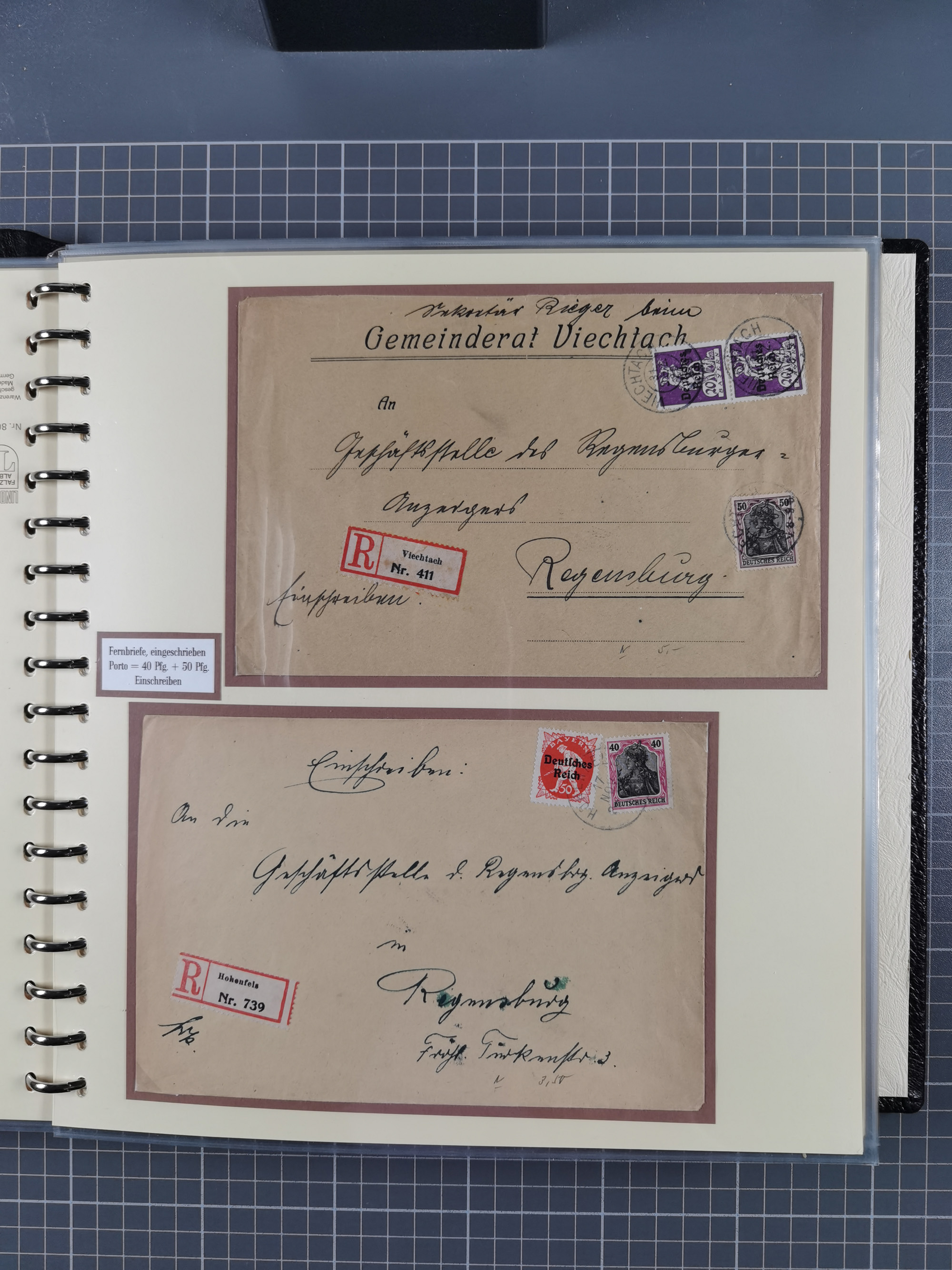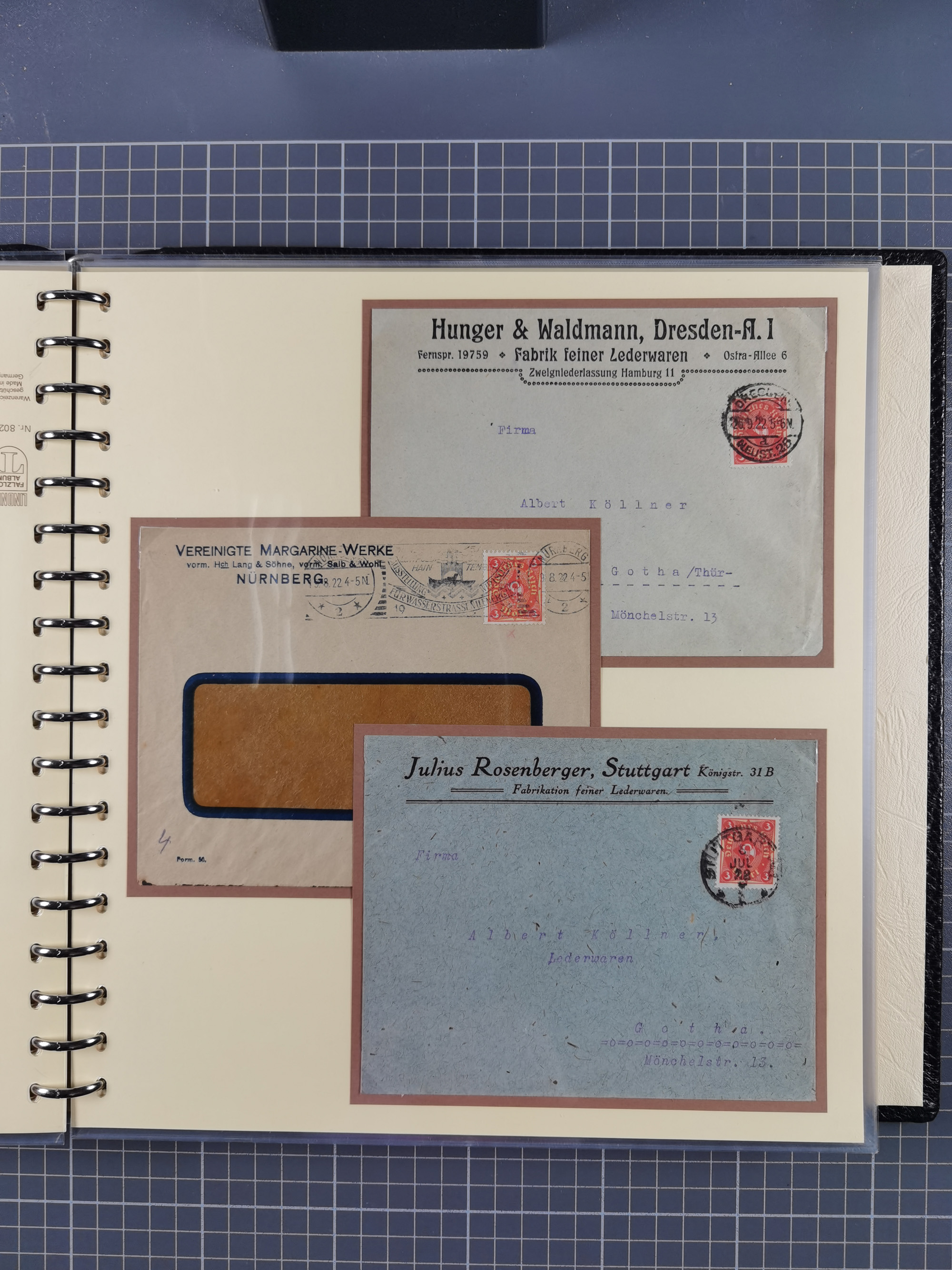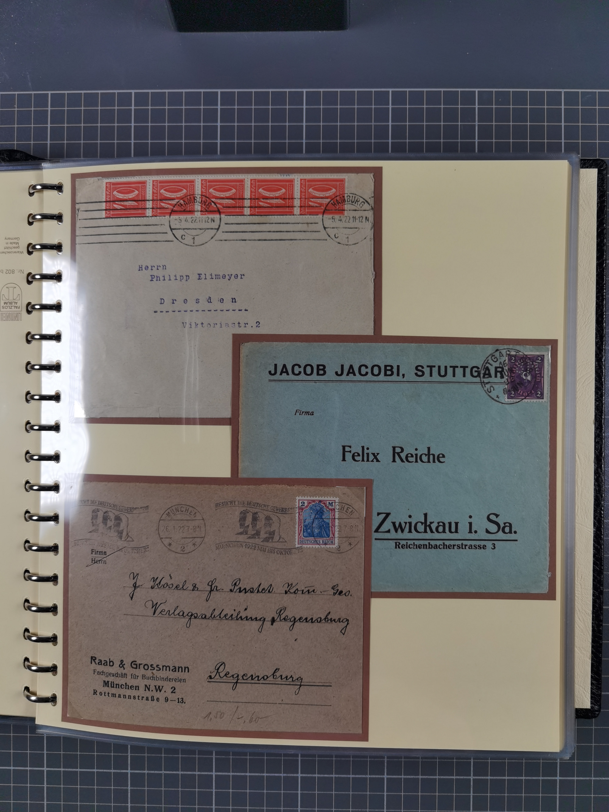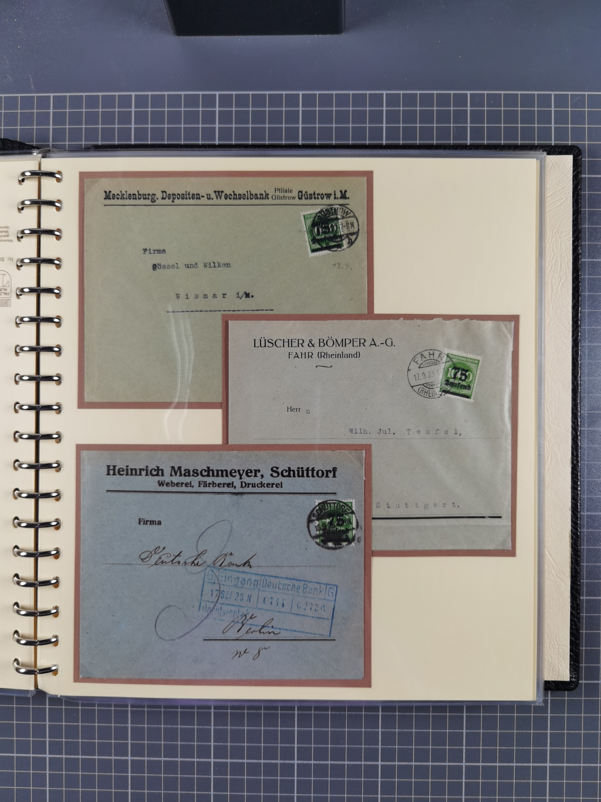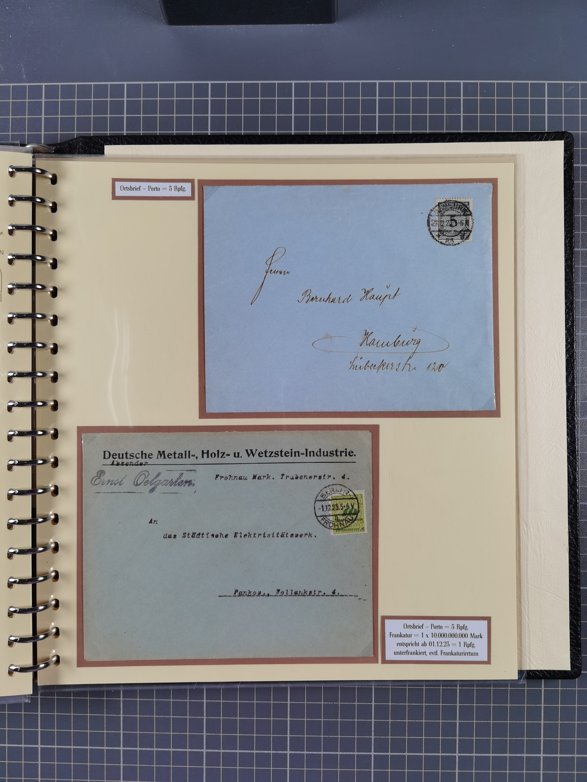 1872/1923, umfangreiche Sammlung mit ca. 800 Briefen,Karten und Ganzsachen. Am Anfang mit kleinem Teil “Hufeisentstempel”, ansonsten liegt der Schwerpunkt bei Infla mit Einzel- und Mehrfachfrankaturen, R-Briefen, Auslandspost, viel Hochinflation mit Dezember-Briefen und Portostufen. Alles auf selbst gestalteten Albenblättern in10 Alben