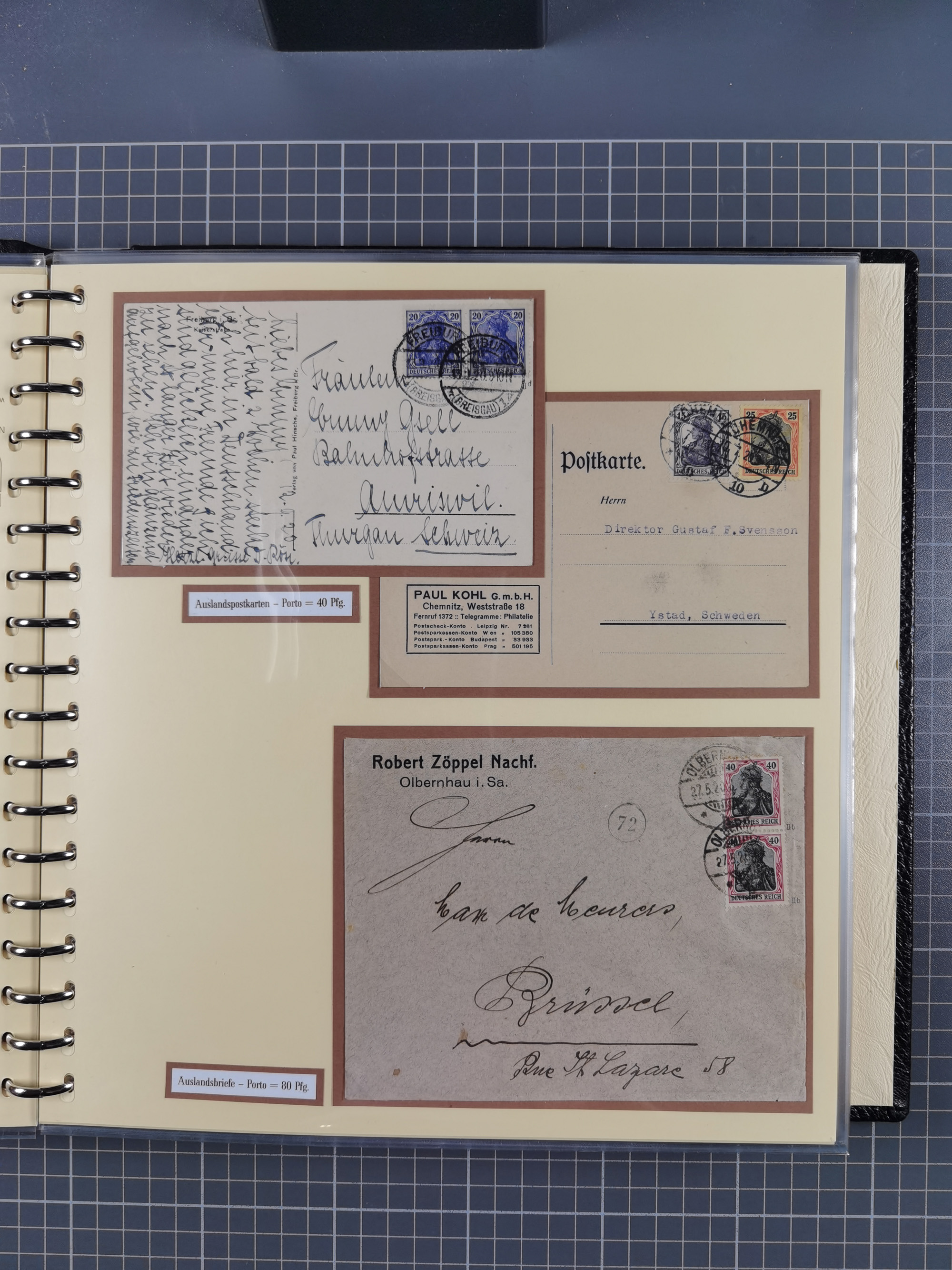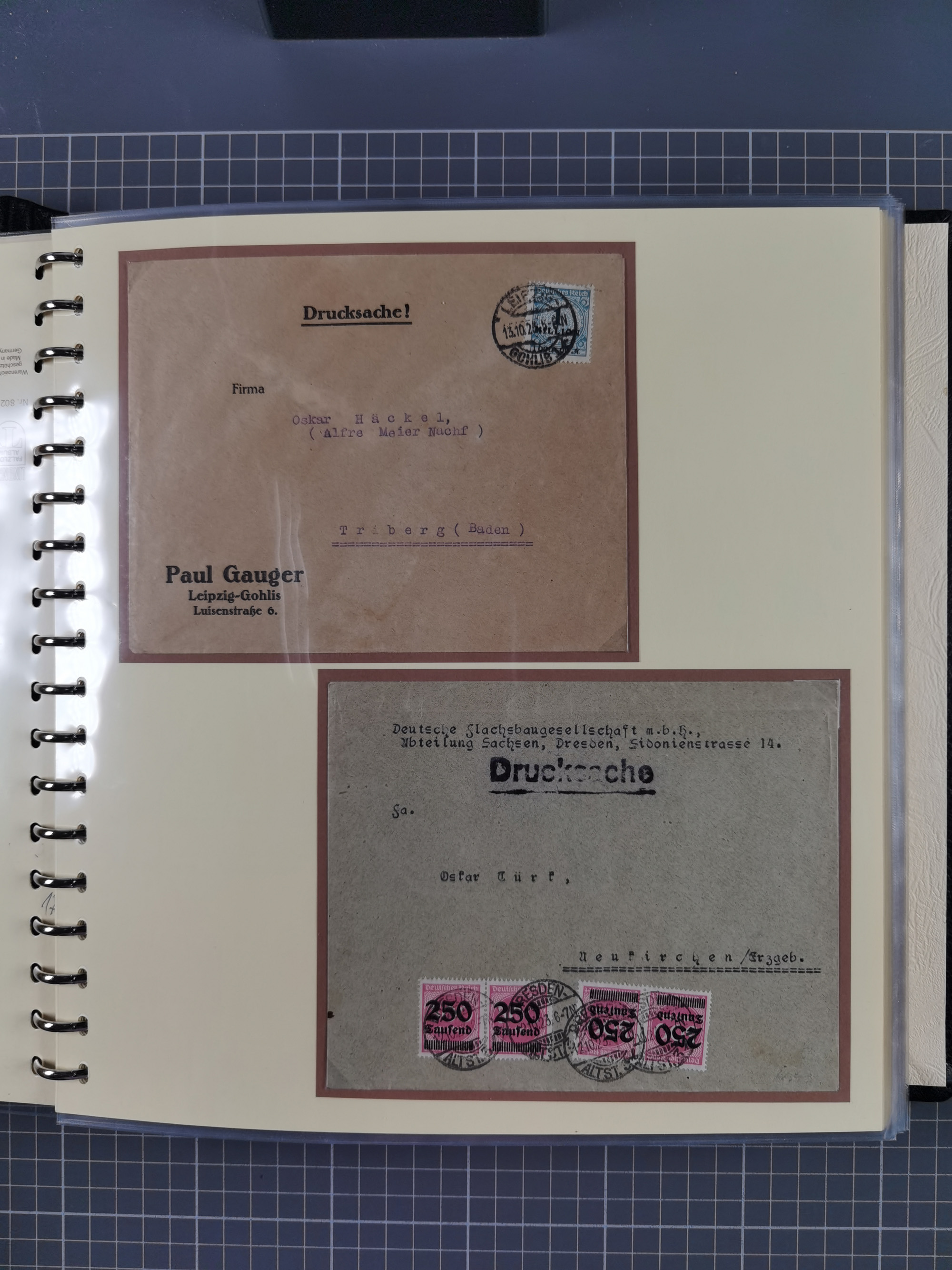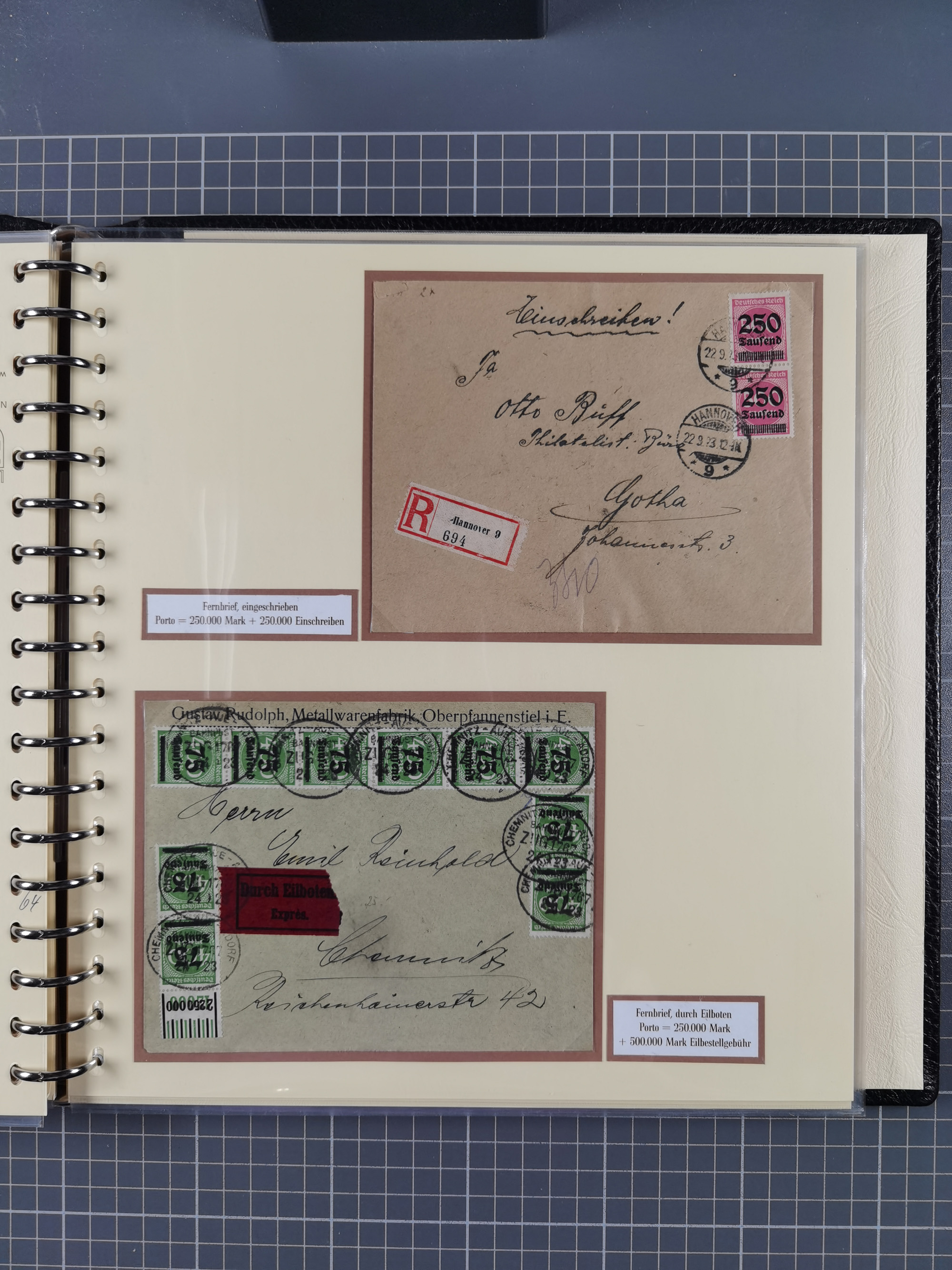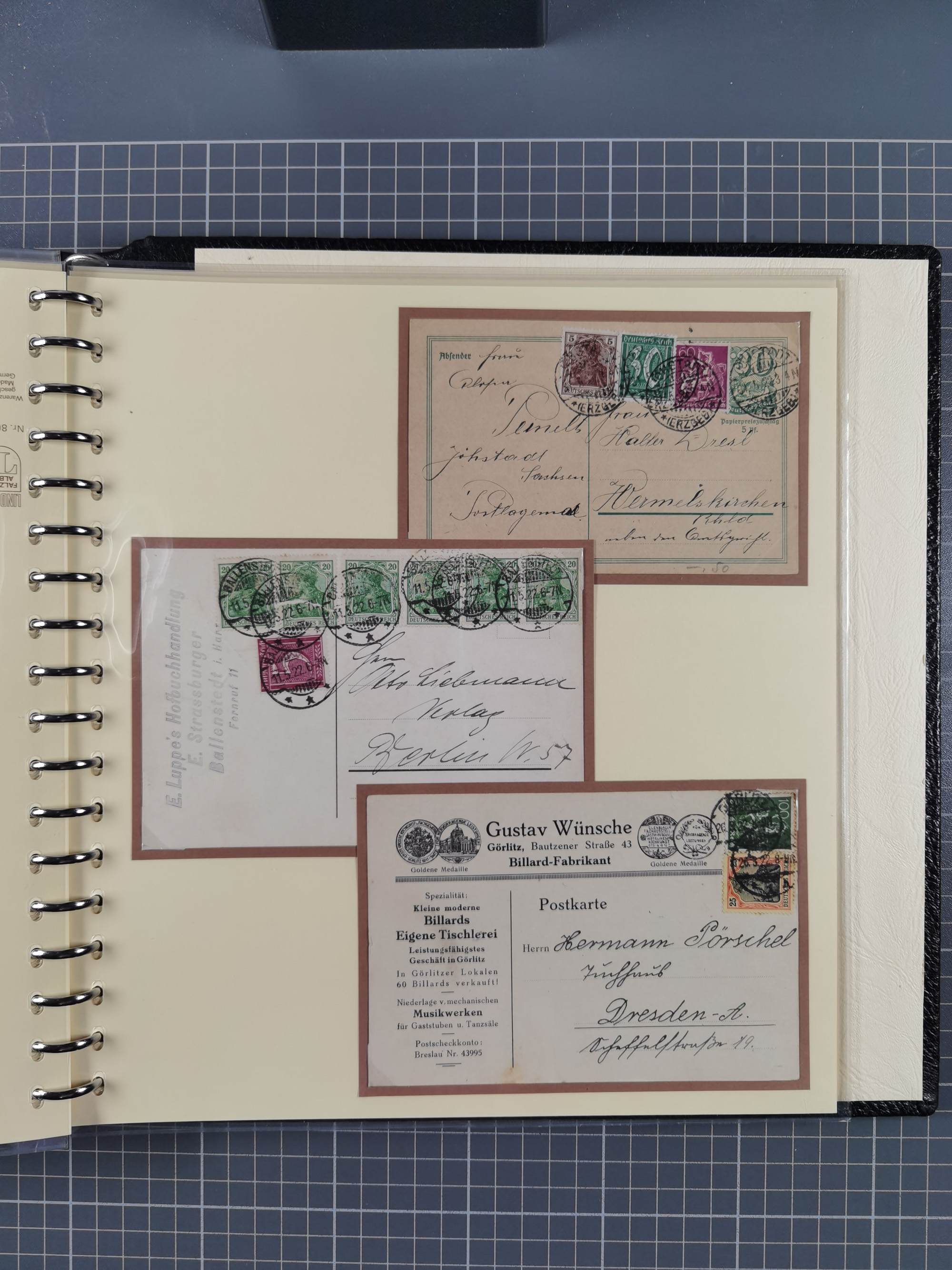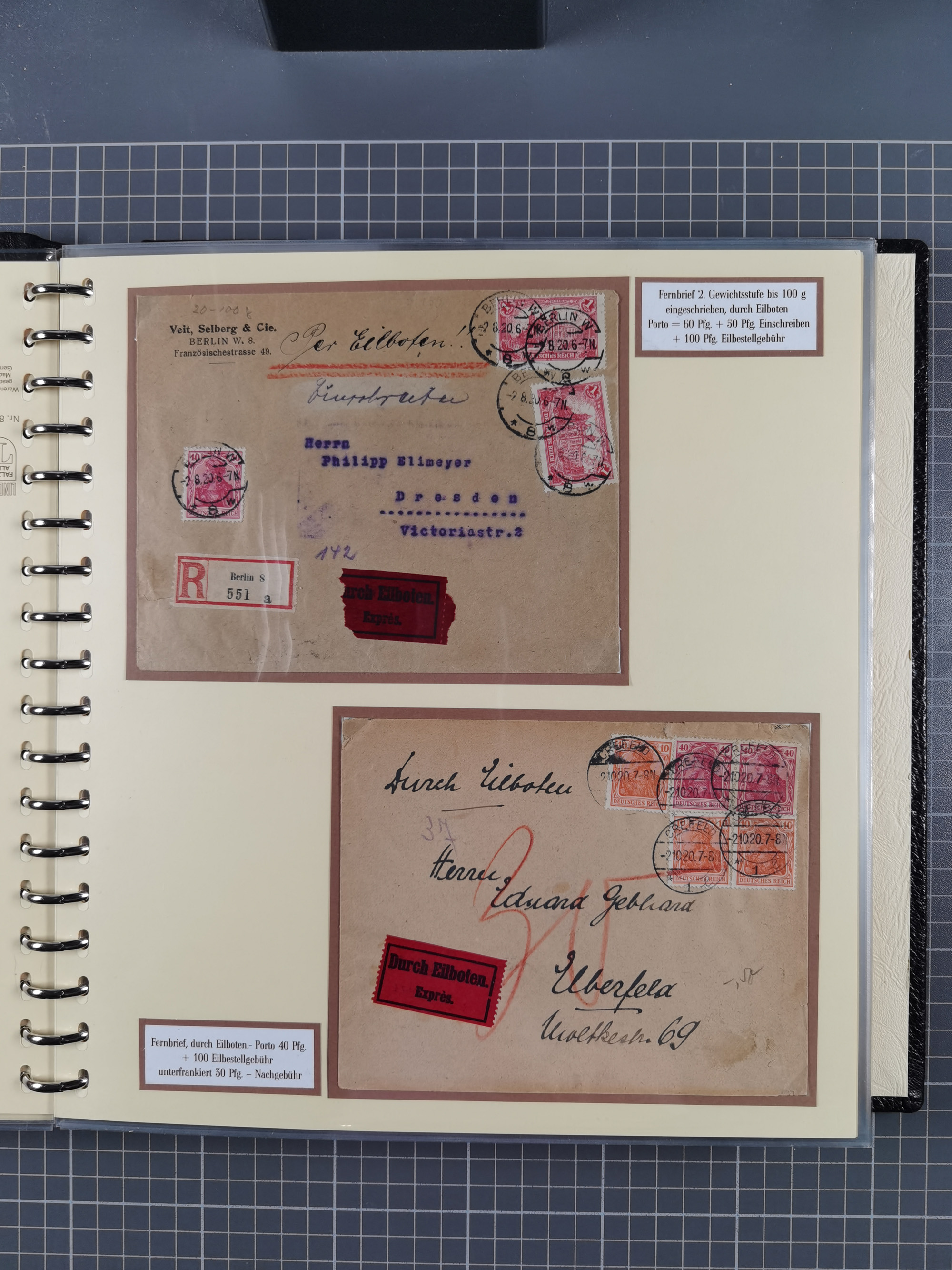 1872/1923, umfangreiche Sammlung mit ca. 800 Briefen,Karten und Ganzsachen. Am Anfang mit kleinem Teil “Hufeisentstempel”, ansonsten liegt der Schwerpunkt bei Infla mit Einzel- und Mehrfachfrankaturen, R-Briefen, Auslandspost, viel Hochinflation mit Dezember-Briefen und Portostufen. Alles auf selbst gestalteten Albenblättern in10 Alben