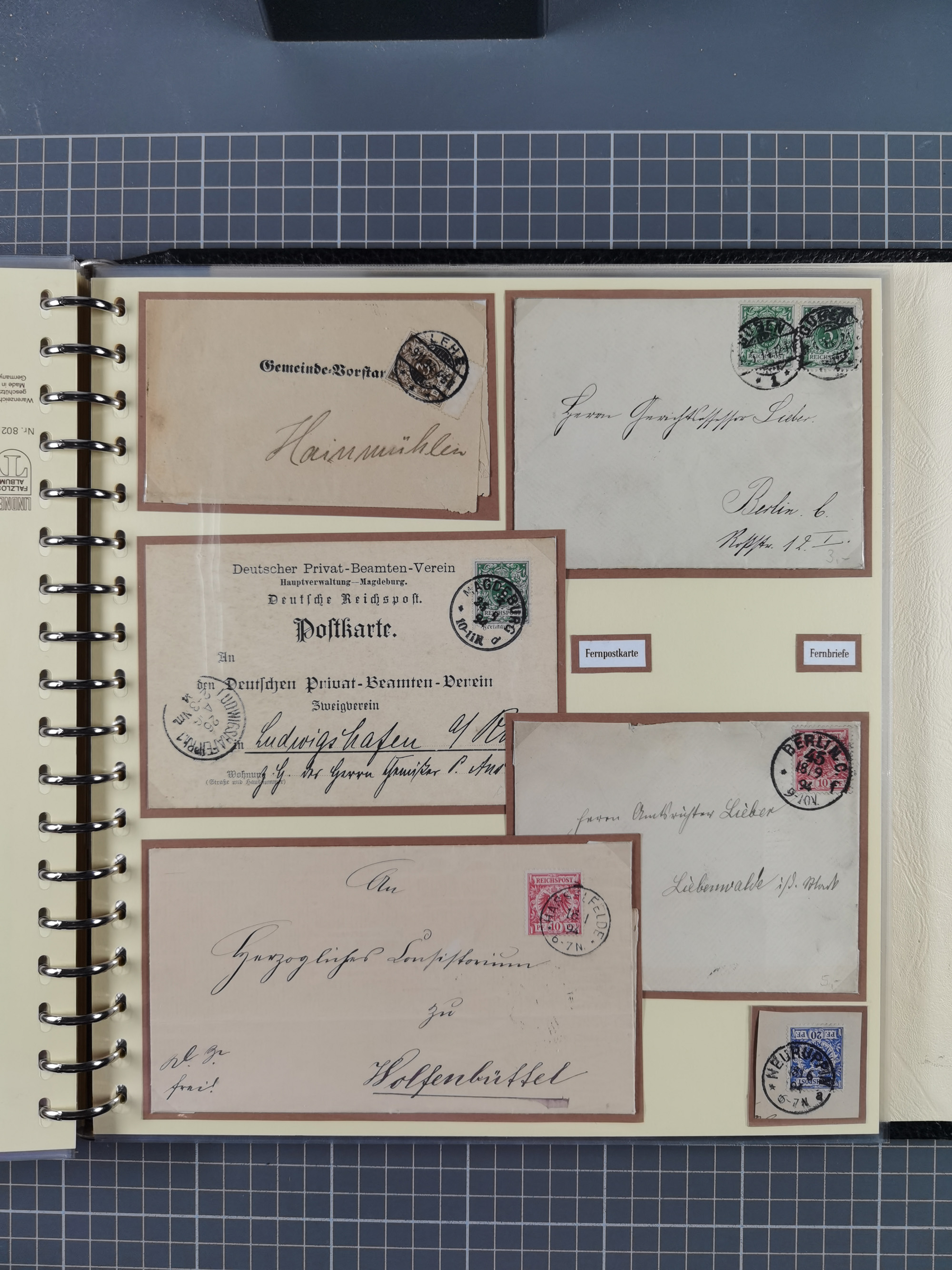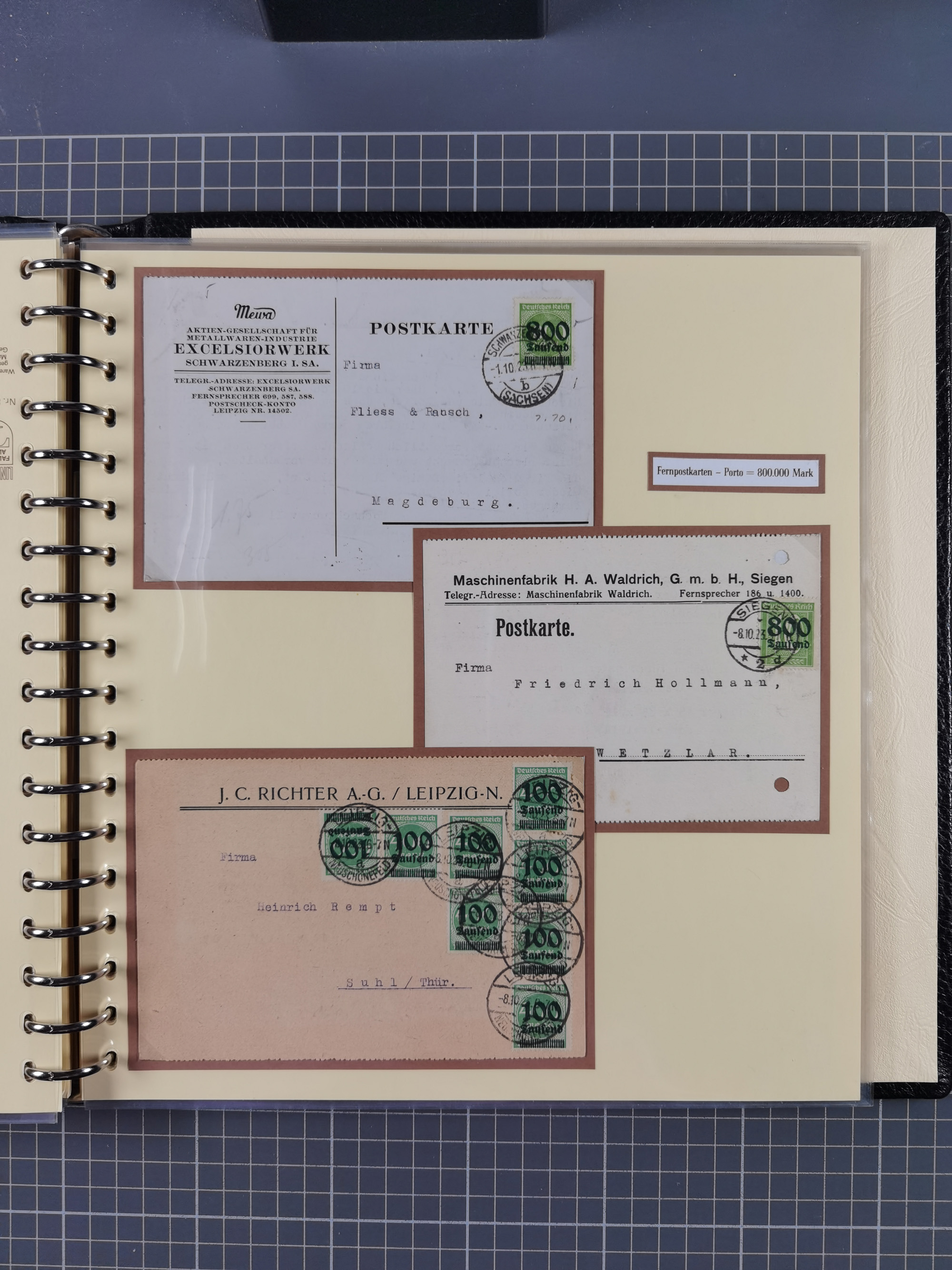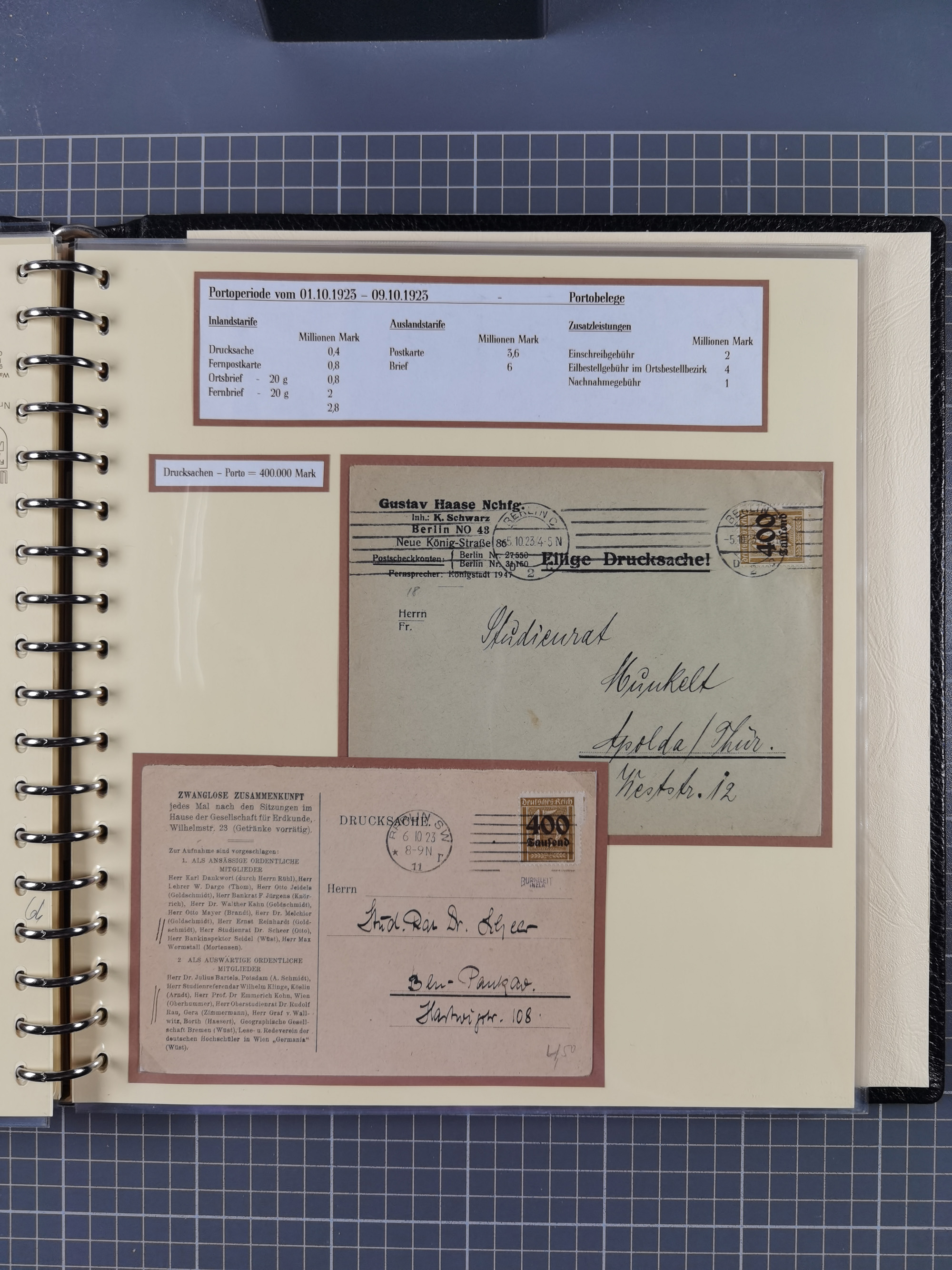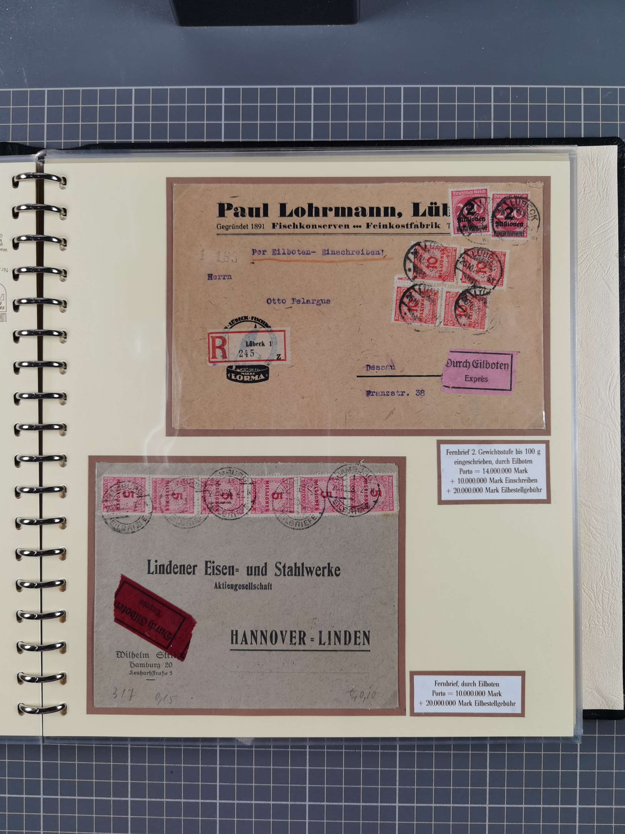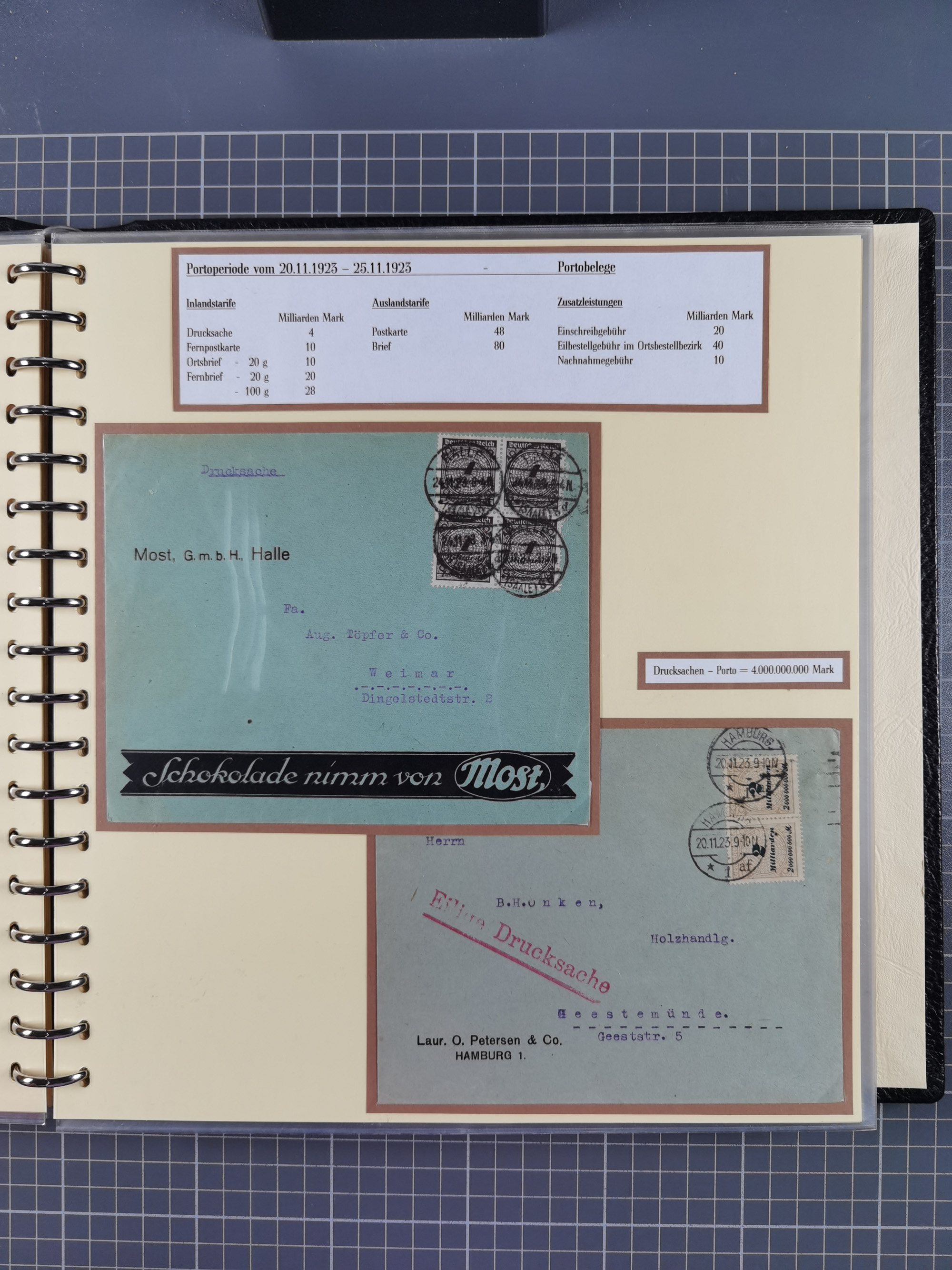 1872/1923, umfangreiche Sammlung mit ca. 800 Briefen,Karten und Ganzsachen. Am Anfang mit kleinem Teil “Hufeisentstempel”, ansonsten liegt der Schwerpunkt bei Infla mit Einzel- und Mehrfachfrankaturen, R-Briefen, Auslandspost, viel Hochinflation mit Dezember-Briefen und Portostufen. Alles auf selbst gestalteten Albenblättern in10 Alben