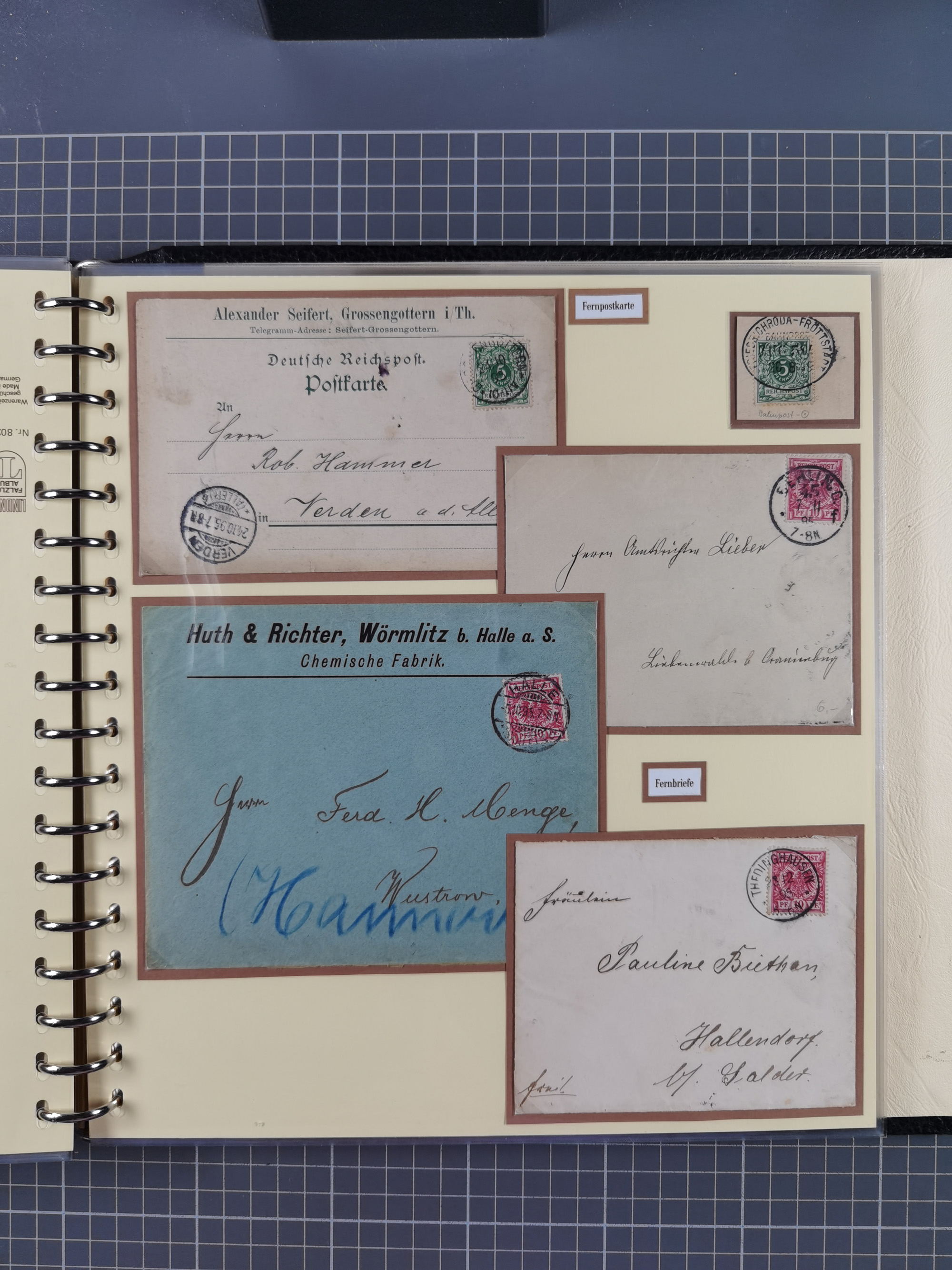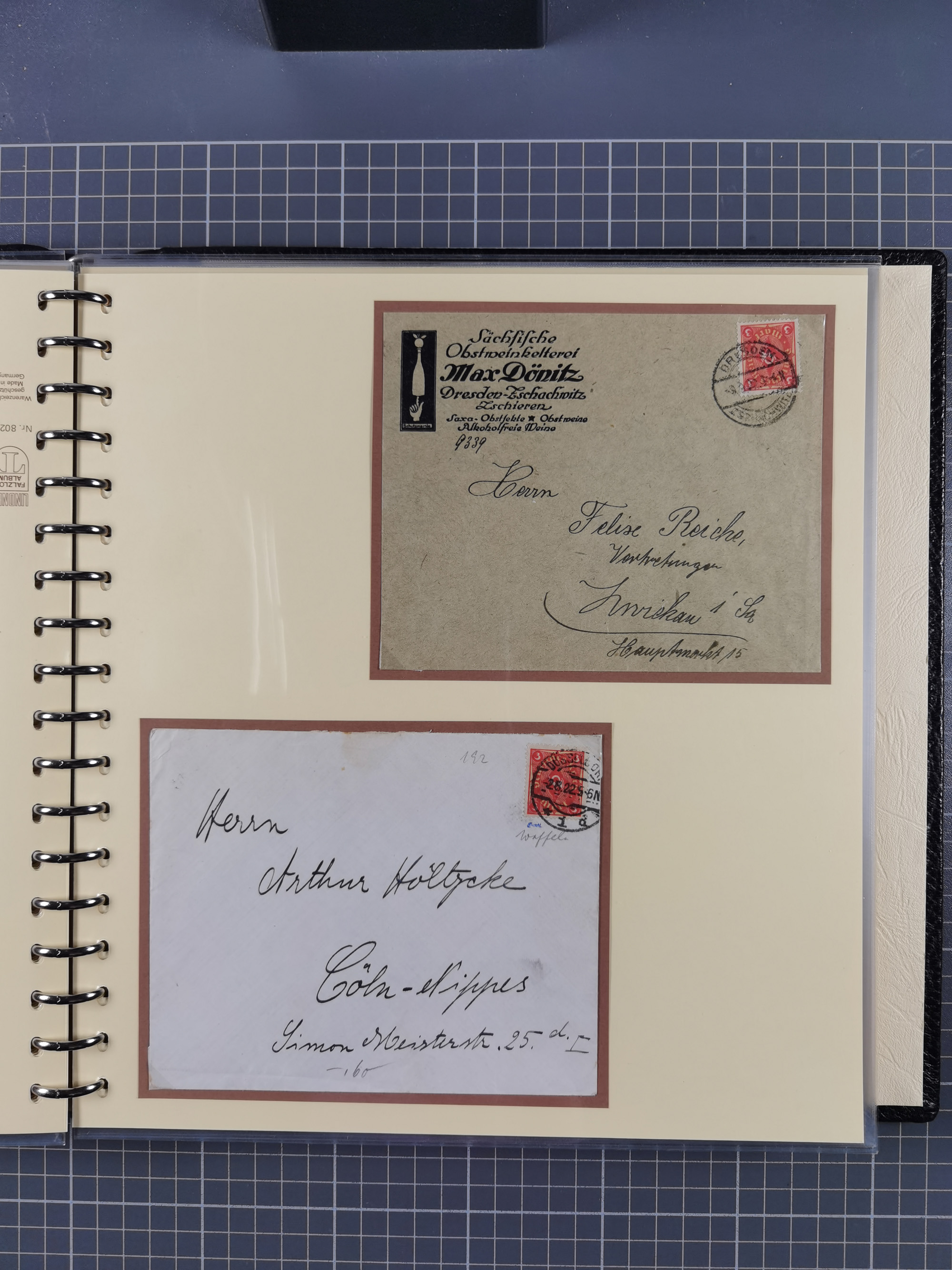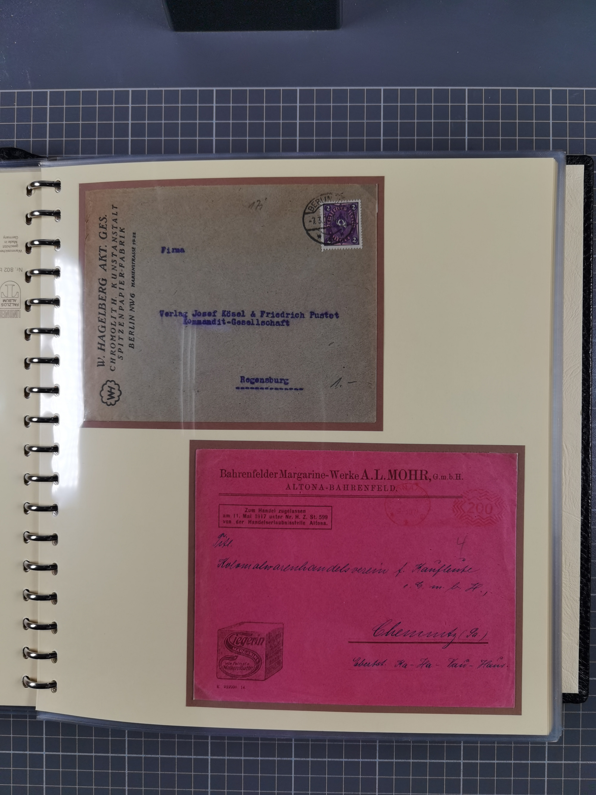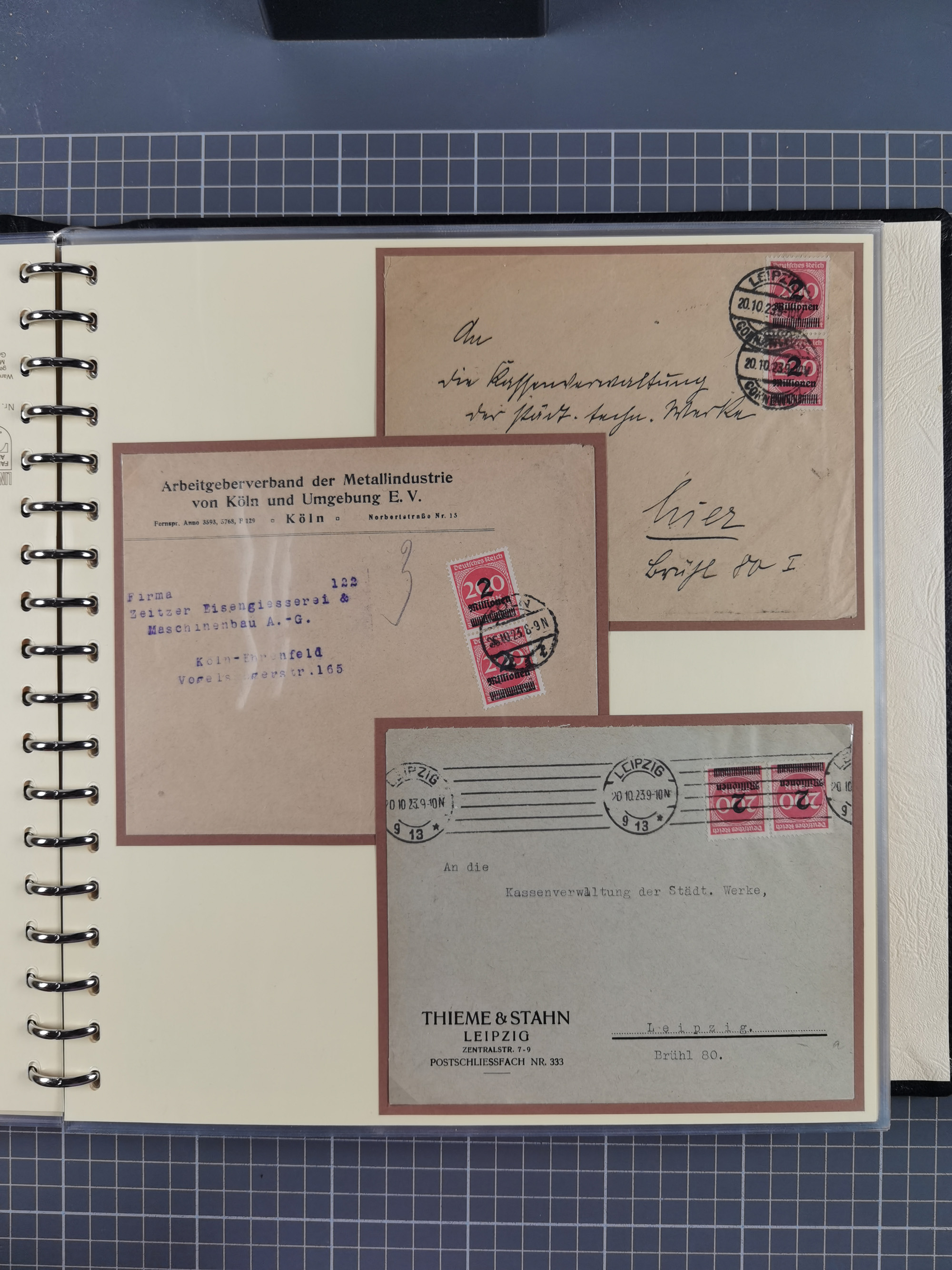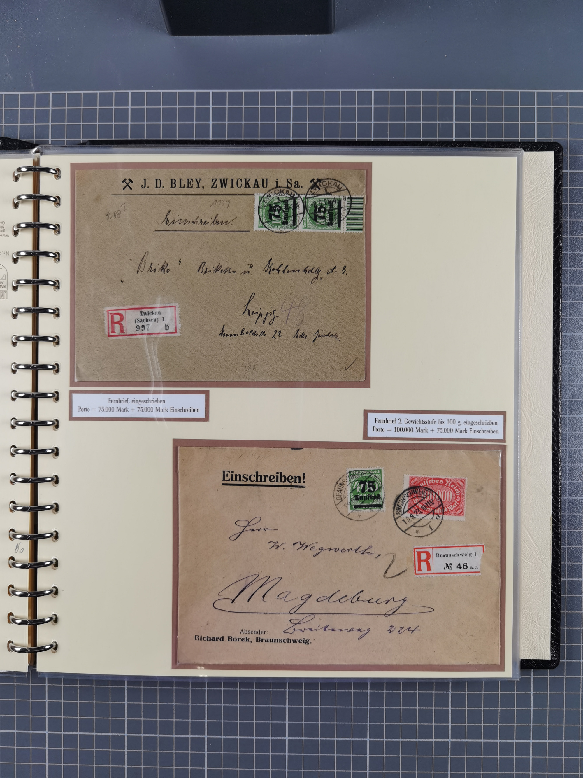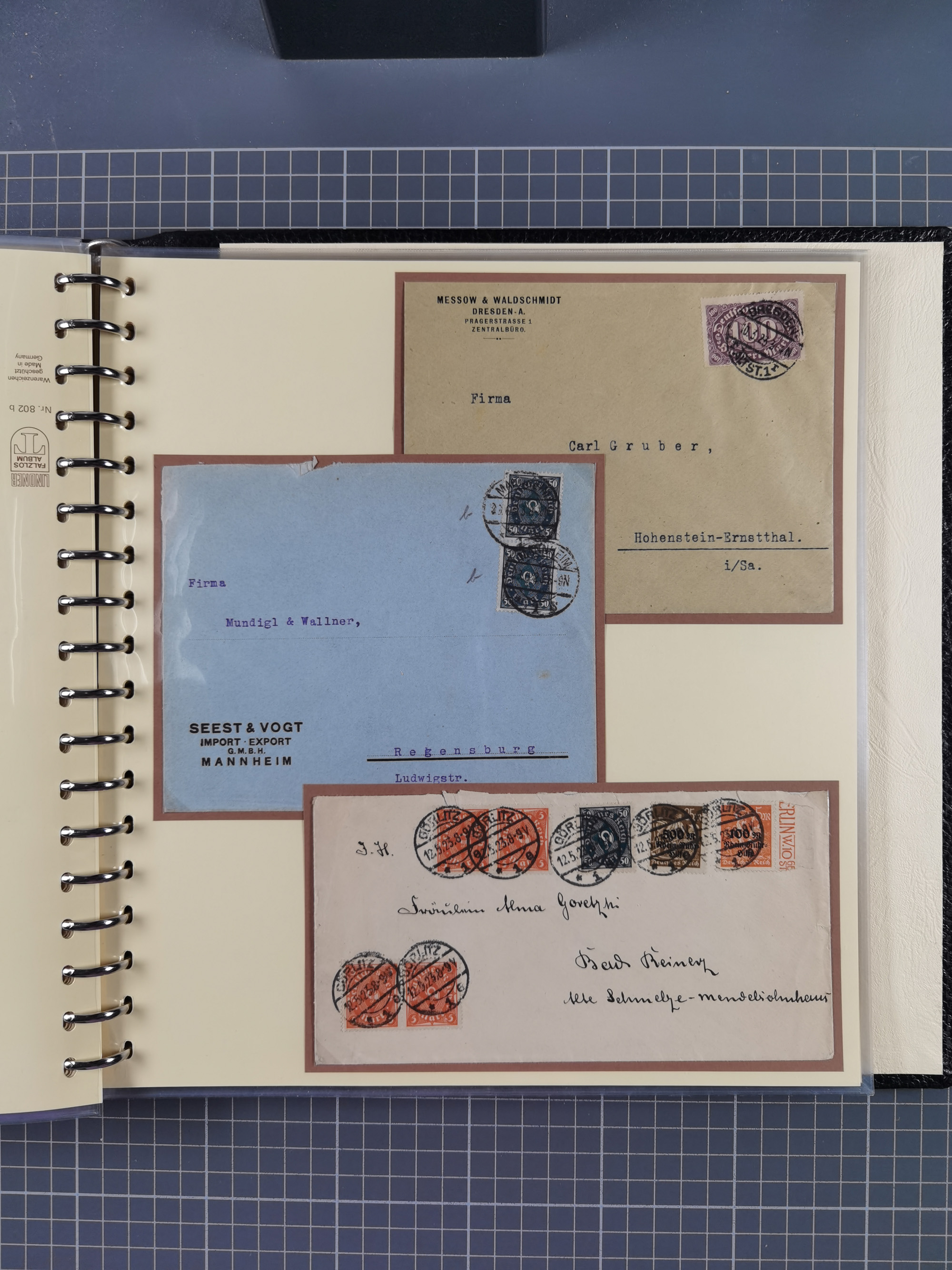 1872/1923, umfangreiche Sammlung mit ca. 800 Briefen,Karten und Ganzsachen. Am Anfang mit kleinem Teil “Hufeisentstempel”, ansonsten liegt der Schwerpunkt bei Infla mit Einzel- und Mehrfachfrankaturen, R-Briefen, Auslandspost, viel Hochinflation mit Dezember-Briefen und Portostufen. Alles auf selbst gestalteten Albenblättern in10 Alben