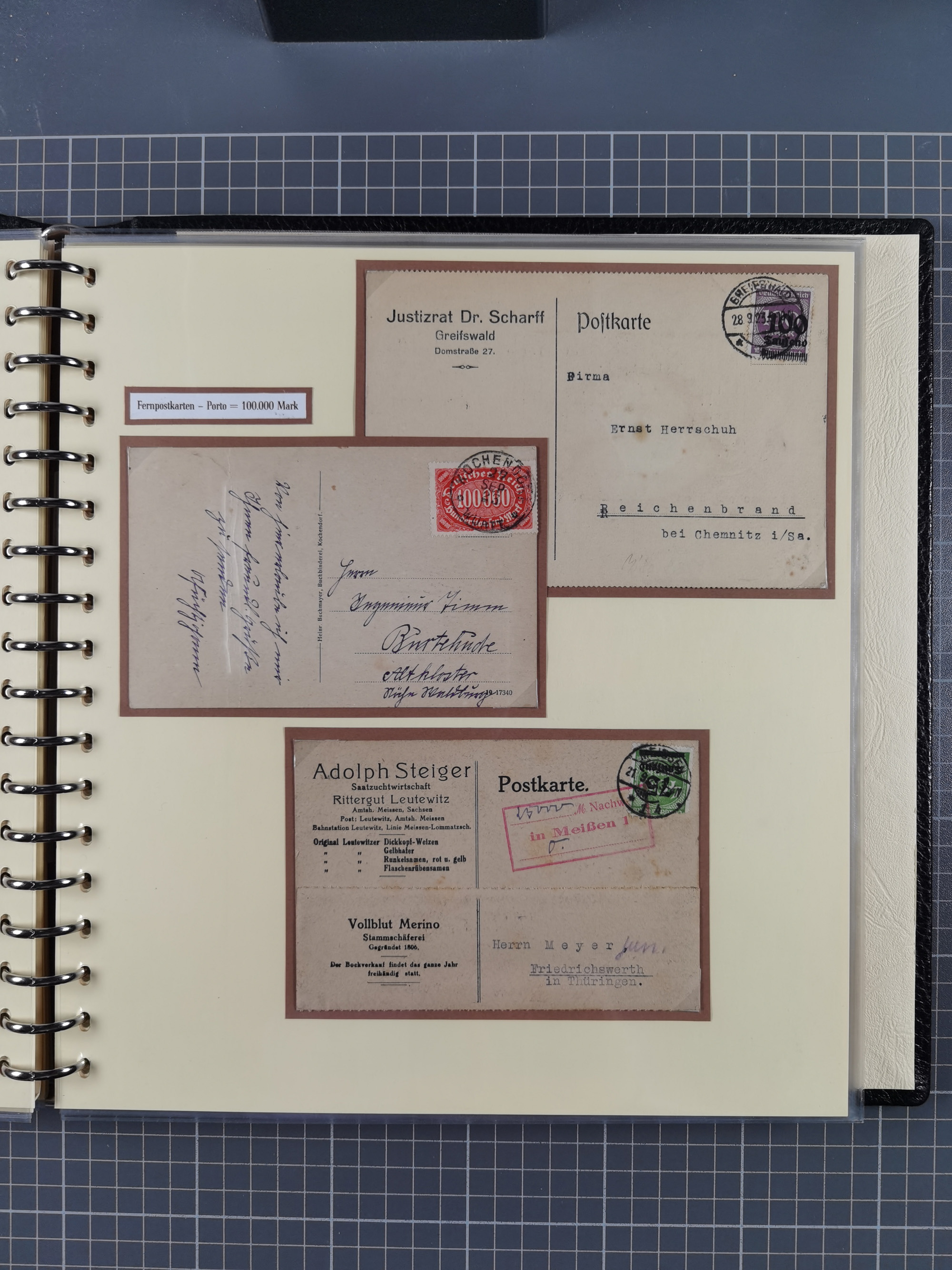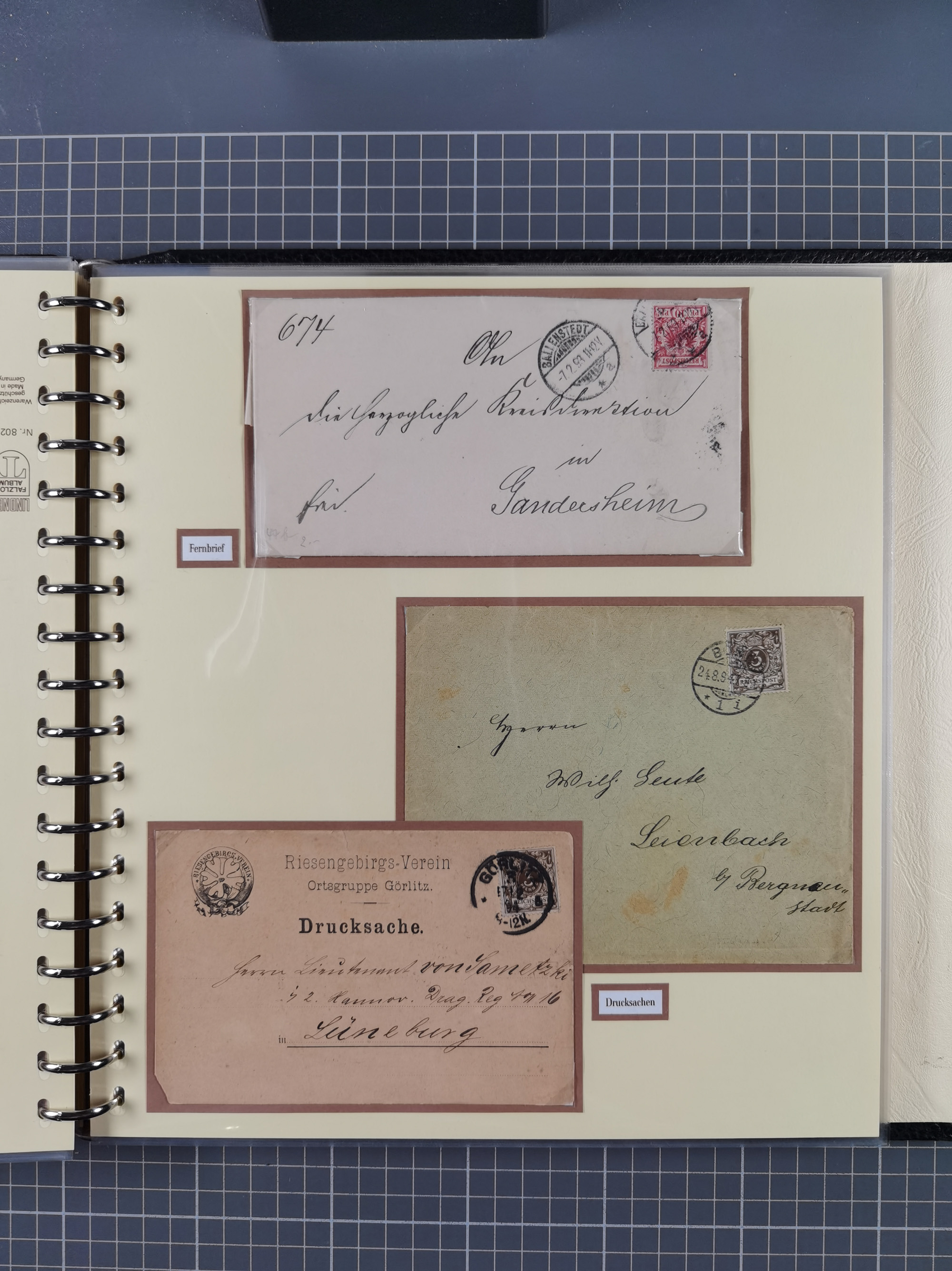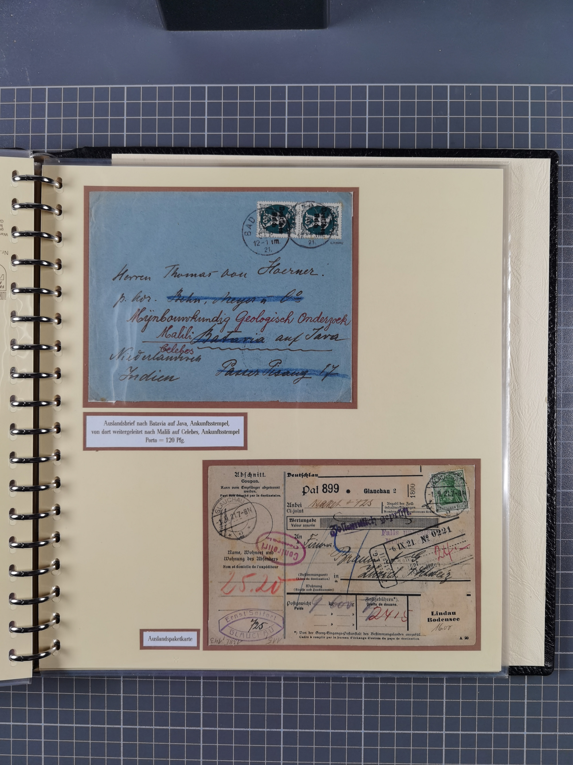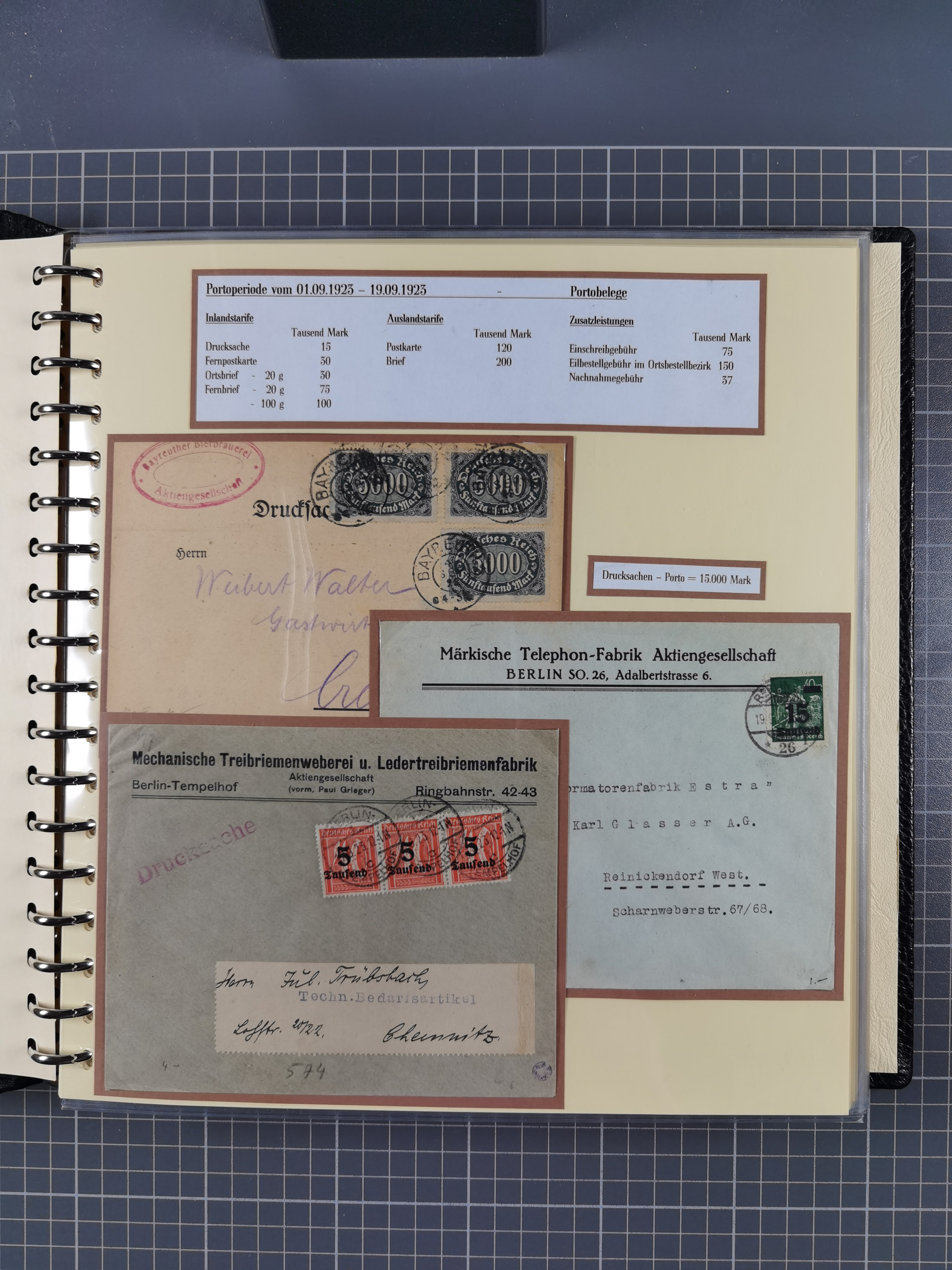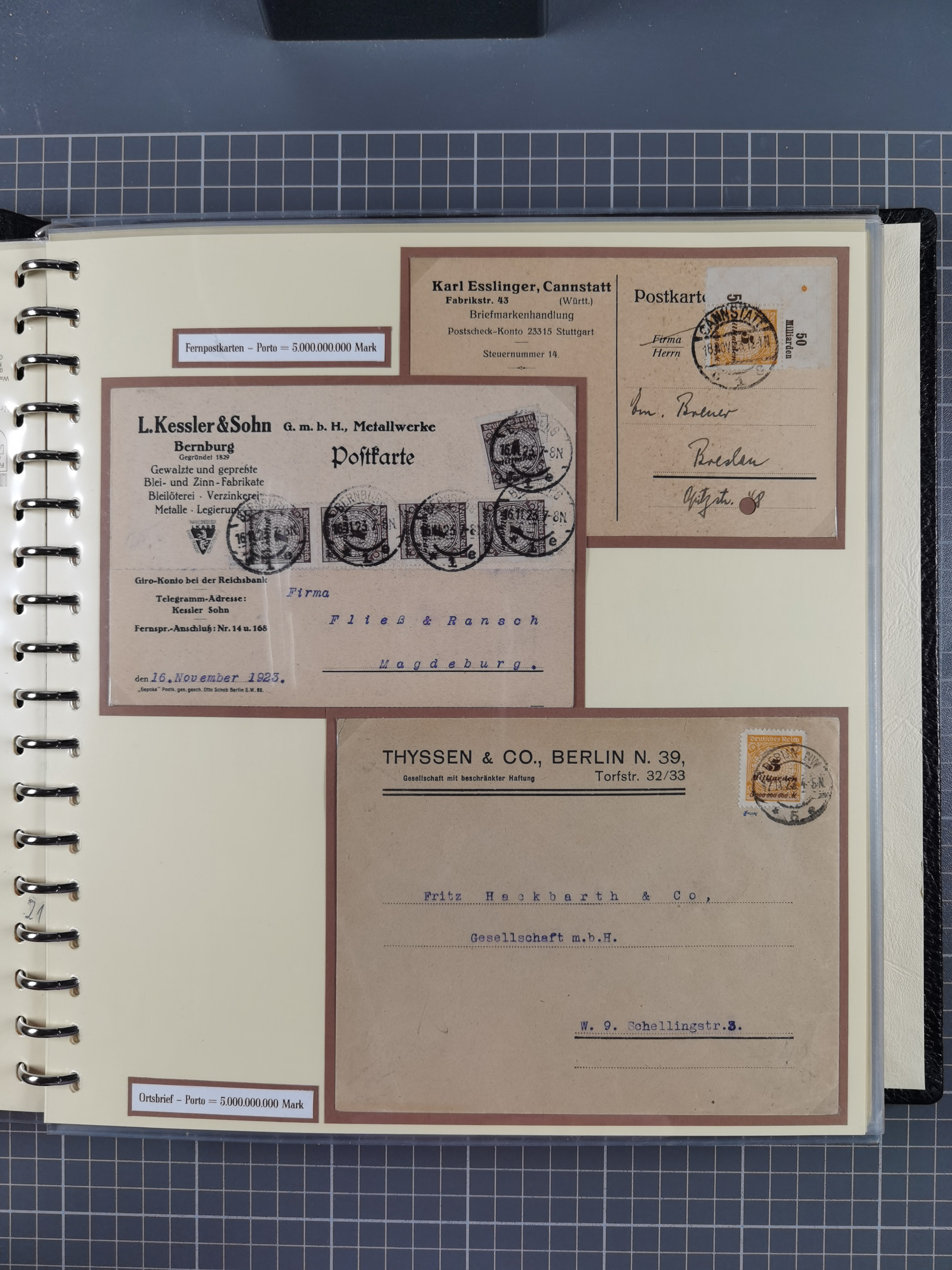 1872/1923, umfangreiche Sammlung mit ca. 800 Briefen,Karten und Ganzsachen. Am Anfang mit kleinem Teil “Hufeisentstempel”, ansonsten liegt der Schwerpunkt bei Infla mit Einzel- und Mehrfachfrankaturen, R-Briefen, Auslandspost, viel Hochinflation mit Dezember-Briefen und Portostufen. Alles auf selbst gestalteten Albenblättern in10 Alben