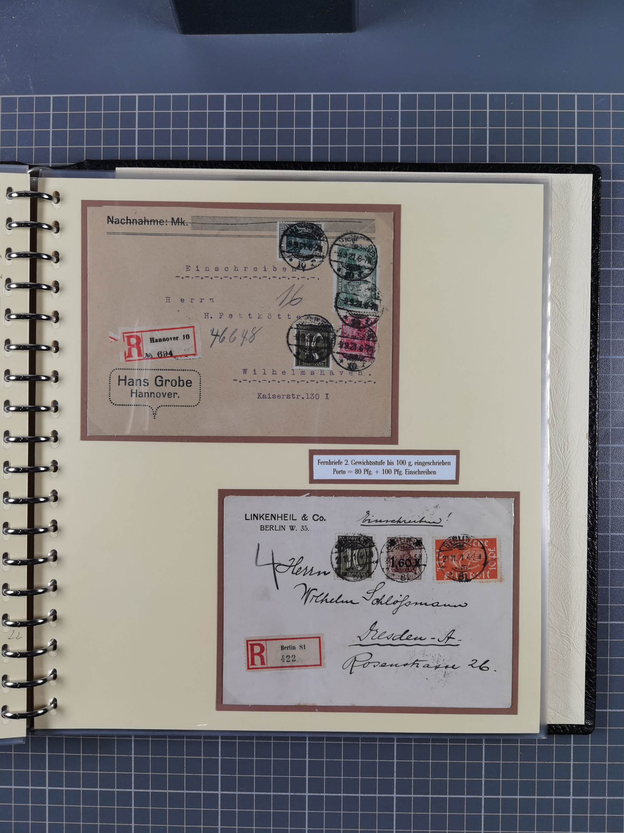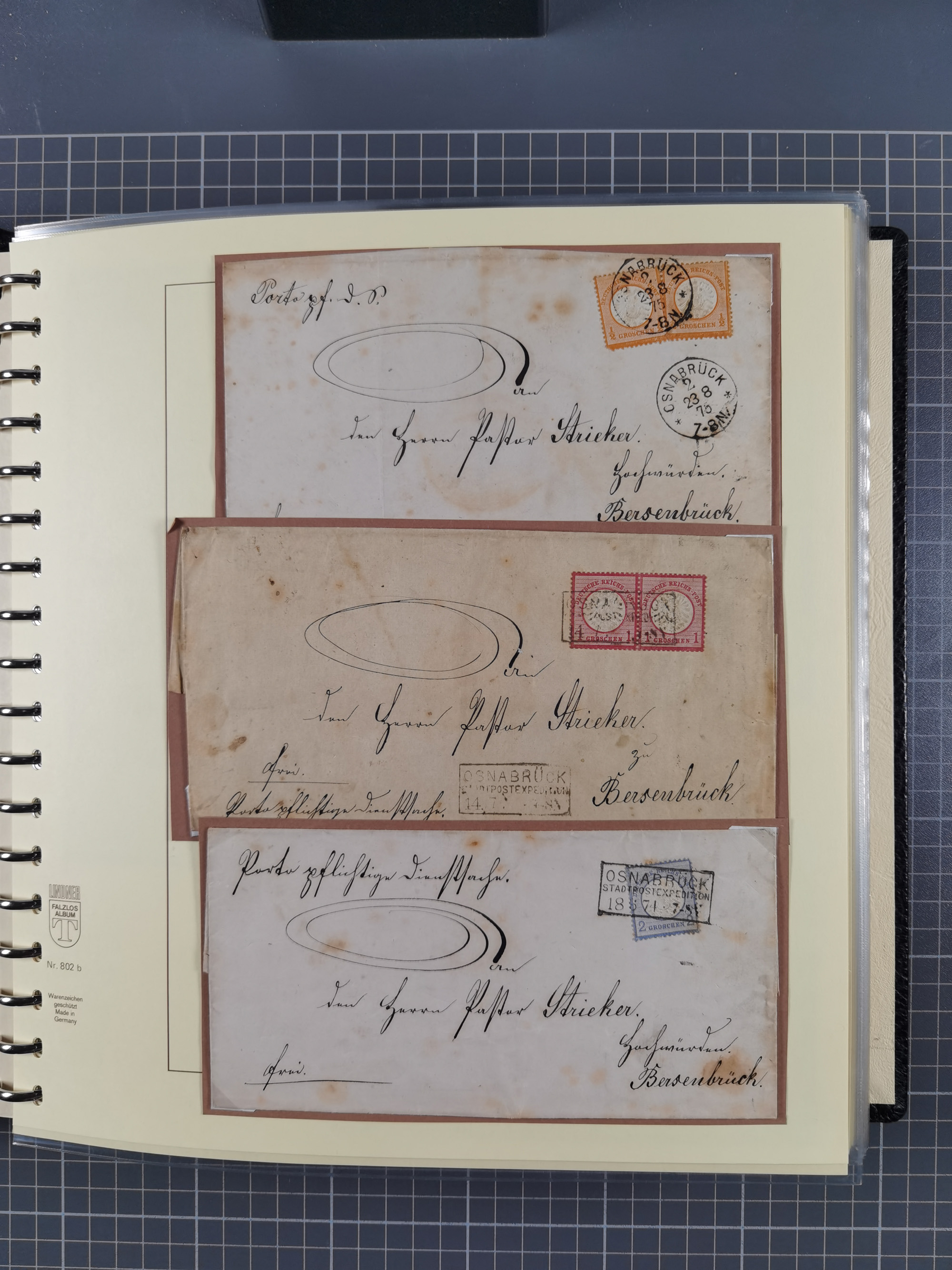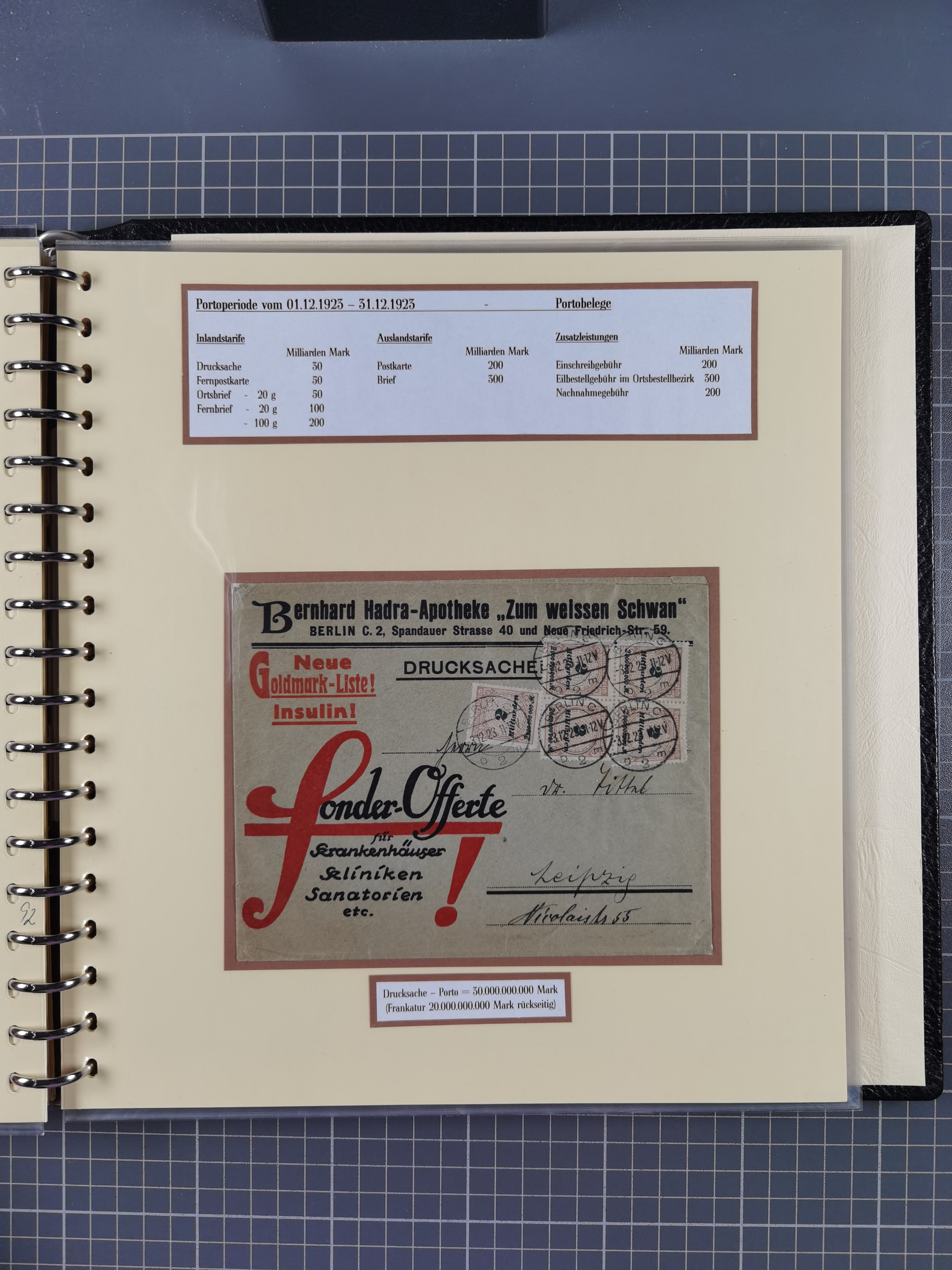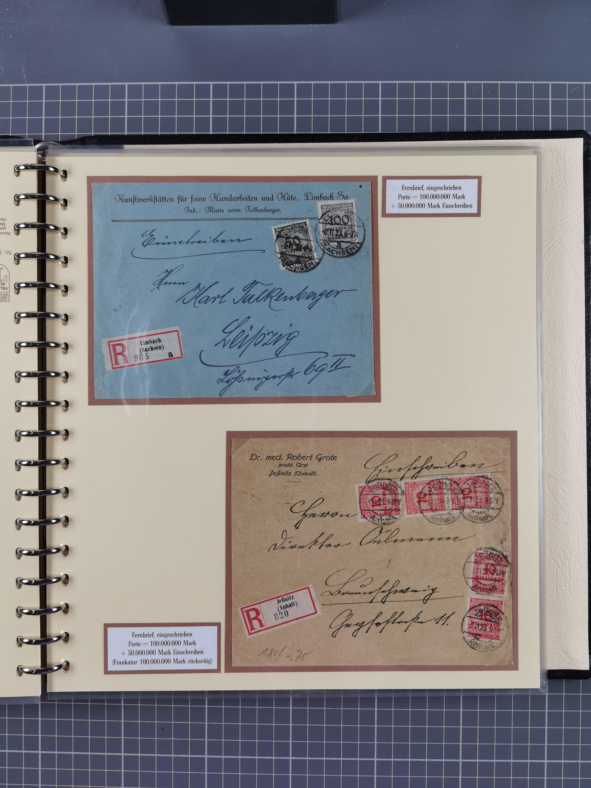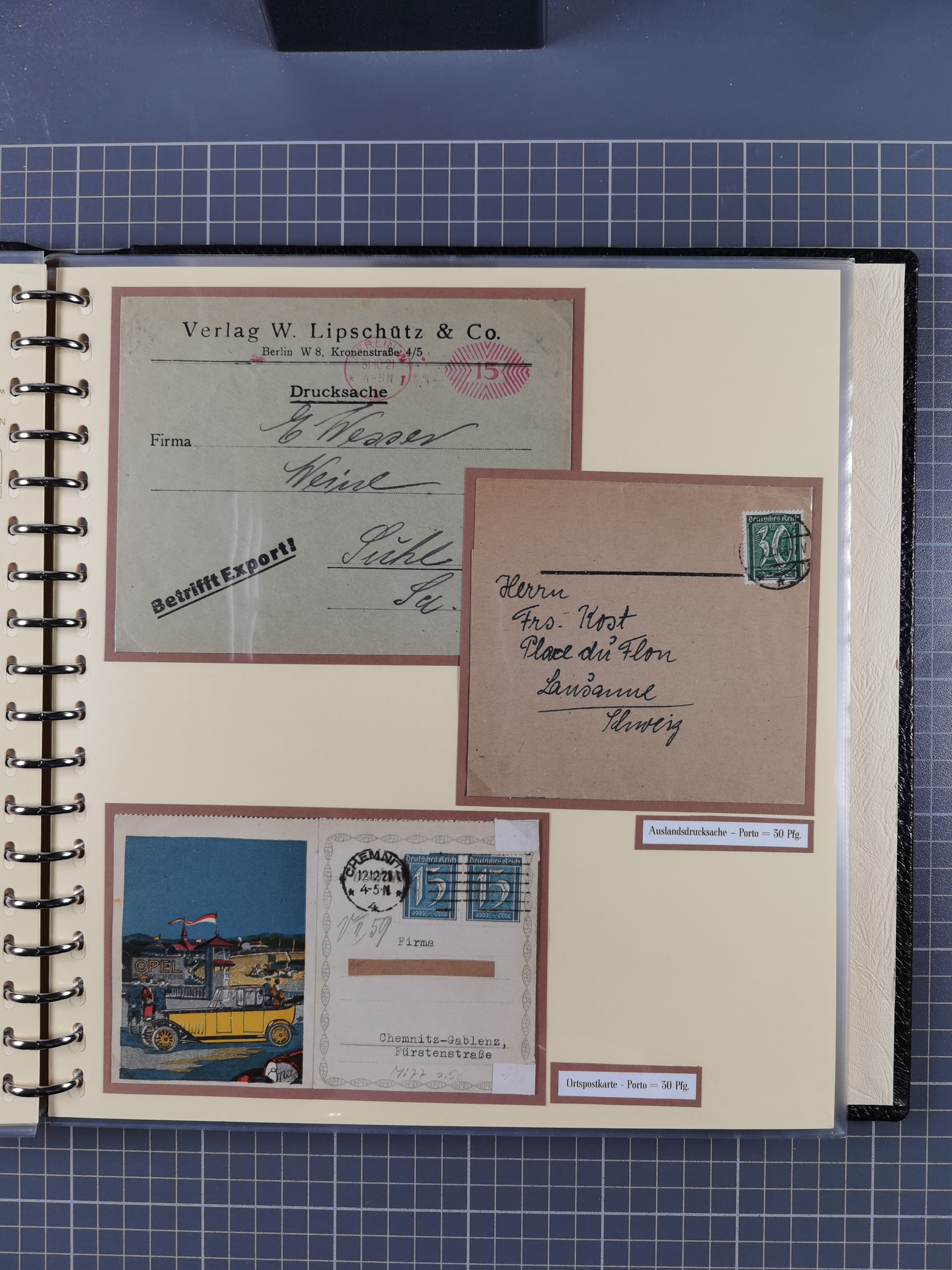 1872/1923, umfangreiche Sammlung mit ca. 800 Briefen,Karten und Ganzsachen. Am Anfang mit kleinem Teil “Hufeisentstempel”, ansonsten liegt der Schwerpunkt bei Infla mit Einzel- und Mehrfachfrankaturen, R-Briefen, Auslandspost, viel Hochinflation mit Dezember-Briefen und Portostufen. Alles auf selbst gestalteten Albenblättern in10 Alben