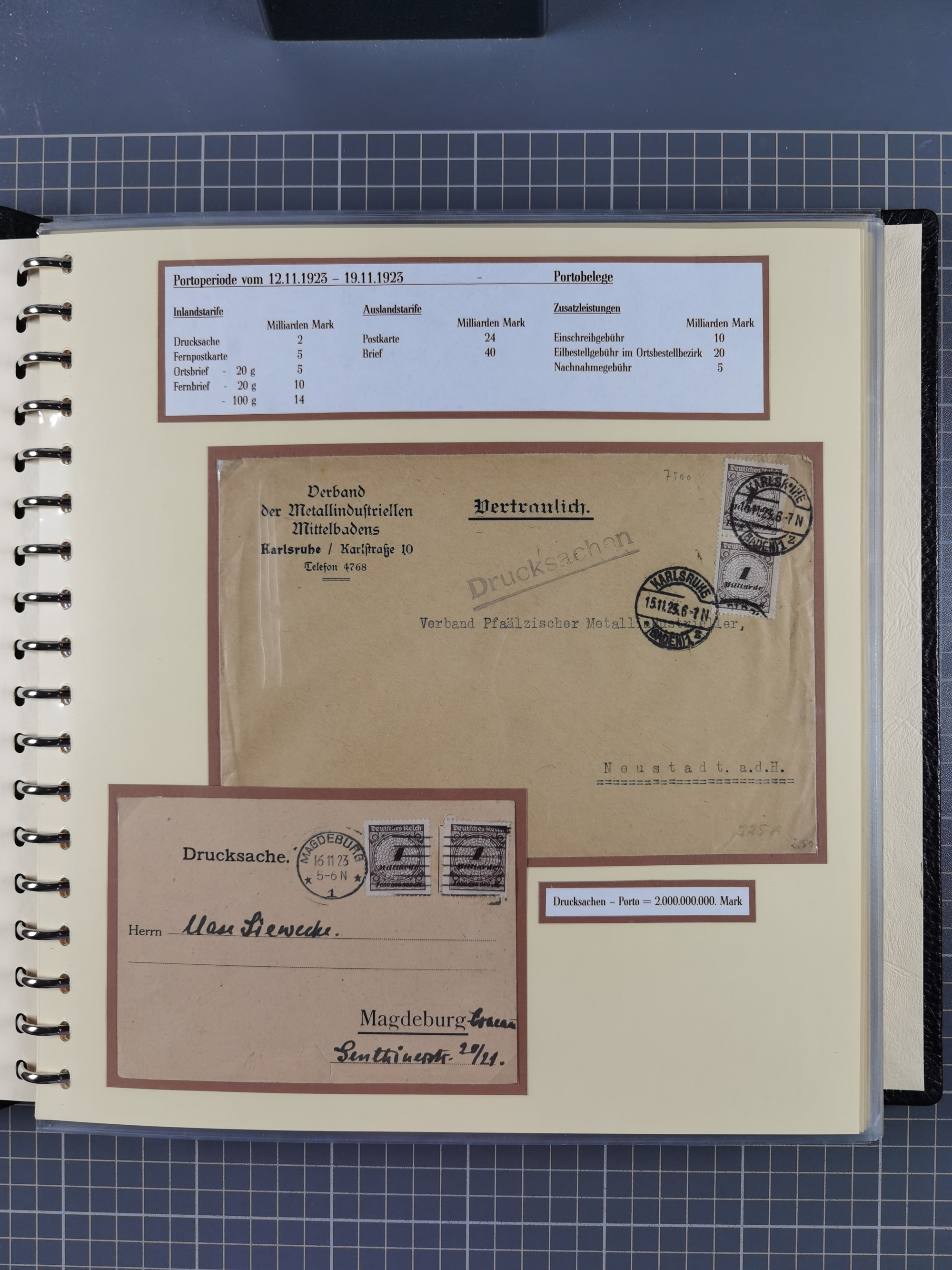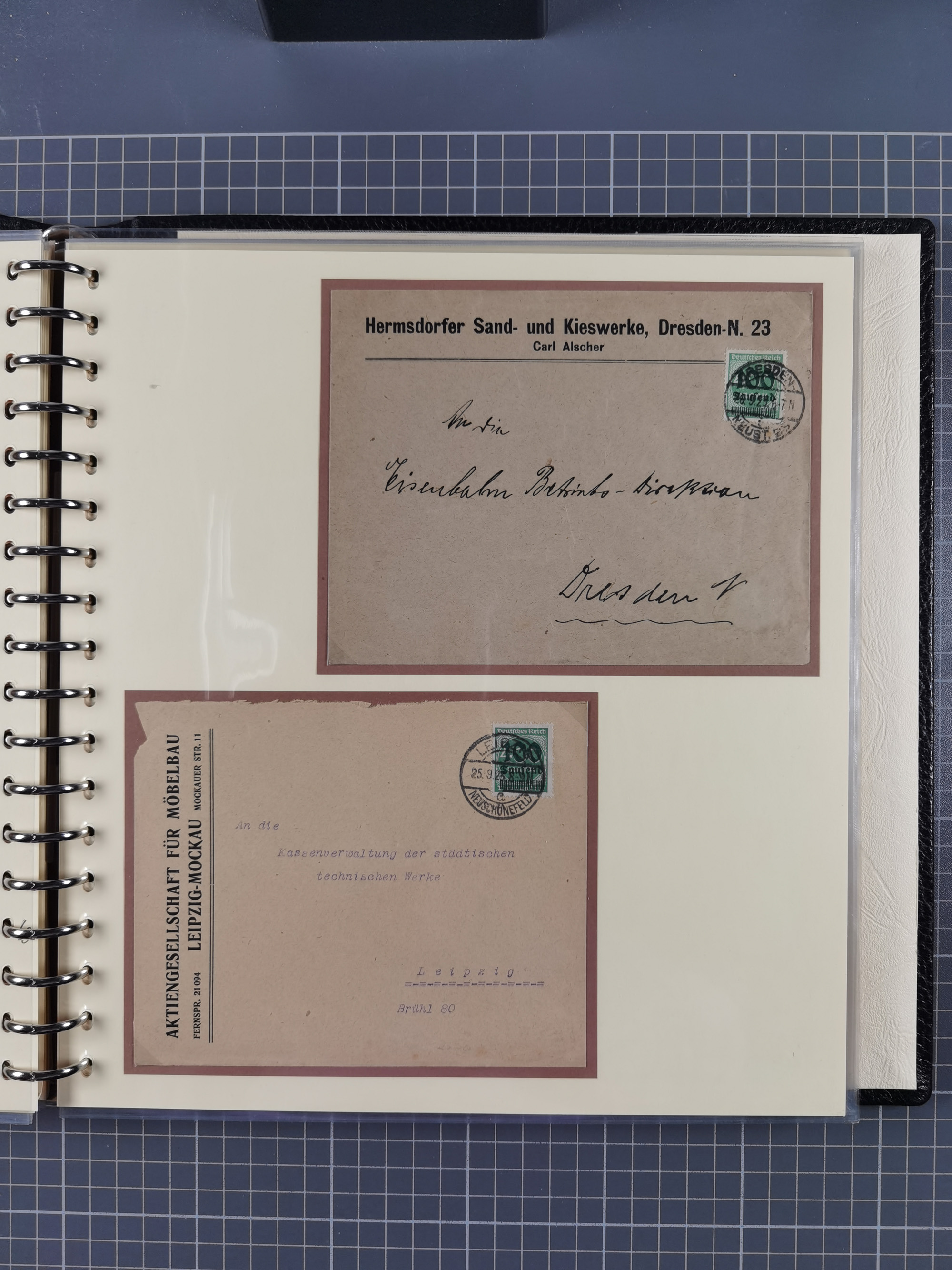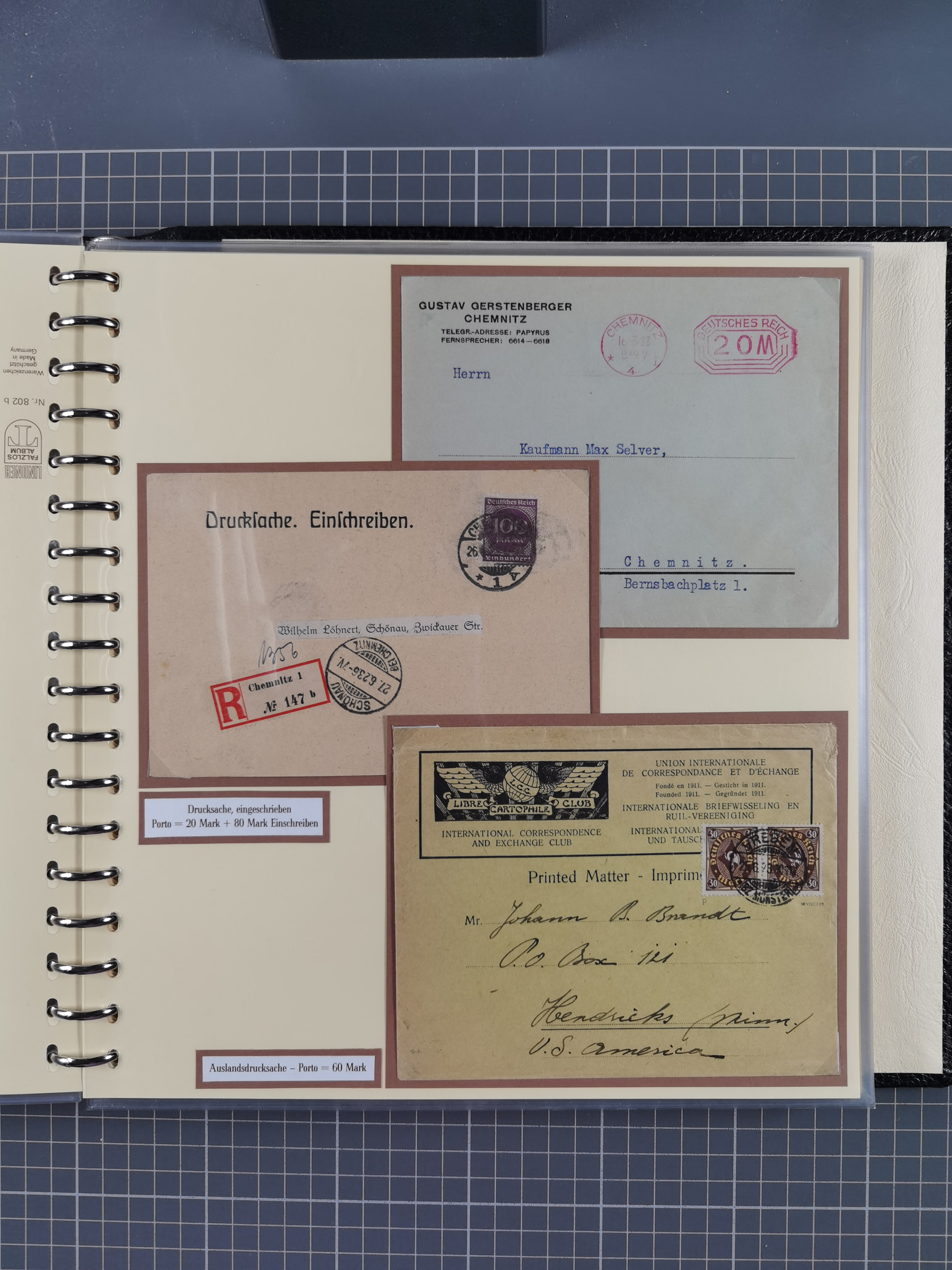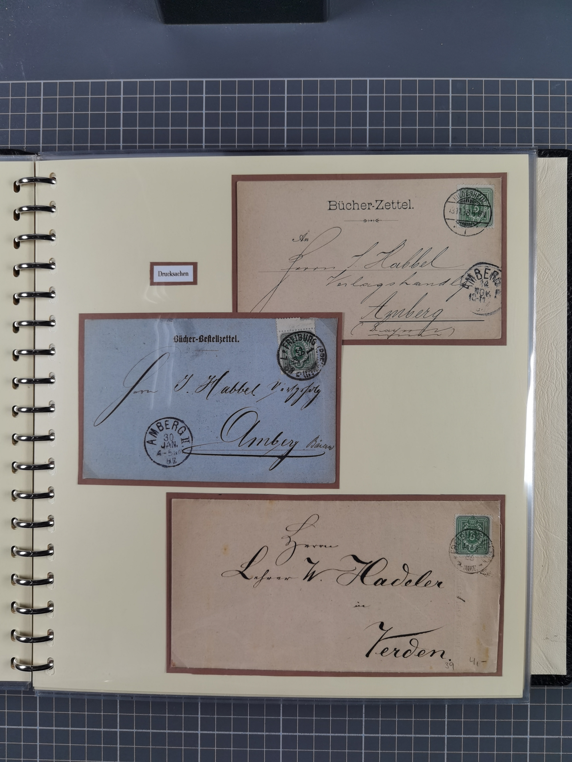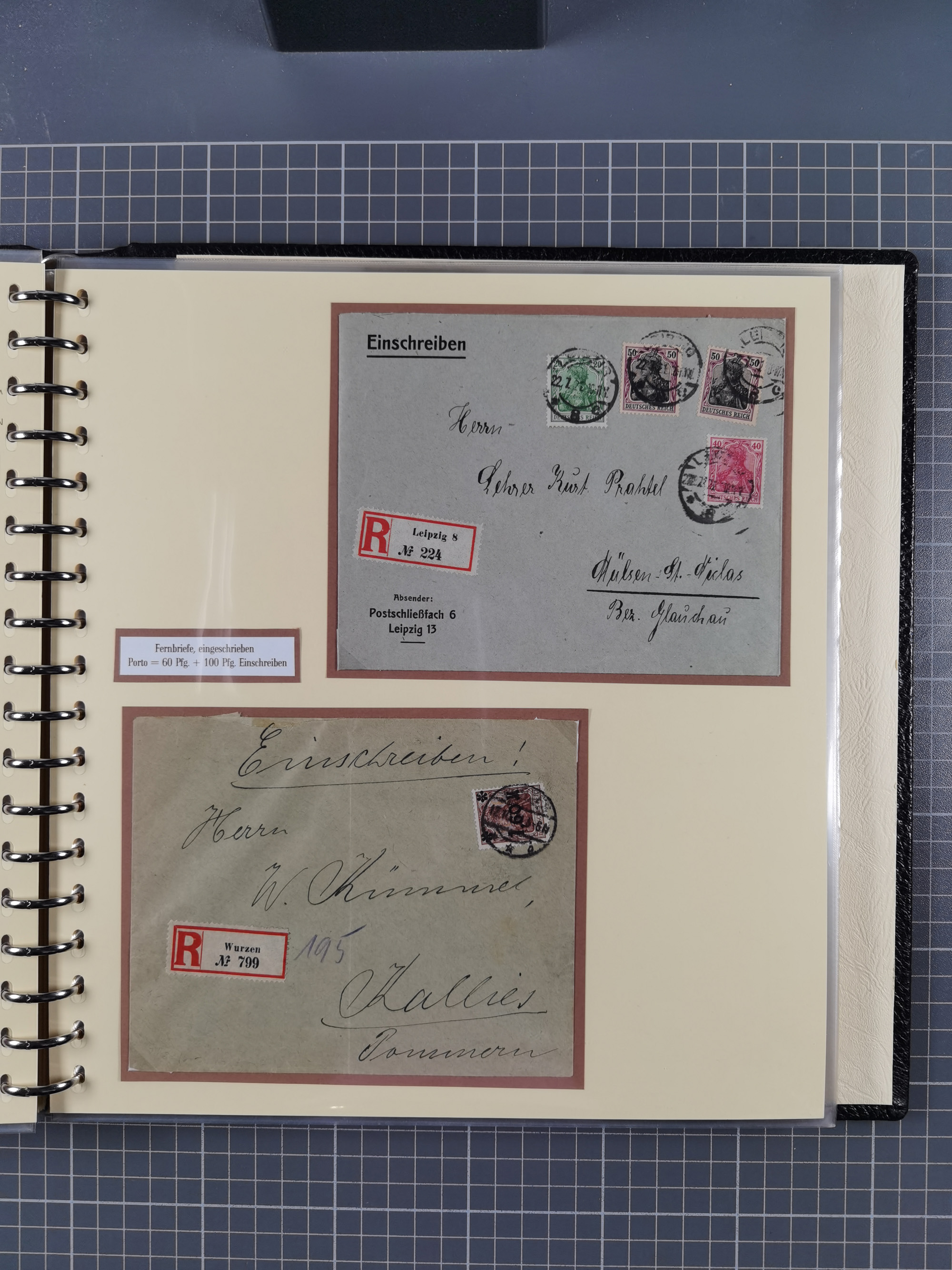 1872/1923, umfangreiche Sammlung mit ca. 800 Briefen,Karten und Ganzsachen. Am Anfang mit kleinem Teil “Hufeisentstempel”, ansonsten liegt der Schwerpunkt bei Infla mit Einzel- und Mehrfachfrankaturen, R-Briefen, Auslandspost, viel Hochinflation mit Dezember-Briefen und Portostufen. Alles auf selbst gestalteten Albenblättern in10 Alben