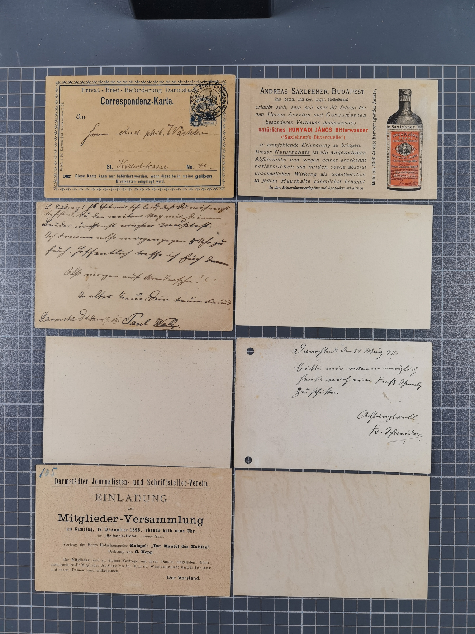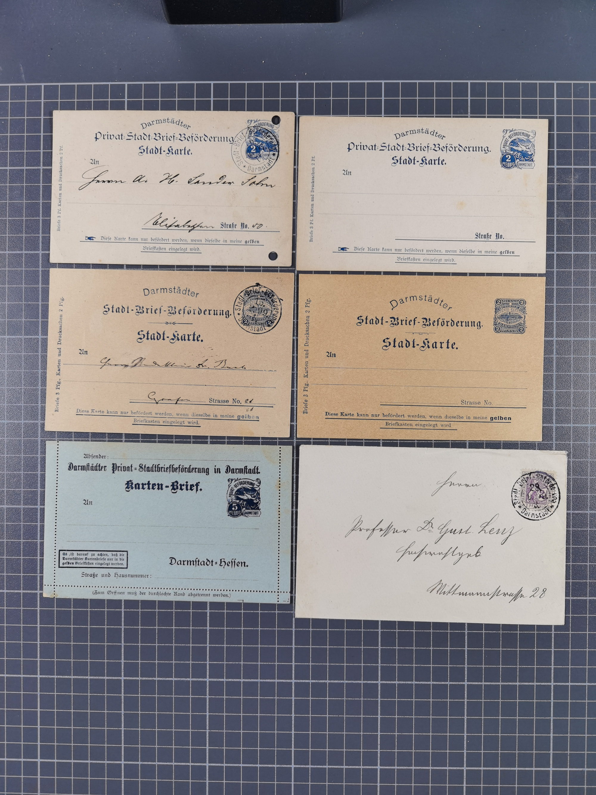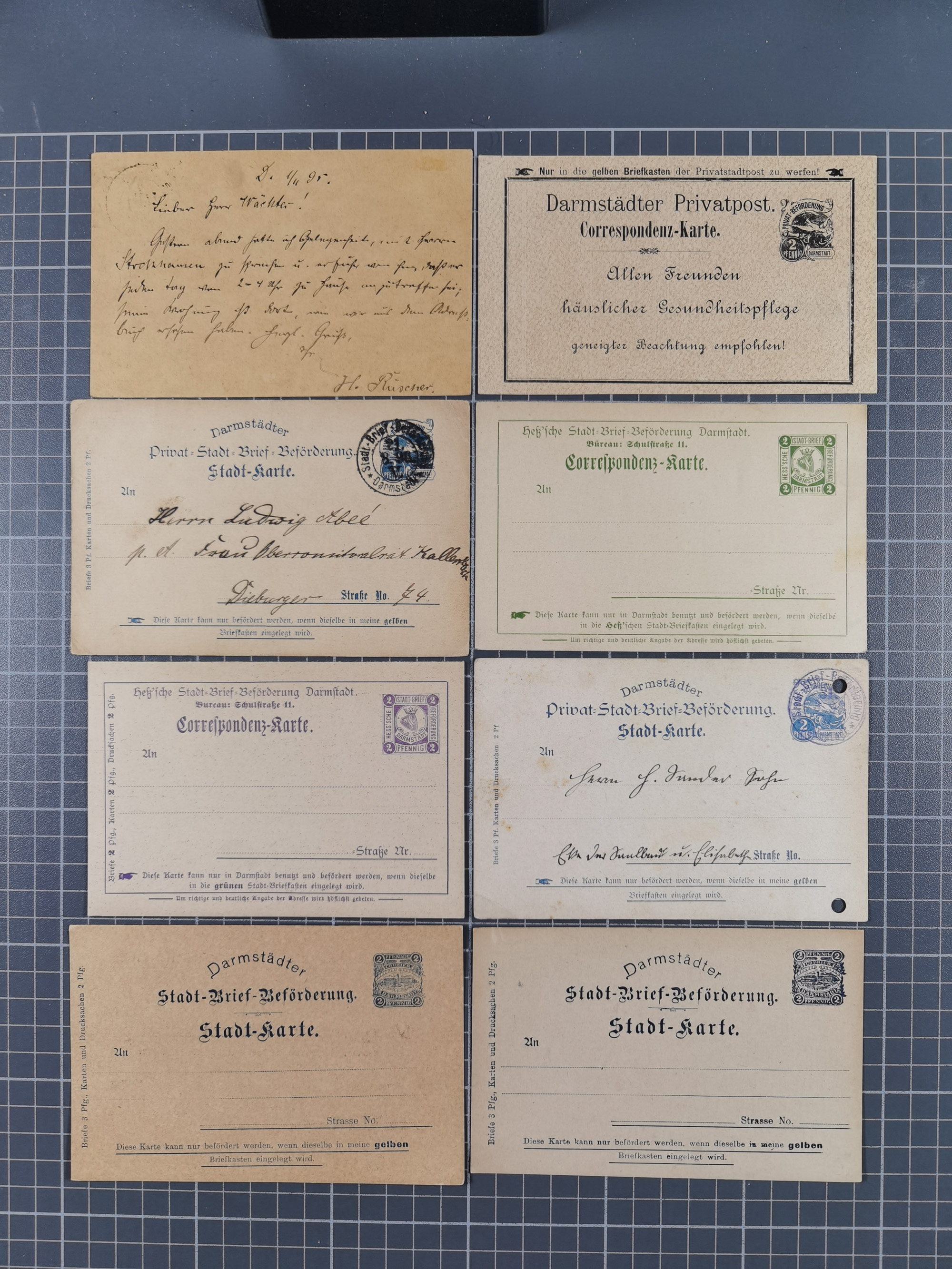 Darmstadt-Privat-Befördung: 1895/1900, Partie mit 11 ungebrauchten und gebrauchten Ganzsachen inkl. zwei ungebrauchten GSK der Hess'sche Stadt-Brief-Beförderung. Dabei u.a. P2 und P5 gebraucht und GSK 2 Pfg. schwarz mit rückseitigem Bild-Zudruck der Fa. Saxlehner, dazu Mi.-Nr. 13 auf Brief