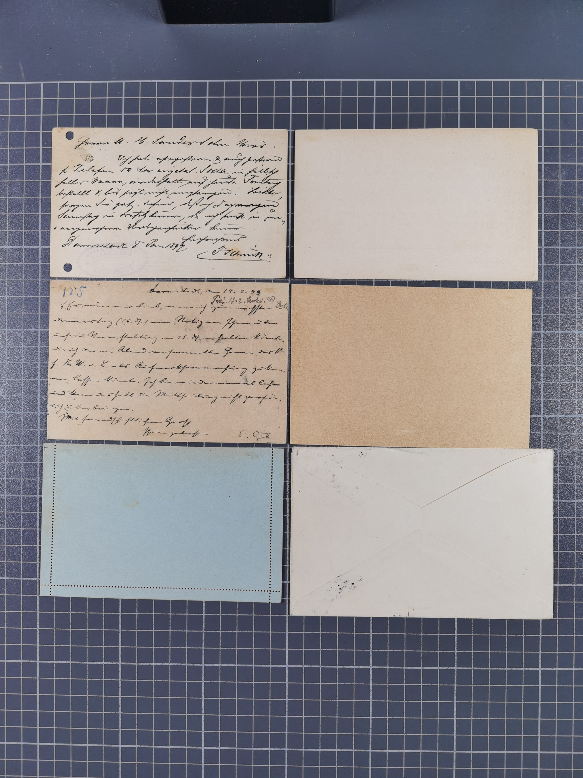 Gladbacher Courier: 1897/99, Ausgabe 1897 3 Pfg. blau, zwei Einzelmarken auf zwei Postkarten, dazu weitere Postkarte mit Ausgabe 1899 3 Pfg. dunkelblau und Ganzsachenkarte 3 Pfg. blau gebraucht mit viel Text. Eine Karte mit Altersflecken, ansonsten in guter Erhaltung (Mi.-Nr. 2,7b,P1)