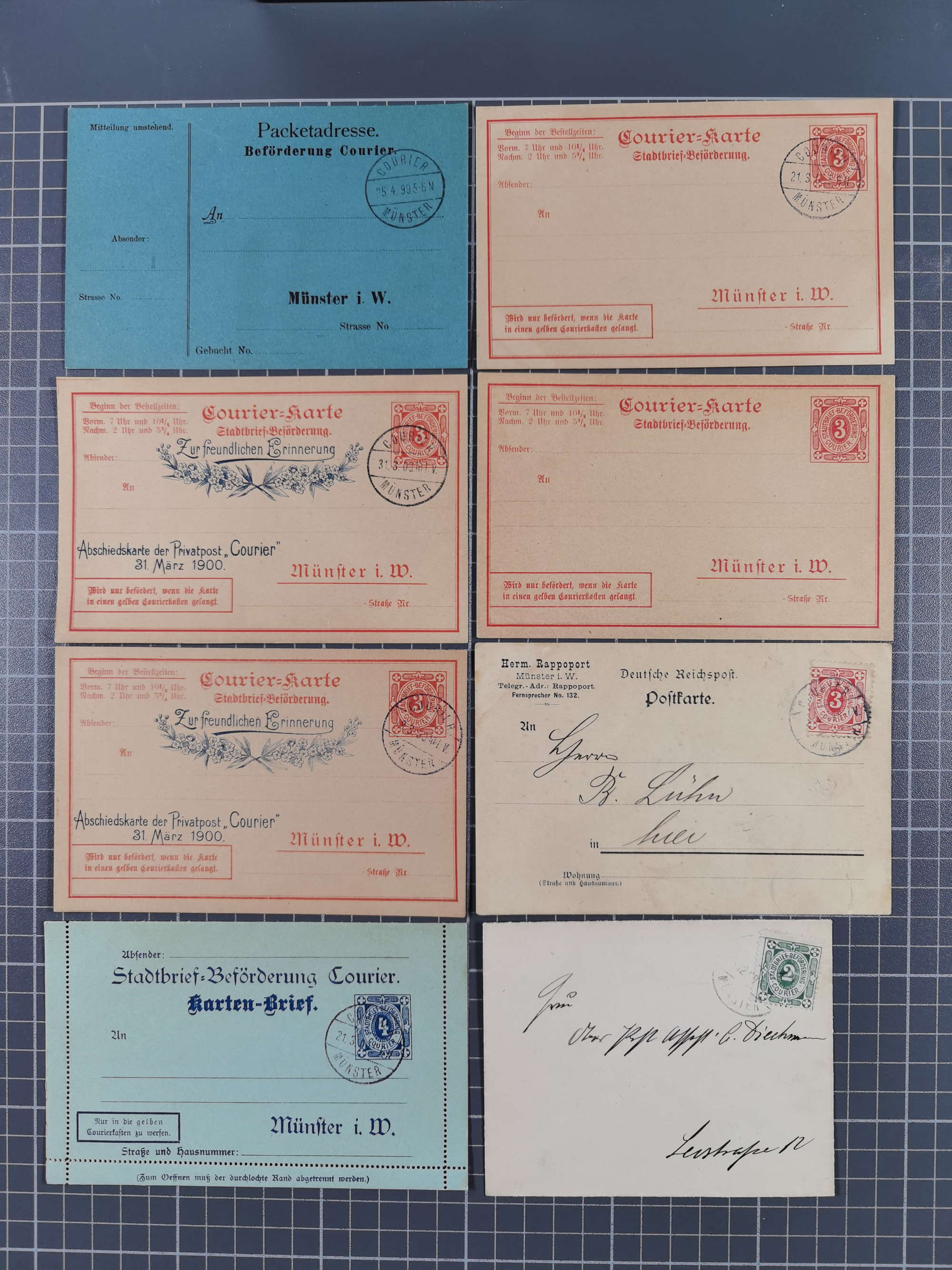 Münster-Courier: 1897/1900, Partie mit Mi.-Nr. 1 auf Firmenpostkarte und Mi.-Nr. 2 auf Ortsbrief sowie fünf ungebrauchte Ganzsachen (4x mit Blankostempel) mit u.a. 2x P5 sowie Paketadresse mit Blanko-Stempel, in guter Erhaltung