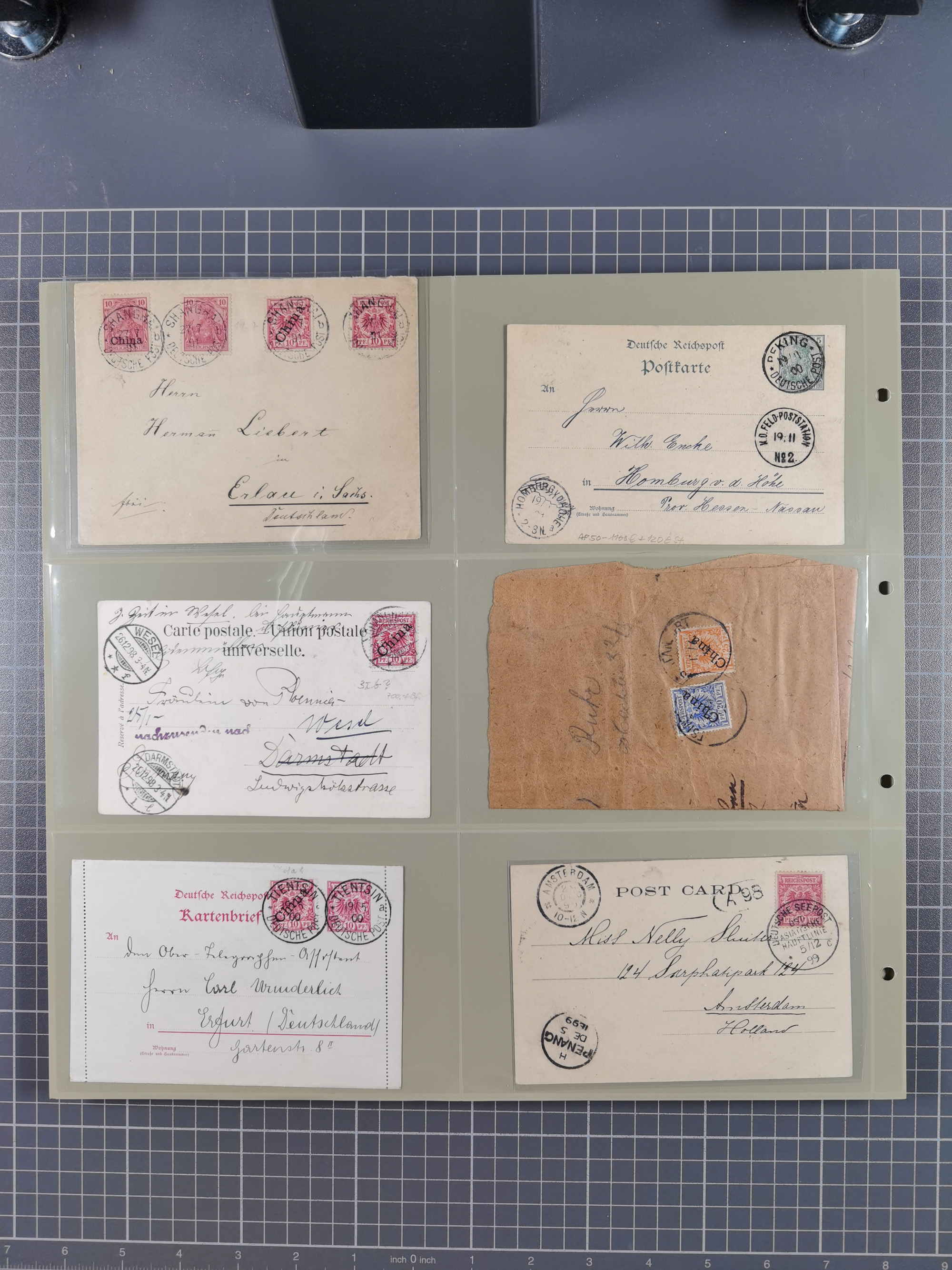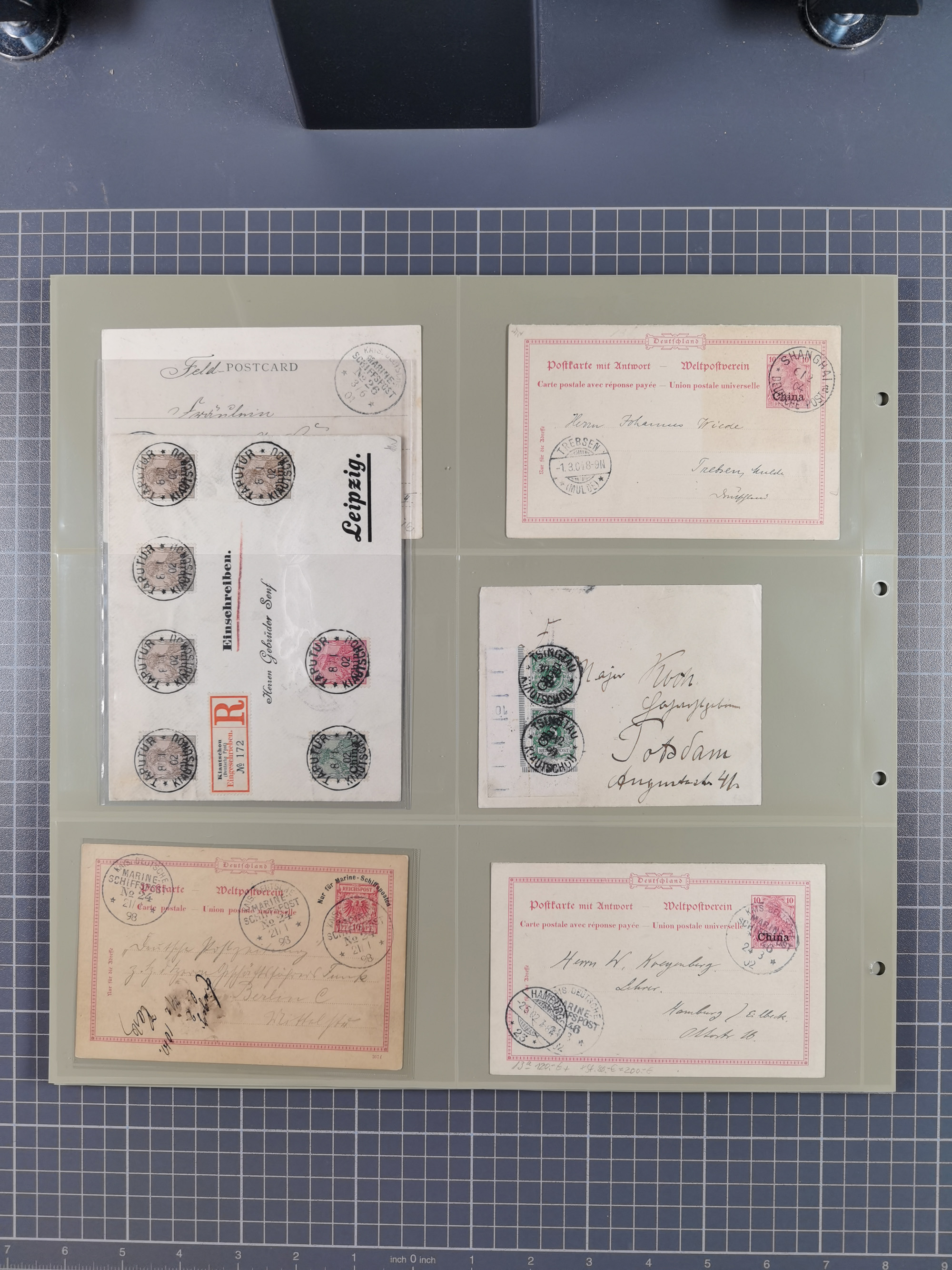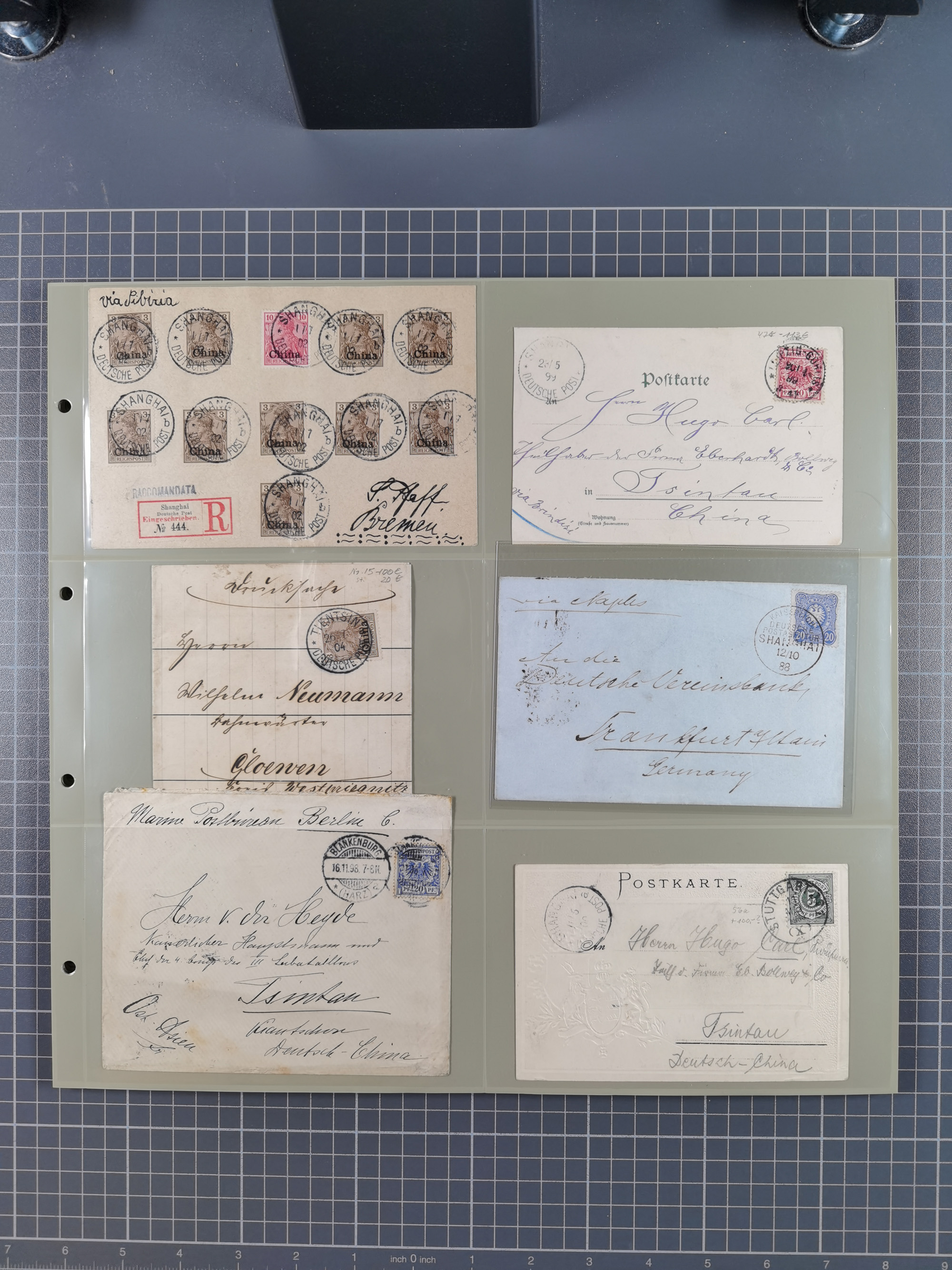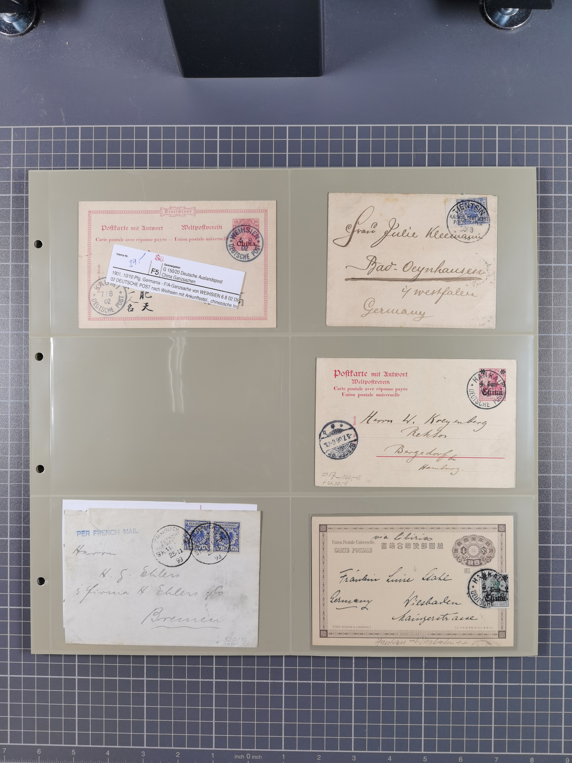1895/1915, 25 Briefe und Karten, sowie ein Vorderseiter, inklusive Vorläufer, mit besseren Frankaturen und Verwendungen, dabei. u.a. R-Karte mit “SHANGHAI 24 2 02” nach Hamburg, “ZENSUR PASSIERT DEUTSCH-OSTAFRIKA” auf Brief mit “DARESSALAM 18 2 17” nach Augsburg, “SHANGHAI 4 10 95” auf Mi.-Nr. V48 (x2) und V50 (x2) auf R-Brief nach Soltau, etc., zum Teil etwas leicht unterschiedlich
