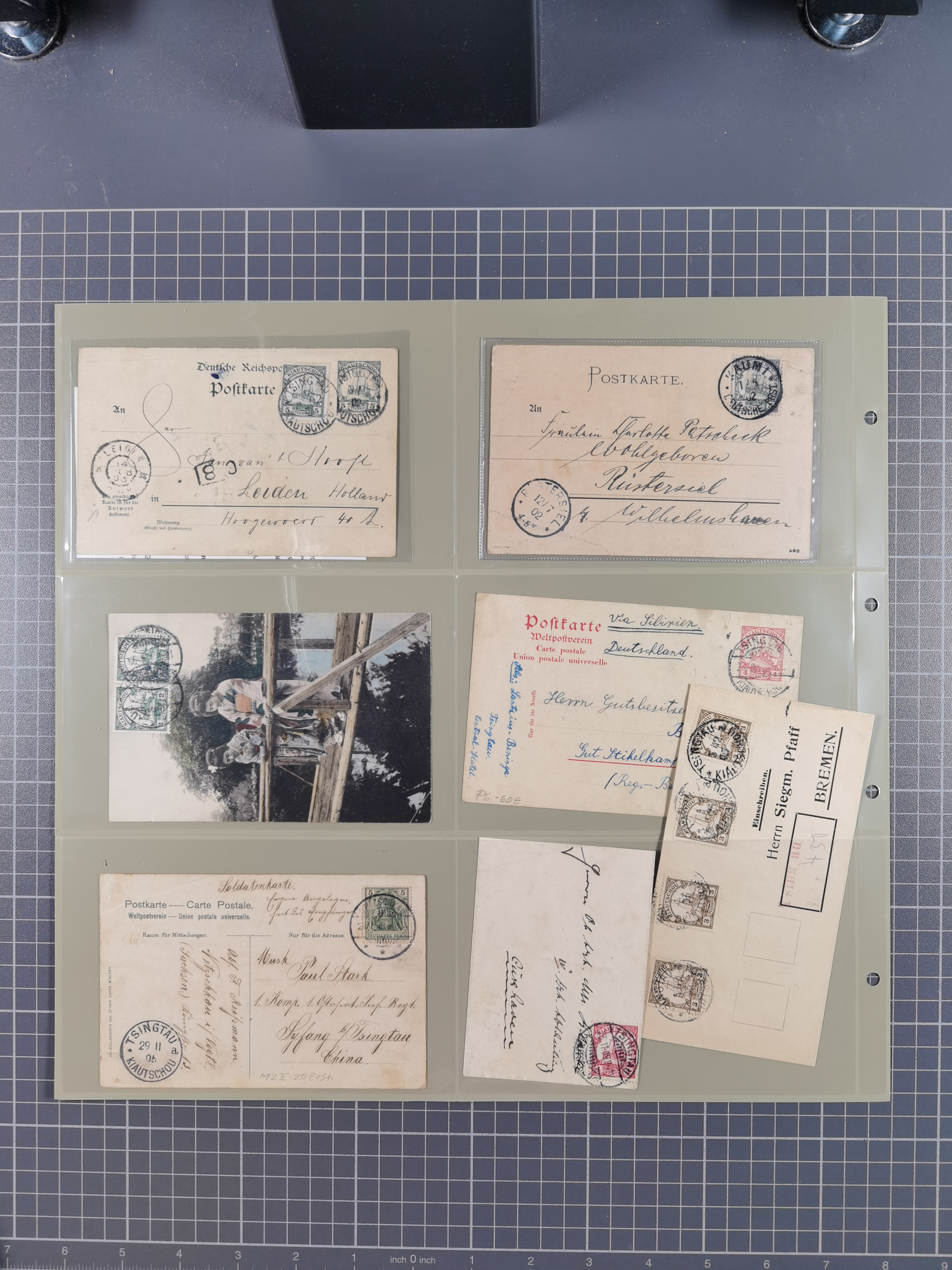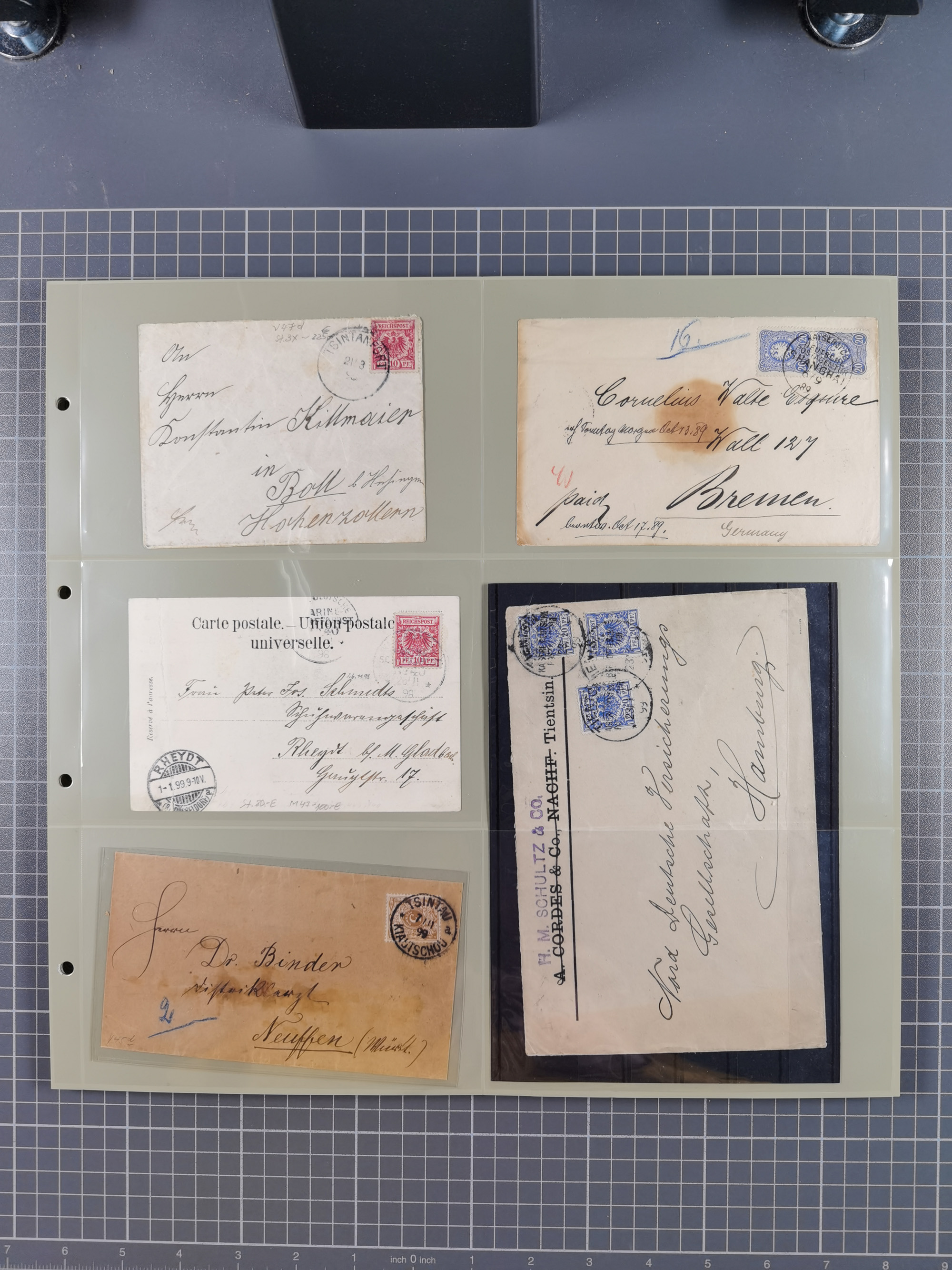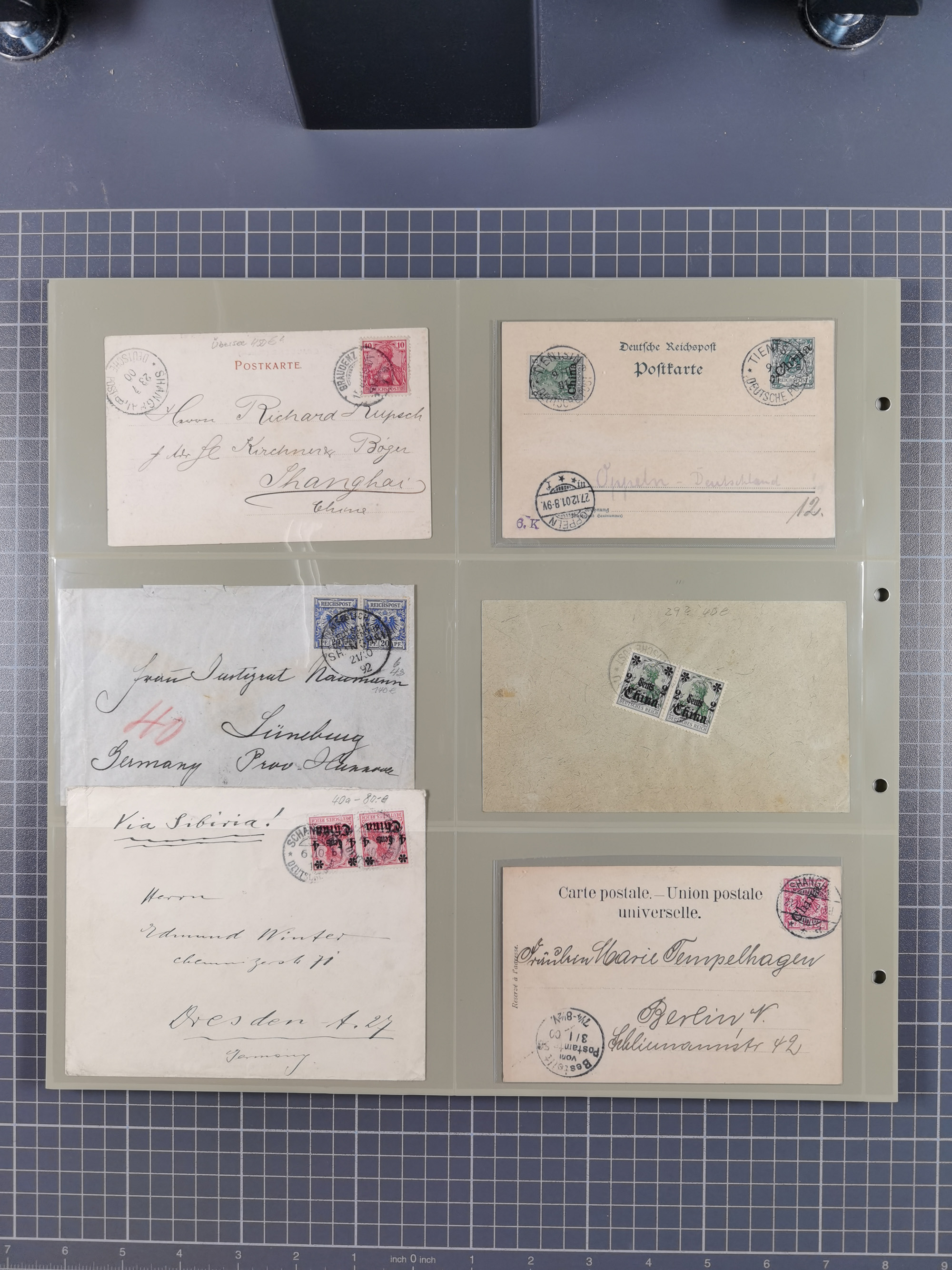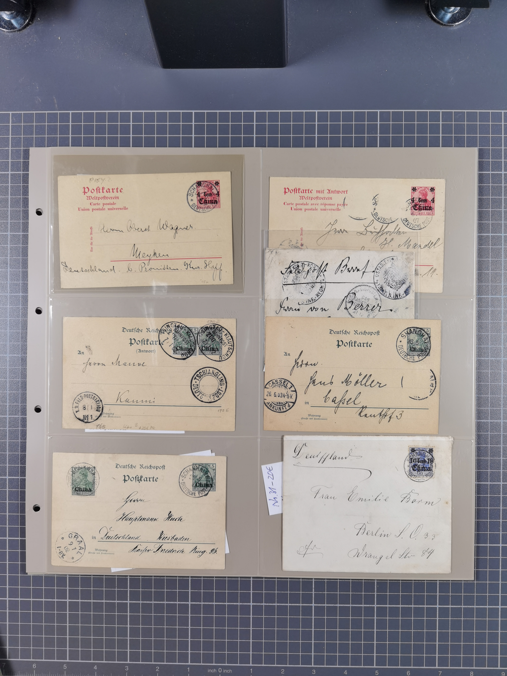 1895/1915, 25 Briefe und Karten, sowie ein Vorderseiter, inklusive Vorläufer, mit besseren Frankaturen und Verwendungen, dabei. u.a. R-Karte mit “SHANGHAI 24 2 02” nach Hamburg, “ZENSUR PASSIERT DEUTSCH-OSTAFRIKA” auf Brief mit “DARESSALAM 18 2 17” nach Augsburg, “SHANGHAI 4 10 95” auf Mi.-Nr. V48 (x2) und V50 (x2) auf R-Brief nach Soltau, etc., zum Teil etwas leicht unterschiedlich
