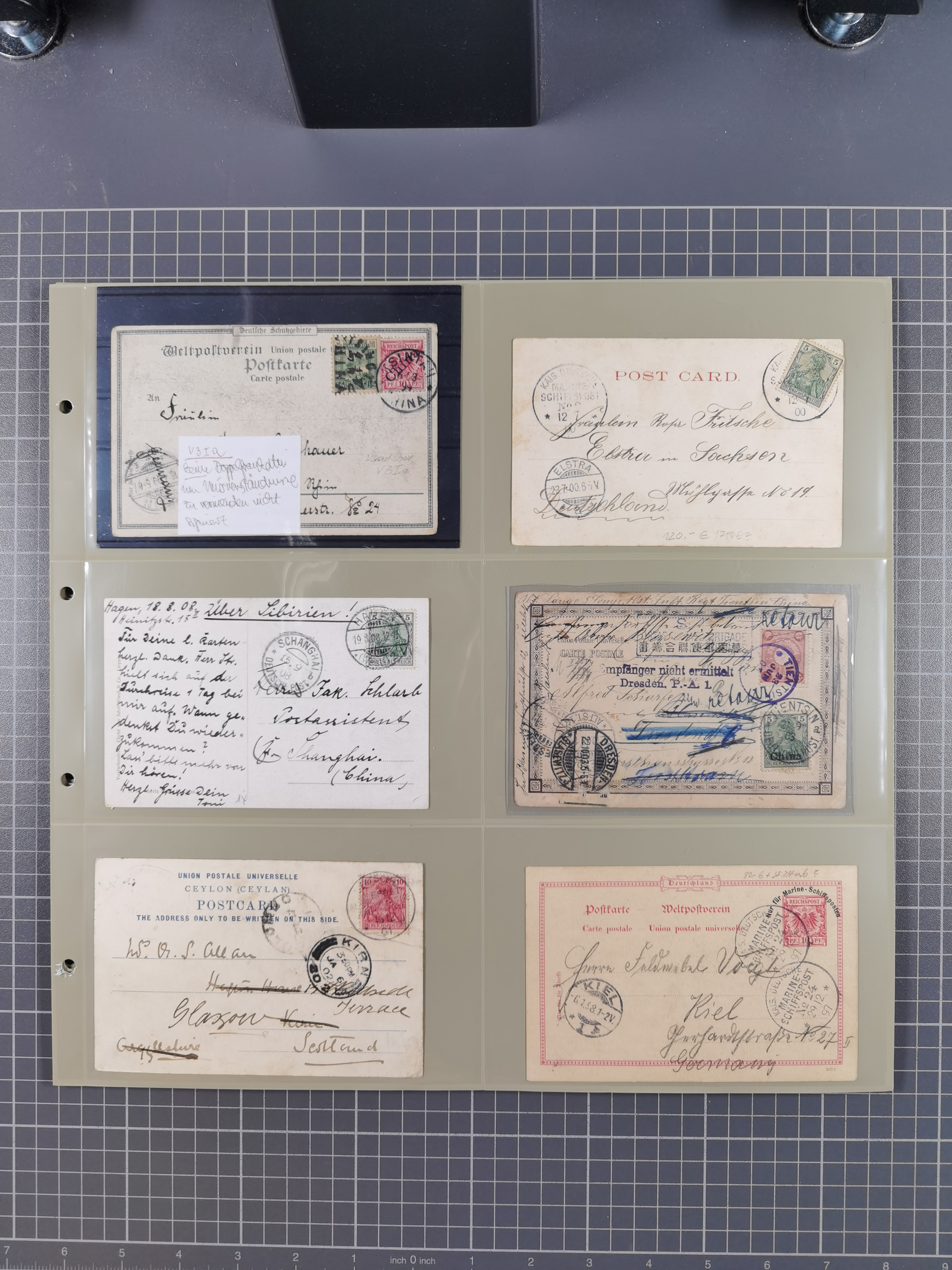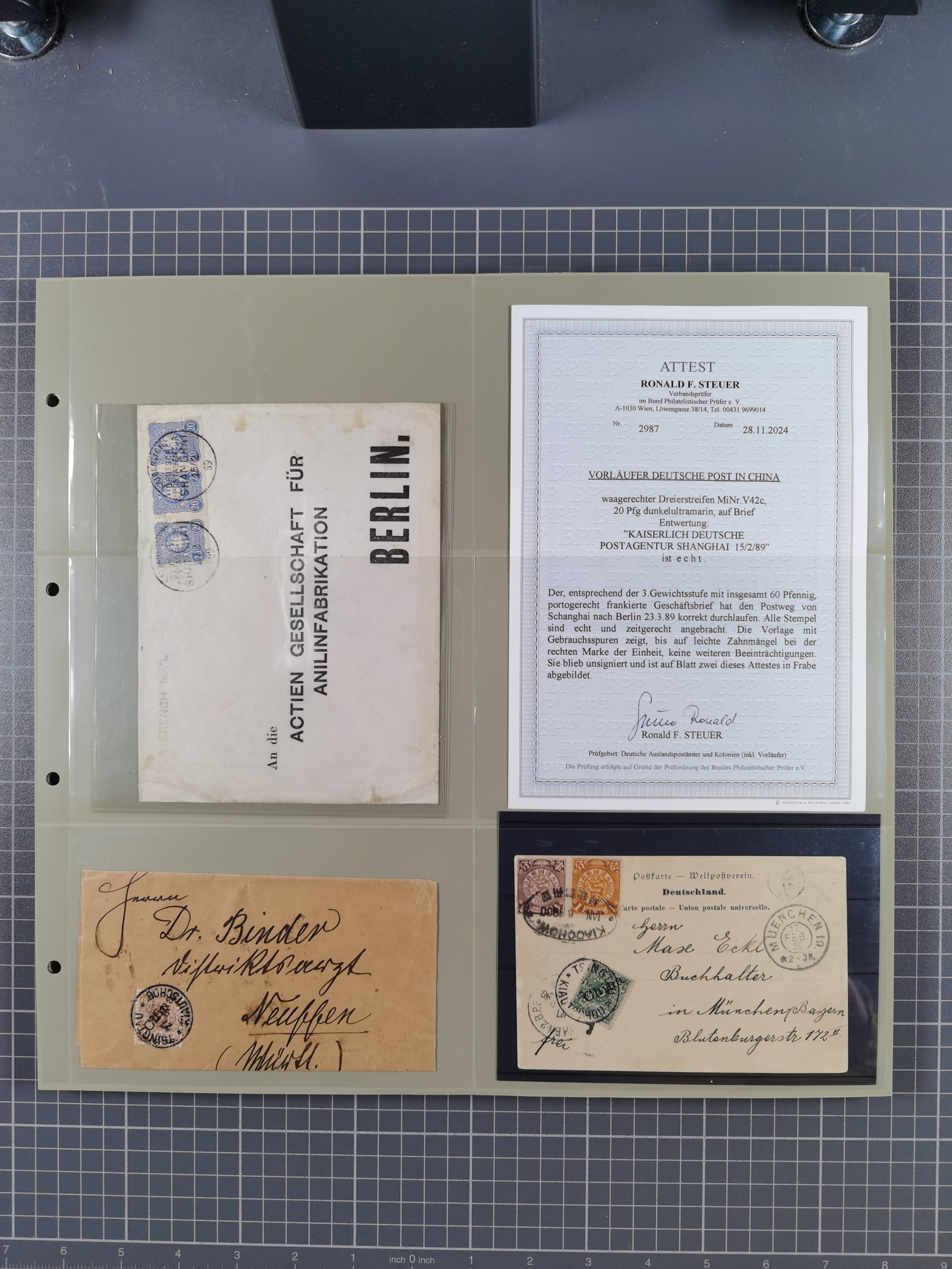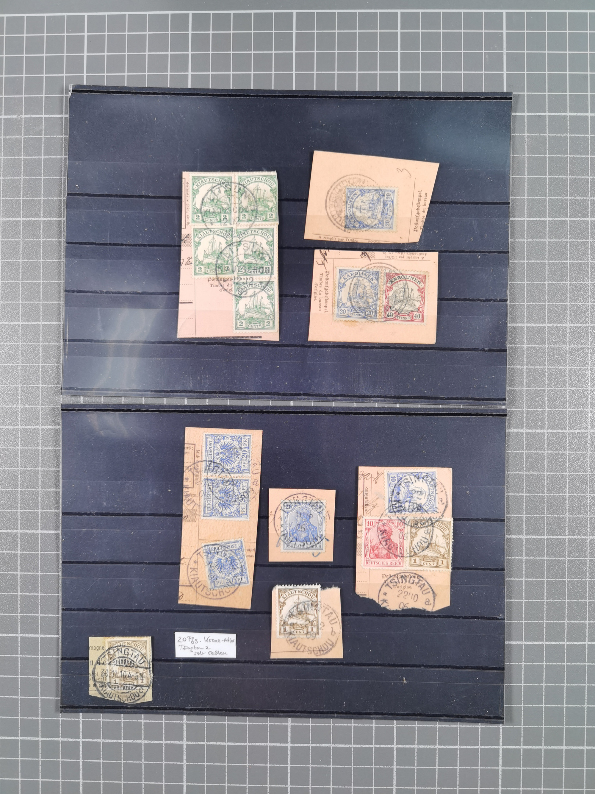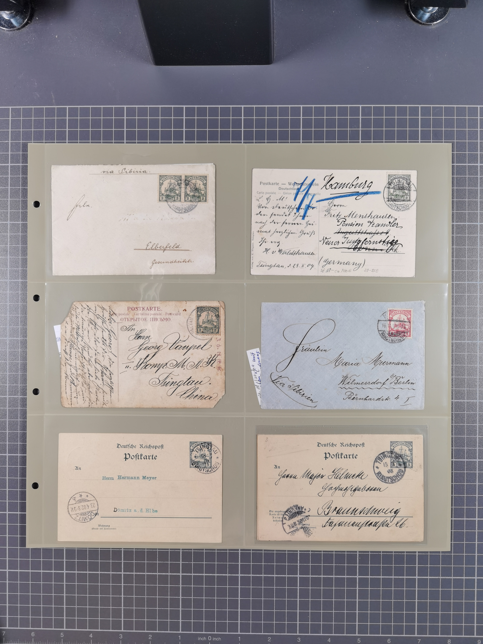 1895/1915, 25 Briefe und Karten, sowie ein Vorderseiter, inklusive Vorläufer, mit besseren Frankaturen und Verwendungen, dabei. u.a. R-Karte mit “SHANGHAI 24 2 02” nach Hamburg, “ZENSUR PASSIERT DEUTSCH-OSTAFRIKA” auf Brief mit “DARESSALAM 18 2 17” nach Augsburg, “SHANGHAI 4 10 95” auf Mi.-Nr. V48 (x2) und V50 (x2) auf R-Brief nach Soltau, etc., zum Teil etwas leicht unterschiedlich