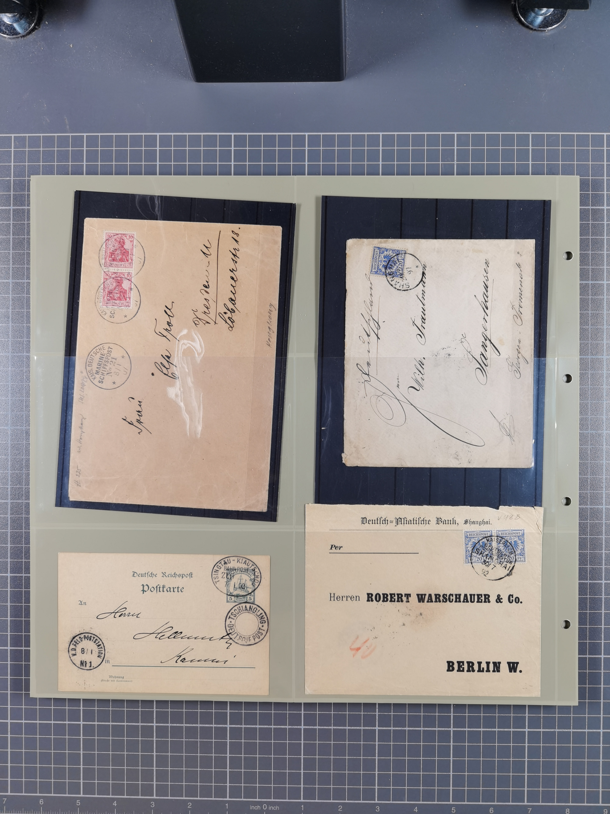 1889/1910 (ca.), Sammlung mit über 75 Briefen und Karten, inkl. Kiautschou, mit Vorläufern, Feldpost- und Schiffspost, interessanten Mehrfach- und Mischfrankaturen, R-Brief und weiteren Besonderheiten, dabei u.a Mi.-Nr. V42c 3er-Streifen mit “KAISERLICH DEUTSCHE POSTAGENTUR SHANGHAI 15 2 89” auf Brief nach Berlin (FA Steuer BPP), 5 Pfg. Ganzsachekarte mit “TSINGATAU-KIAUTSCHOU BAHNPOST” und nebegesetztem 2Kr. “TSCHIANGLING DEUTSCHE POST” und “K.D.FELD POSTSTATION N°1”, etc., zum Teil leicht unterschiedlich, meist aber in schöner Gesamterhaltung, ein empfehlenswertes Objekt