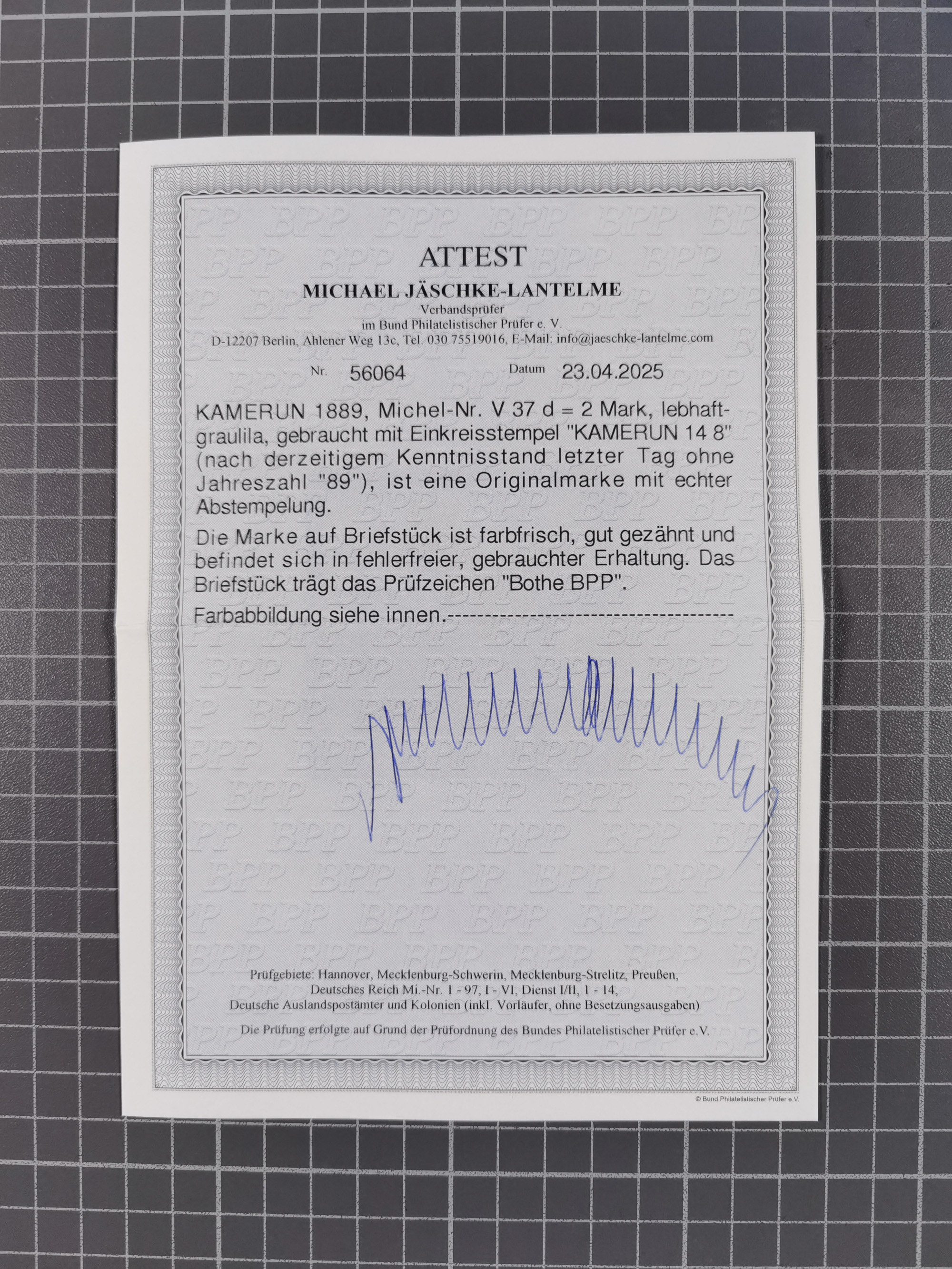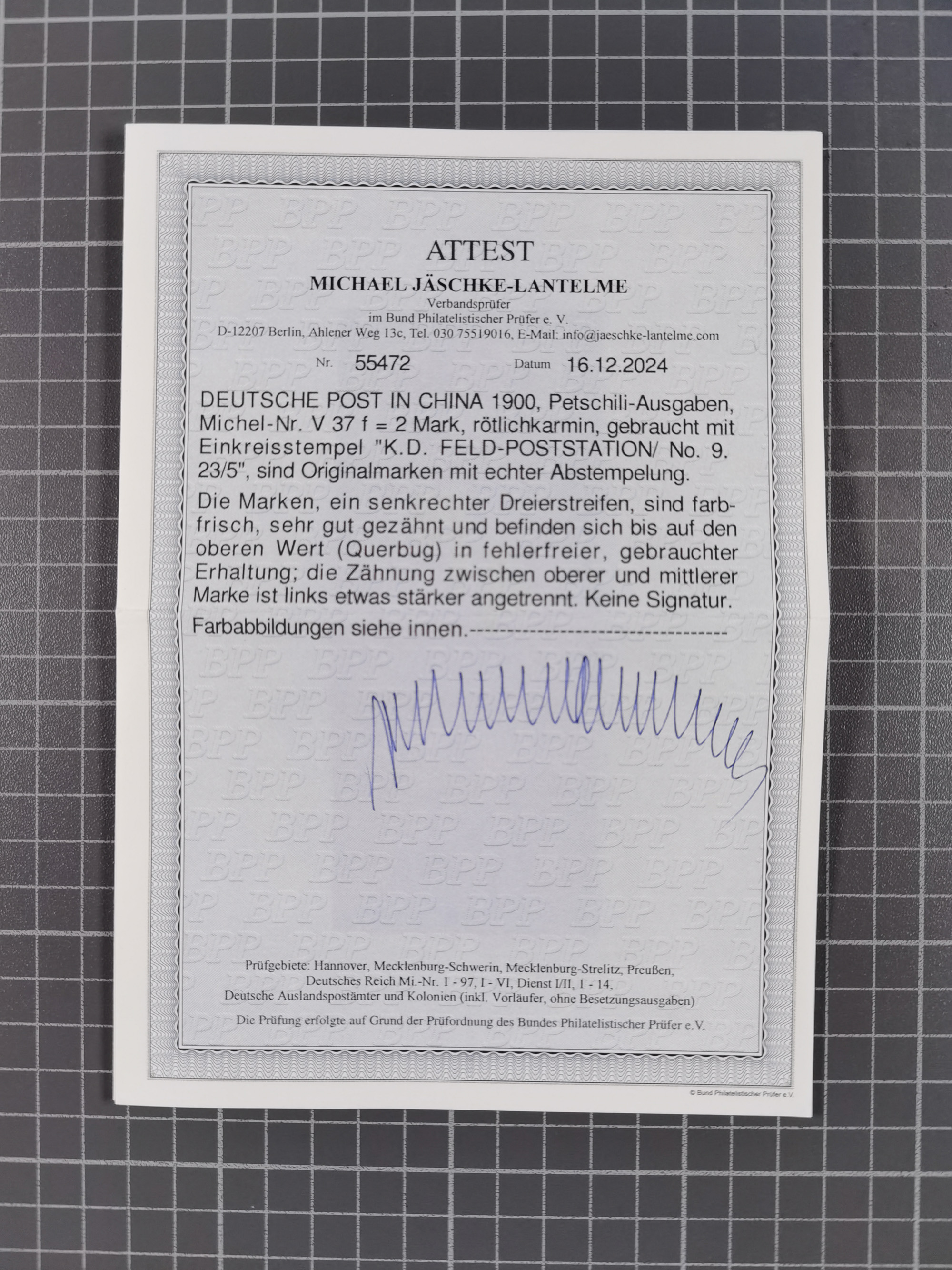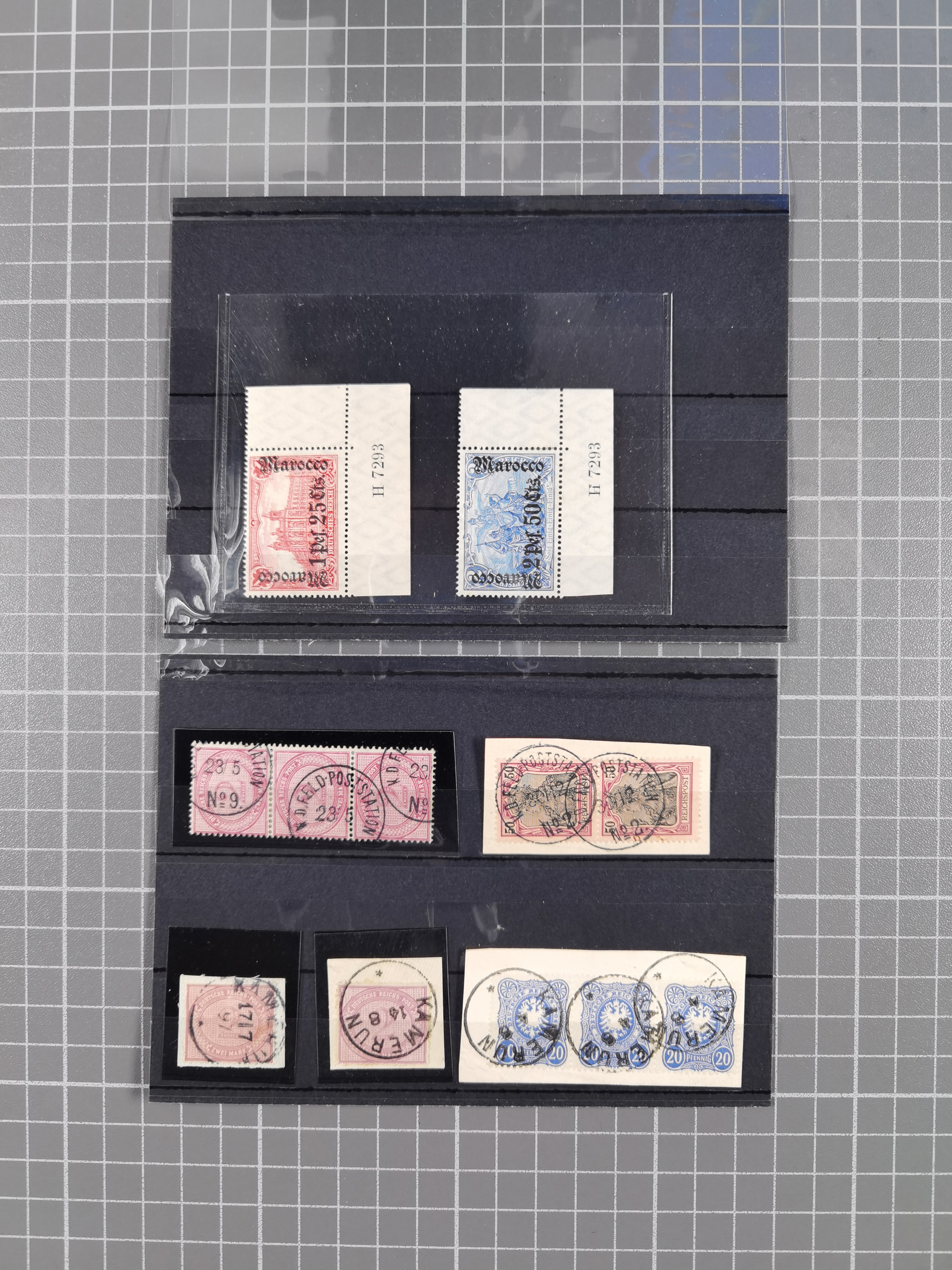 1887/1911, Partie mit besseren Marken ab Vorläufer-Ausgaben, mit DP China Dreierstreifen Mi.-Nr. V37f (FA Jäschke-L. BPP) und senkrechtes Paar Mi.-Nr. PVg auf Briefstück, DP Marokko Mi.-Nr. 43HAN und 44HAN ungebraucht, Kamerun Mi.-Nr. V37c und V37d je auf Briefstücken (jeweils FA Jäschke-L. BPP) sowie Dreierstreifen Mi.-Nr. V42c mit Stempel “KAMERUN” ohne Jahreszahl auf Briefstück (sign. Dr. Steuer BPP), in guter Erhaltung