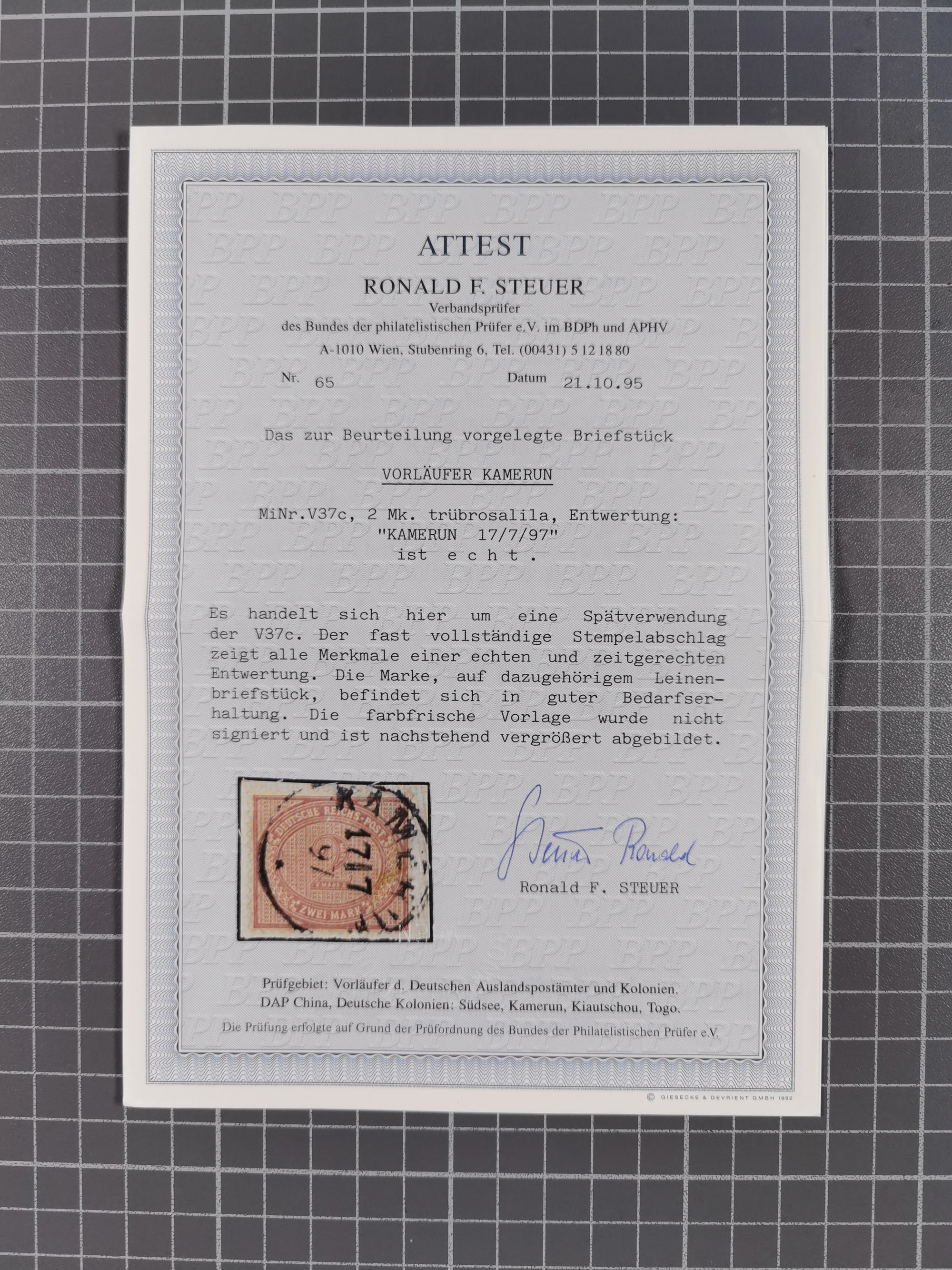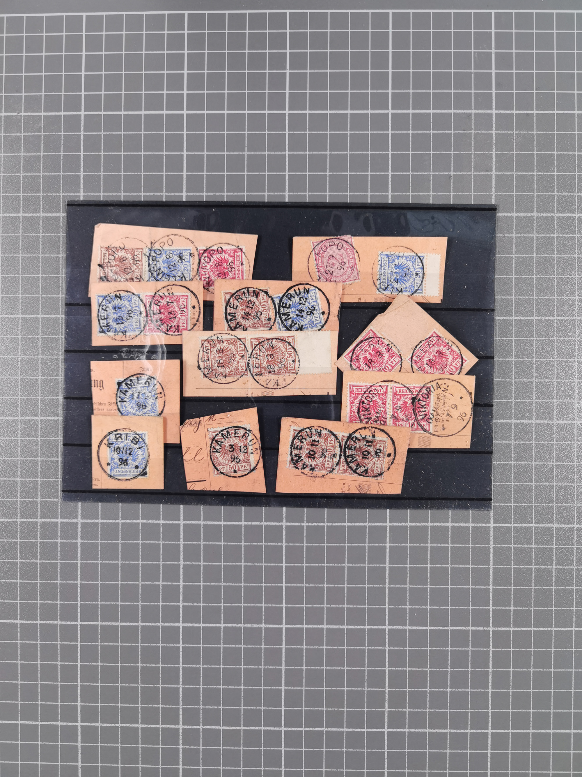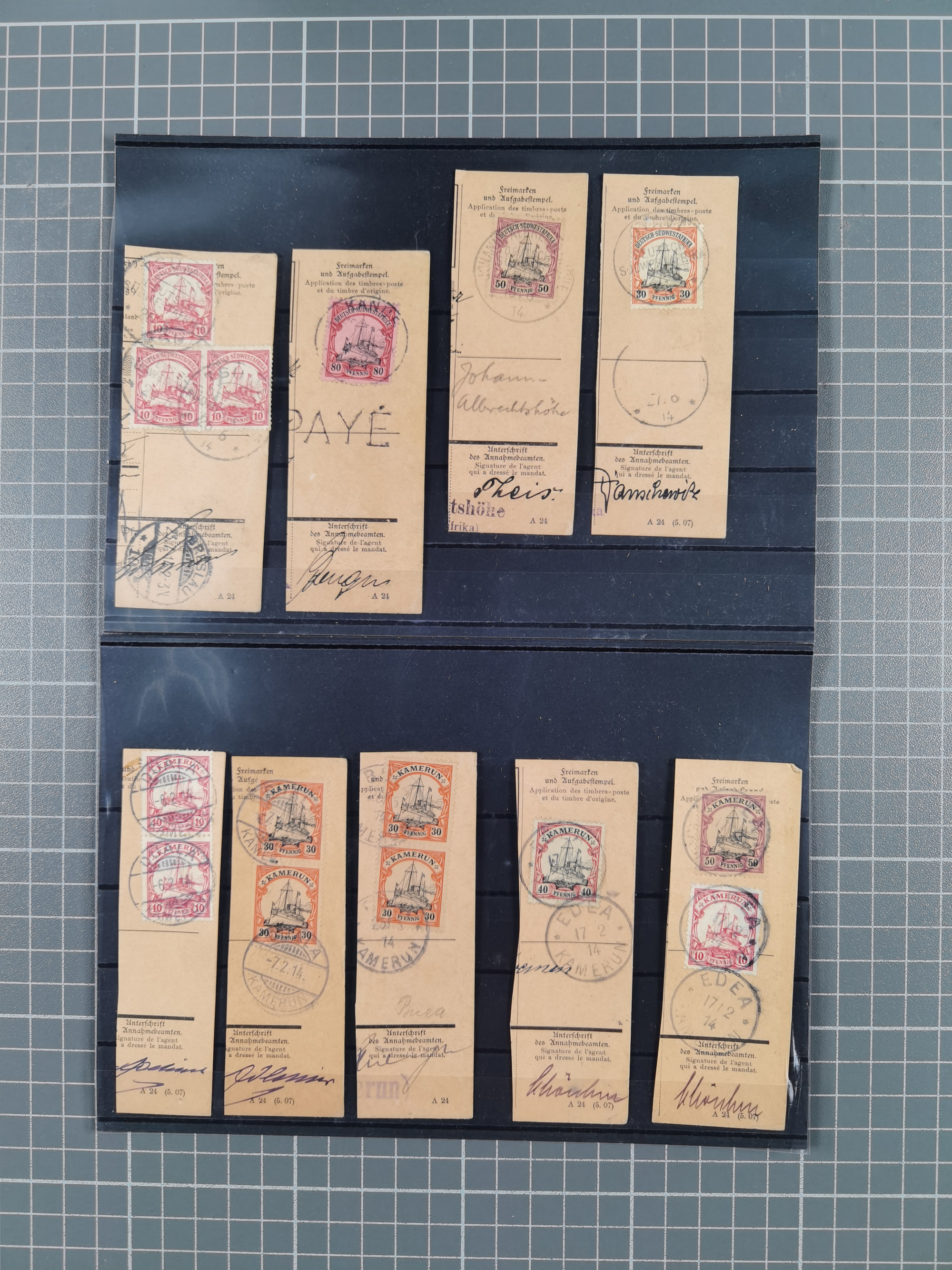 1873/1913, Partie mit 10 Briefen, Karten und GSK mit besseren Stempeln, interessanten Frankaturen und Verwendungen. Dabei u.a. waagerechter Dreierstreifen Brustschild 1 Gr. auf Brief von “BERLIN” 1873 nach Konstantinopel mit Ankunftsstempel der DP Türkei, Kamerun V39b, V40II,V41b und V42c jeweils mit Stempel “KAMERUN” ohne Jahreszahl auf Briefkuvert (zwei Fotoattest Dr. F. Steuer BPP und Jäschke-L. BPP) und Notpaketkarte von “HAMBURG” 1913 nach Buea mit rückseitig frankierter Kaiseryacht 40 Pfg., meist in guter Erhaltung