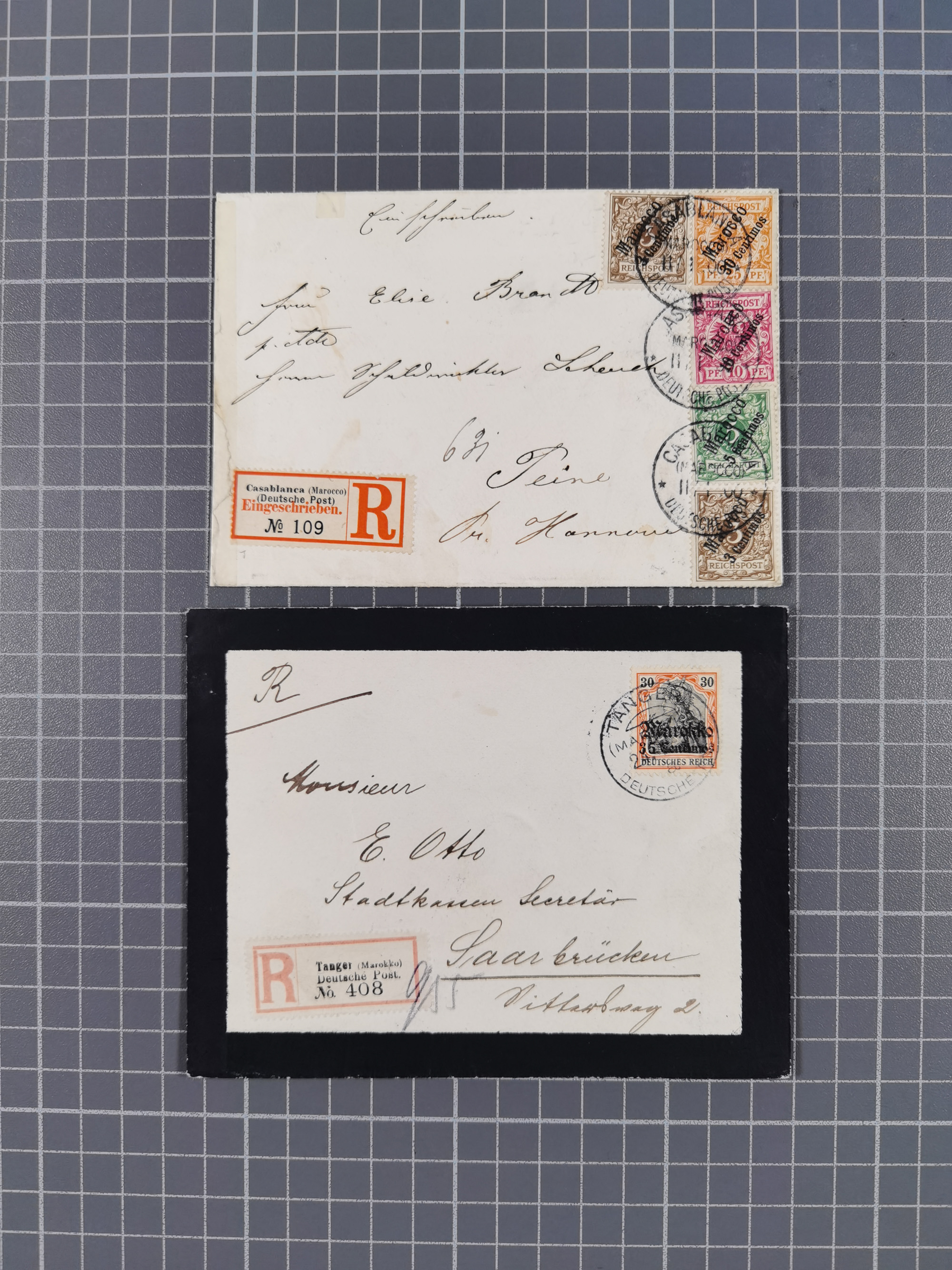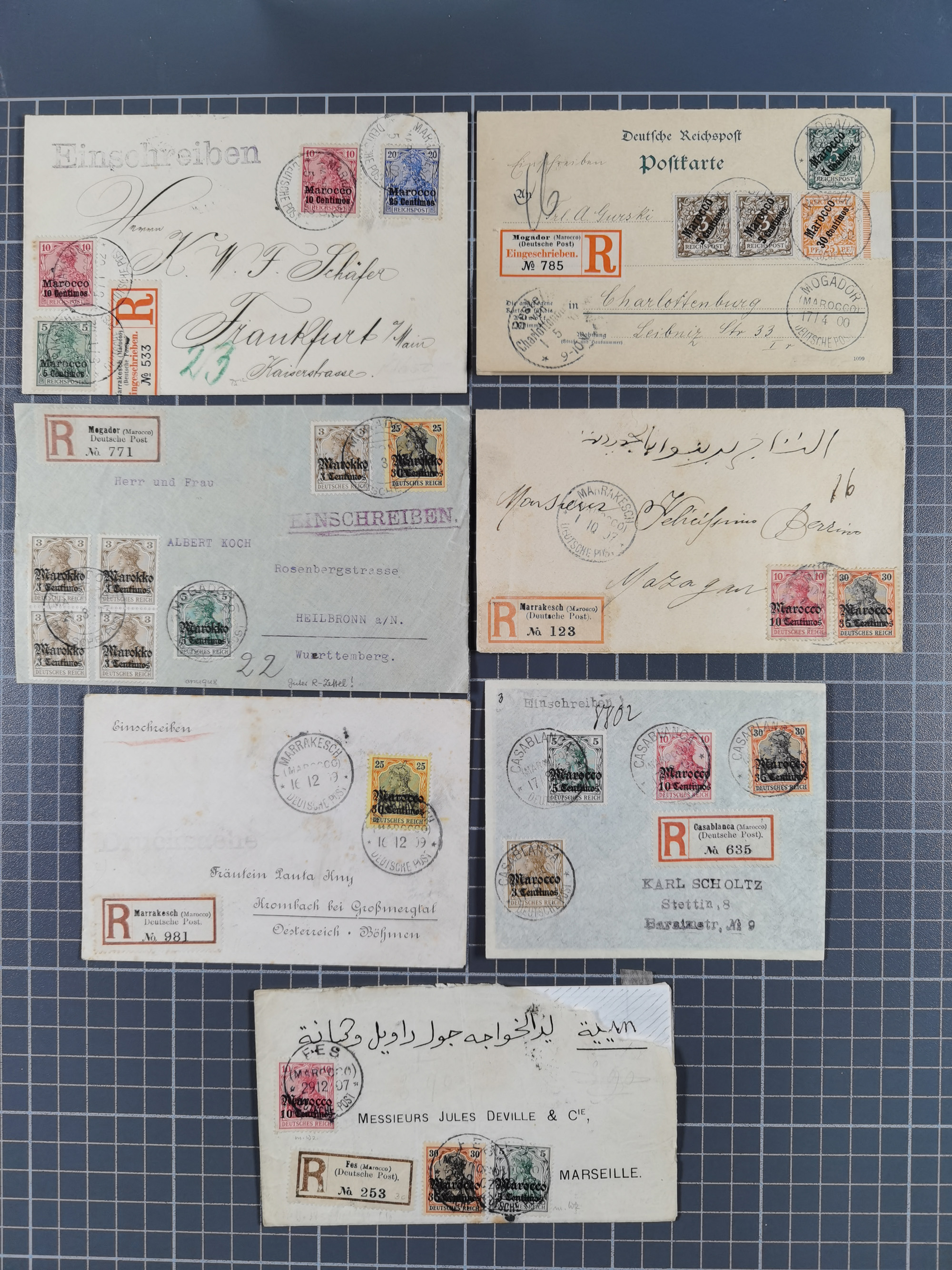 1900/13, Partie mit 8 R-Briefen und Karten sowie einer Vorderseite (Mogodor) von Cassablanca (2x mit verschiedenen R-Zetteltypen), Fes (Umschlag fehlerhaft), Marrakesch (3x mit verschiedenen R-Zetteltypen), Mogodor (2x mit verschiedenen R-Zetteltypen) und Tanger, Erhaltung zum Teil etwas fehlerhaft