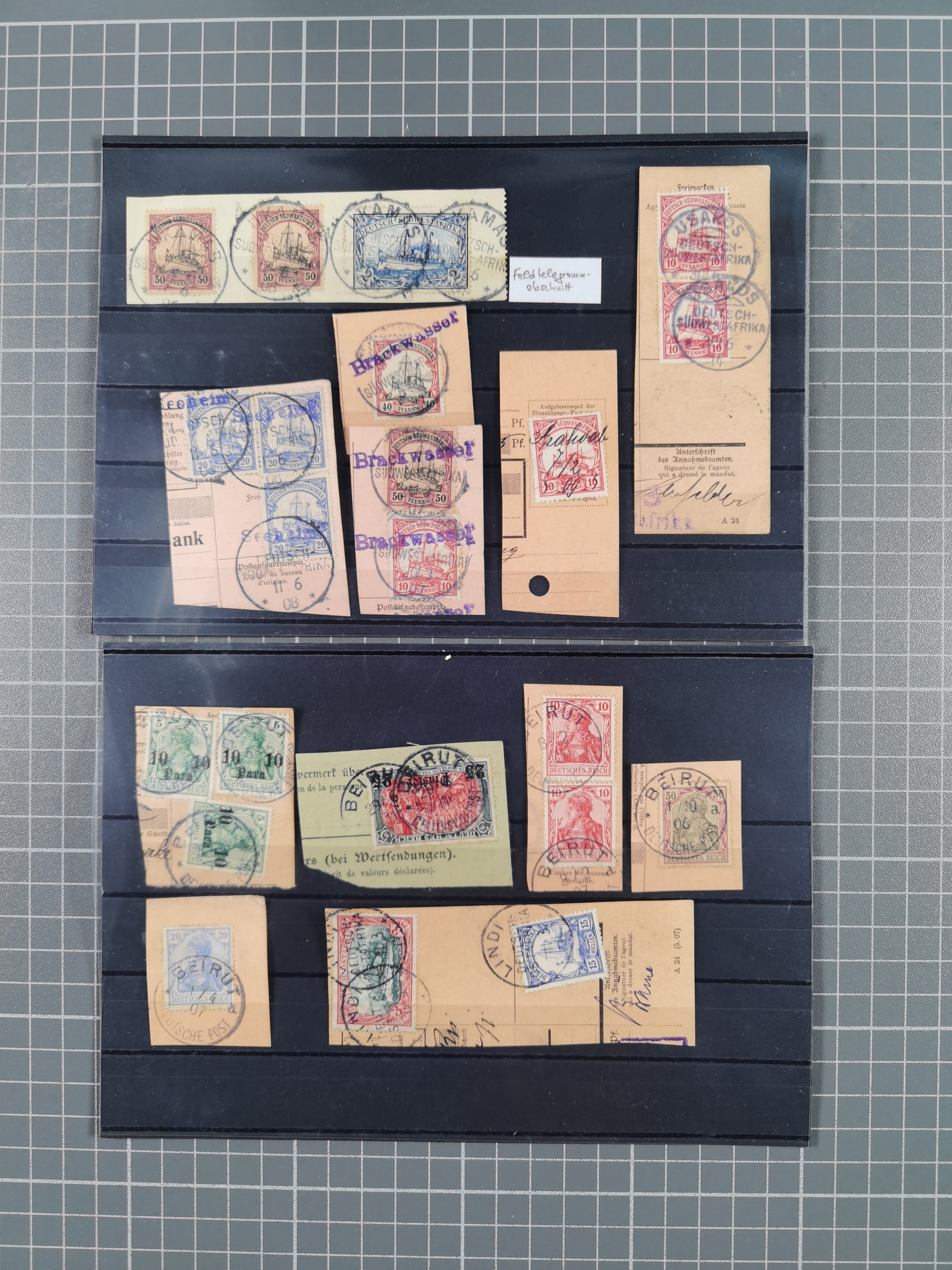 STEMPELSAMMLUNG: 226 Marken/ Briefausschnitten, mit einigen besseren Marken, z. B. China Nr. 44 AI, Türkei V 29 und Nr. 21 II/I. Bewertet wurden Stempel ab 20 € nach Arge Handbuch, Wert: 3.500 €, mit besseren Stempeln z. B Kissenji, Salale, Ssongea, 2 x Usambara Bahnpost Zug 5 b, Aris, Agu, meist gute Erhaltung