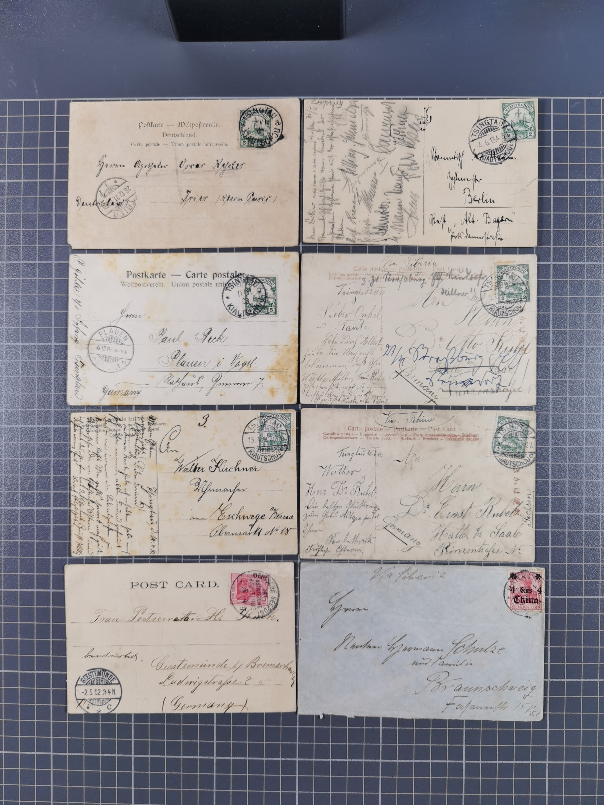 1898/1911, 16 Briefe und Karten, dabei Brief von Tsingtau nach Berlin, frankiert mit Vorläufer 10 Pf. rot, klar entw. mit "TSINTANFORT MARINE-FELDPOST 11/3/98" sowie kurioser Brief aus gleicher Korrospondenz mit Aufdruckmarke vom 4.3.98, Postkarten SMS Kaiserin Augusta Salut Kiautschau, Signalstation, Tsingtau, Hotel Fürsetenhof, Gouvernementsschule und Hong kong, Brief mit Stempel Nanking via Siberia, einige kleine Mängel, meist gut erhalten.