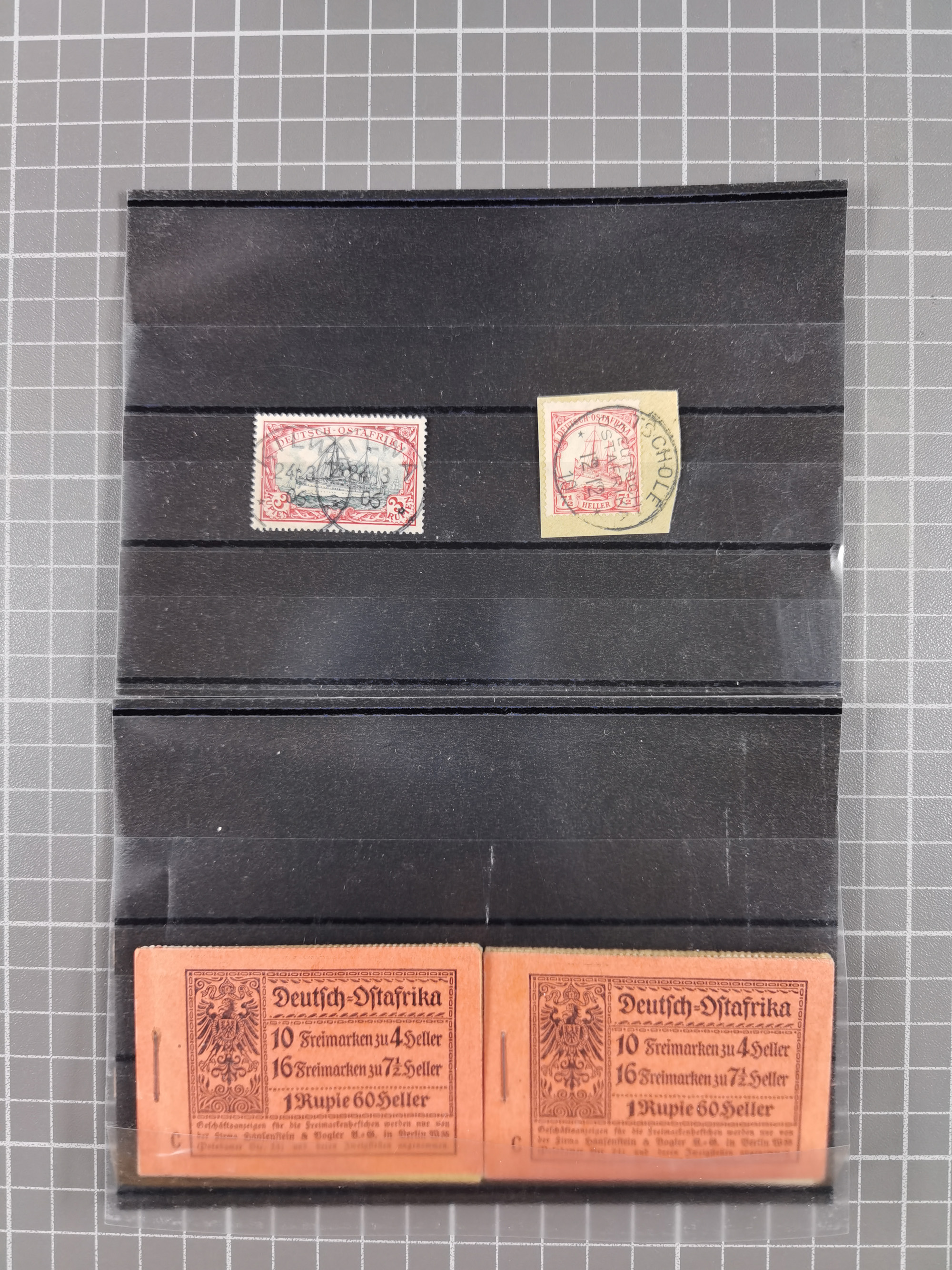 1892/1916, Partie mit 16 Briefen, Karten und Ganzsachen sowie ein Telegramm und zwei linken Postanweisungs-Abschnitten mit schriftlichen Mitteilungen, dabei u.a. Reichsdienstsachen-Umschlag 1892 an Carl Petes, GSK 1900 als Inlandskarte aus dem Bedarf nach Snongea mit Ankunftsstempel, frankierter Brief 1912 nach Schweden mit Nachsendung, überfrankierter R-Ortsbrief Daressalam 1913 an einen Passagier der Adolph Woermann und Feldpostbrief 1916. Alle Belege auf Albenblättern mit genauer Beschreibung und meist in guter Erhaltung