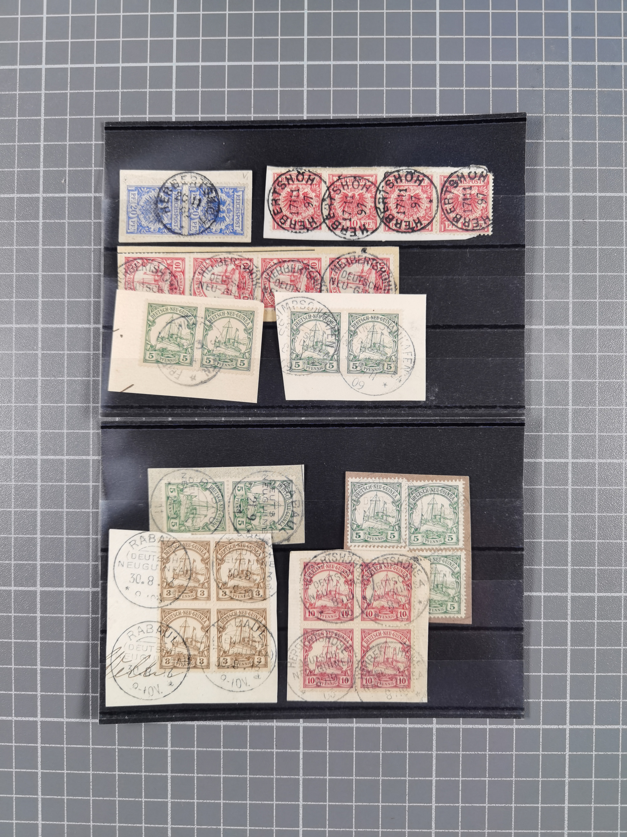 1895/1913, Partie mit neun Briefstücken, bis auf ein Briefstück alle mit Paaren, Viererstreifen oder Viererblocks, dabei u.a. waagerechter Viererstreifen mit M47d und Stempel “HERBERTSHÖH”, in guter Erhaltung