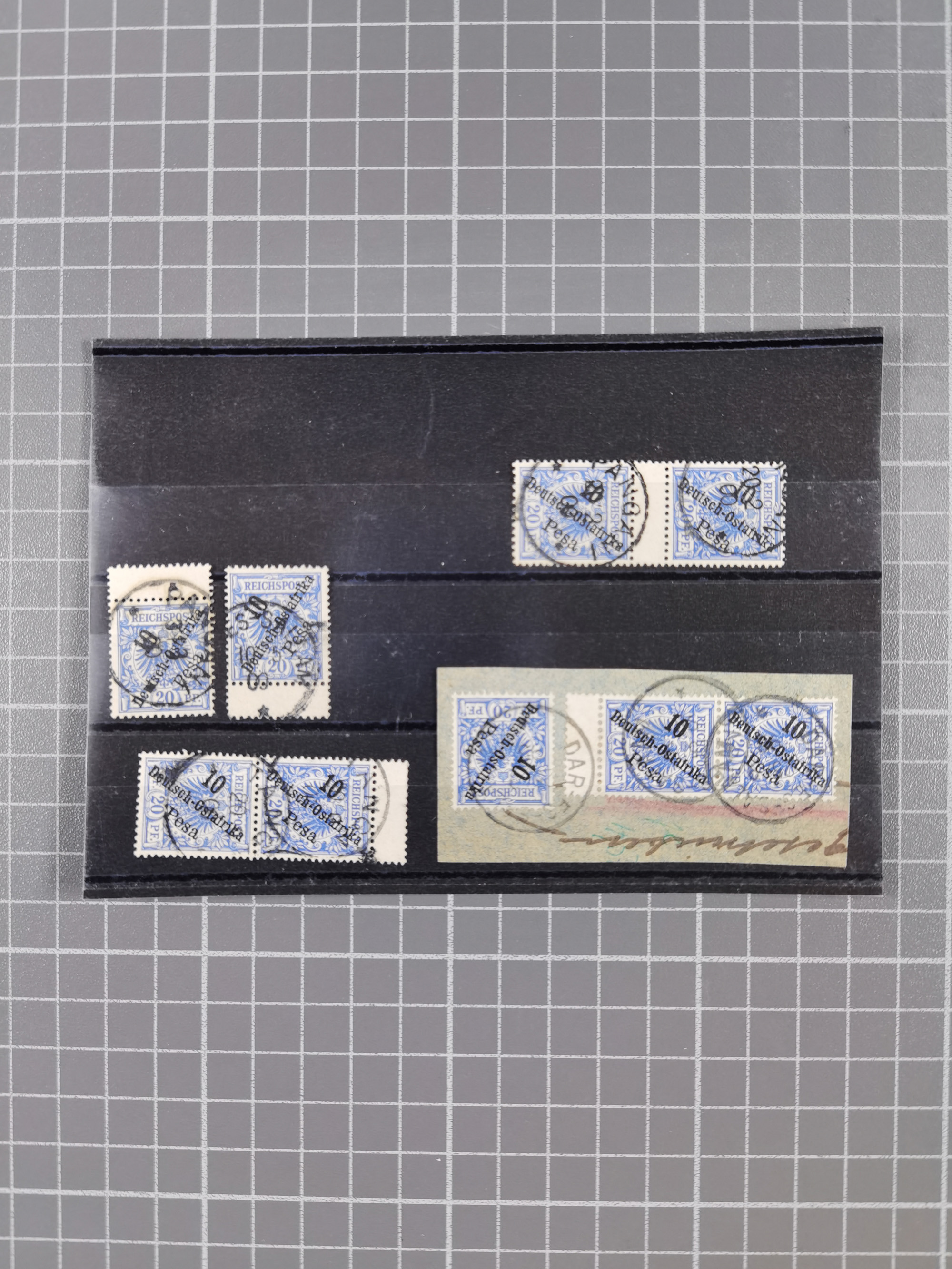 1896, 10 P. auf 20 Pfg. im senkrechten Zwischenstegpaar und vier weitere Marken mit Zwischensteg oben bzw. unten, alle sauber gestempelt bzw. einmal auf Briefstück (Mi. 9ZS,9)