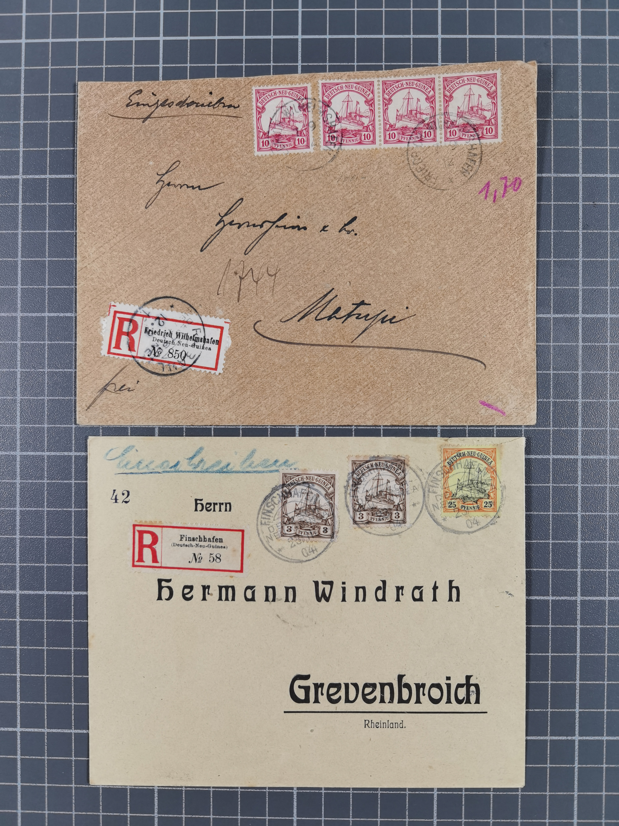 1892/1912, Partie mit Posteinlieferungsschein von “Stephansort” 1892 sowie zwei R-Briefen von Finschhafen 1904 und Friedrichs-Wilhelmshafen 1912 mit 4x Kaiseryacht 10 Pfg. nach Matupi