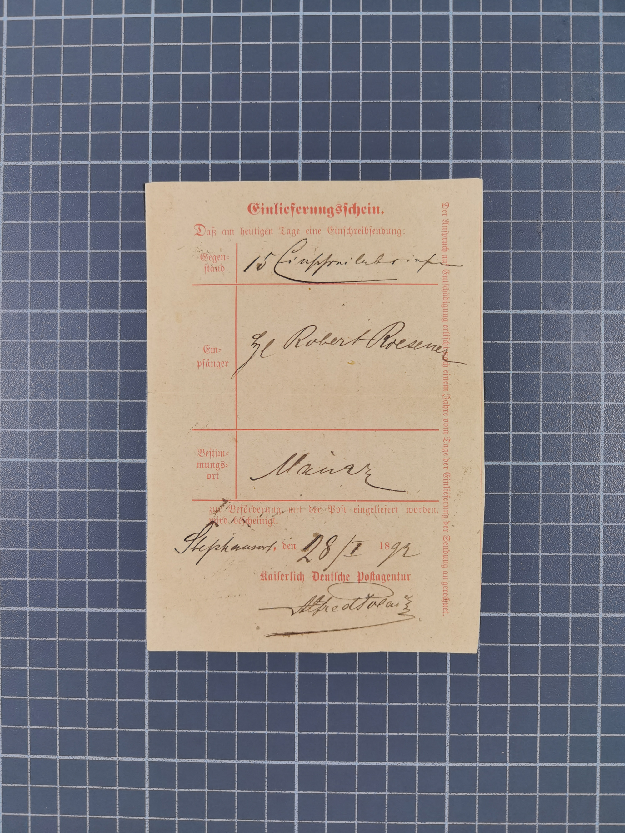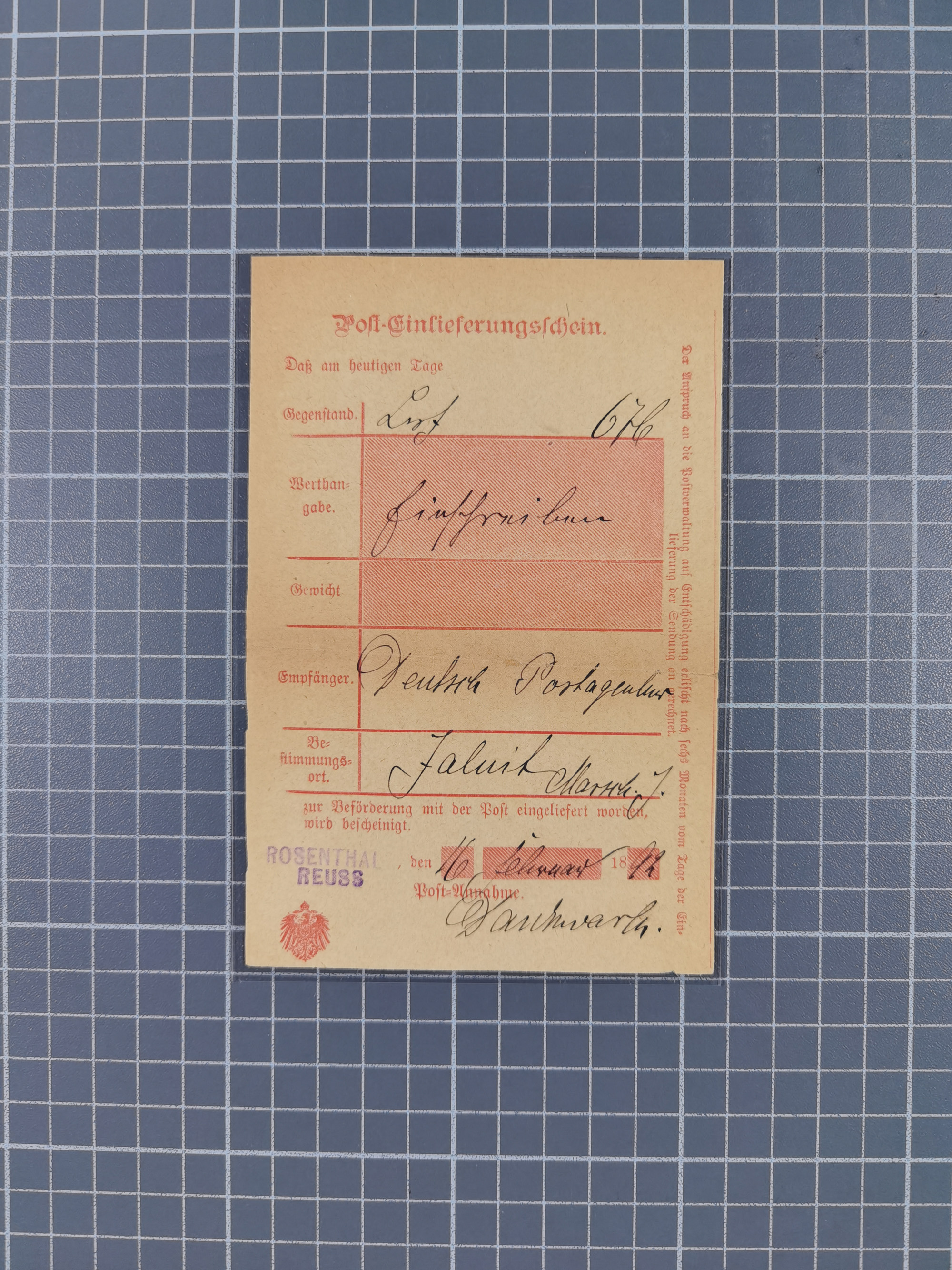 1899 /1913, Partie mit 14 verschiedenen Postscheinen, dabei handschriftliche Ortsvermerke, einige mit Innendienst-Stempeln mit u.a. L1 “Seeheim” und drei Postscheine mit Poststempeln von “ABBABIS” 1906, “HASUUR” 1906 und “ONGUATI” 1907. Dazu Postkarte verwendet als Einlieferungsschein 1907 mit Dienstsiegel von Outjo, übliche Faltspuren, in guter Erhaltung