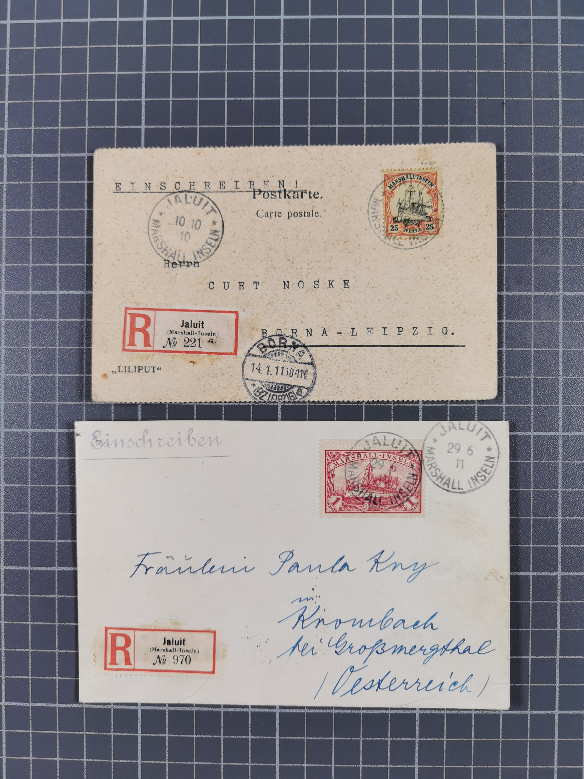 1900/11, Partie mit drei R-Briefen und einer R-Karte mit Text aus Jaluit mit Einzel- und Mehrfachfrankaturen, dabei Mi.-Nr. 25 auf R-Karte nach Borna mit Ankunftsstempel. Dazu Posteinlieferungschein 1892 für einen R-Brief nach Jaluit