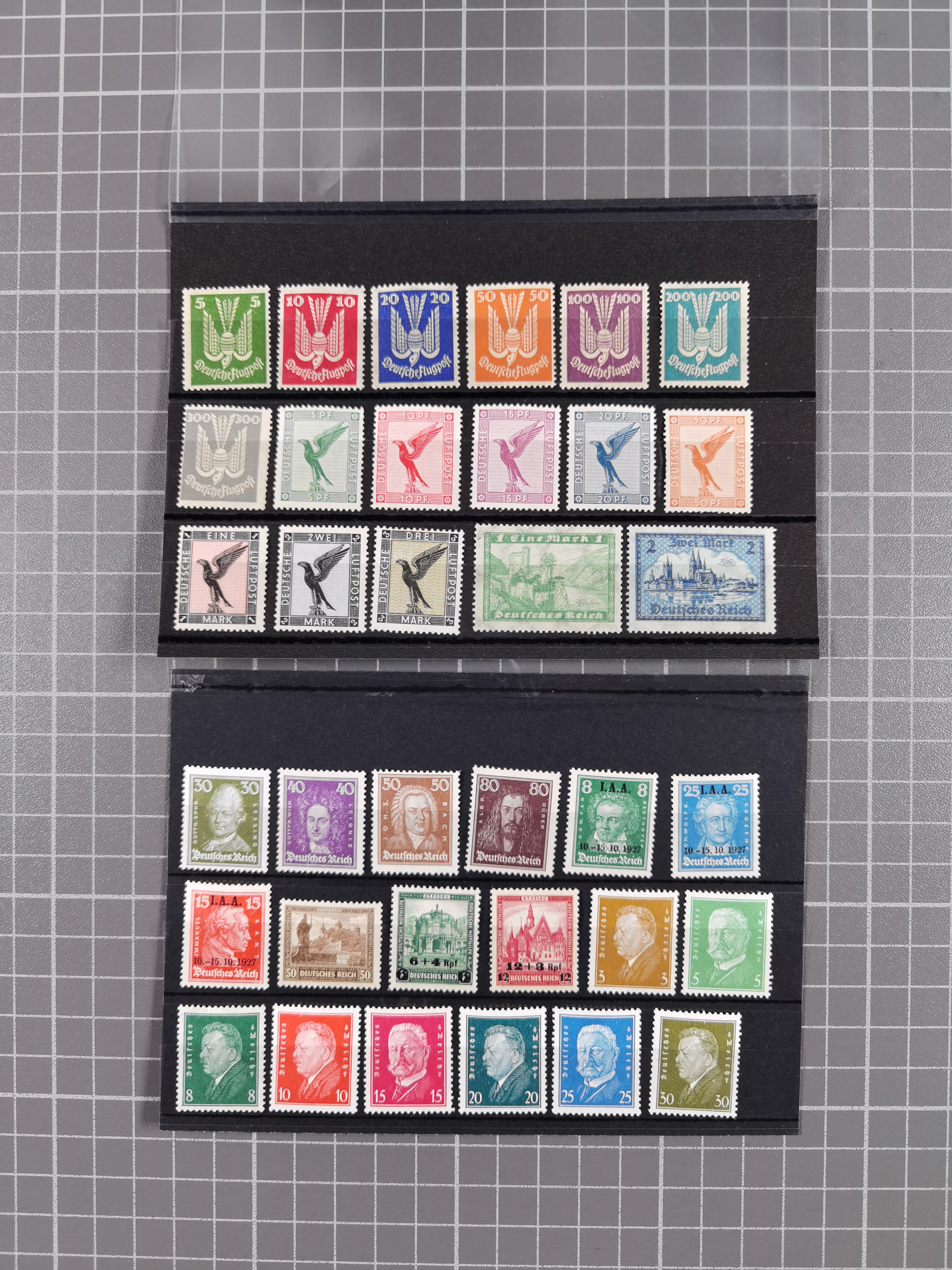 1919/32, meist postfrische Sammlung im Lindner-Falzlosalbum komplett mit vielen Besonderheiten. Infla mit vielen Farben und ungezähnten Marken. Weimar mit Mi. 339 ohne Wertziffer Befund Schlegel BPP, Mi. 344-350 Viererblocksatz meist postfrisch, Attest A. Schlegel BPP, Mi. 401X im 6er-Block postfrisch mit HAN in braun und gelb, Attest Dr. Oechsner BPP, Mi. 407-409 Viererblocksatz postfrisch, Attest Oechsner BPP, Mi. 434I postfrisch Attest A. Schlegel BPP, Mi. 397 postfrisch Befund H-D-Schlegel BPP, Zeppelinmarken ungebraucht