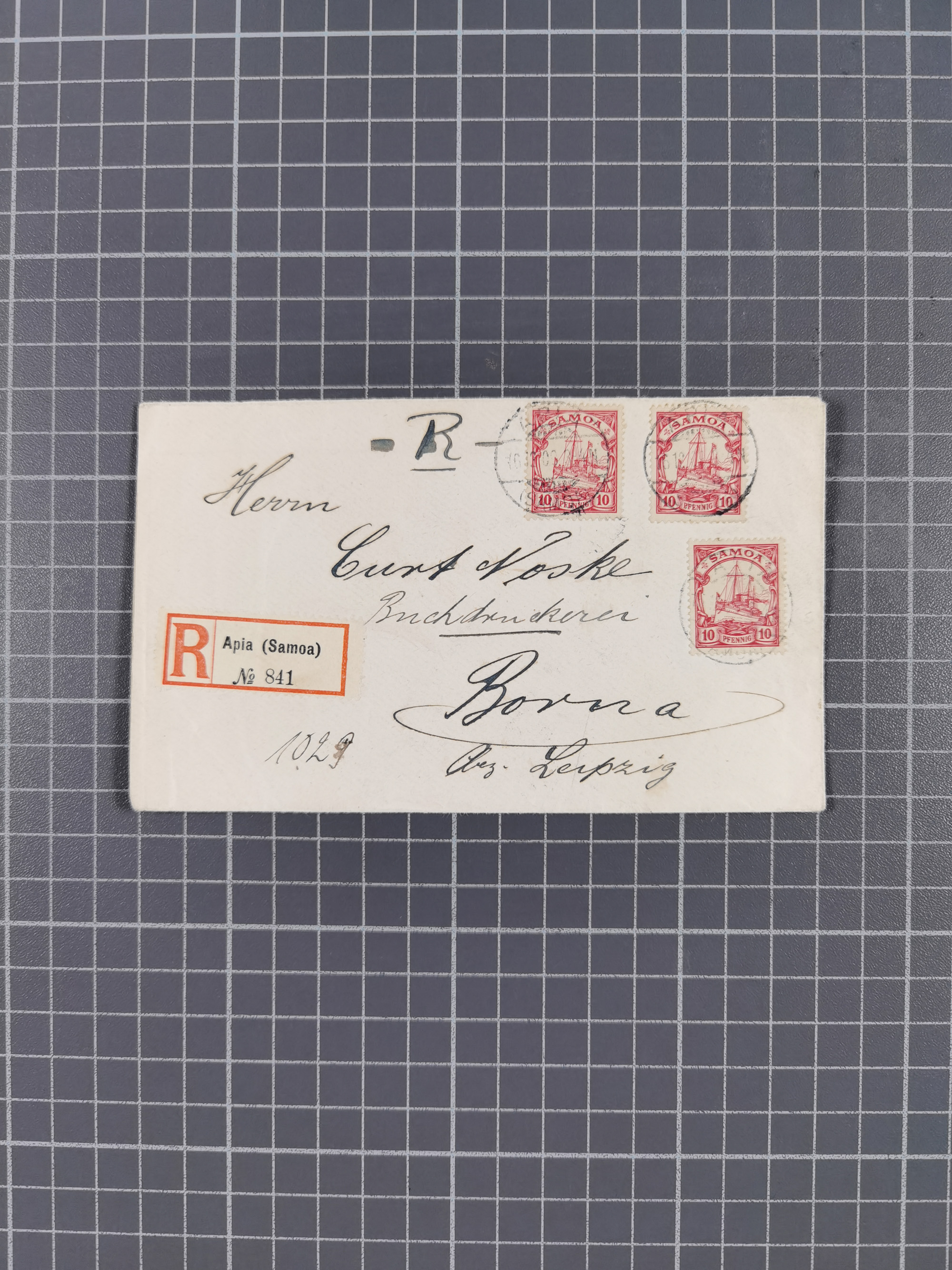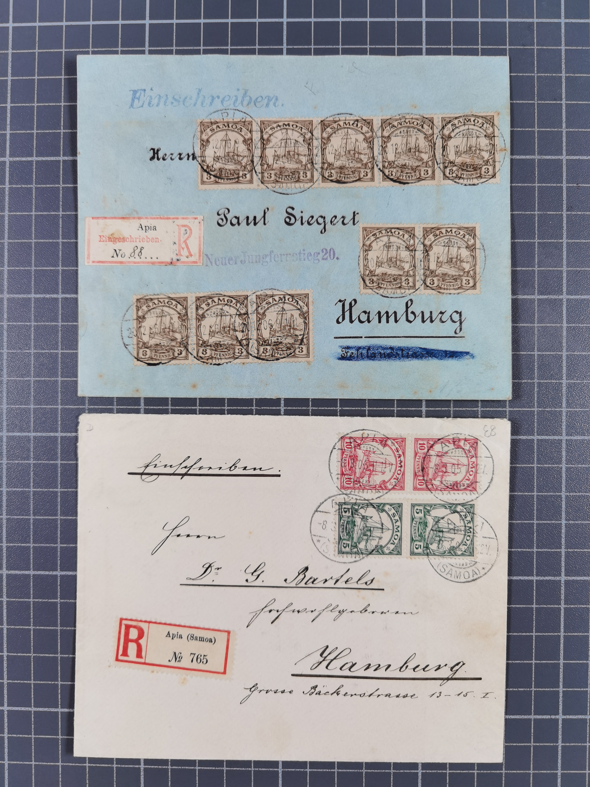 1905/10, Partie mit drei R-Briefen von Apia, dabei Mehrfachfrankatur Mi.-Nr.7 (10) auf R-Brief 1906 mit geschnittenem R-Zettel “Apia” (R rechtsstehend), in guter Erhaltung