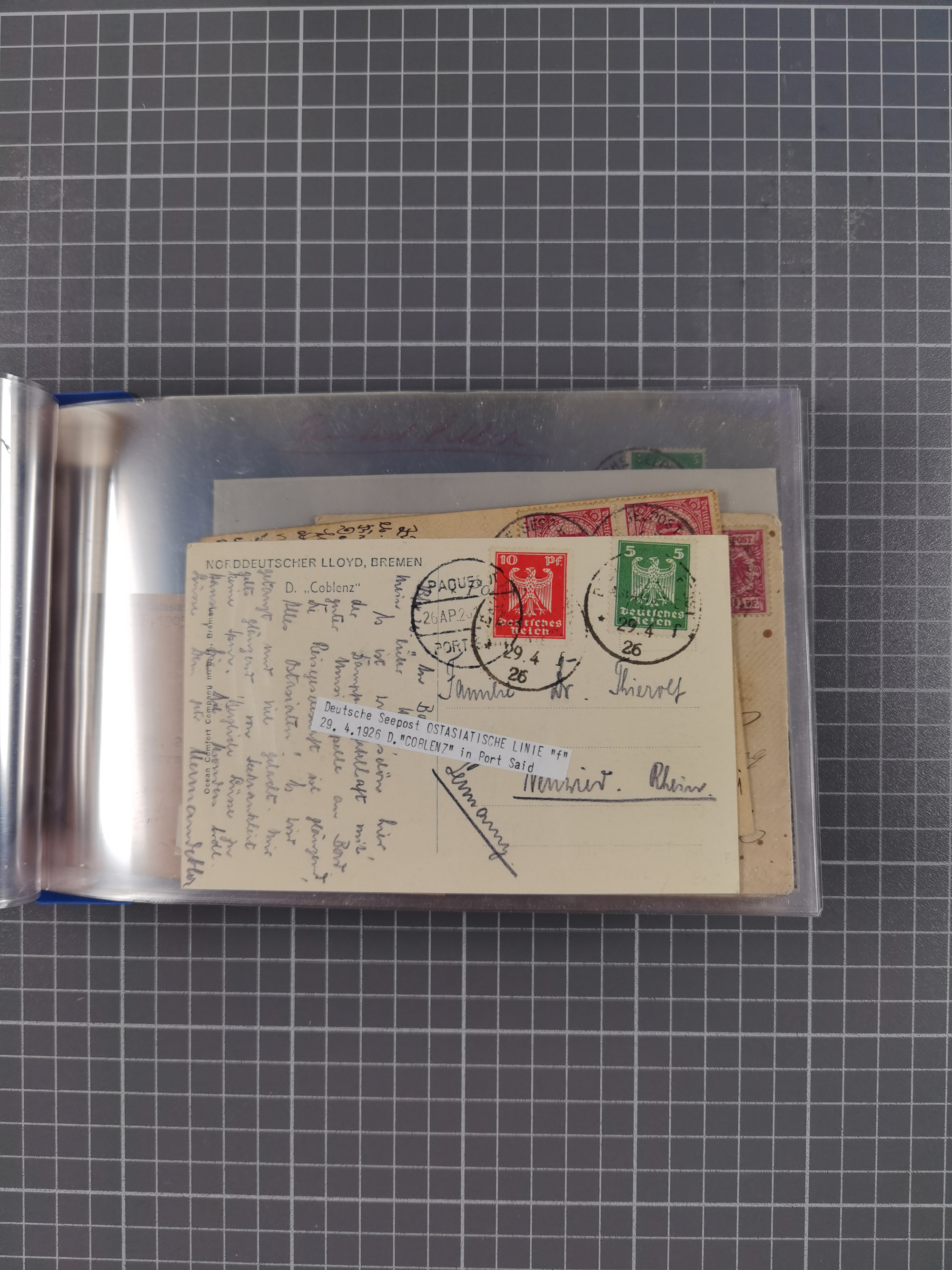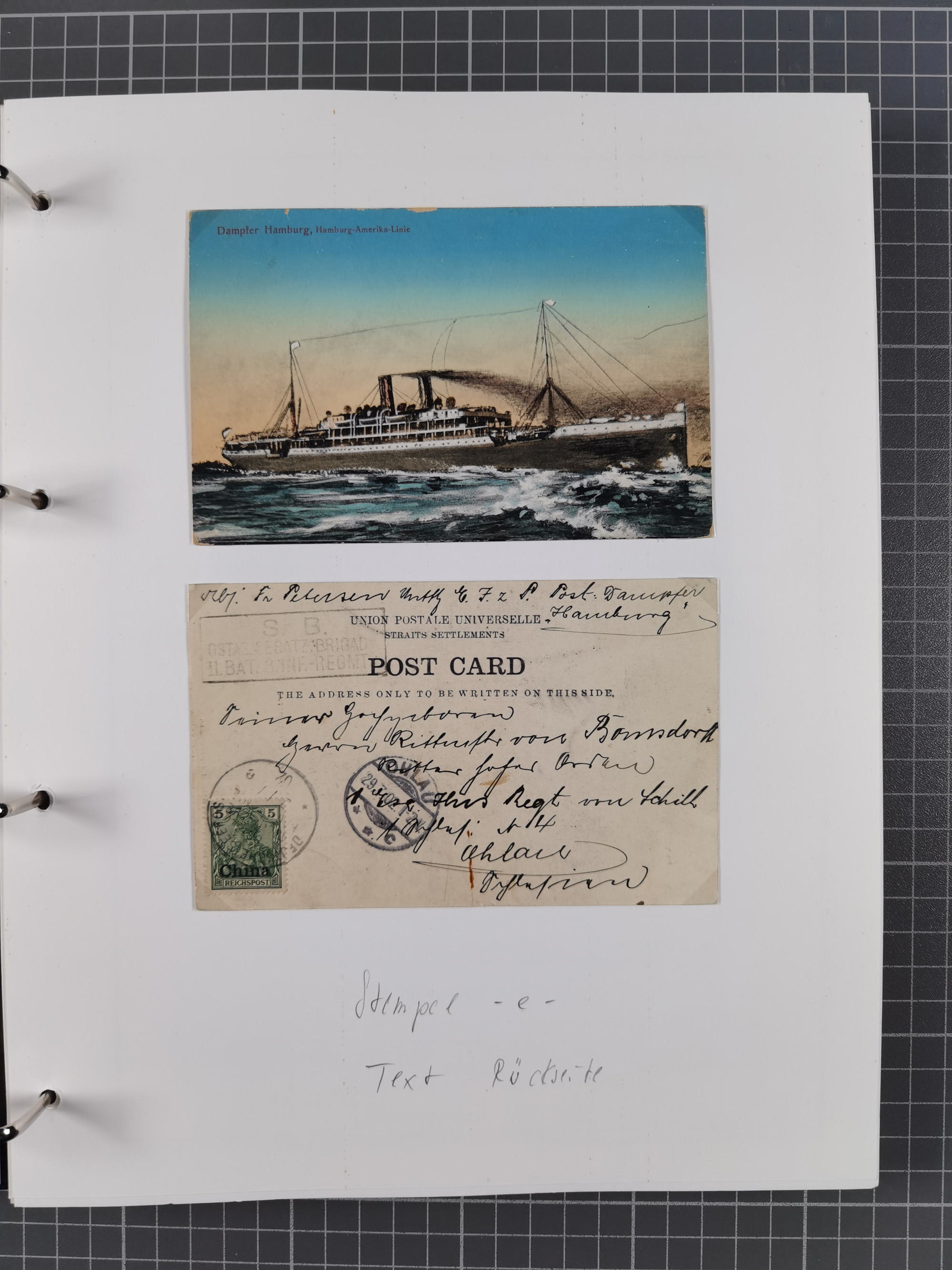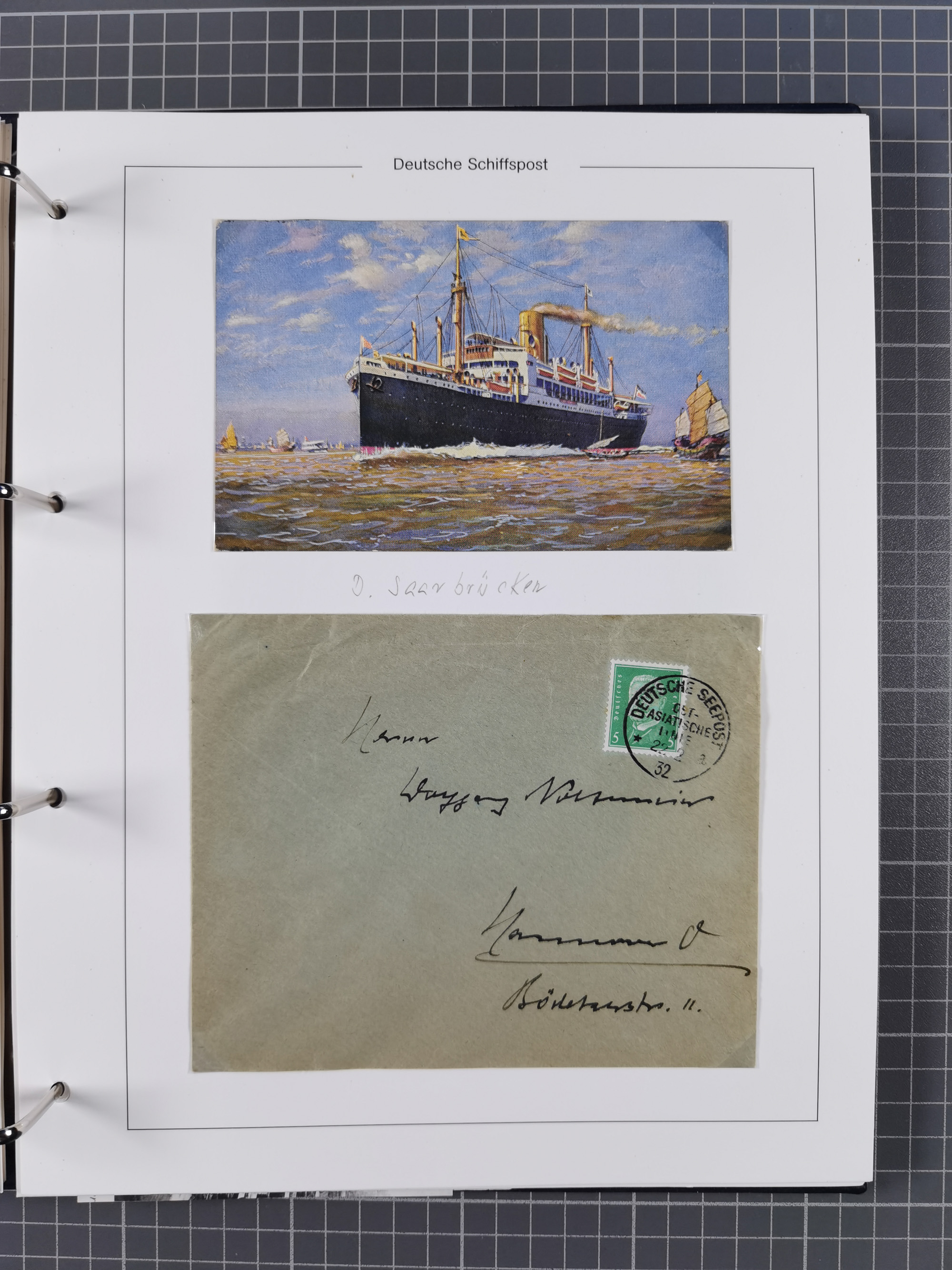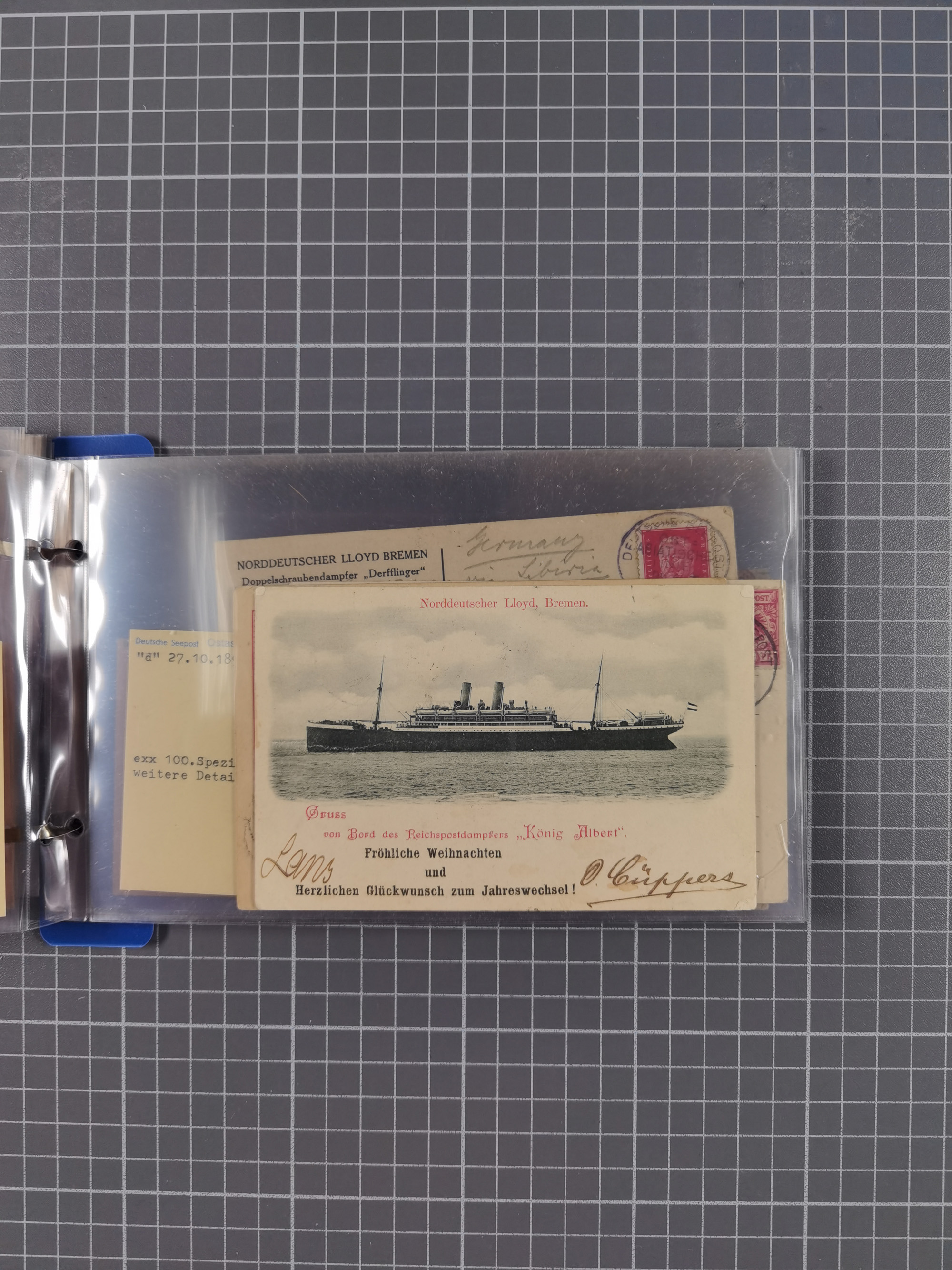 1922/39, kleine Sammlung “DSP LINIE…” (aptiert), “DSP MONTE SARMIENTO”, “DSP GENERAL SAN MARTIN” und “DSP HAMBURG-SÜDAMERIKA WESTKÜSTE” mit 25 Briefen, Karten und Ganzsachen. Dabei u.a. R-Brief 1928 “DSP LINIE *i” mit R-Zettel “DSP Hugo Stinnes Linie La Plata Dienst”, 10 Belege mit Stempel “MONTE SARMIENTO” als Entwerter oder Nebenstempel und zwei Bedarfsbriefe mit Stempel “M.S. PATRIA”. Dazu Forschungsmaterial mit Texten, Fotos und Kopien von weiteren Belegen, ex Steinmeyer
