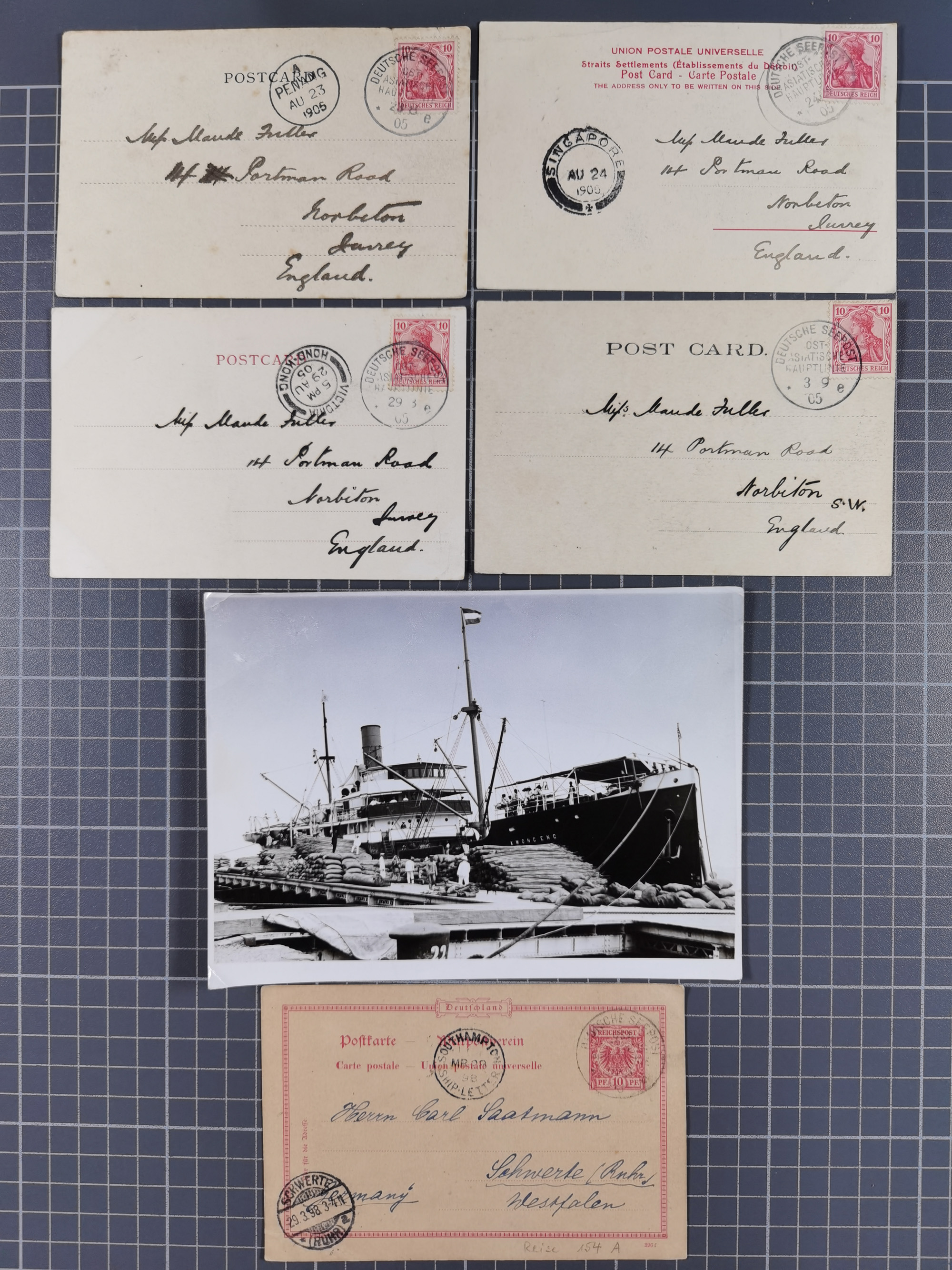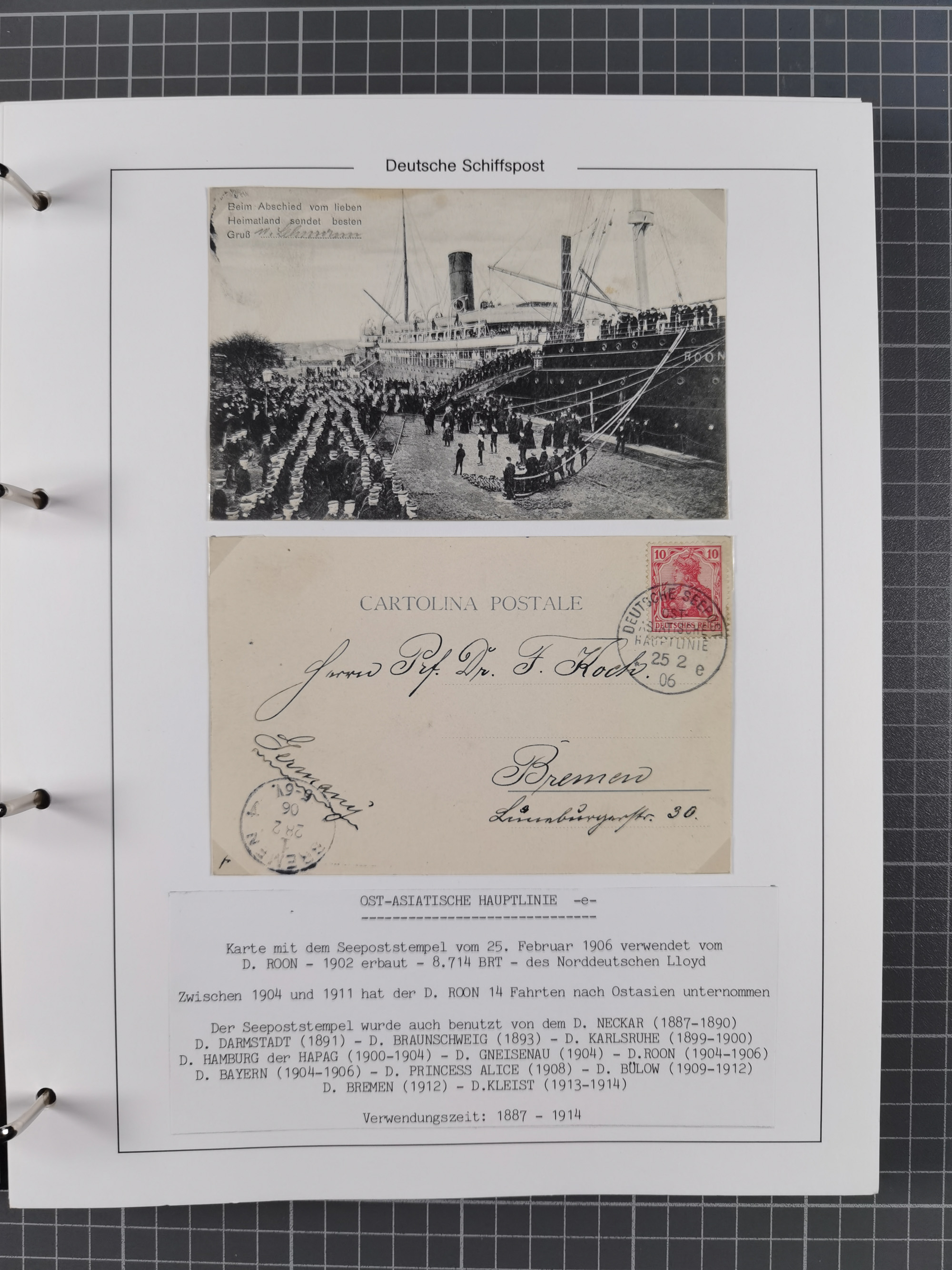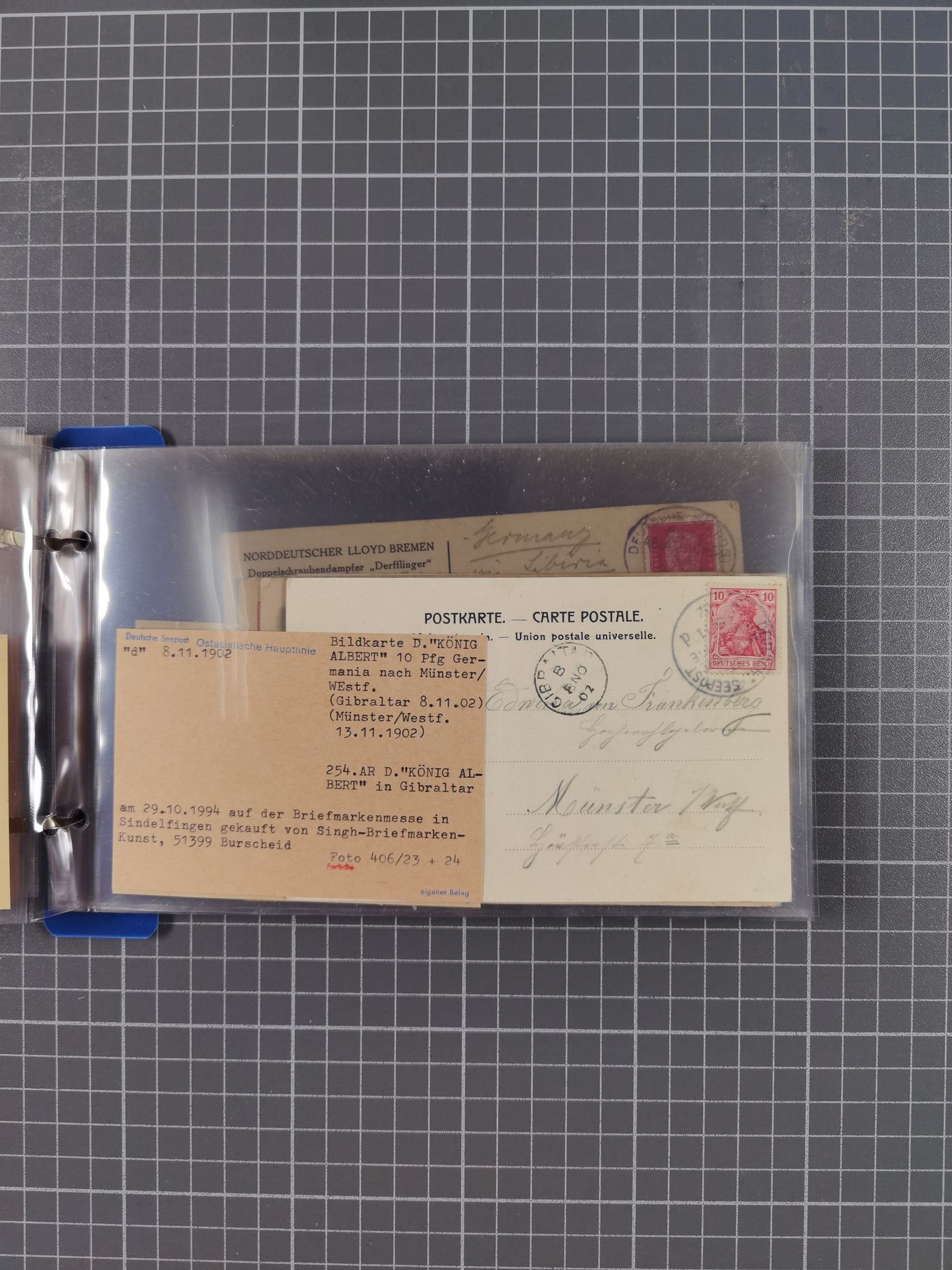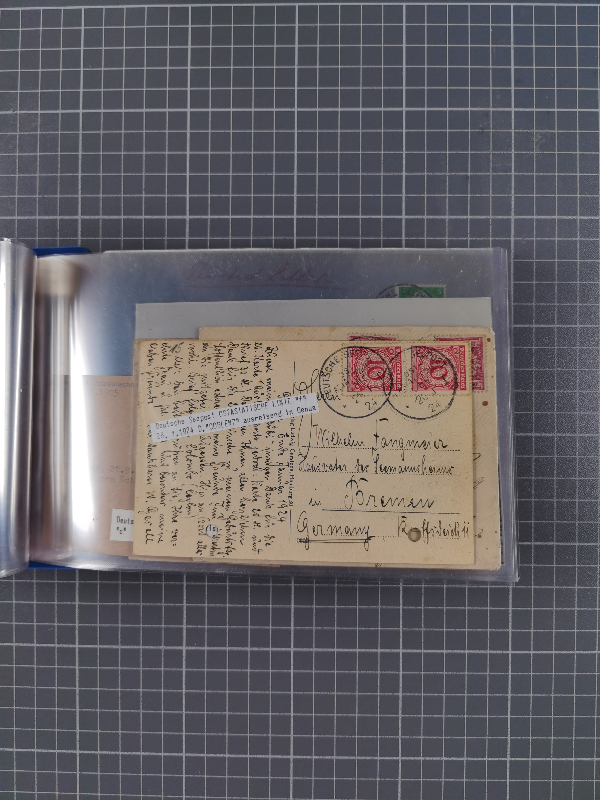 1922/39, kleine Sammlung “DSP LINIE…” (aptiert), “DSP MONTE SARMIENTO”, “DSP GENERAL SAN MARTIN” und “DSP HAMBURG-SÜDAMERIKA WESTKÜSTE” mit 25 Briefen, Karten und Ganzsachen. Dabei u.a. R-Brief 1928 “DSP LINIE *i” mit R-Zettel “DSP Hugo Stinnes Linie La Plata Dienst”, 10 Belege mit Stempel “MONTE SARMIENTO” als Entwerter oder Nebenstempel und zwei Bedarfsbriefe mit Stempel “M.S. PATRIA”. Dazu Forschungsmaterial mit Texten, Fotos und Kopien von weiteren Belegen, ex Steinmeyer