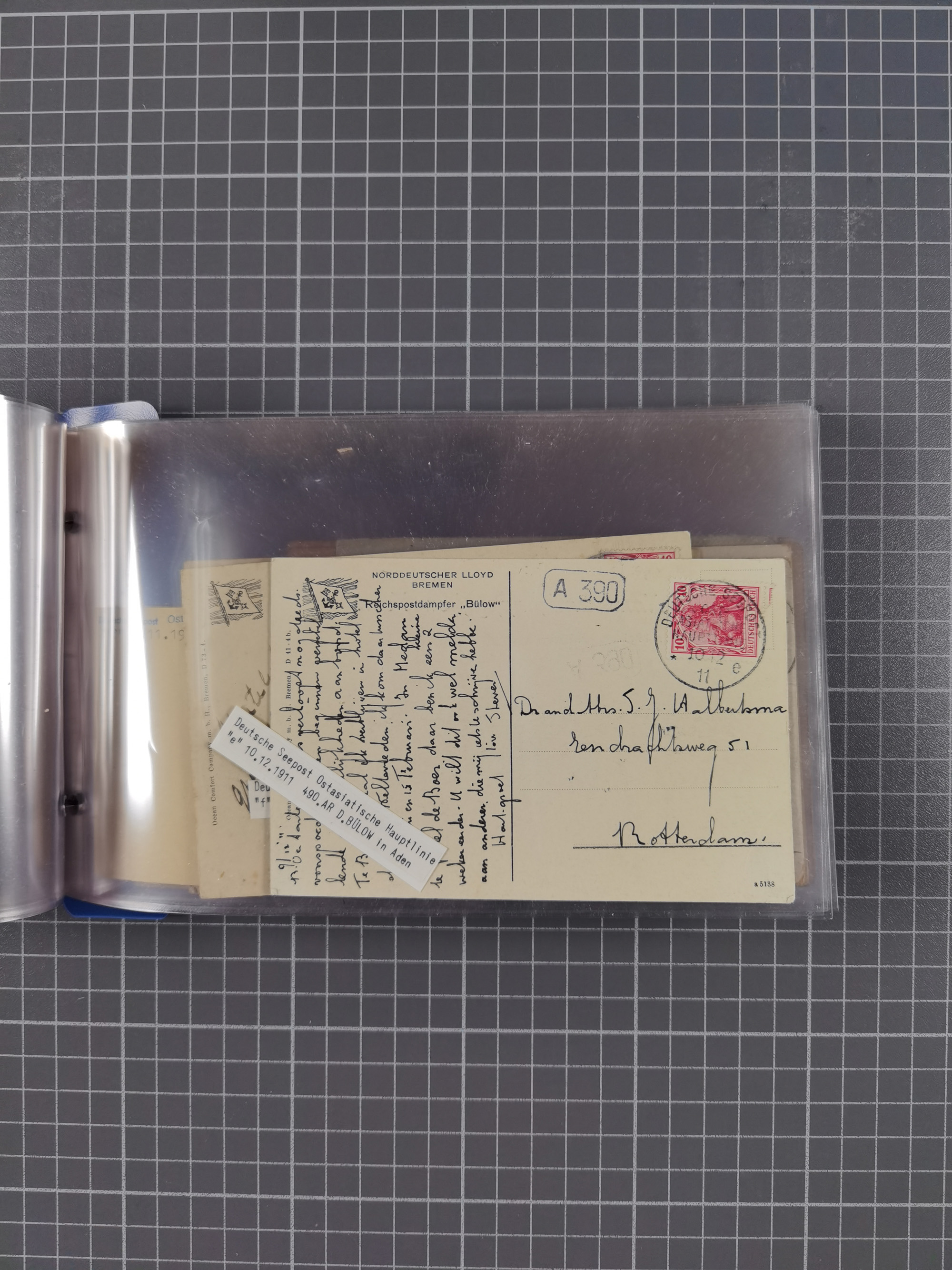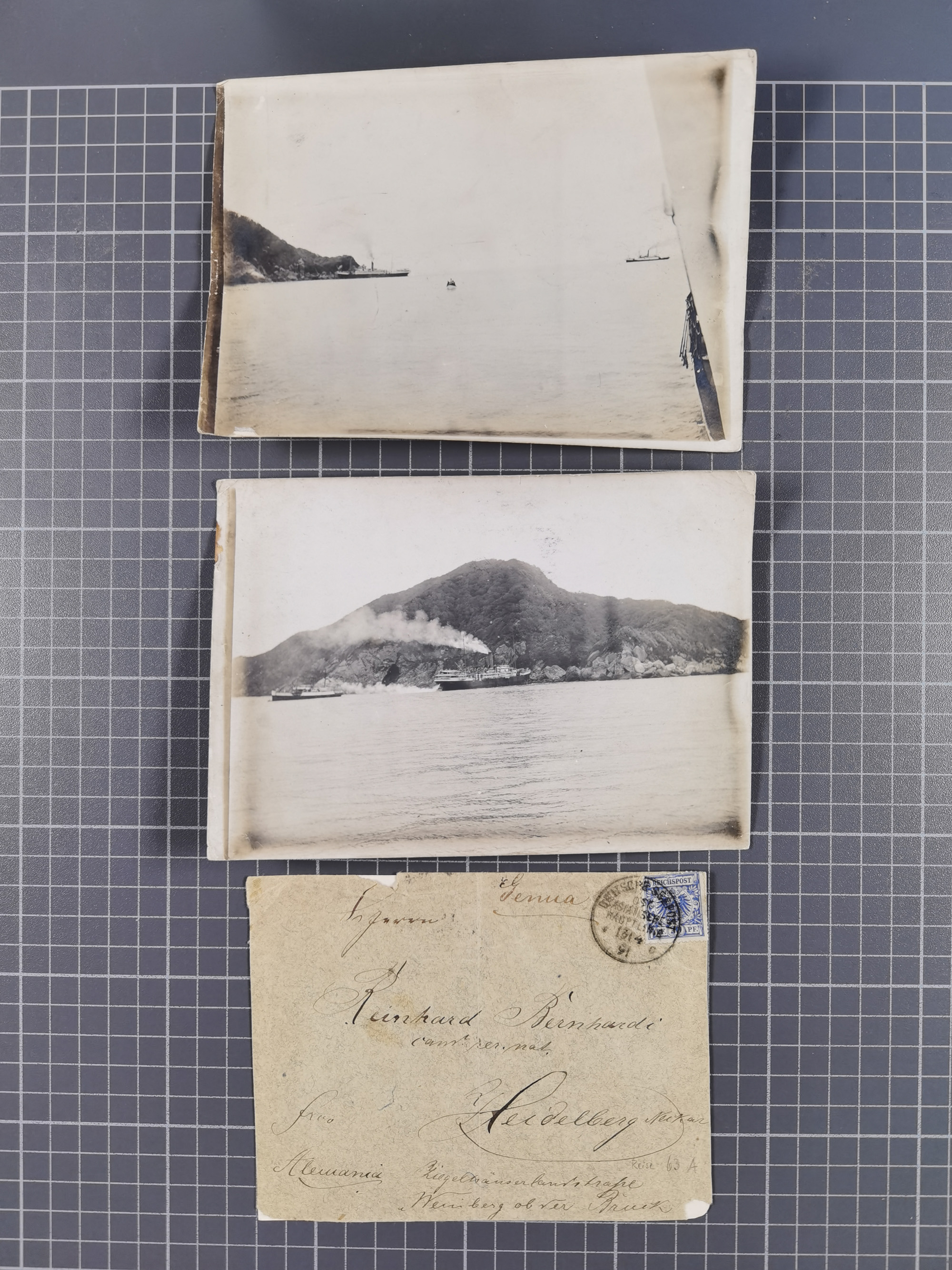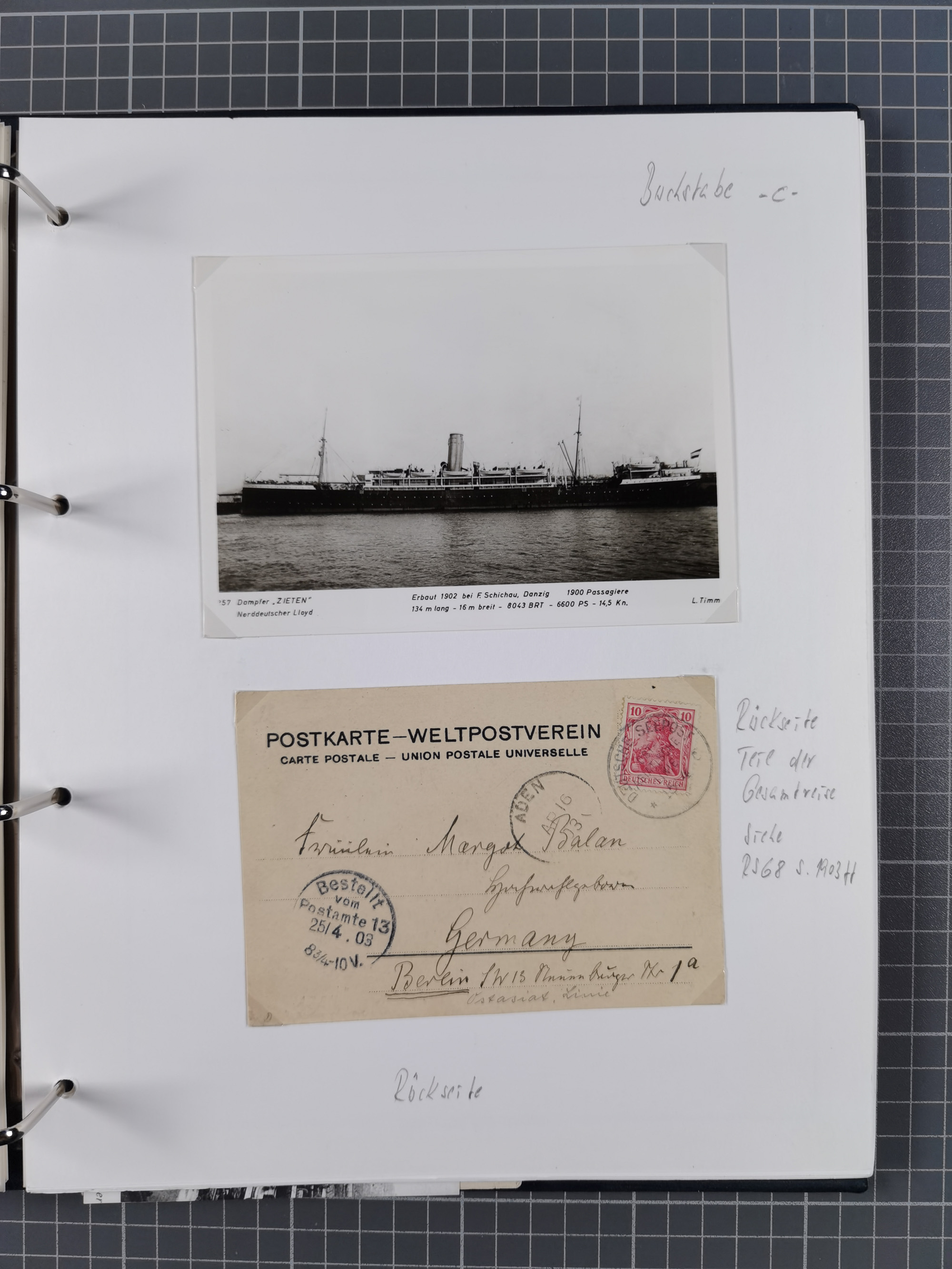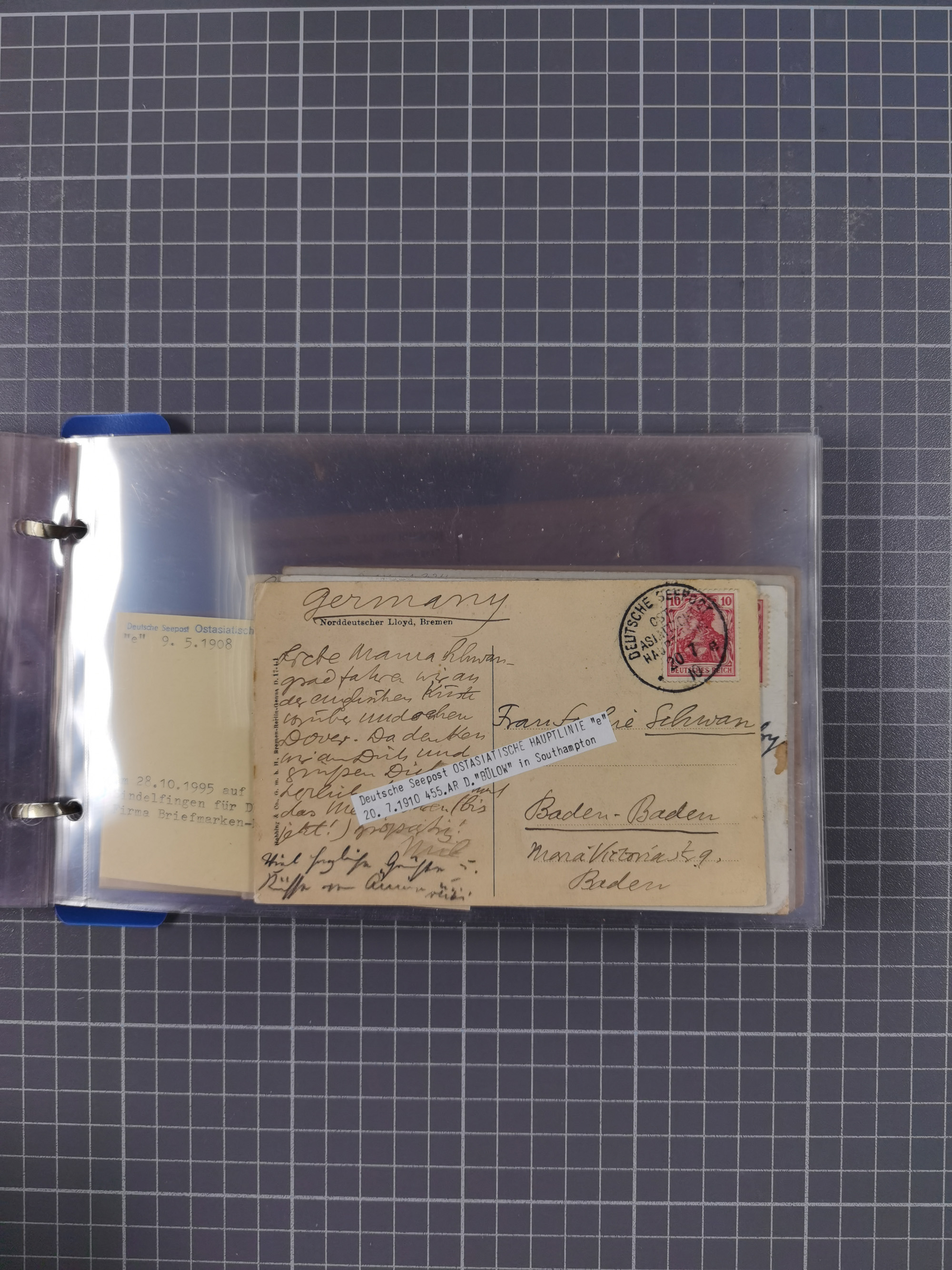 1922/39, kleine Sammlung “DSP LINIE…” (aptiert), “DSP MONTE SARMIENTO”, “DSP GENERAL SAN MARTIN” und “DSP HAMBURG-SÜDAMERIKA WESTKÜSTE” mit 25 Briefen, Karten und Ganzsachen. Dabei u.a. R-Brief 1928 “DSP LINIE *i” mit R-Zettel “DSP Hugo Stinnes Linie La Plata Dienst”, 10 Belege mit Stempel “MONTE SARMIENTO” als Entwerter oder Nebenstempel und zwei Bedarfsbriefe mit Stempel “M.S. PATRIA”. Dazu Forschungsmaterial mit Texten, Fotos und Kopien von weiteren Belegen, ex Steinmeyer