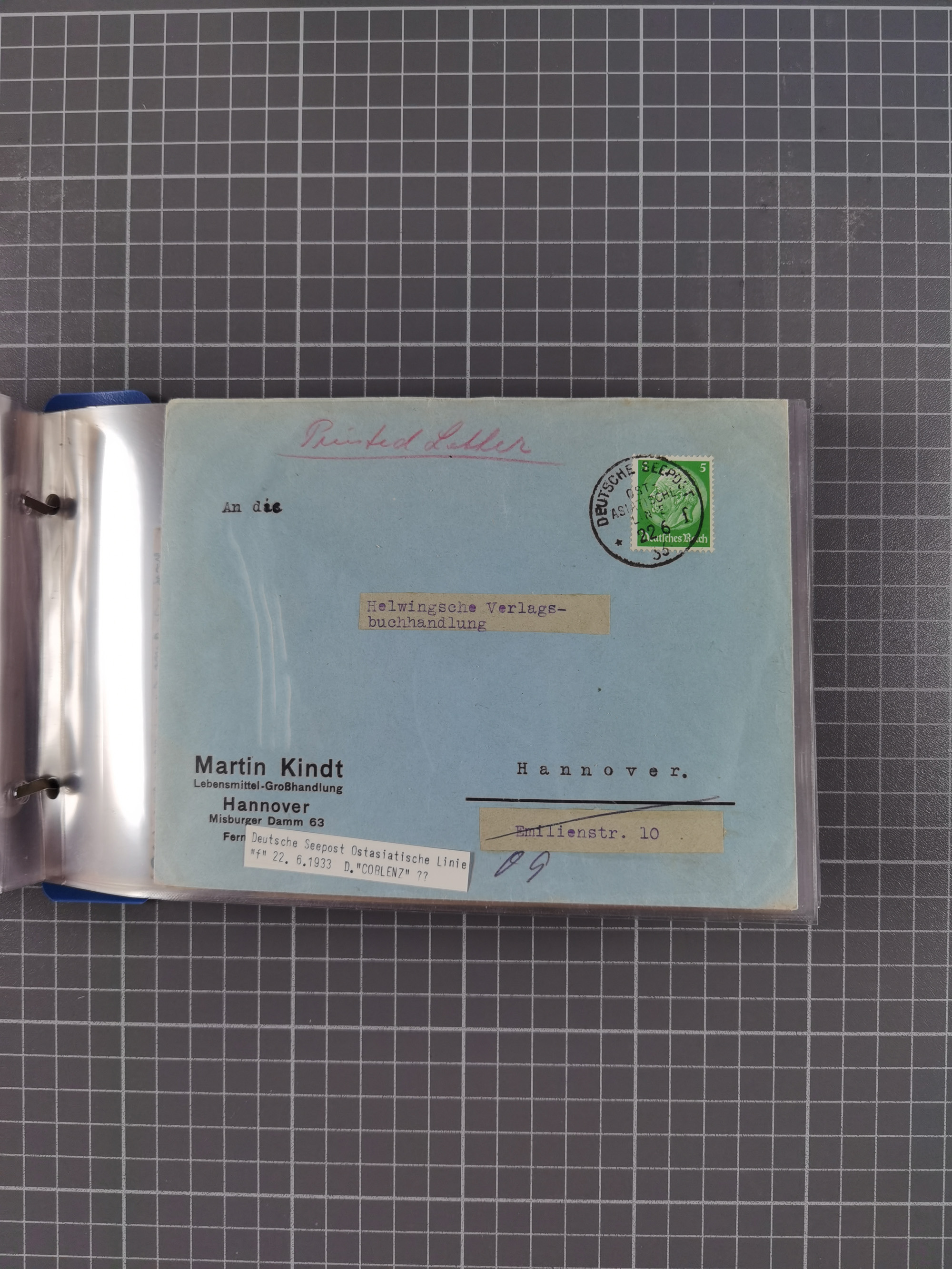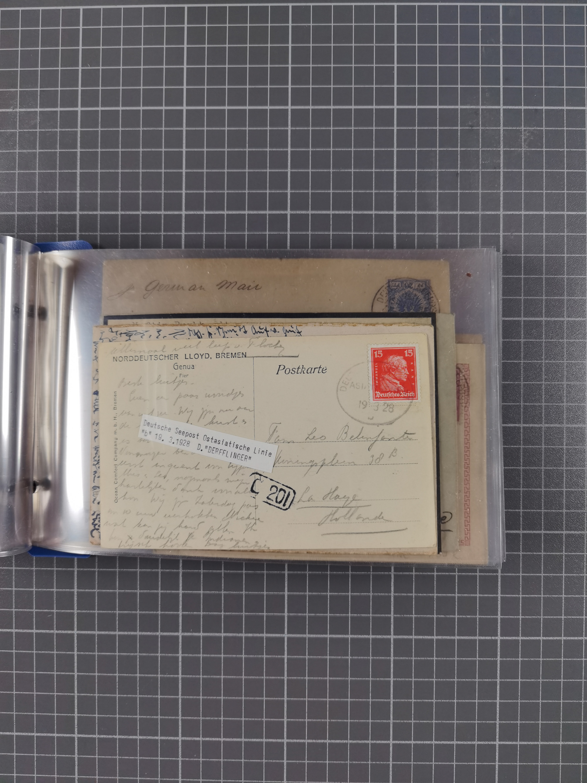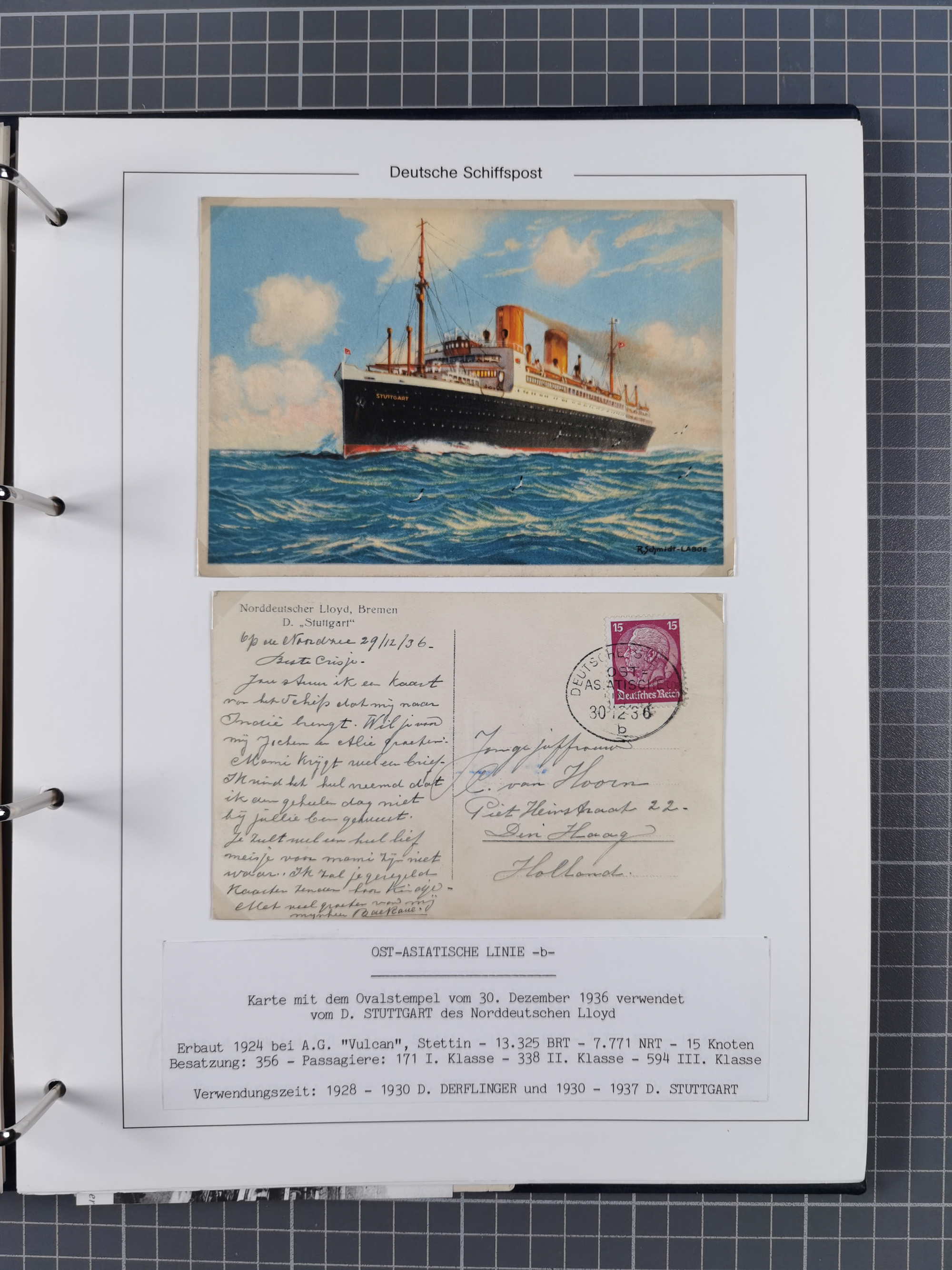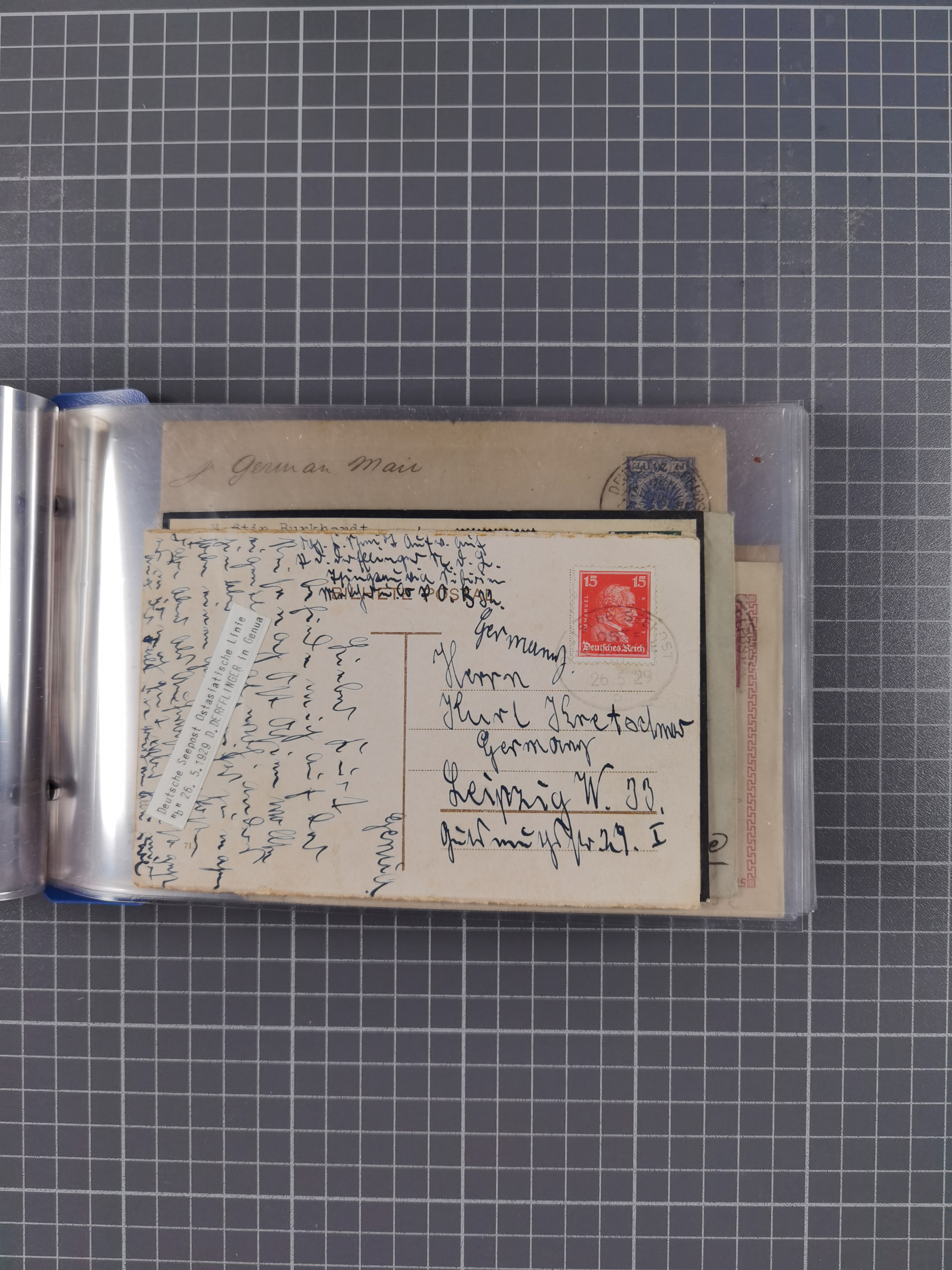 1924/36, Sammlung “DSP LINIE HAMBURG-OSTAFRIKA A-E +a-c” mit 24 Briefen, Karten und GSK, dabei u.a. zwei R-Briefe, dazu Forschungsmaterial und Kopien/Fotos von weiteren Belegen, ex Steinmeyer