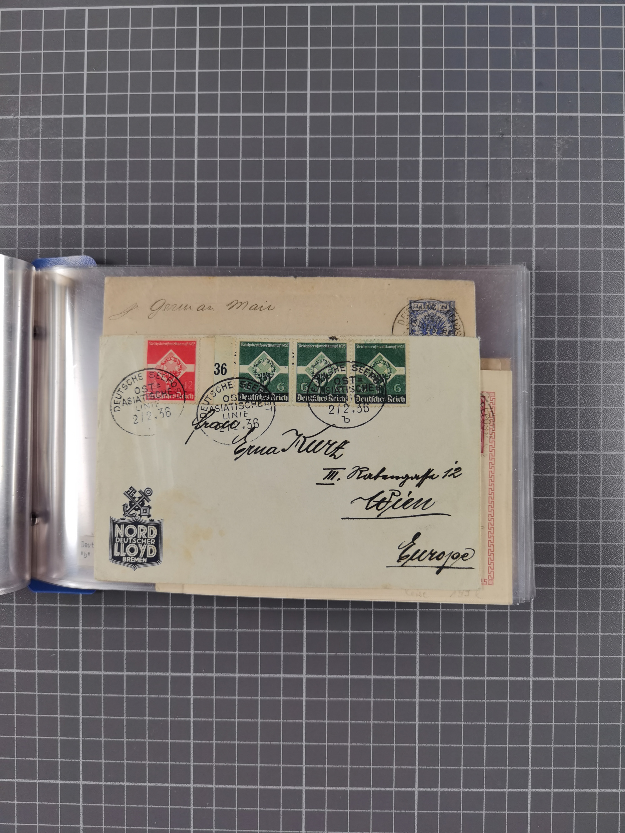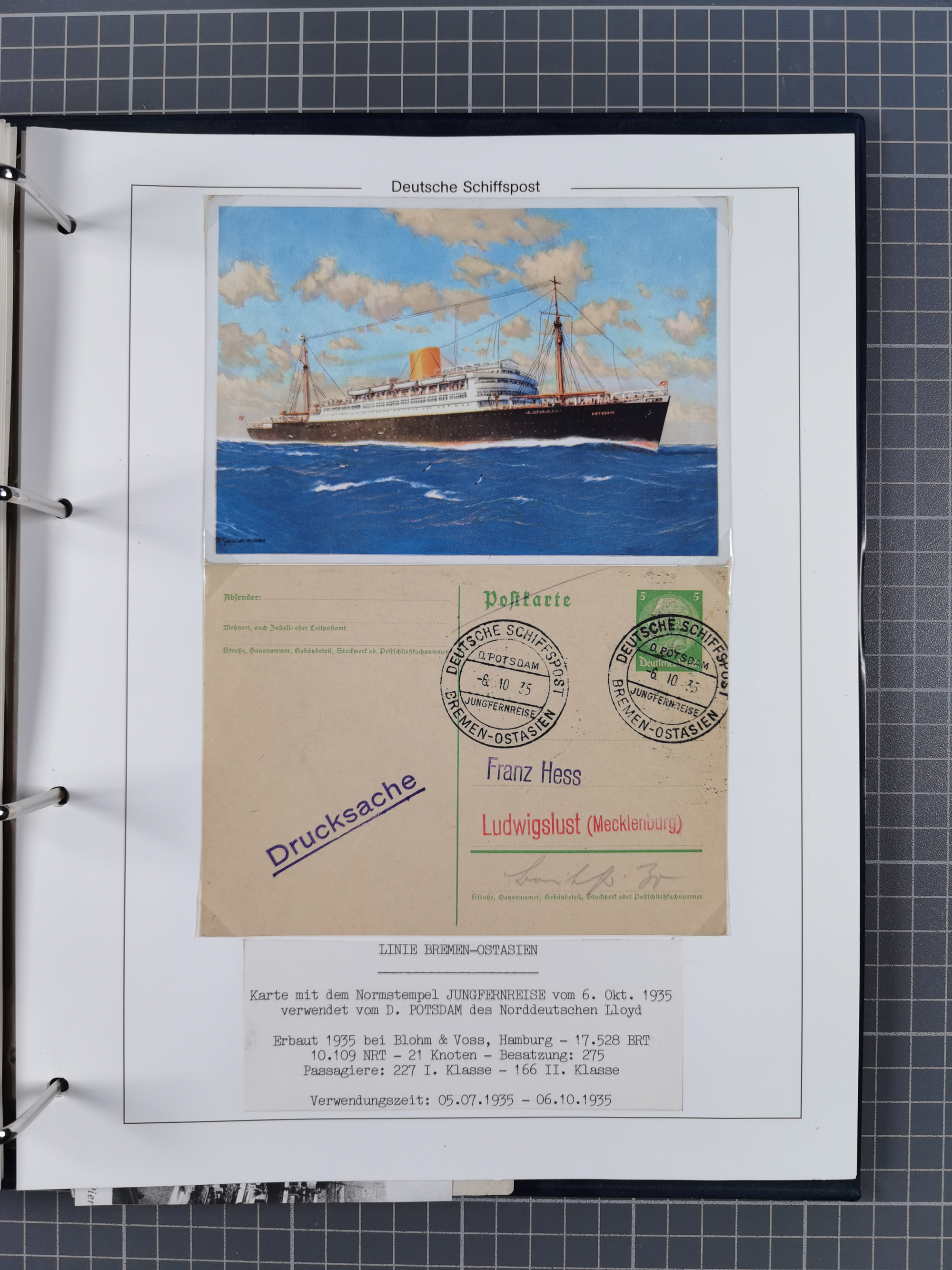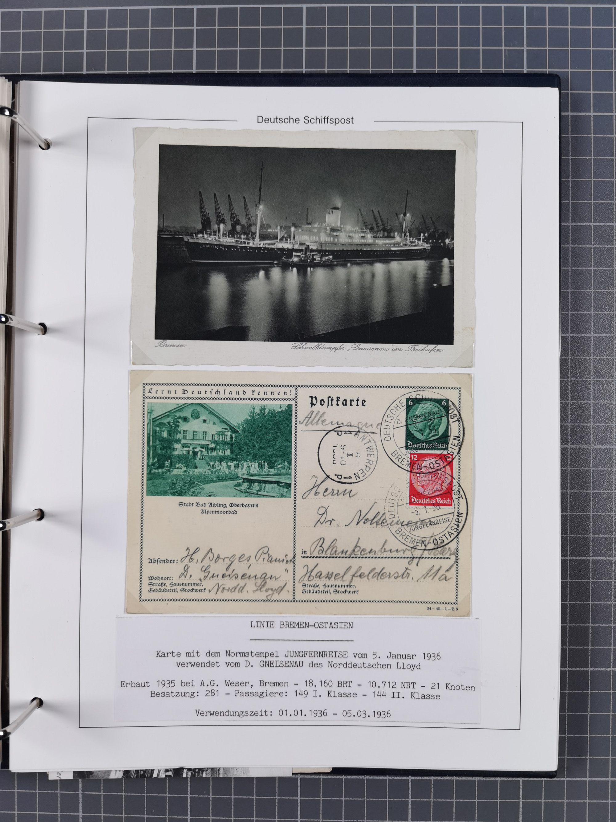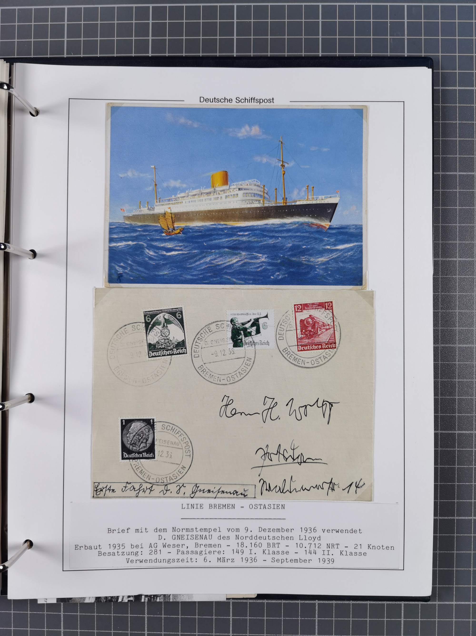 1934/39, Sammlung “Kraft durch Freude” mit ca. 240 Briefen, Karten und GSK inkl. Stempel des "LLOYD BREMEN", dazu Fotos, Schiffsansichtskarten, Speisekarten usw., sauber in vier Alben, ex Steinmeyer