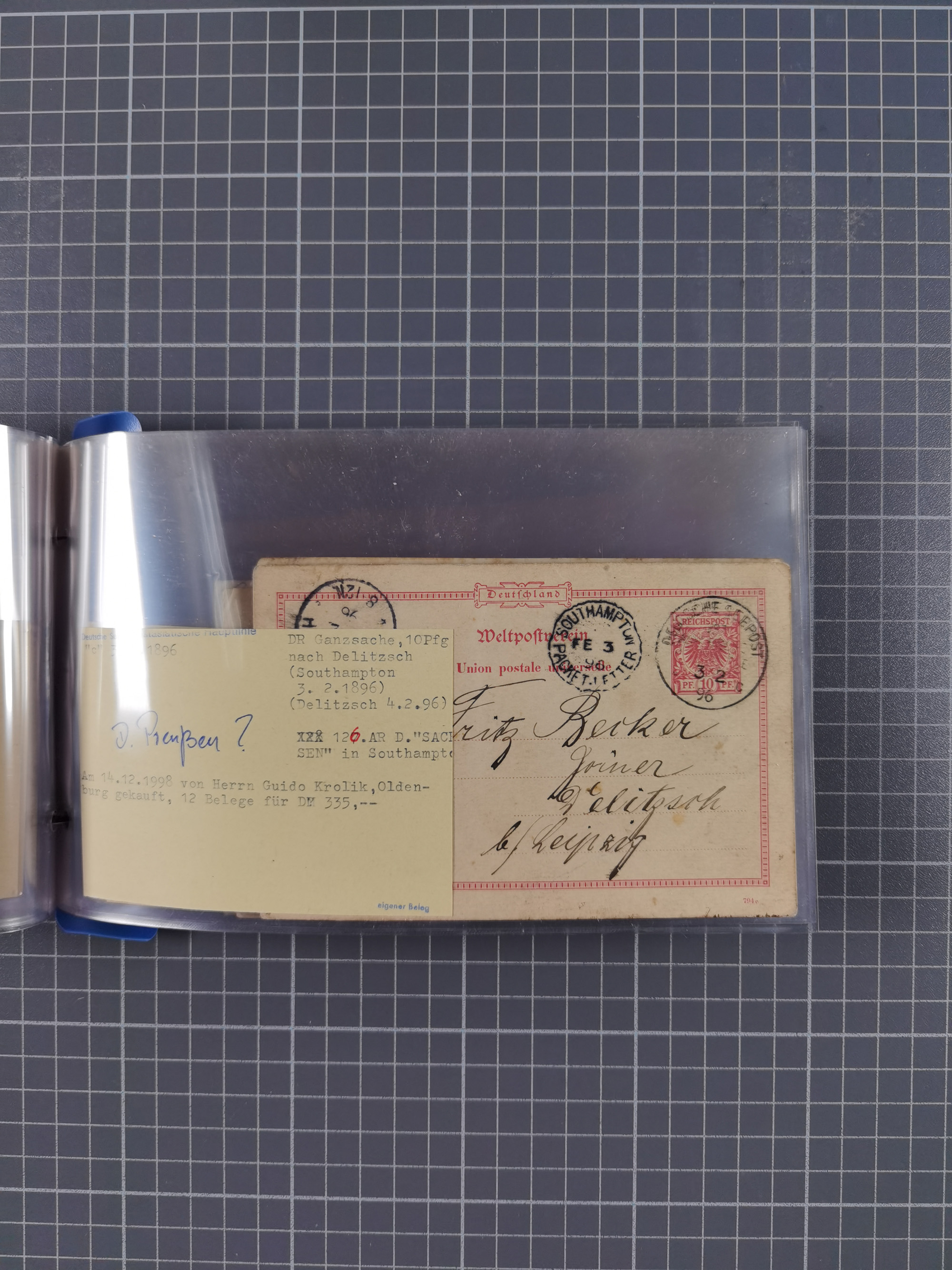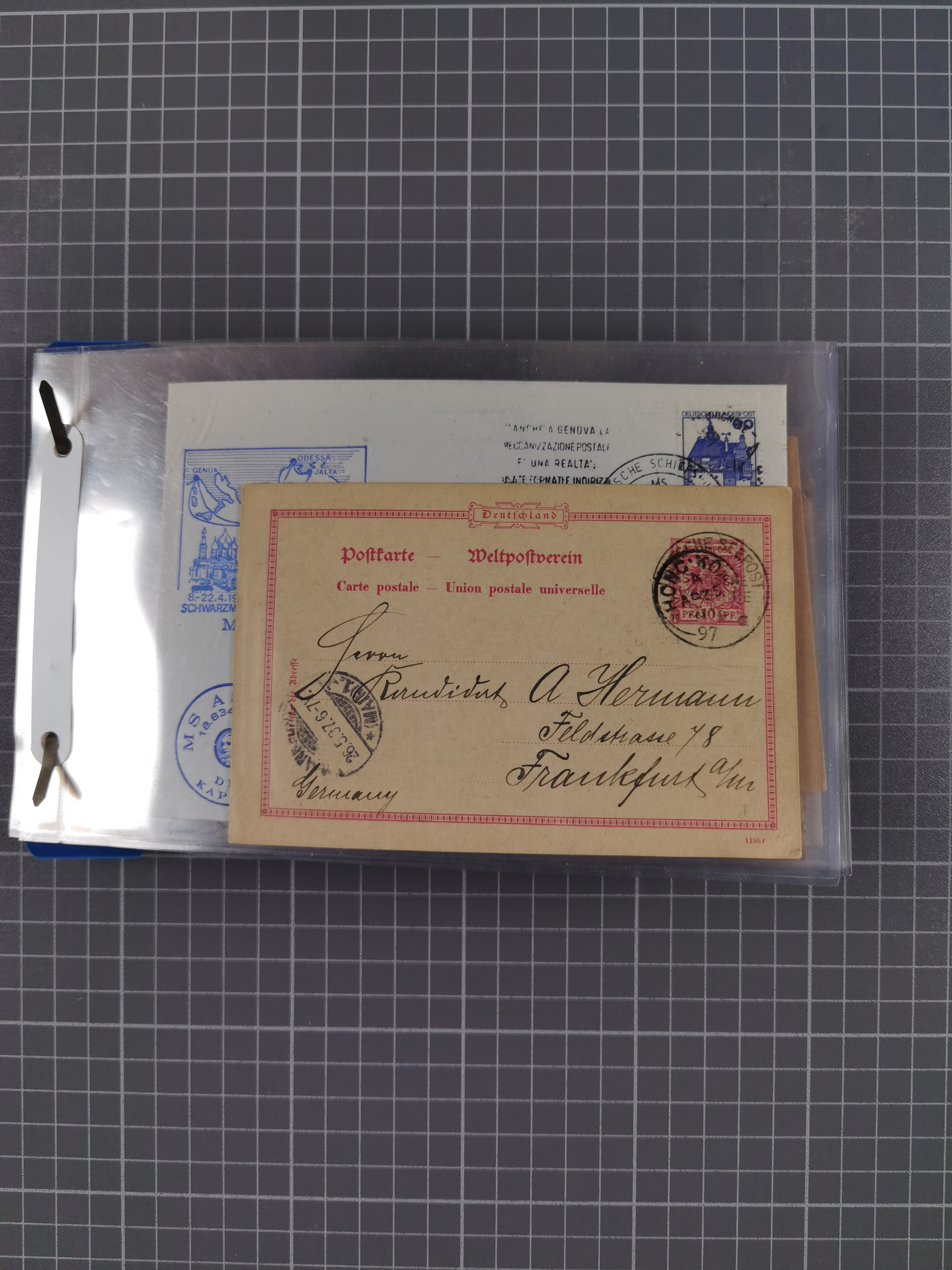 1923/35, kleine Sammlung “DSP mit Bezug zu Stettin mit Briefen, Karten und GSK, meist Sammlerpost mit u.a. violettem Stempel “DSP STETTIN-HELSINGFORS” auf Fensterbrief 1923, vier Briefe 1929/32 mit Stempel “DSP STETTIN-LENINGRAD” und fünf Belege mit Stempel “DSP STETTIN-REVAL”, meist in guter Erhaltung. Dazu Forschungsarbeiten mit Texten und Kopien, ex Steinmeyer