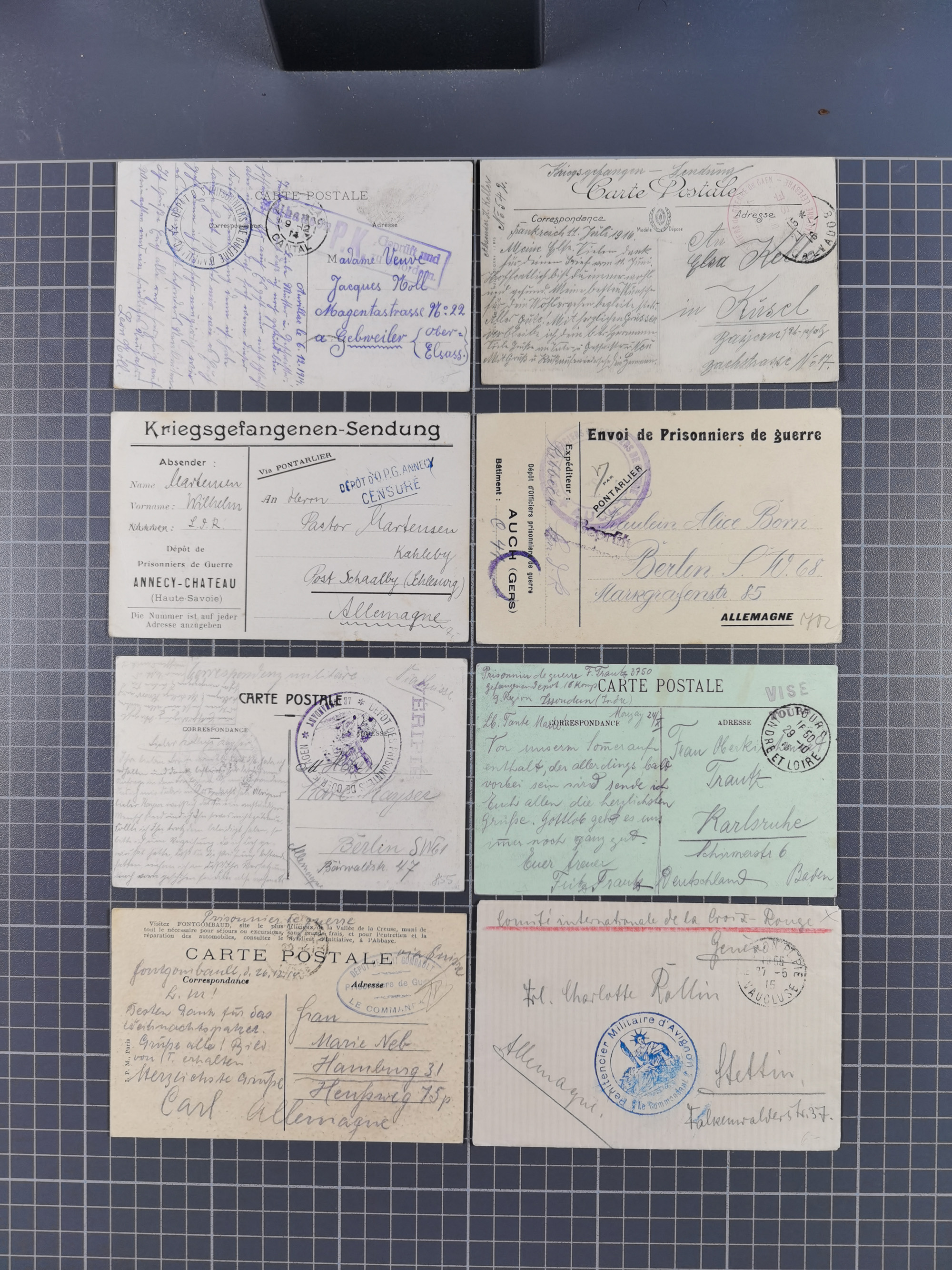 1914/18 (ca.), einige hundert Briefe und Karten, dabei interessante Vermerke, Stempel, Dokumente, Rot-Kreuz Briefe, ferner Bildpostkarten, Fotos, etc., in drei dicken Ordnern