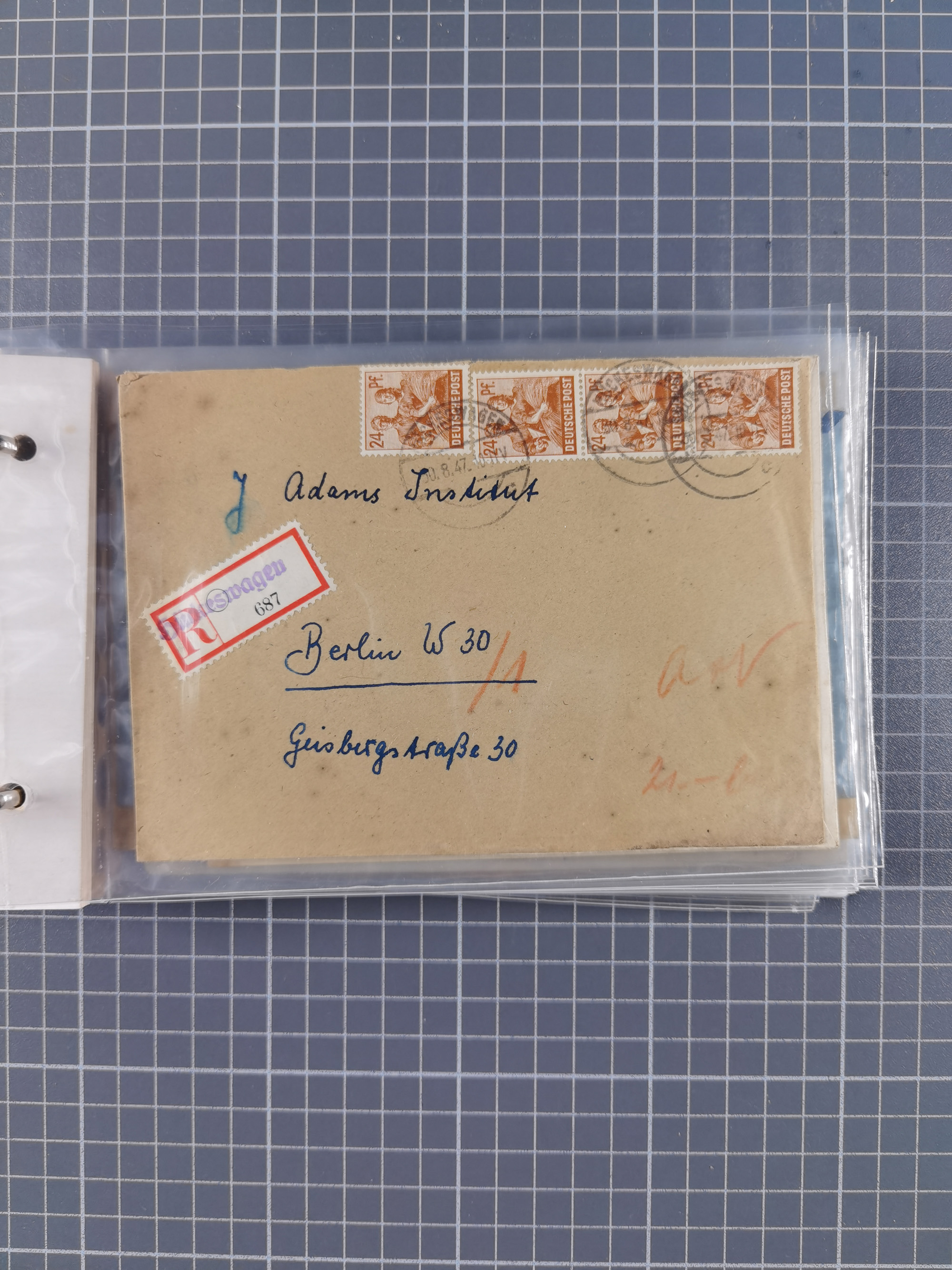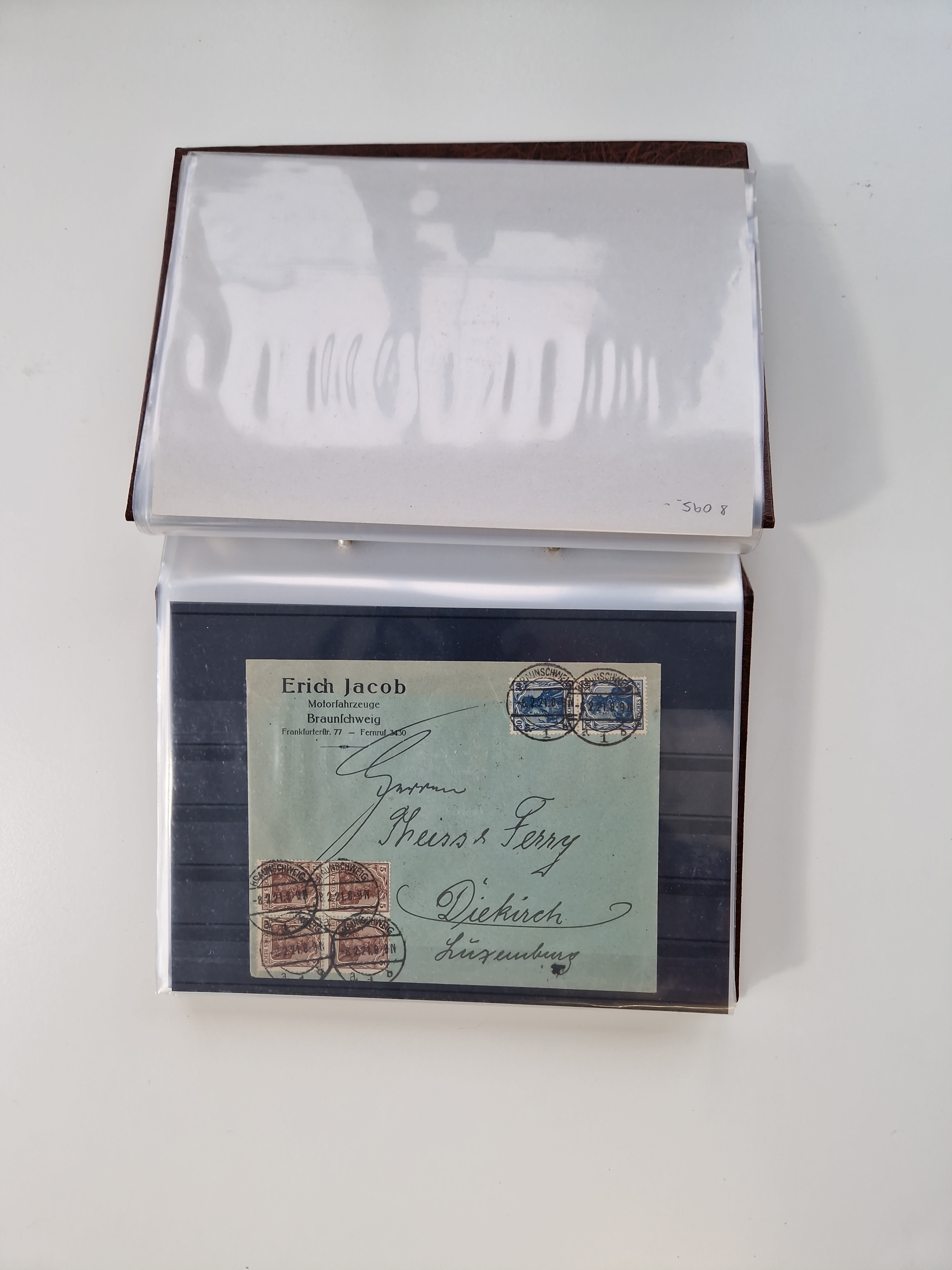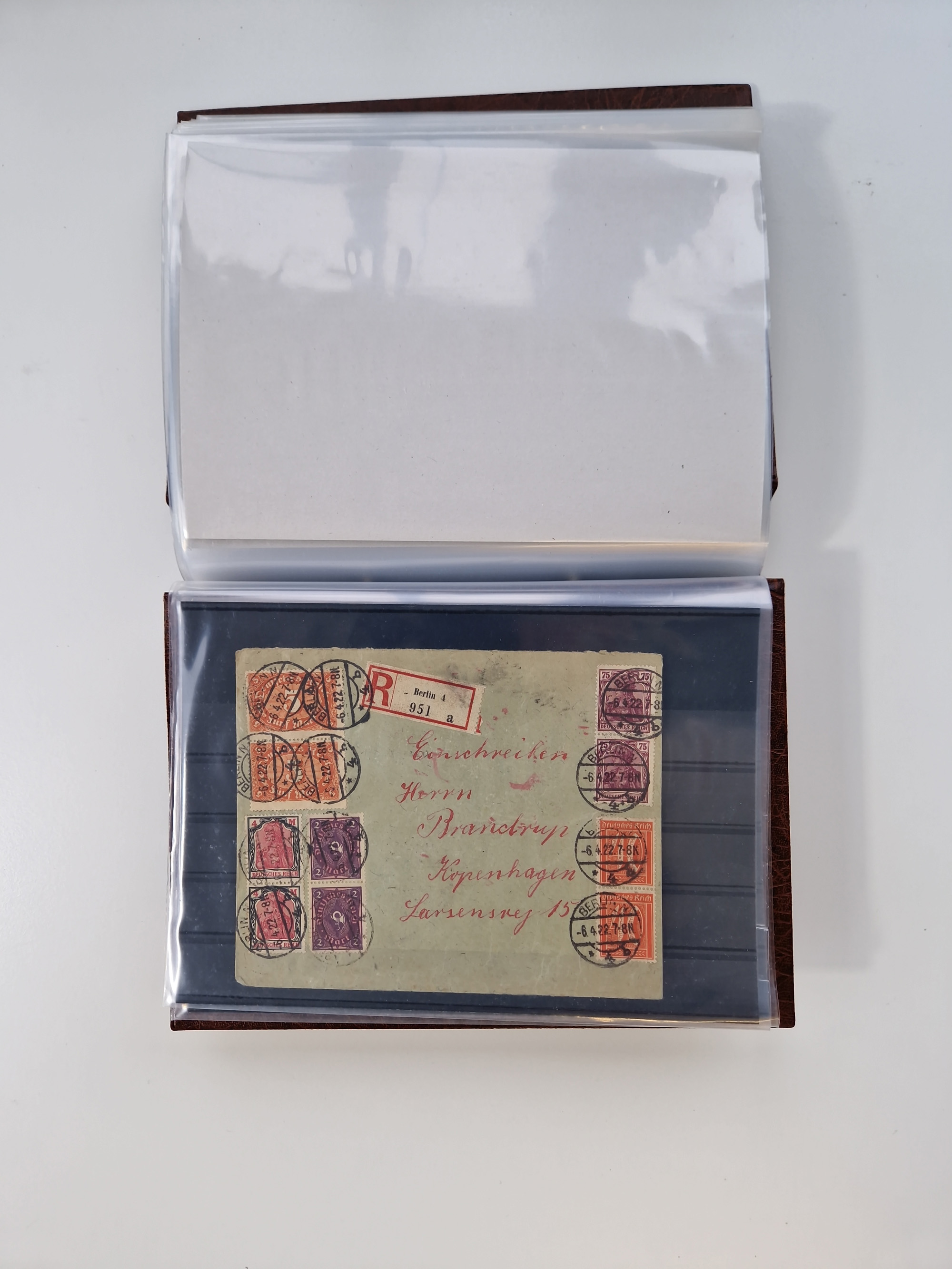 1903/80, Album mit 128 Mehrfachfrankaturen mit mindestens vier Marken, meistens aber mit mehr Marken (48 St. Ausland) dabei auch bessere Ausgaben z. B. Zepp-Brief Argentinienfahrt 1934 mit 5 x 35 Pf. Hindenburg und Zeppelin- Englandfahrt 1930 mit 6 x 25 Pf. Hindenburg, etwas unterschiedliche Erhaltung