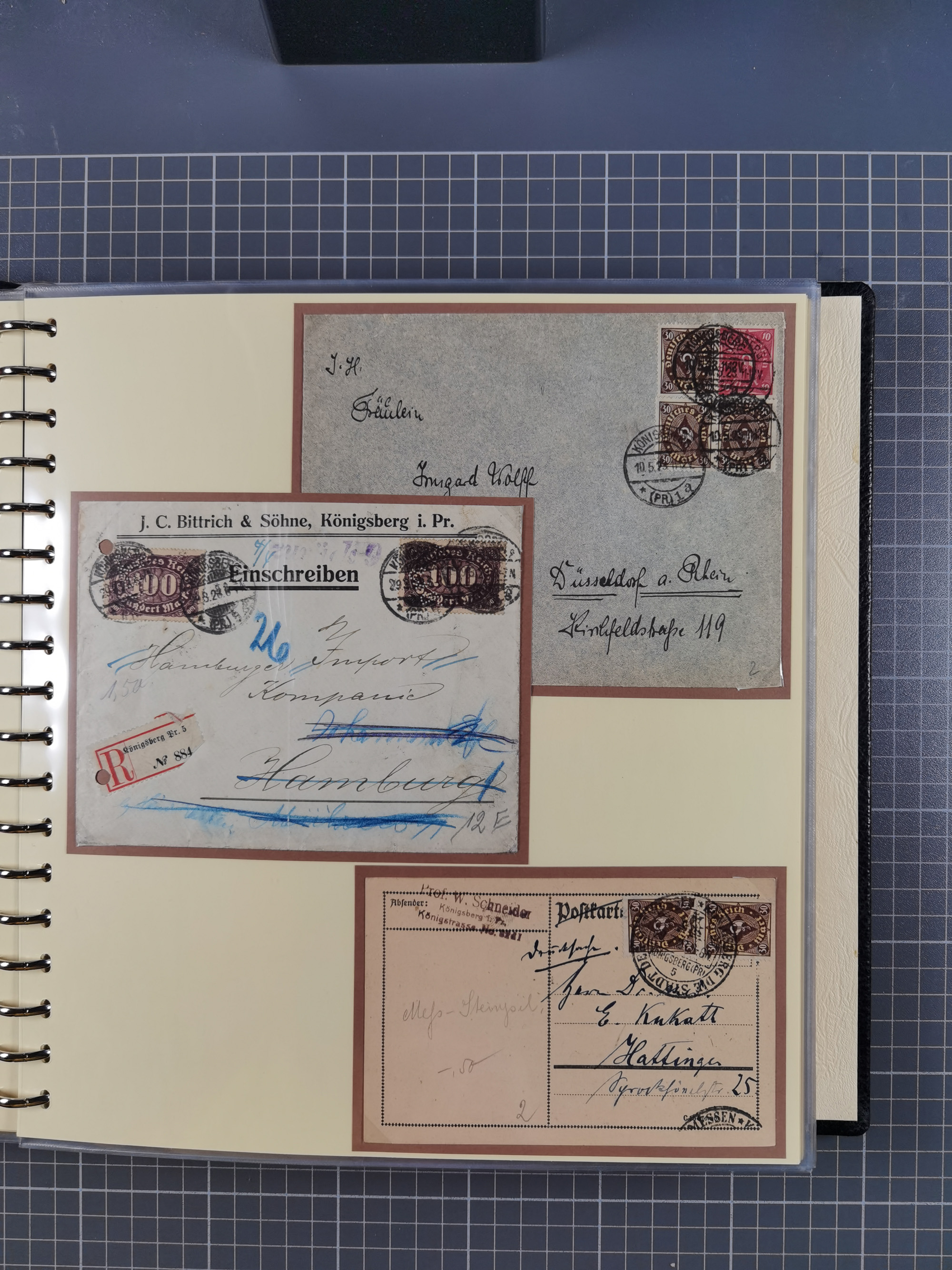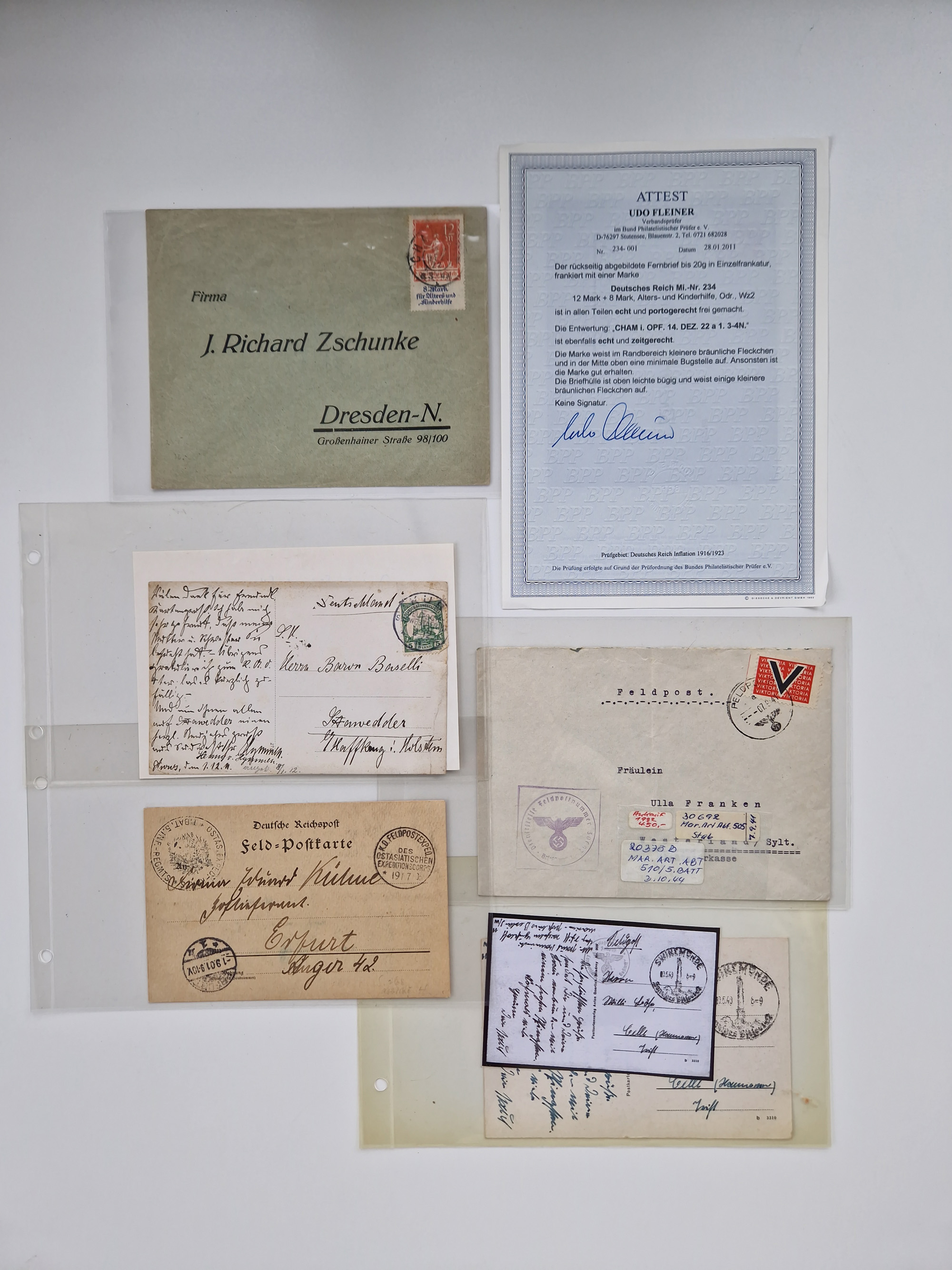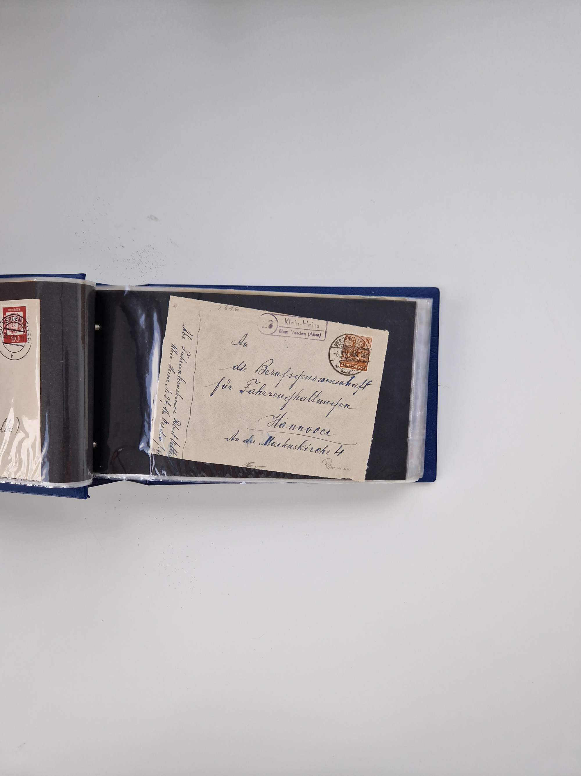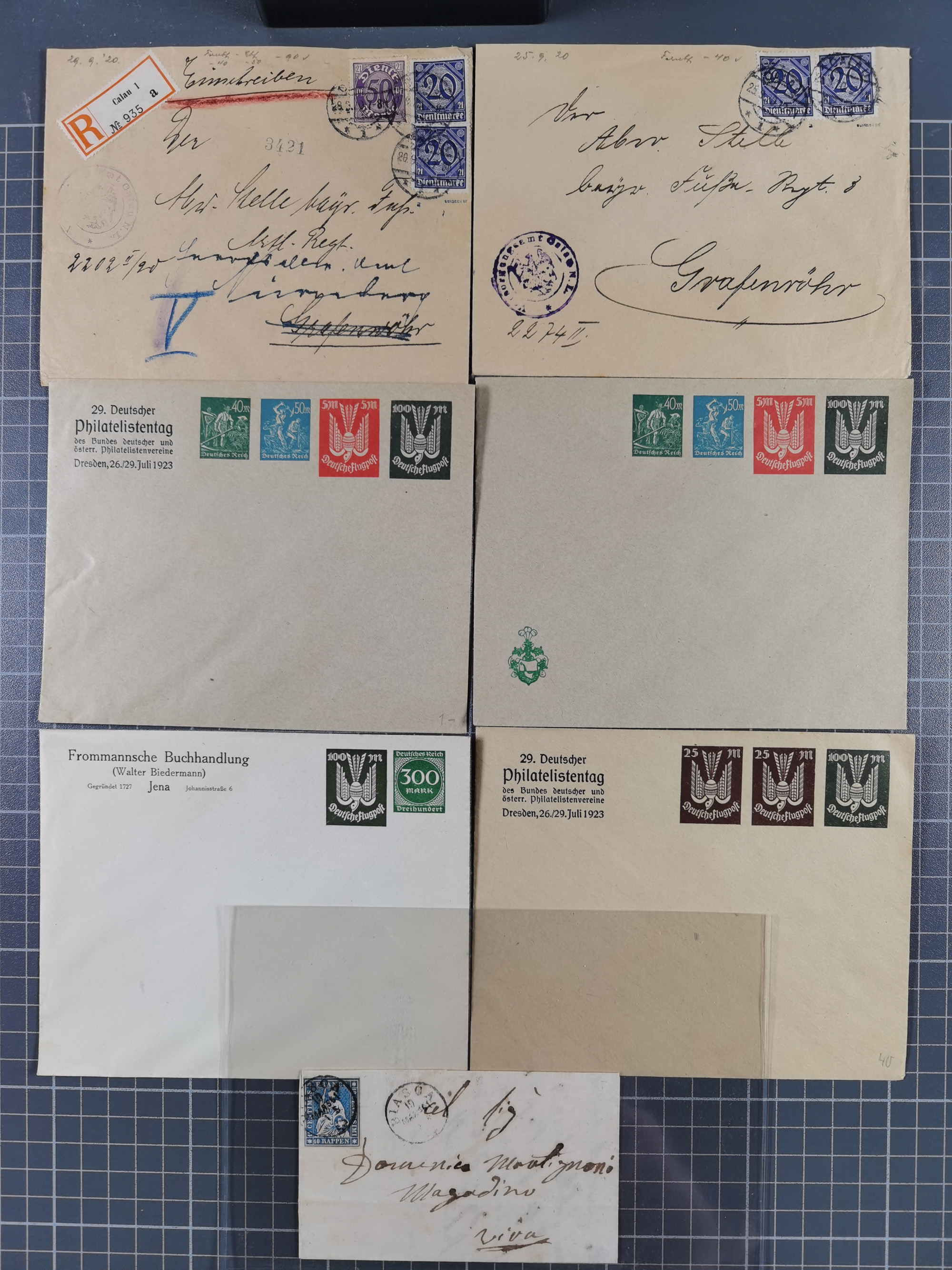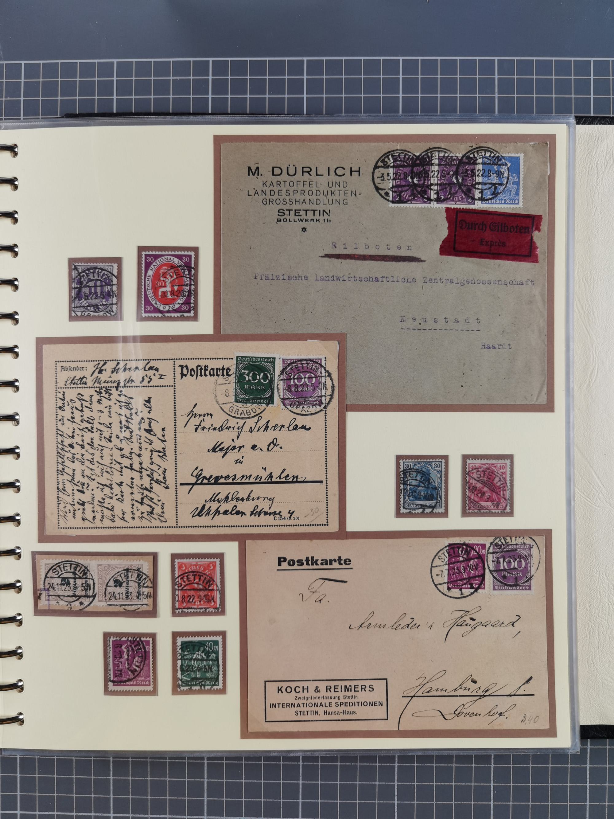 1865/1950 (ca.), Album mit 122 hochwertigen Belegen, diese einzeln vom Einlieferer beschrieben und nach Michel bewertet 15.000 €. Dazu ein Karton mit über 170 Briefen, Karten und Ganzsachen, dabei etliche interessante Belege, meist gute Erhaltung