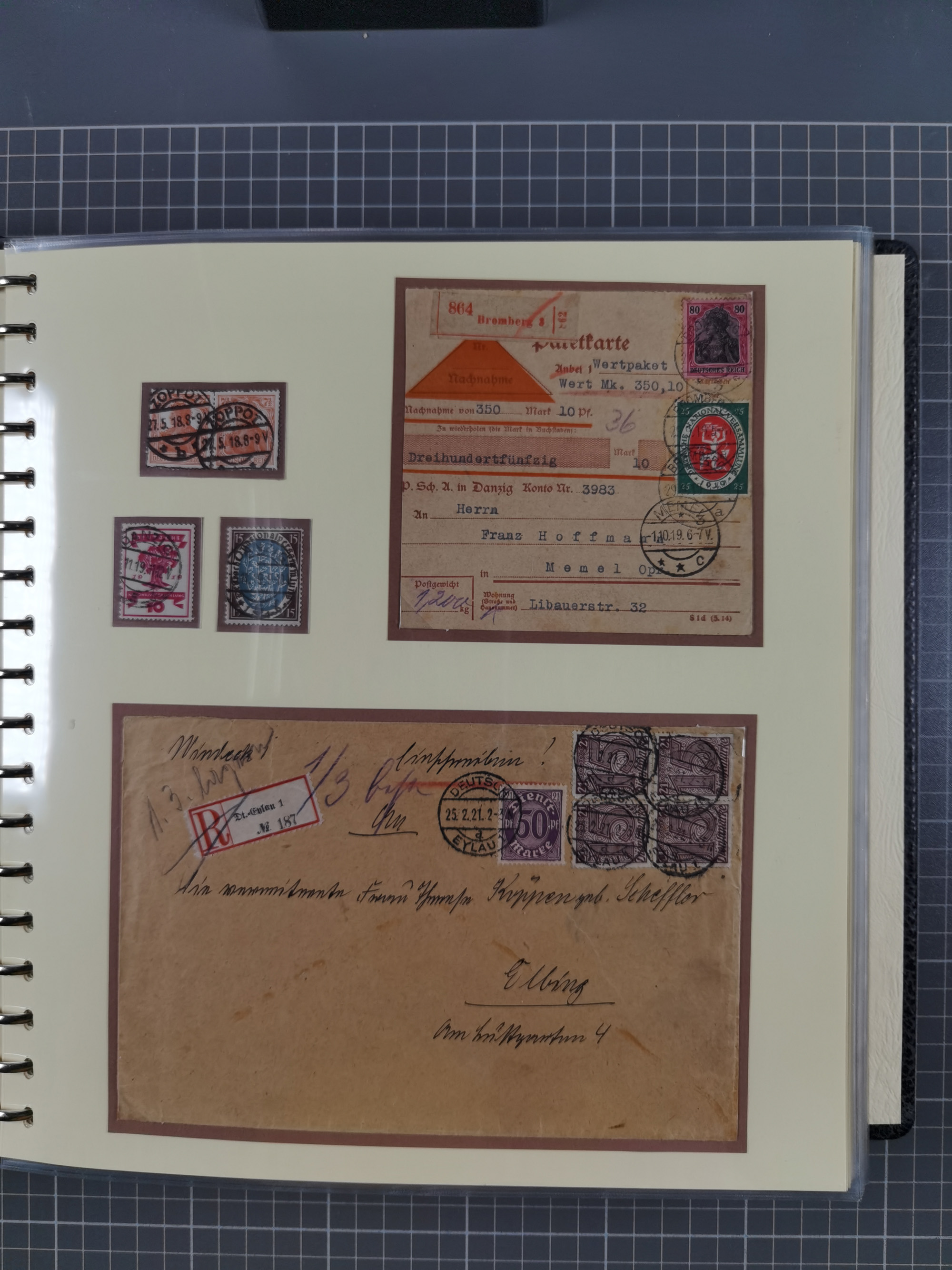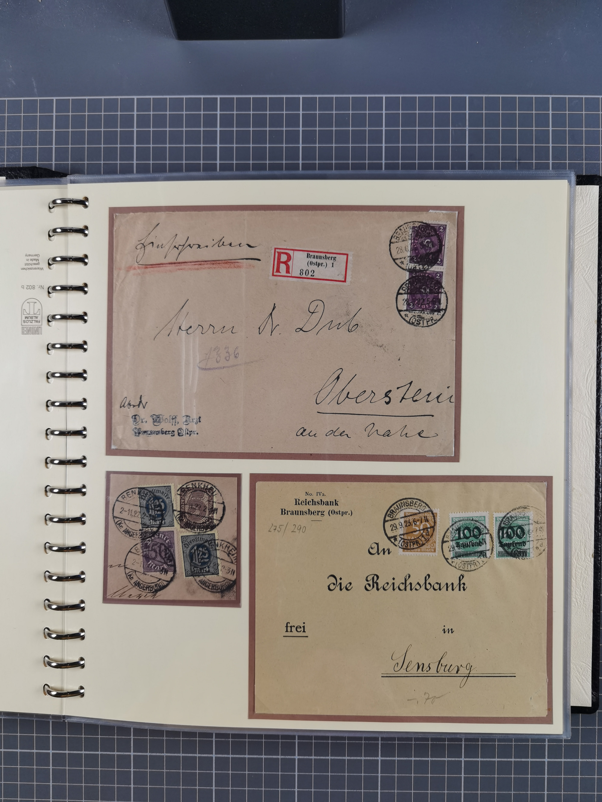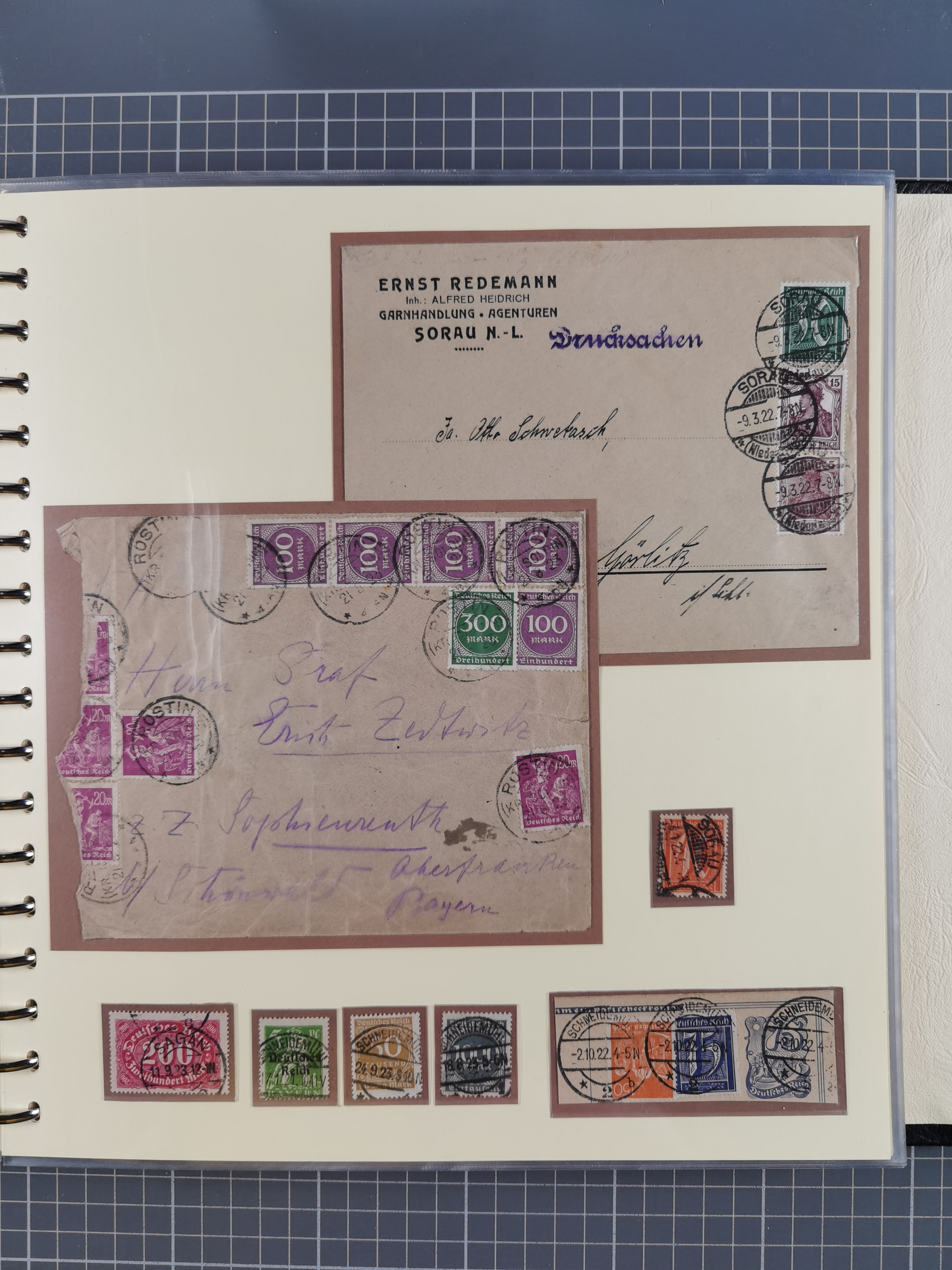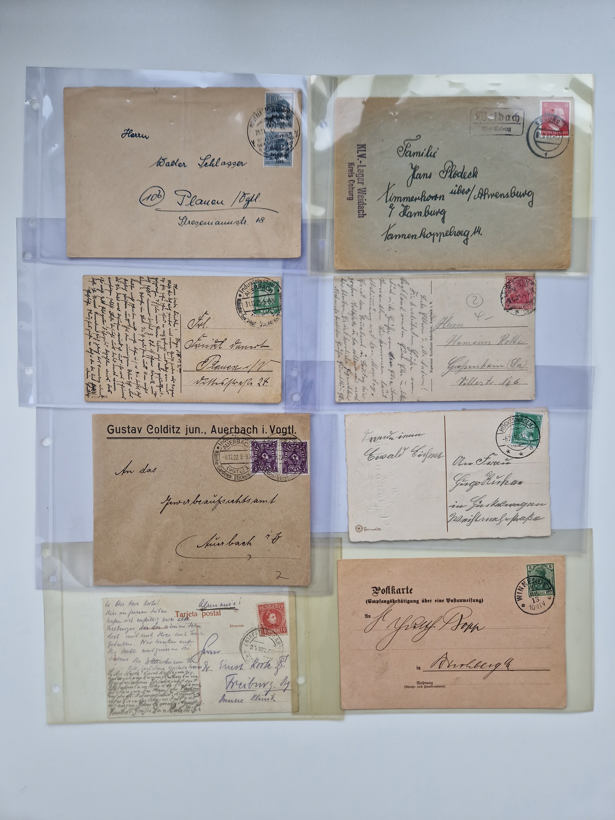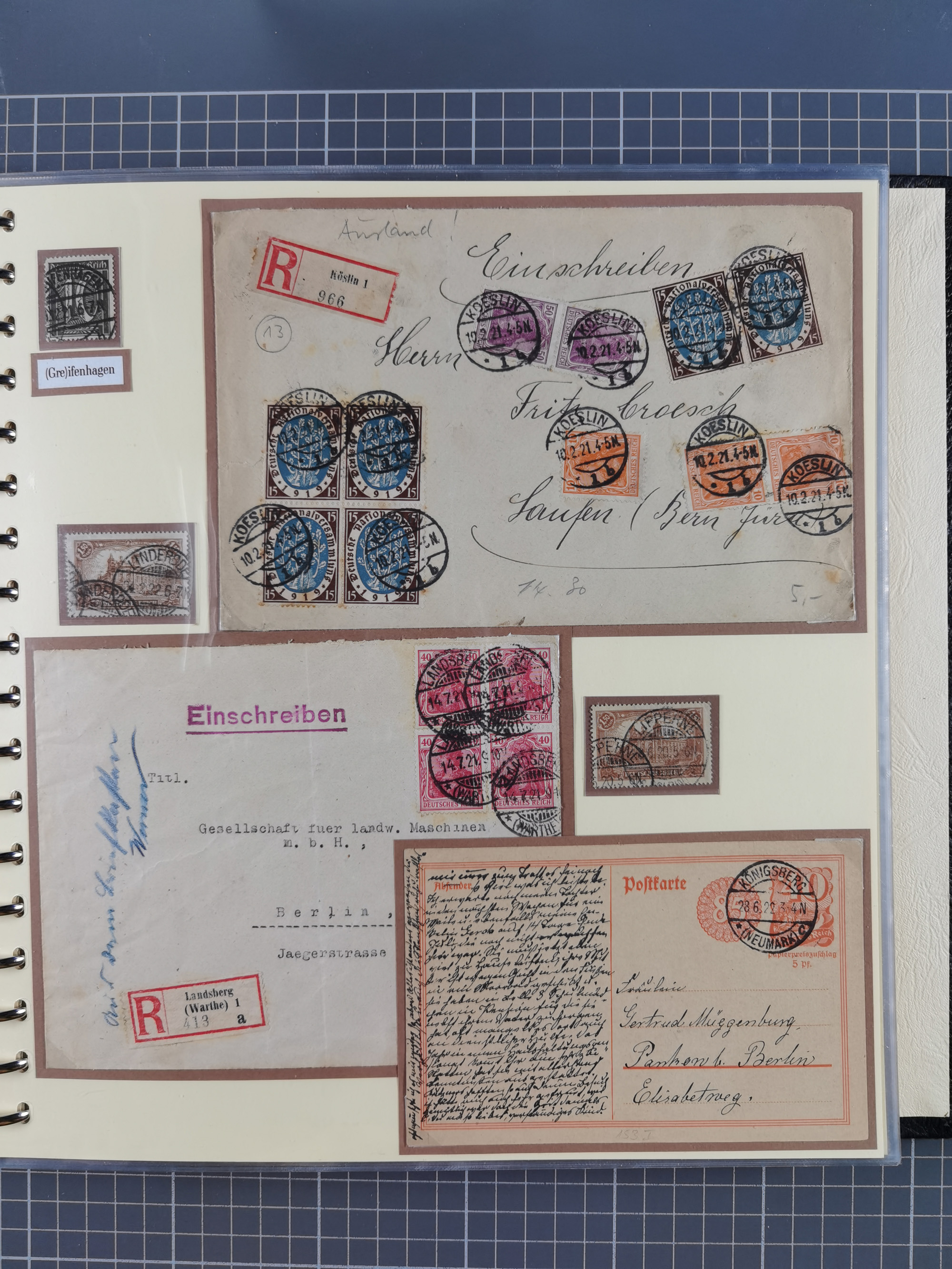1865/1950 (ca.), Album mit 122 hochwertigen Belegen, diese einzeln vom Einlieferer beschrieben und nach Michel bewertet 15.000 €. Dazu ein Karton mit über 170 Briefen, Karten und Ganzsachen, dabei etliche interessante Belege, meist gute Erhaltung
