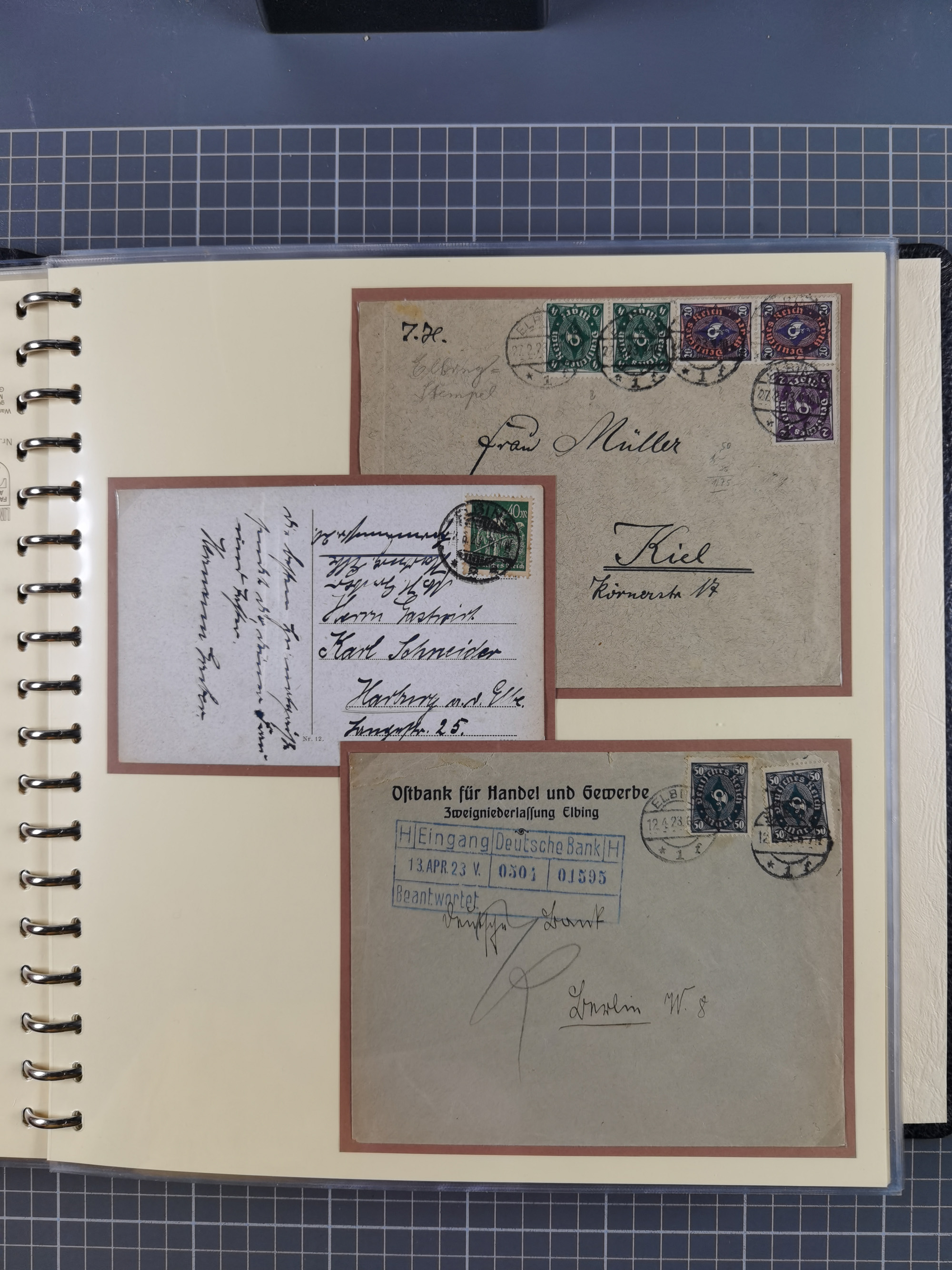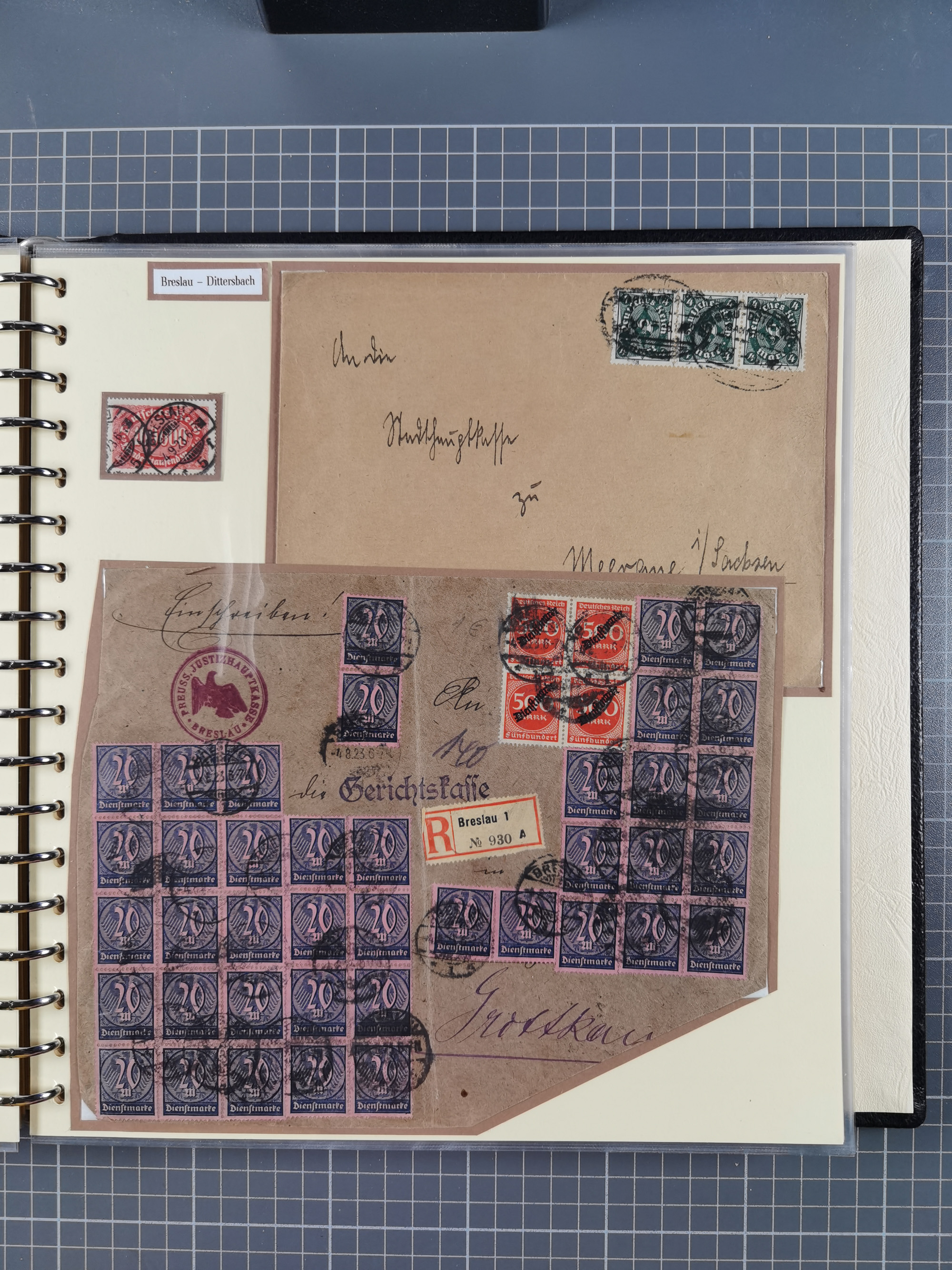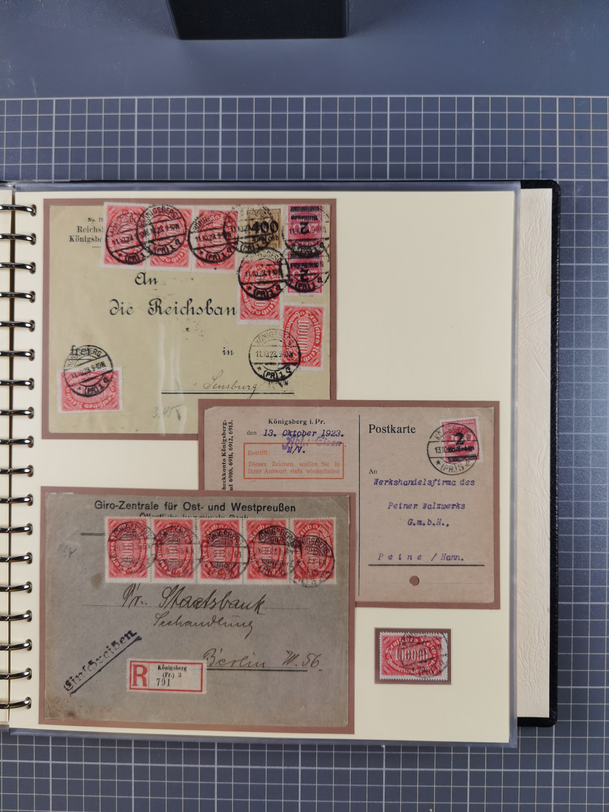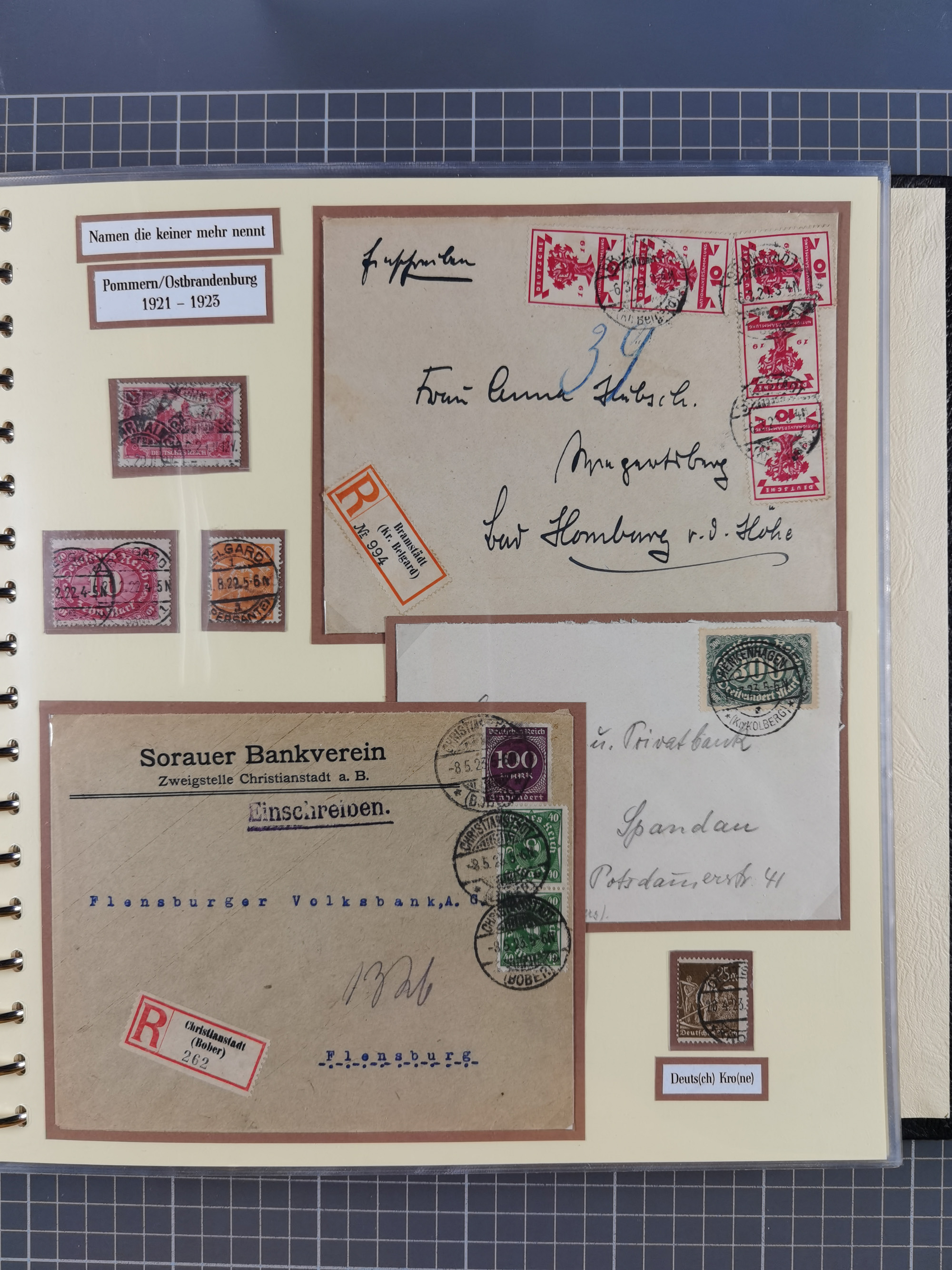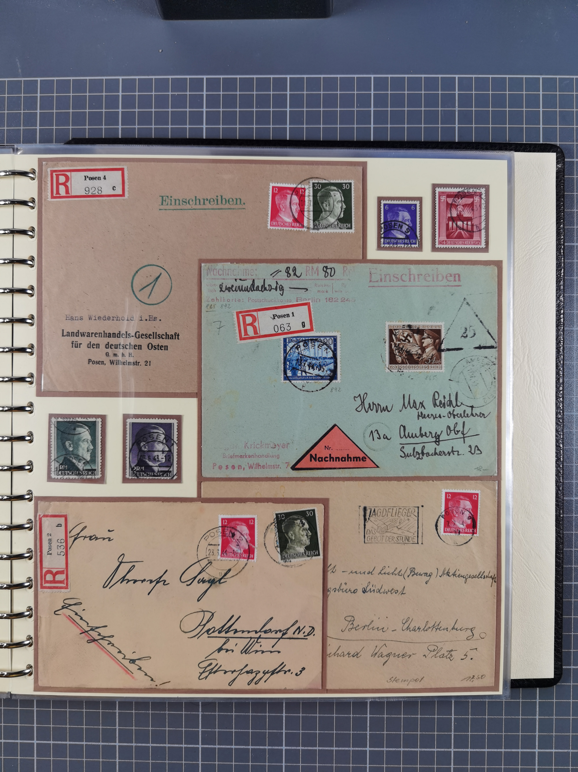 1865/1950 (ca.), Album mit 122 hochwertigen Belegen, diese einzeln vom Einlieferer beschrieben und nach Michel bewertet 15.000 €. Dazu ein Karton mit über 170 Briefen, Karten und Ganzsachen, dabei etliche interessante Belege, meist gute Erhaltung