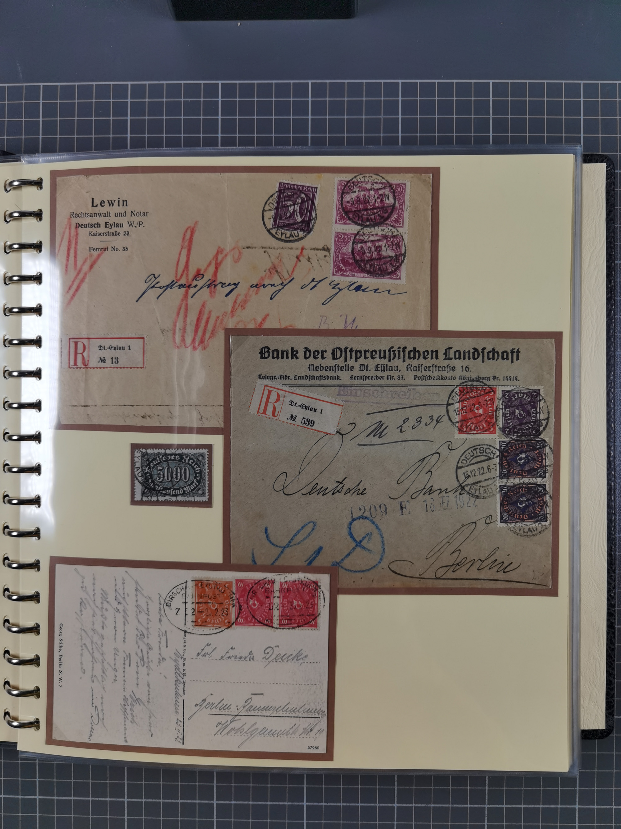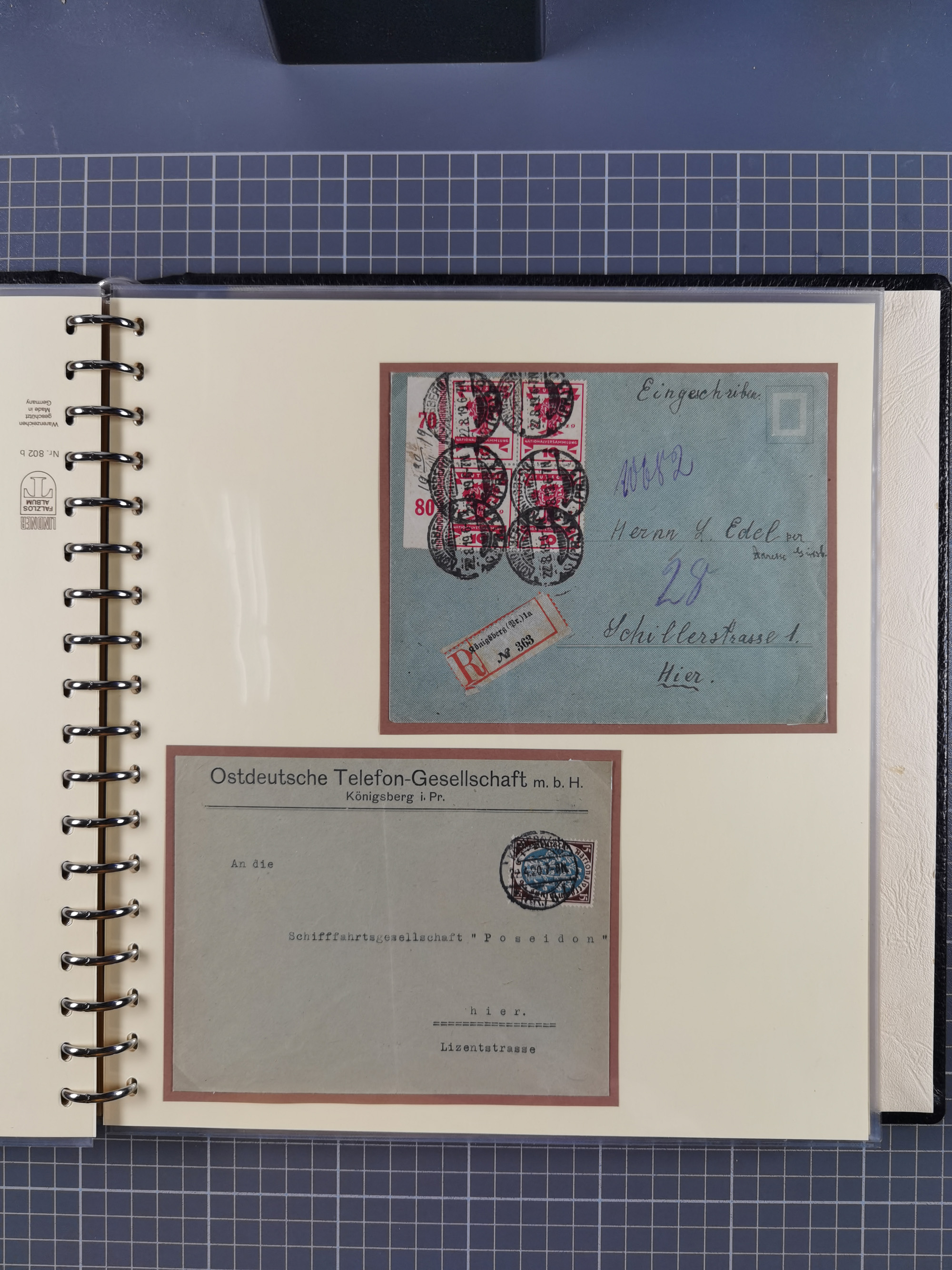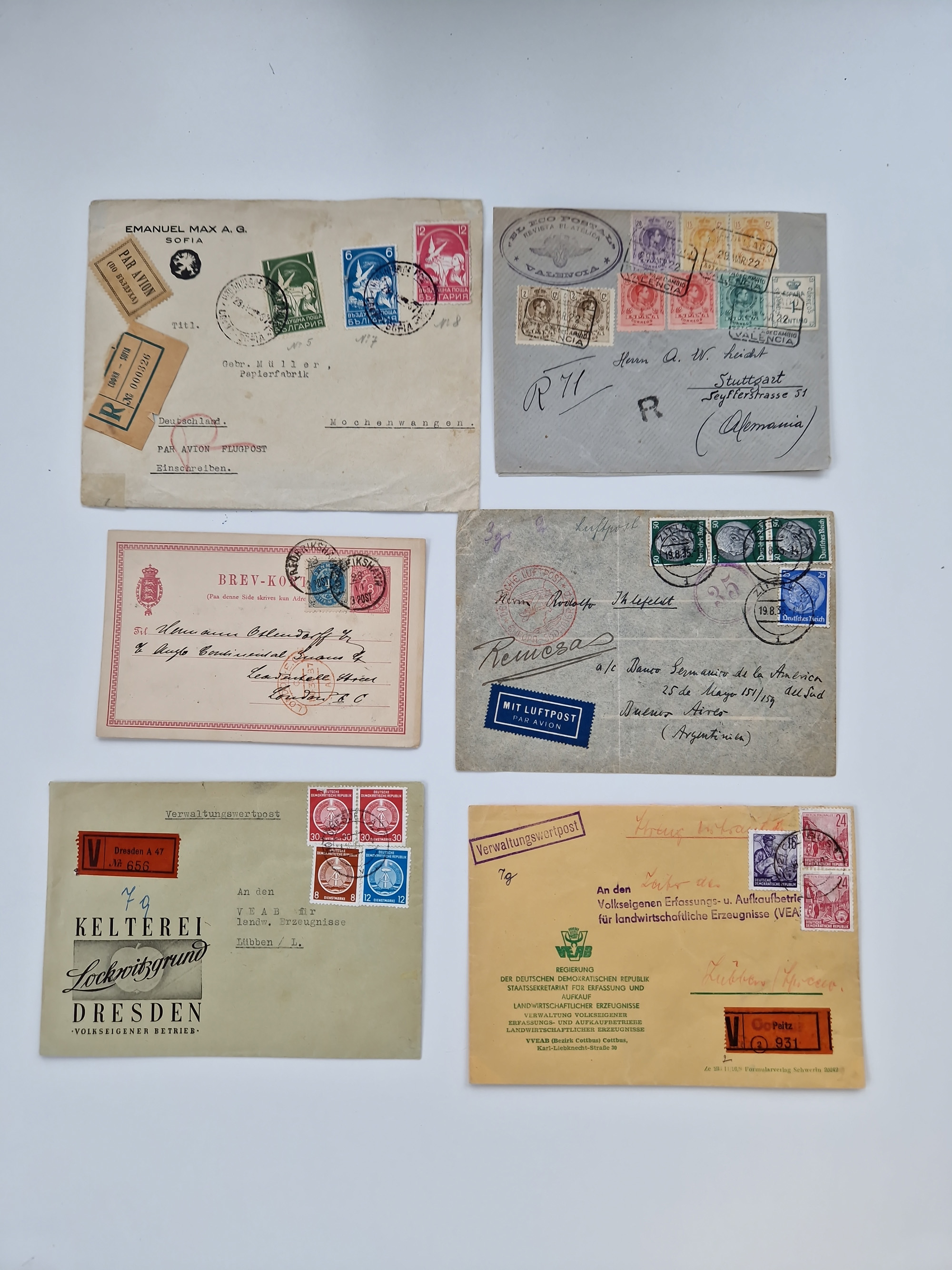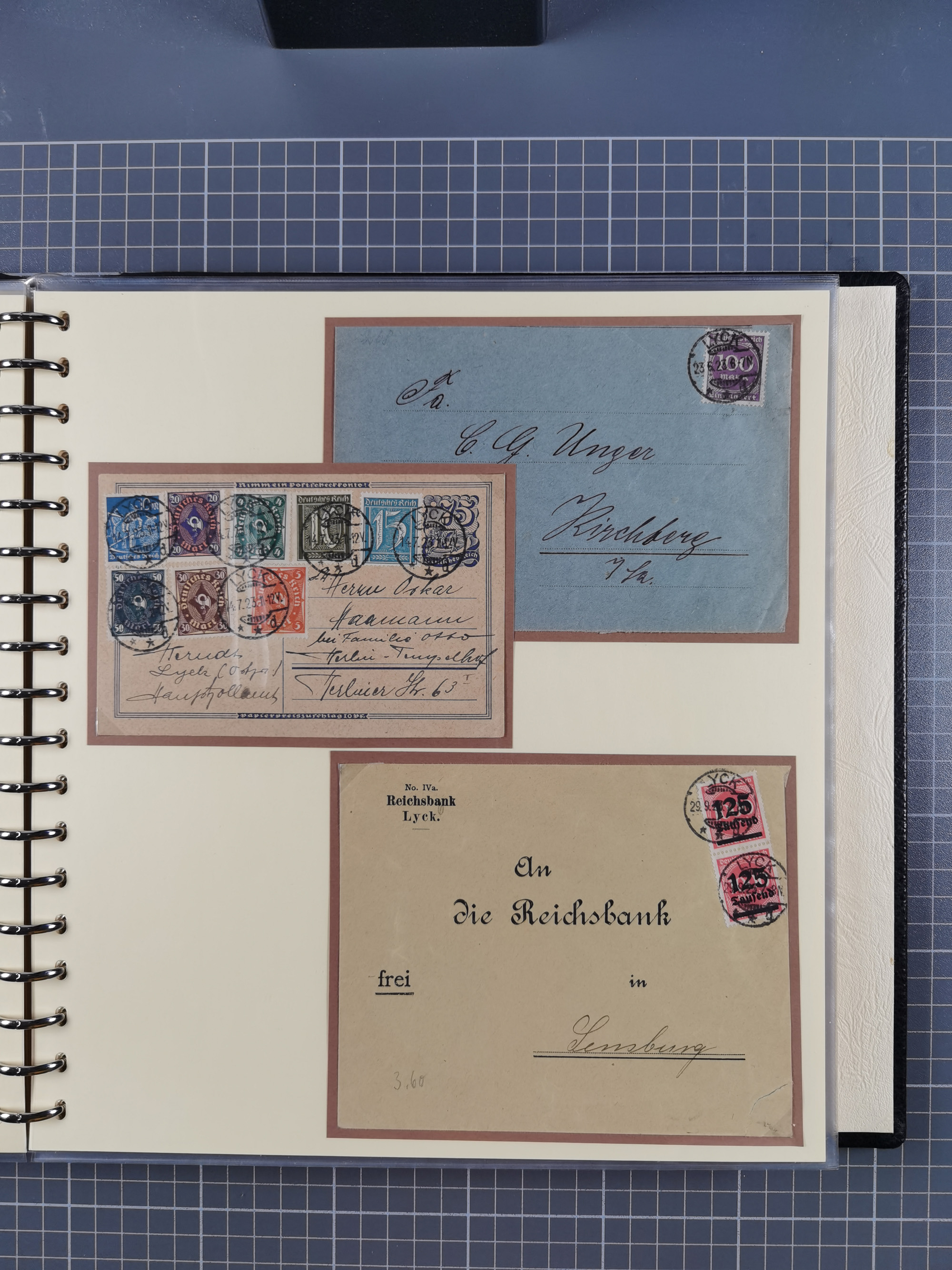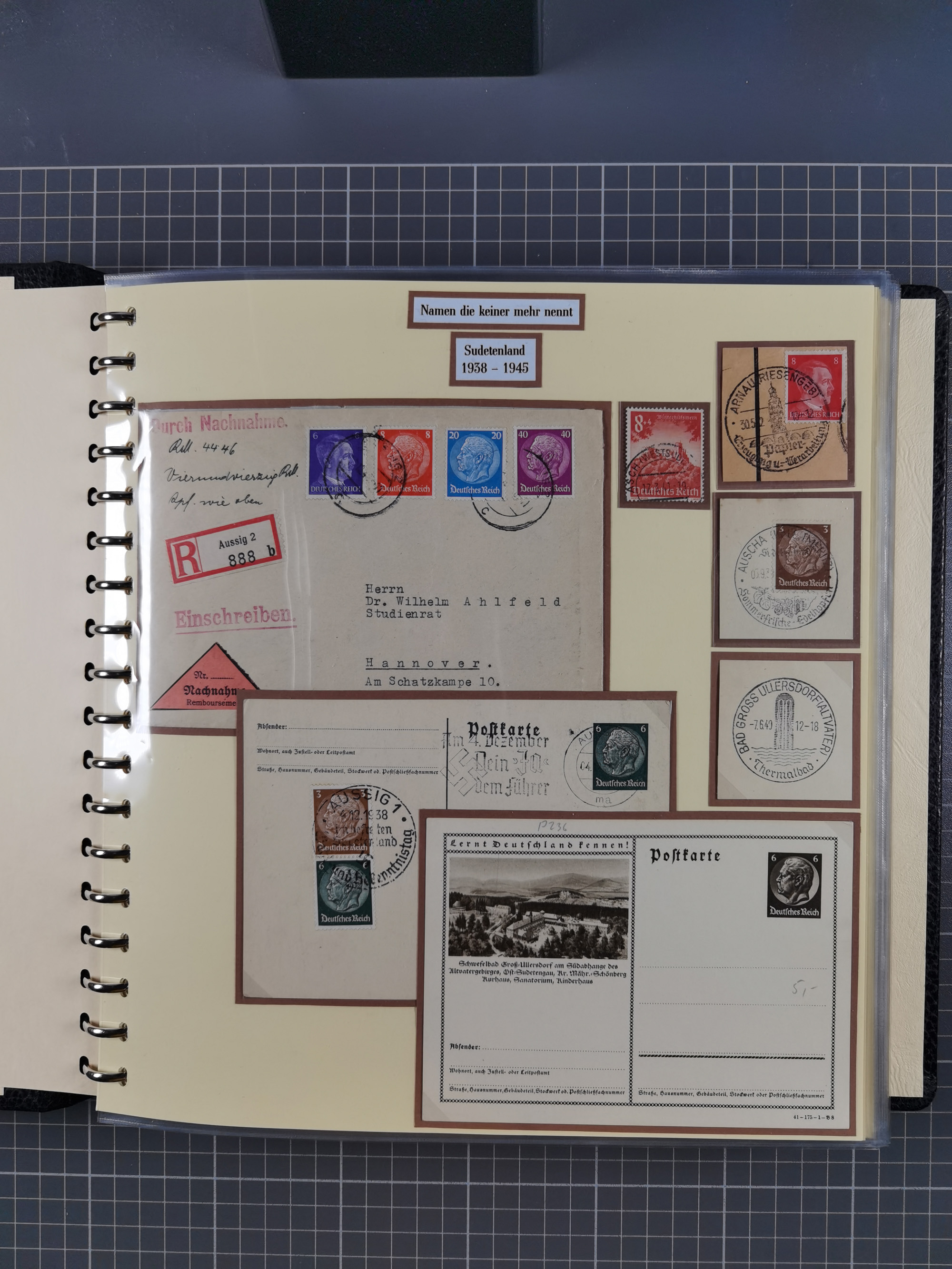 1865/1950 (ca.), Album mit 122 hochwertigen Belegen, diese einzeln vom Einlieferer beschrieben und nach Michel bewertet 15.000 €. Dazu ein Karton mit über 170 Briefen, Karten und Ganzsachen, dabei etliche interessante Belege, meist gute Erhaltung