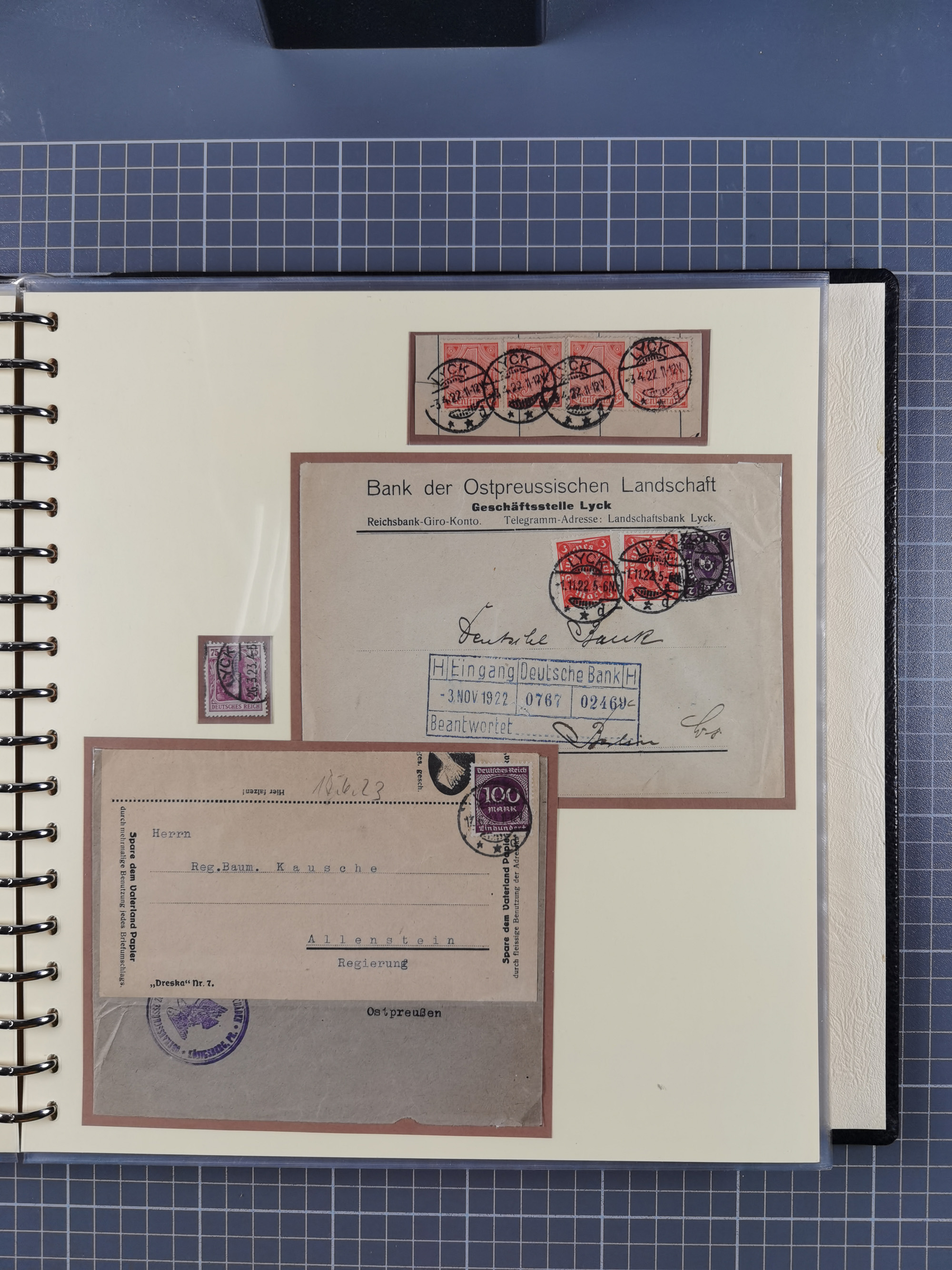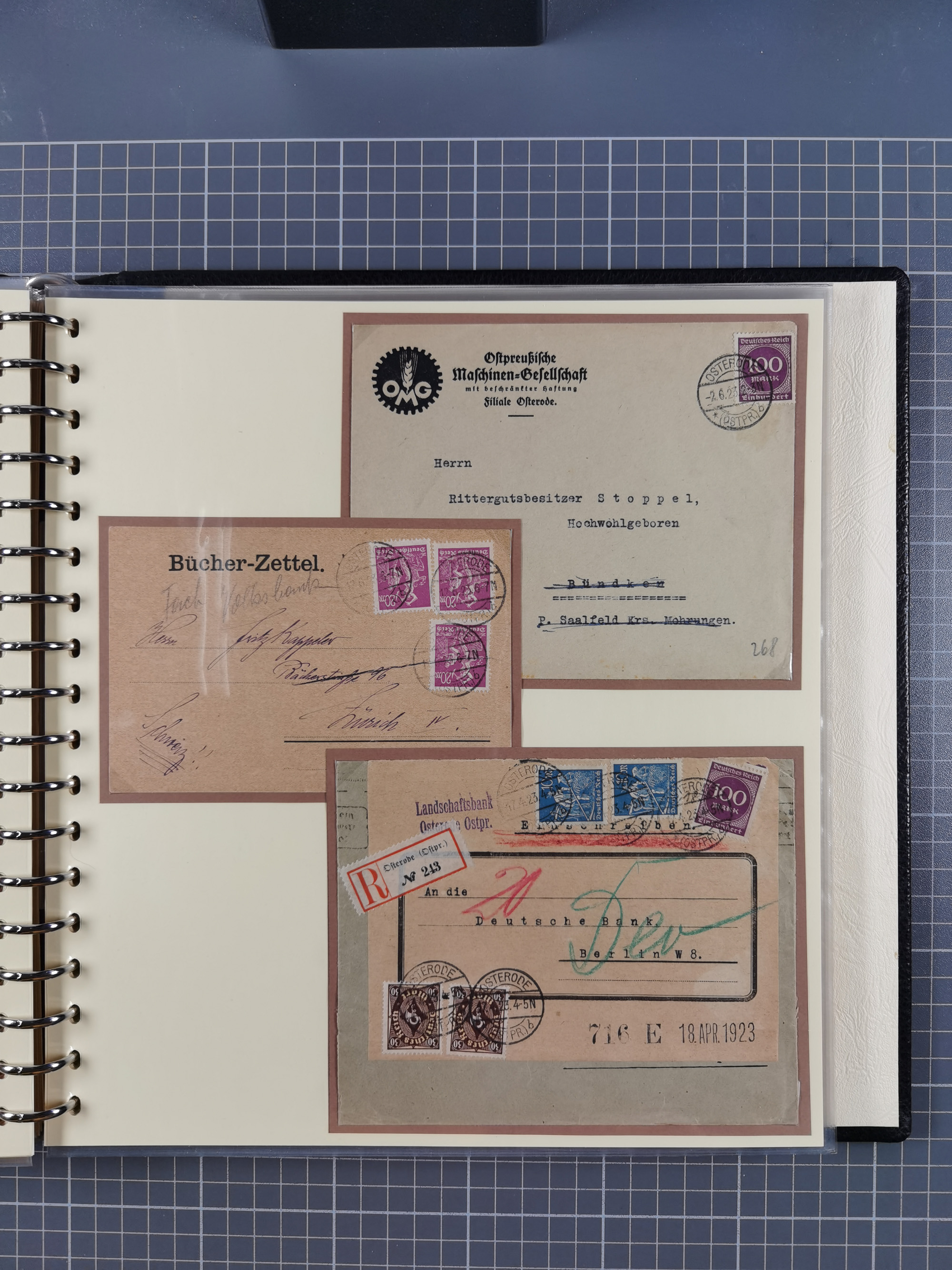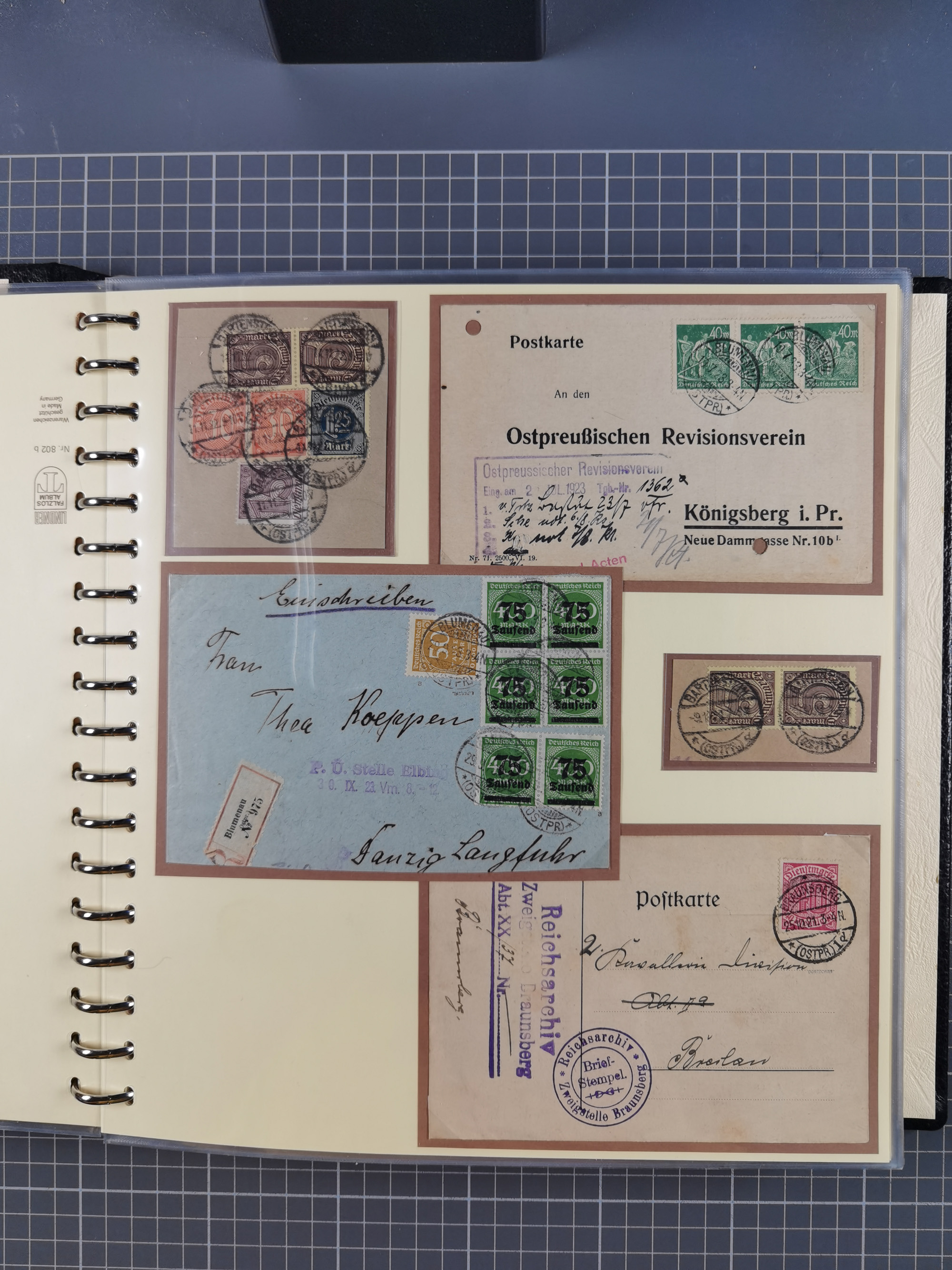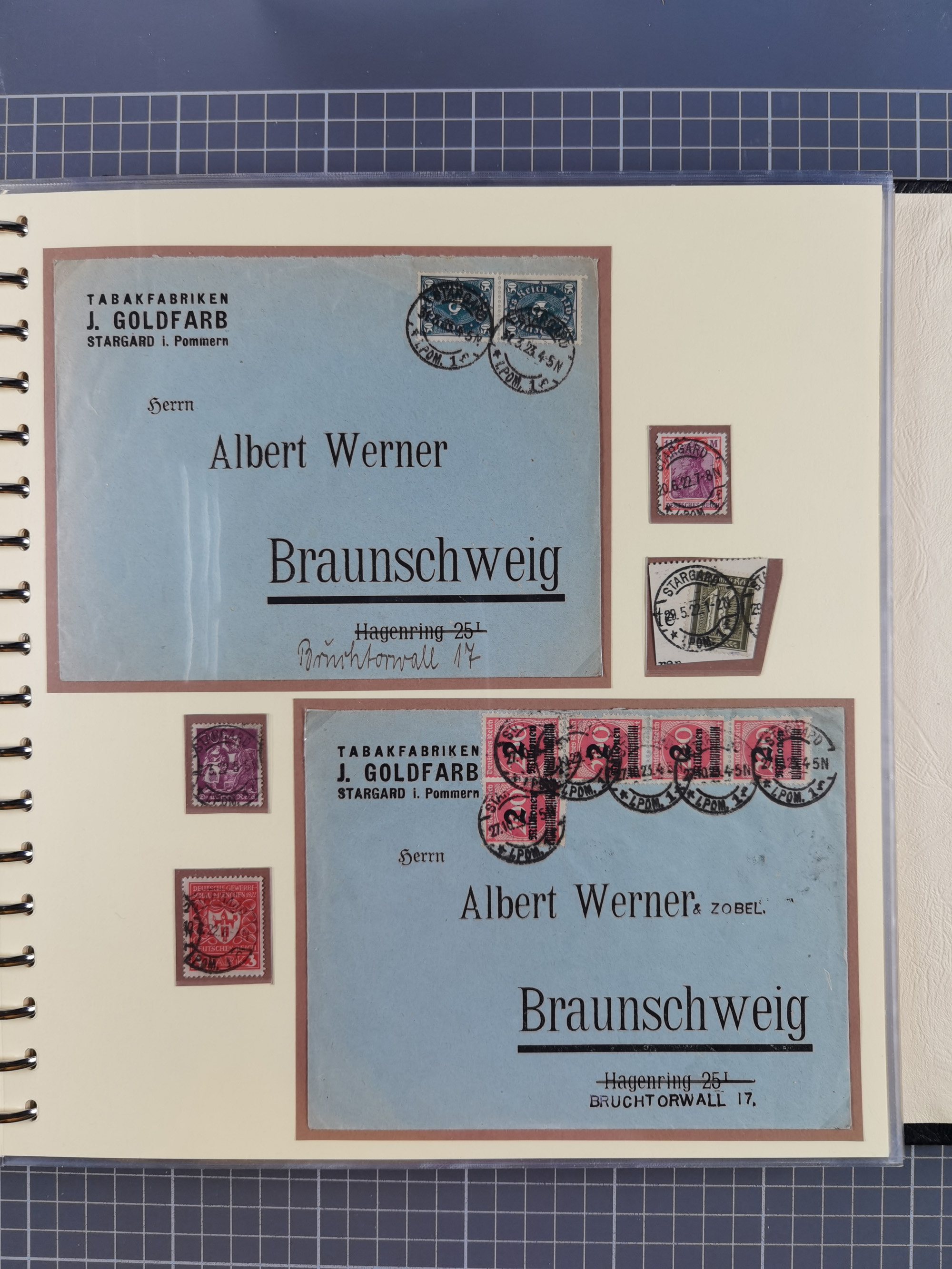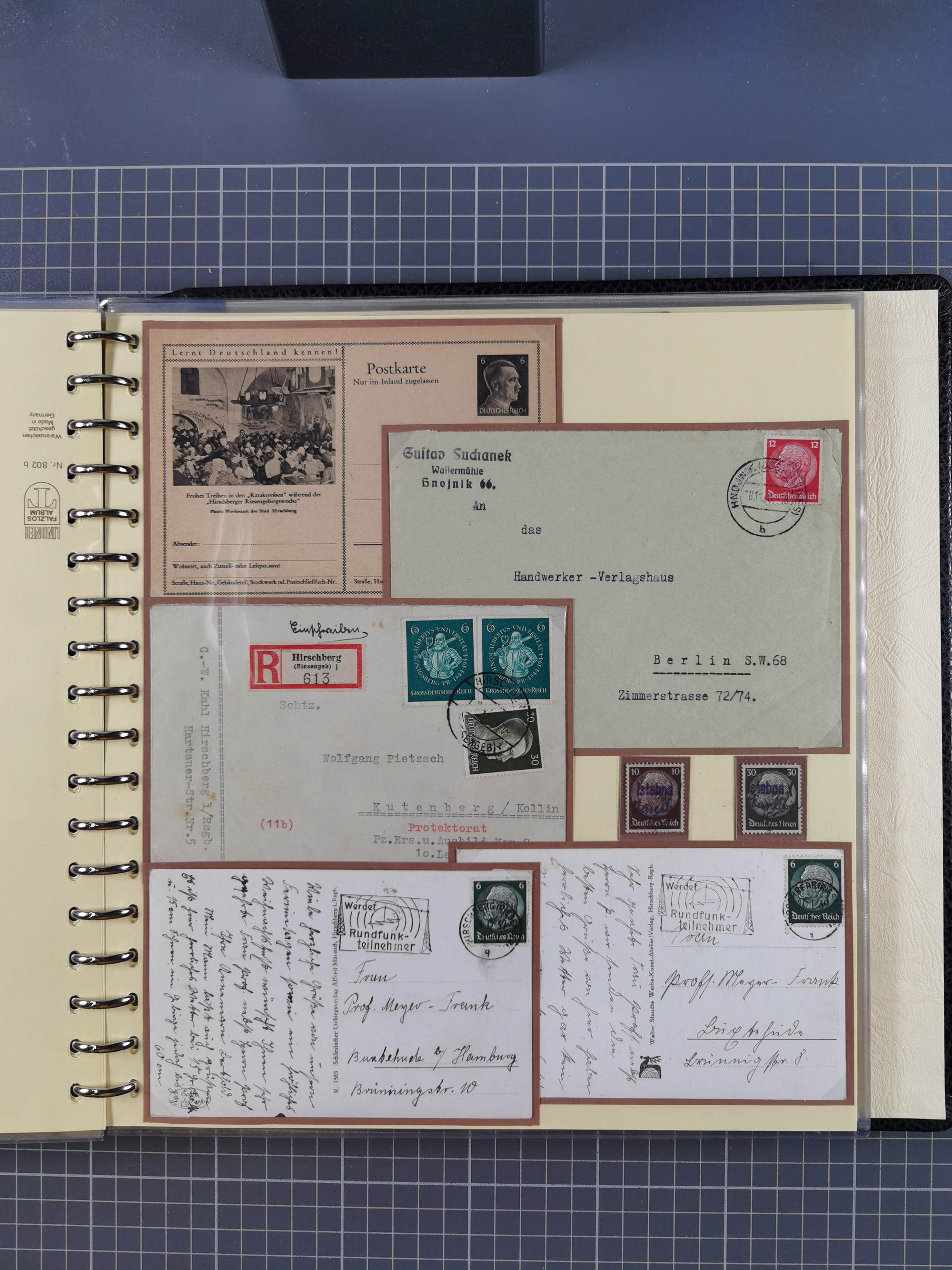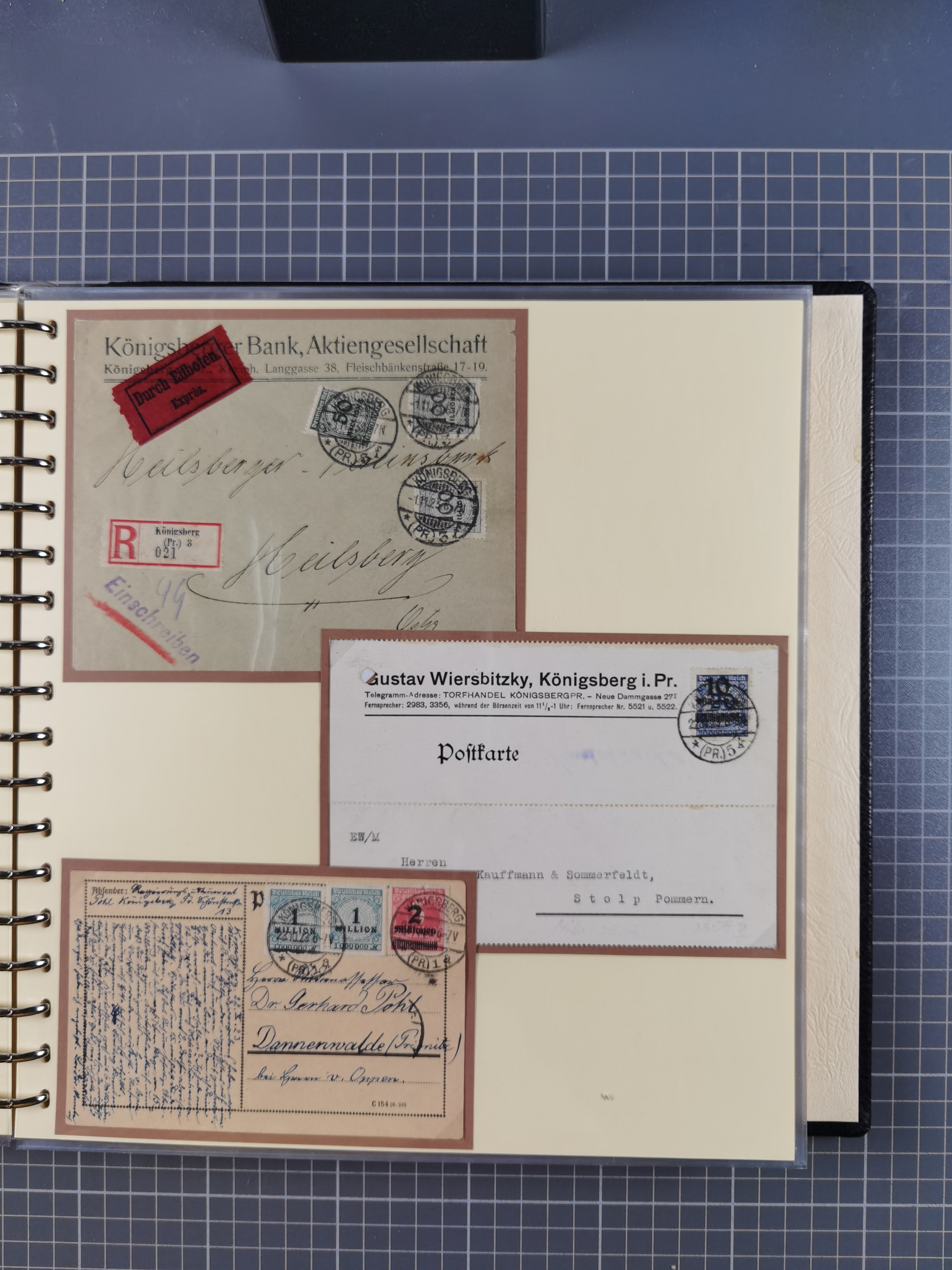1865/1950 (ca.), Album mit 122 hochwertigen Belegen, diese einzeln vom Einlieferer beschrieben und nach Michel bewertet 15.000 €. Dazu ein Karton mit über 170 Briefen, Karten und Ganzsachen, dabei etliche interessante Belege, meist gute Erhaltung