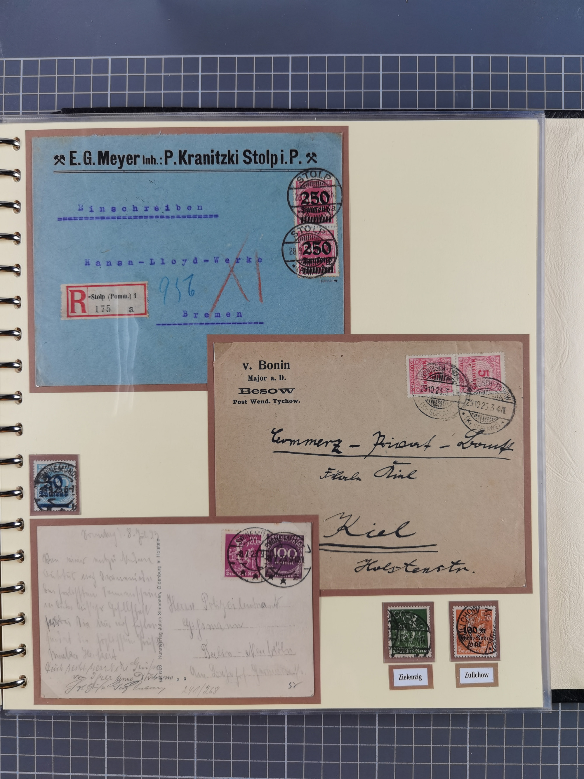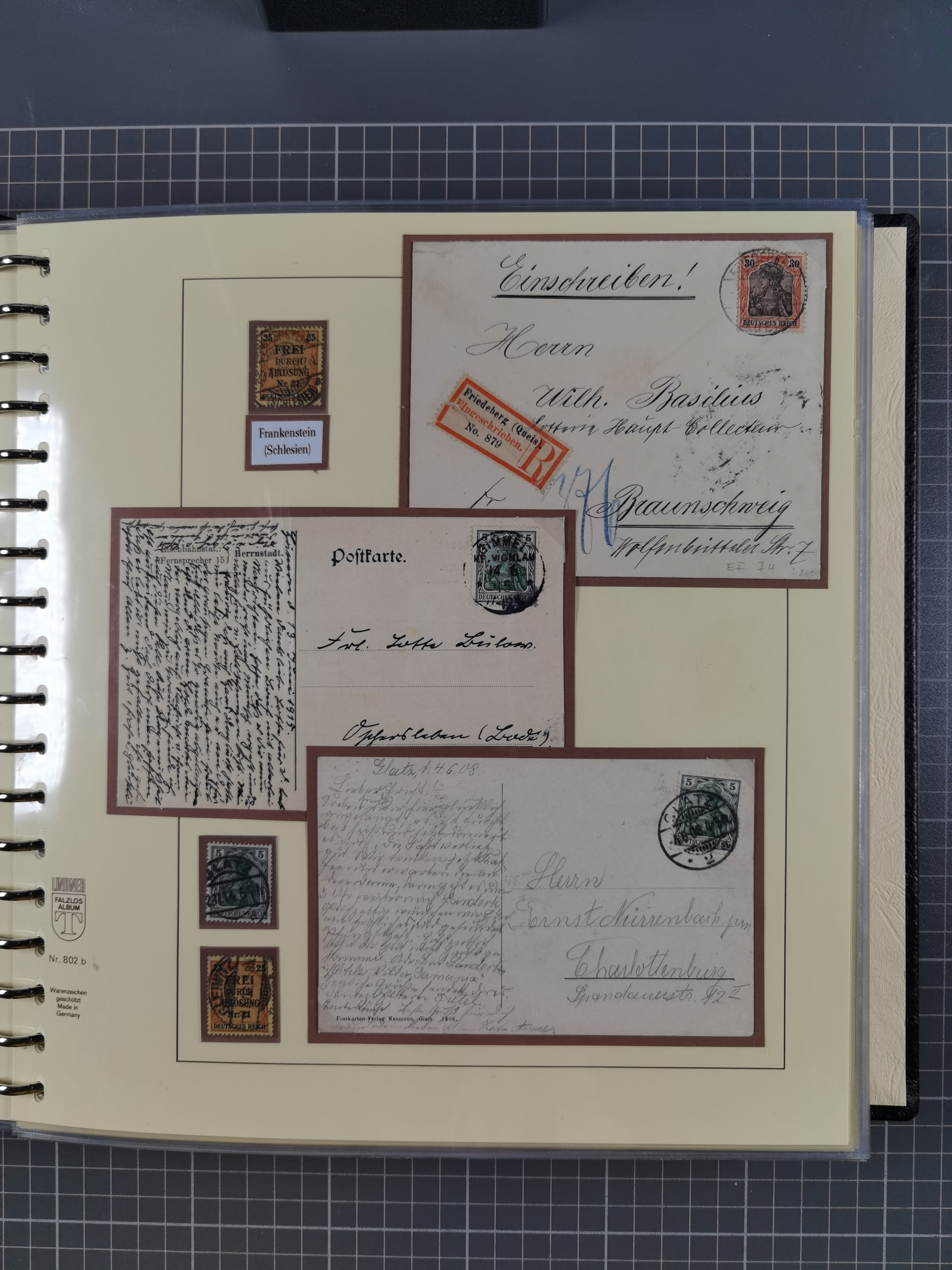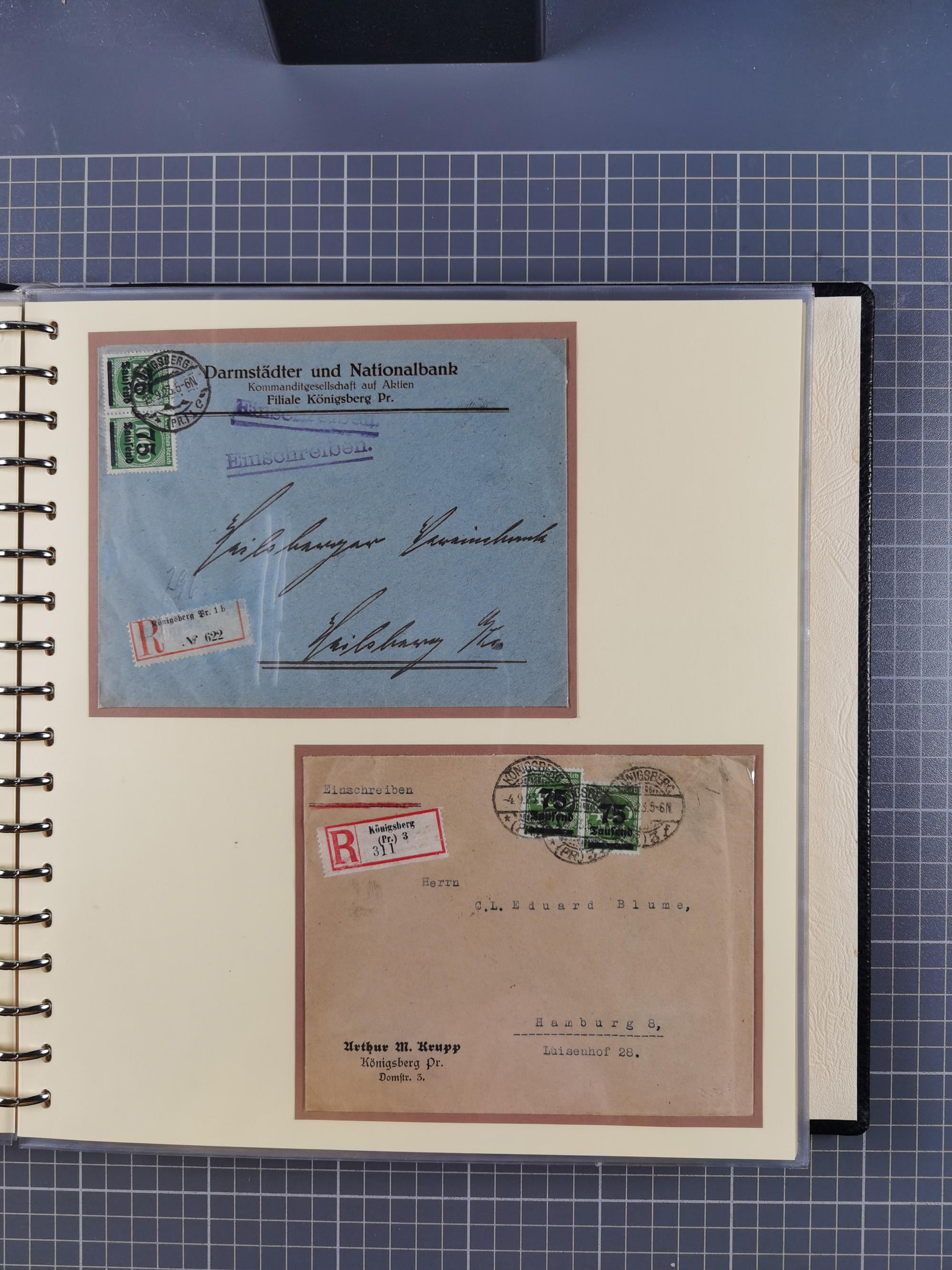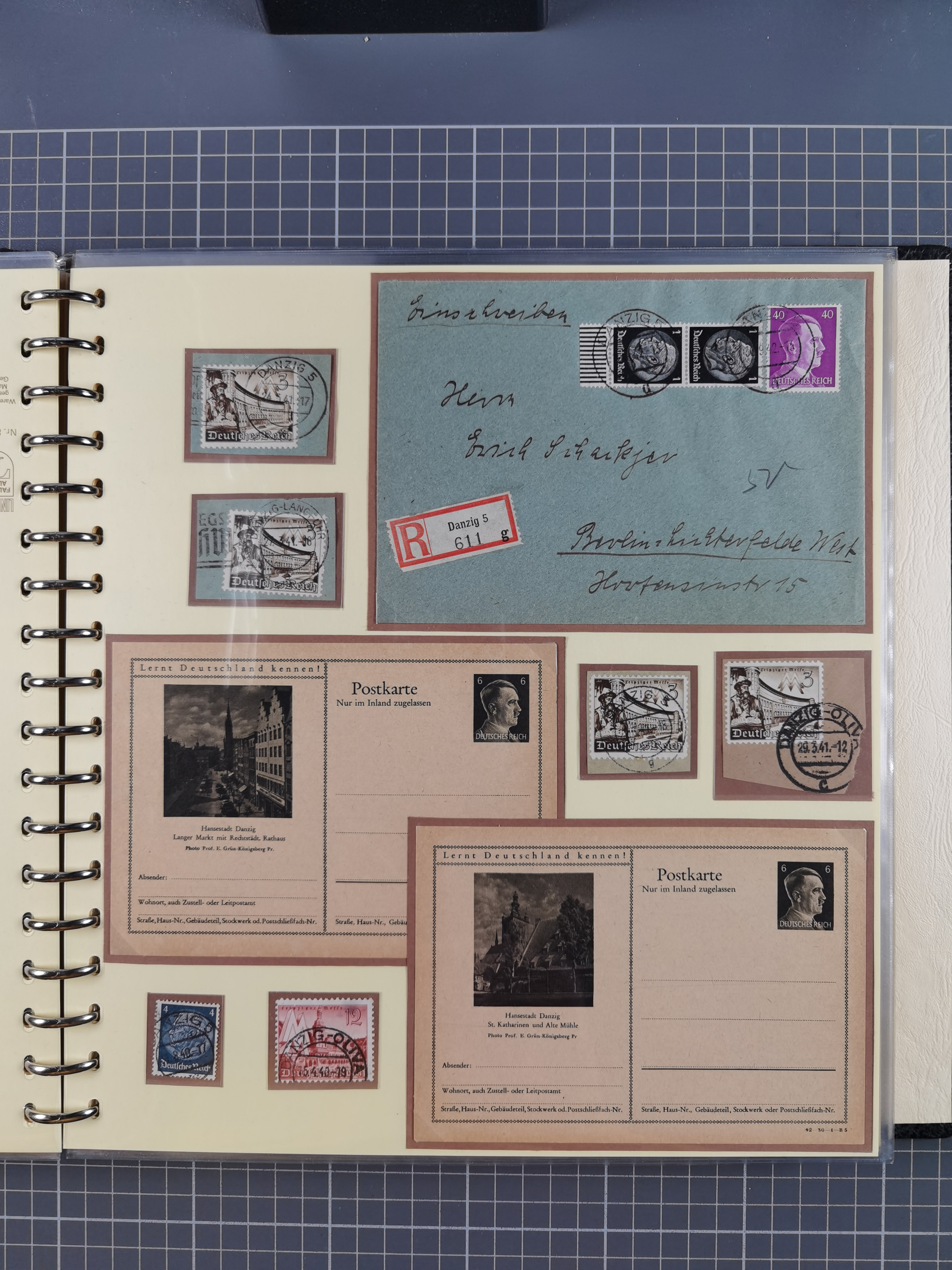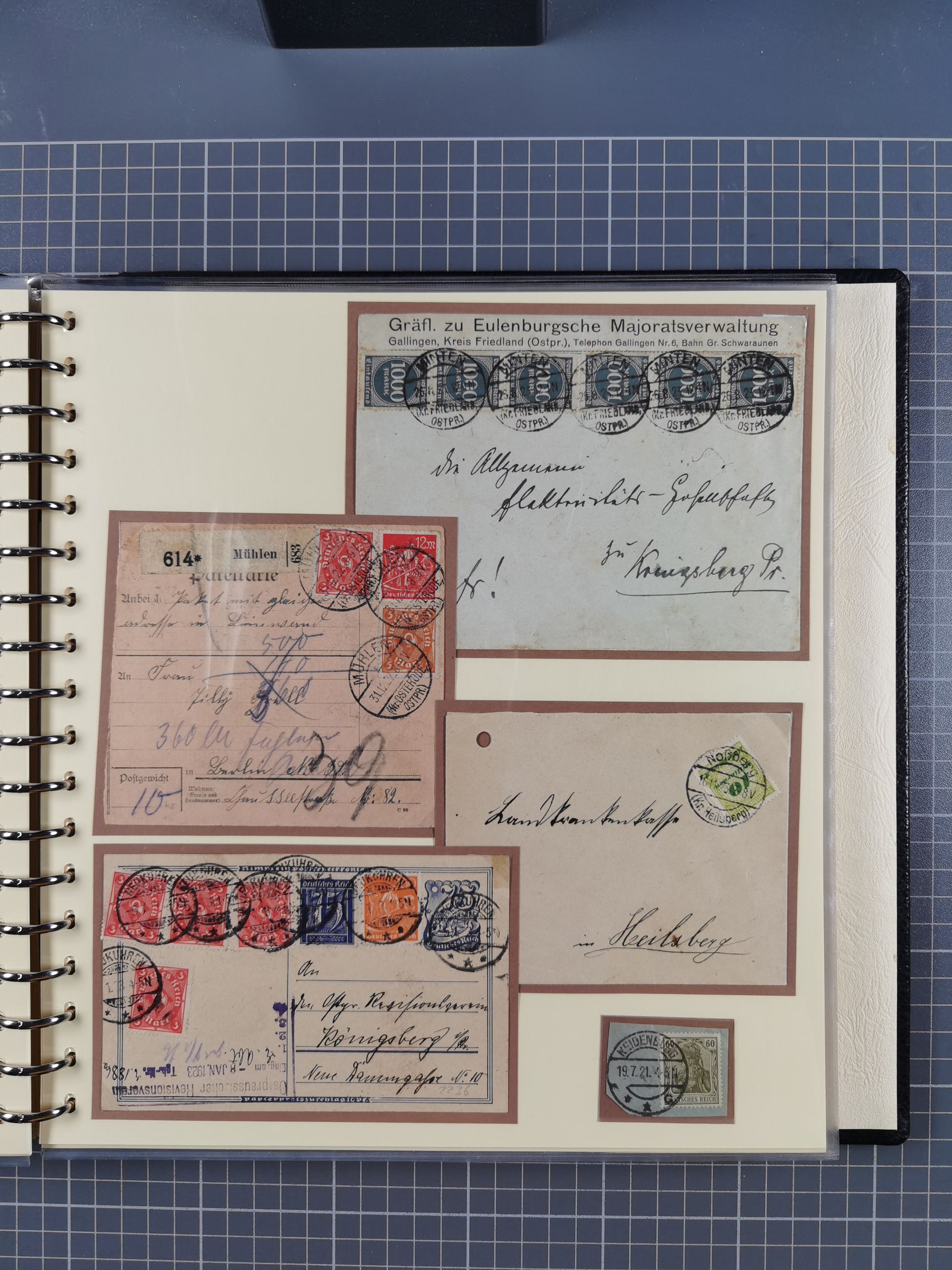 1865/1950 (ca.), Album mit 122 hochwertigen Belegen, diese einzeln vom Einlieferer beschrieben und nach Michel bewertet 15.000 €. Dazu ein Karton mit über 170 Briefen, Karten und Ganzsachen, dabei etliche interessante Belege, meist gute Erhaltung
