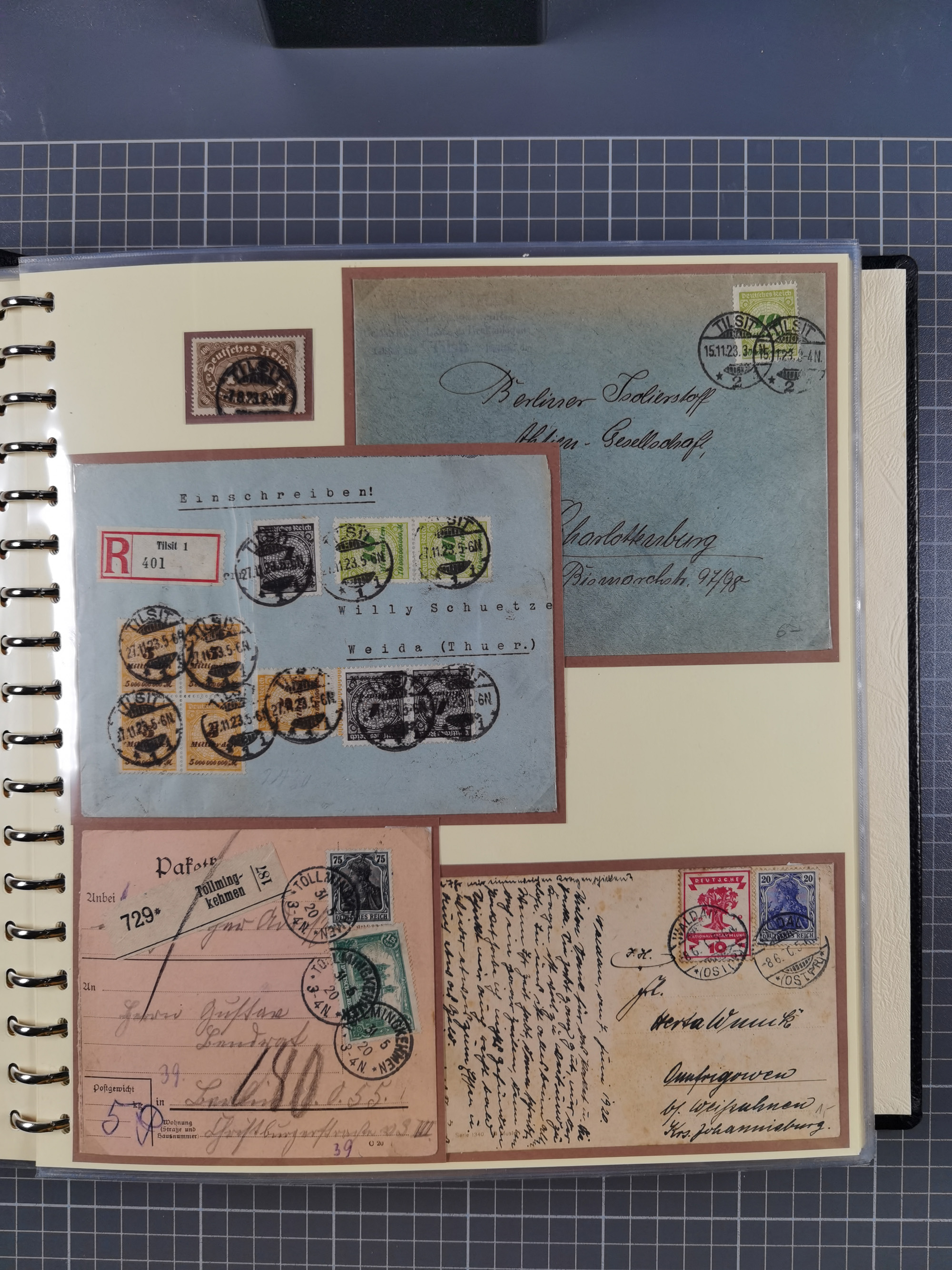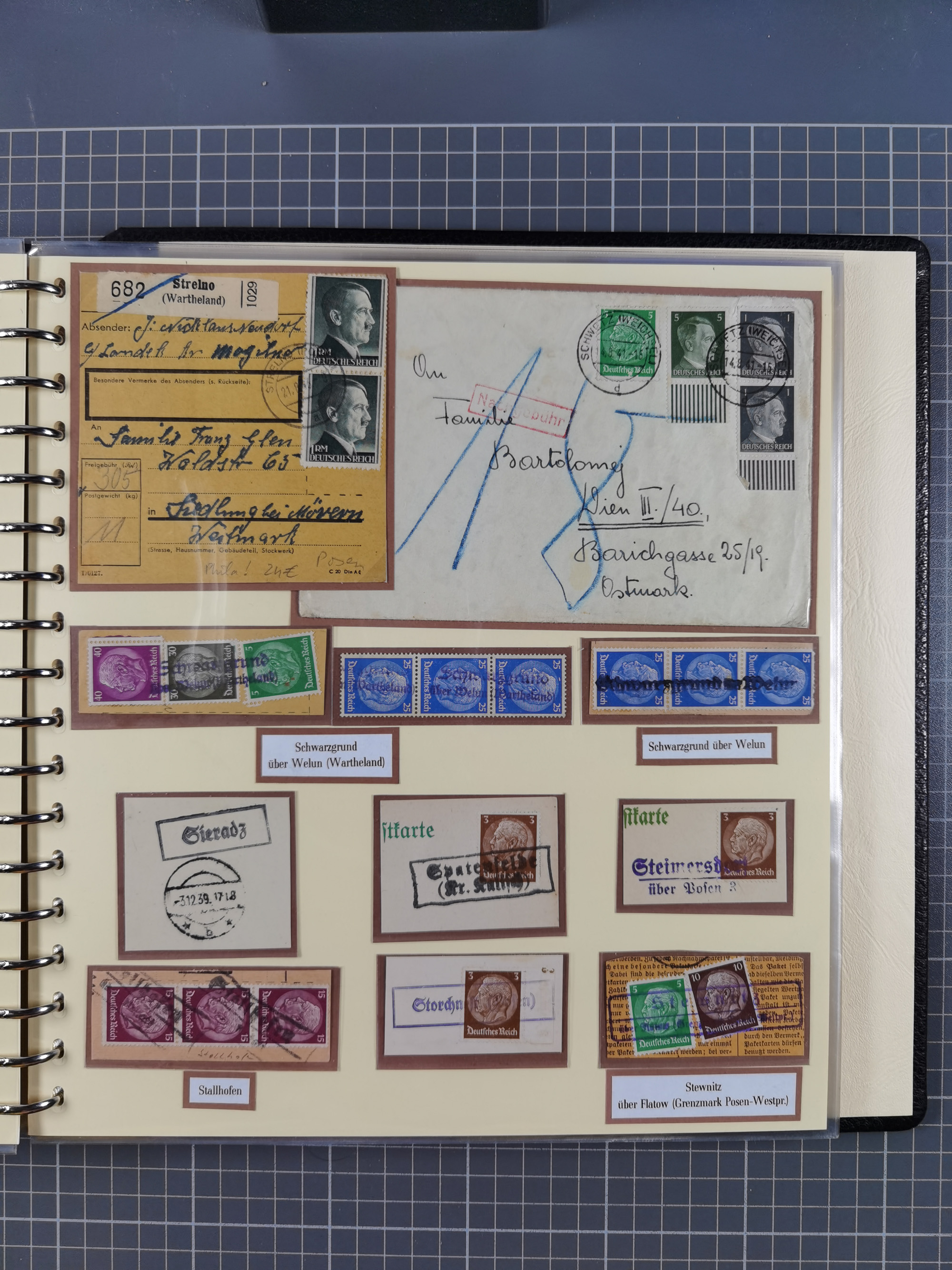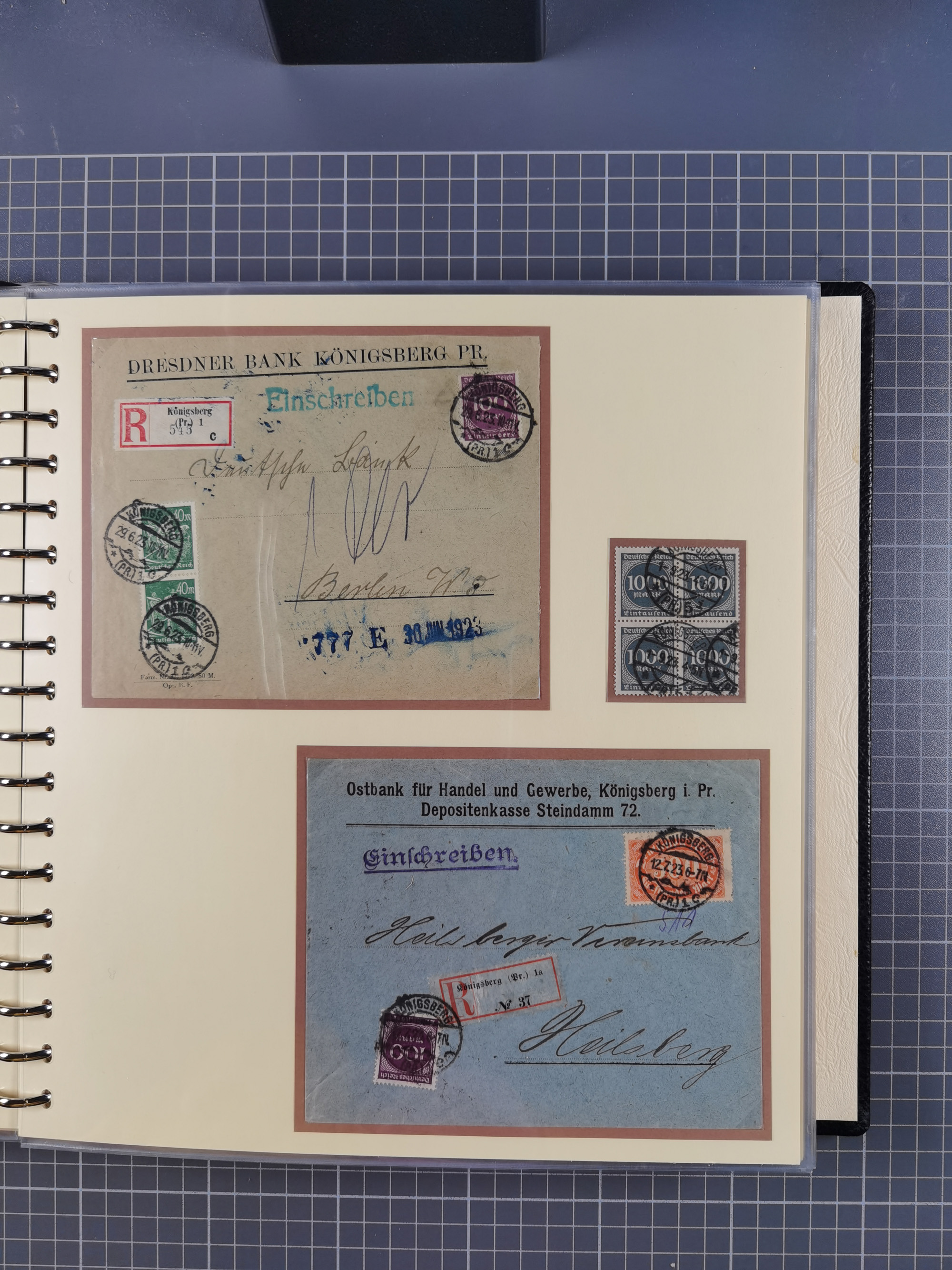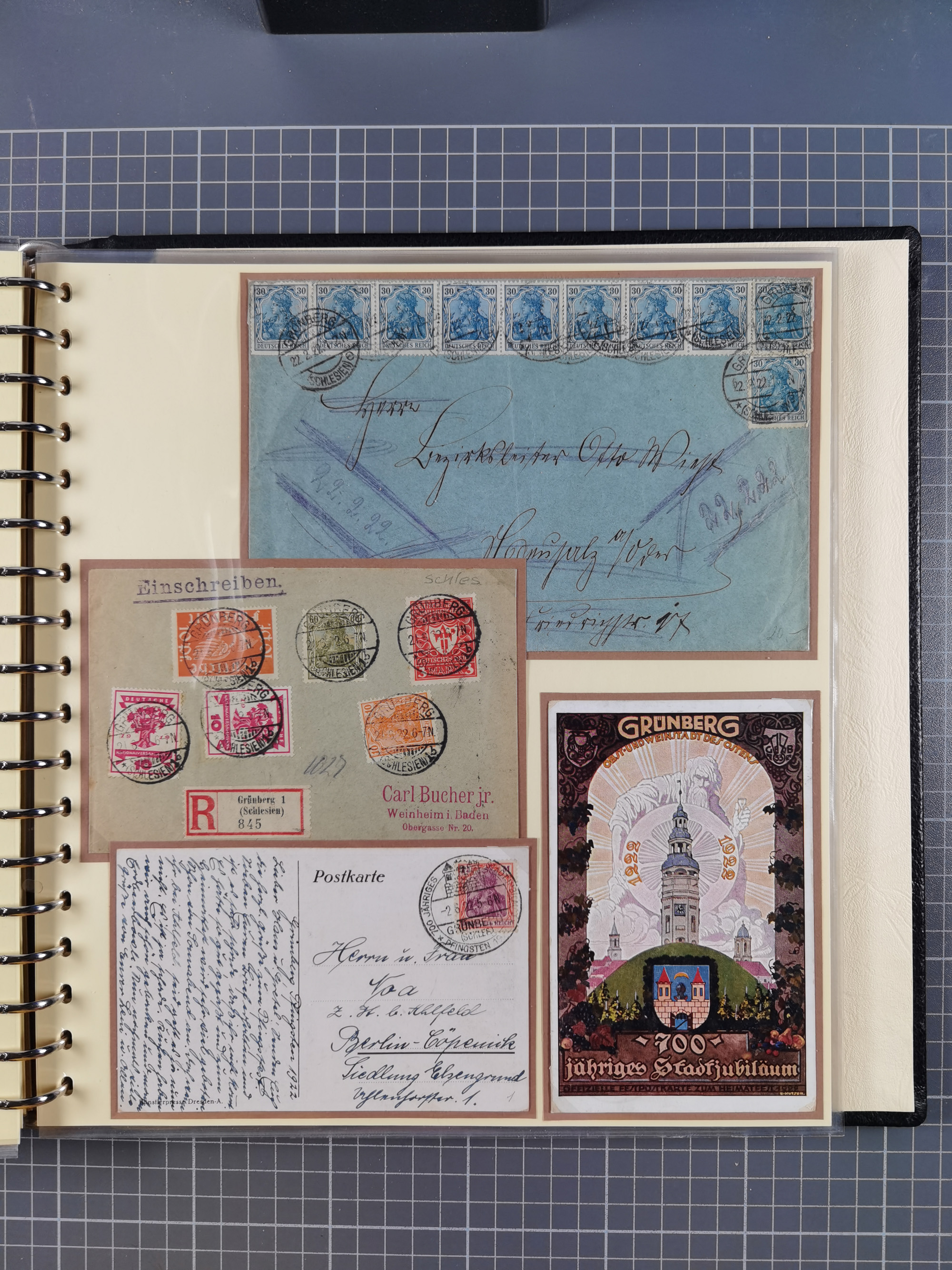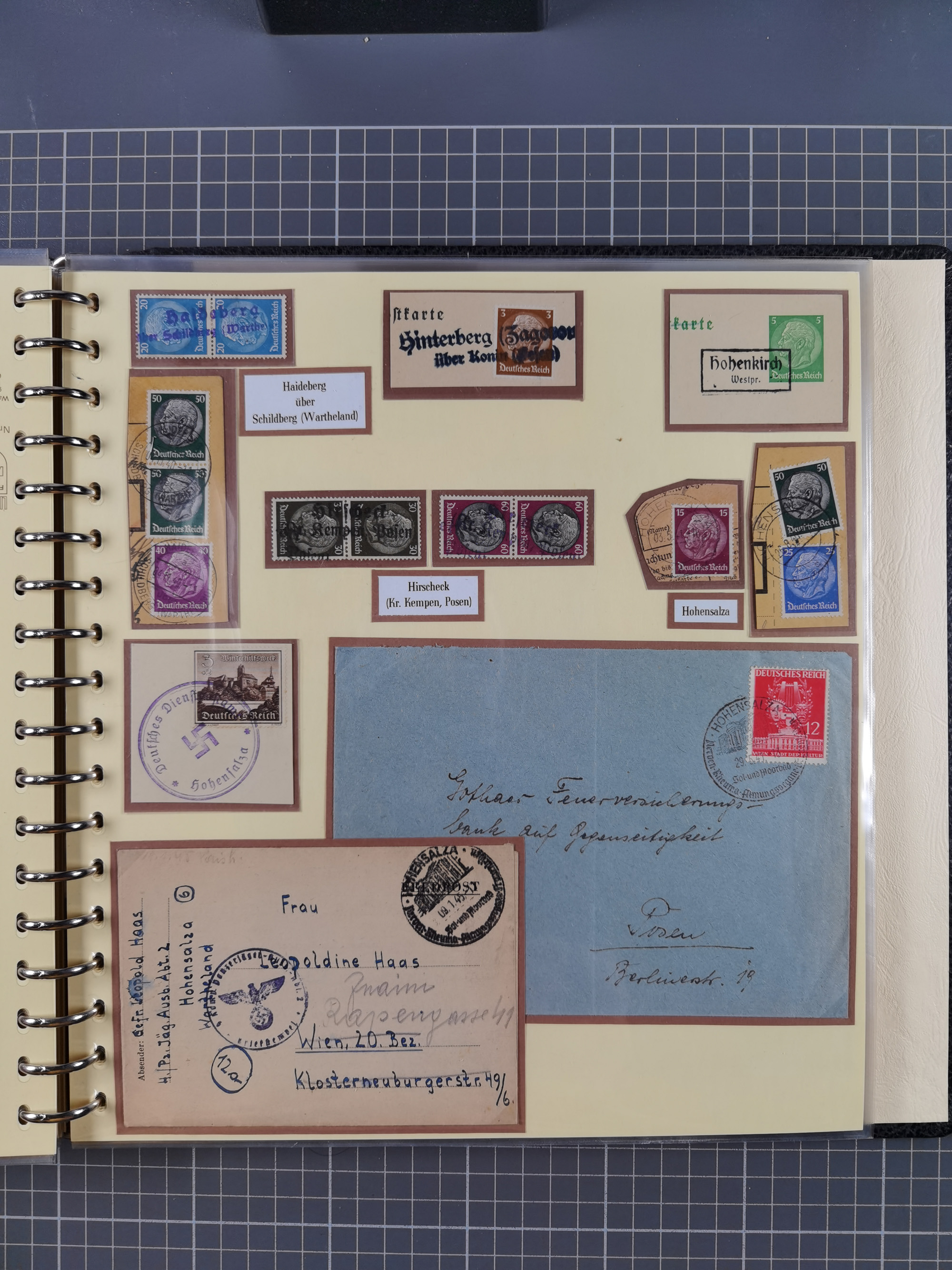1865/1950 (ca.), Album mit 122 hochwertigen Belegen, diese einzeln vom Einlieferer beschrieben und nach Michel bewertet 15.000 €. Dazu ein Karton mit über 170 Briefen, Karten und Ganzsachen, dabei etliche interessante Belege, meist gute Erhaltung