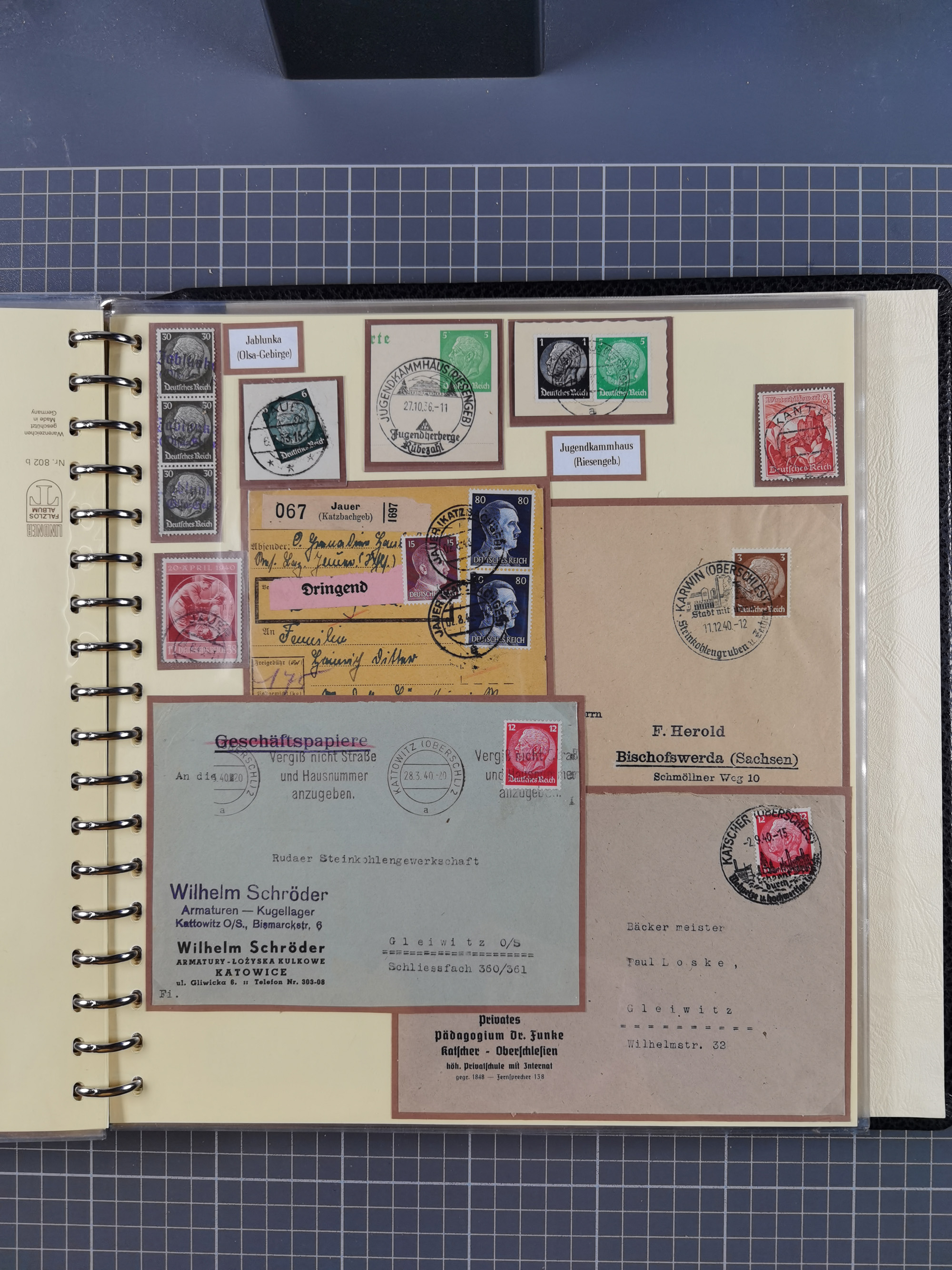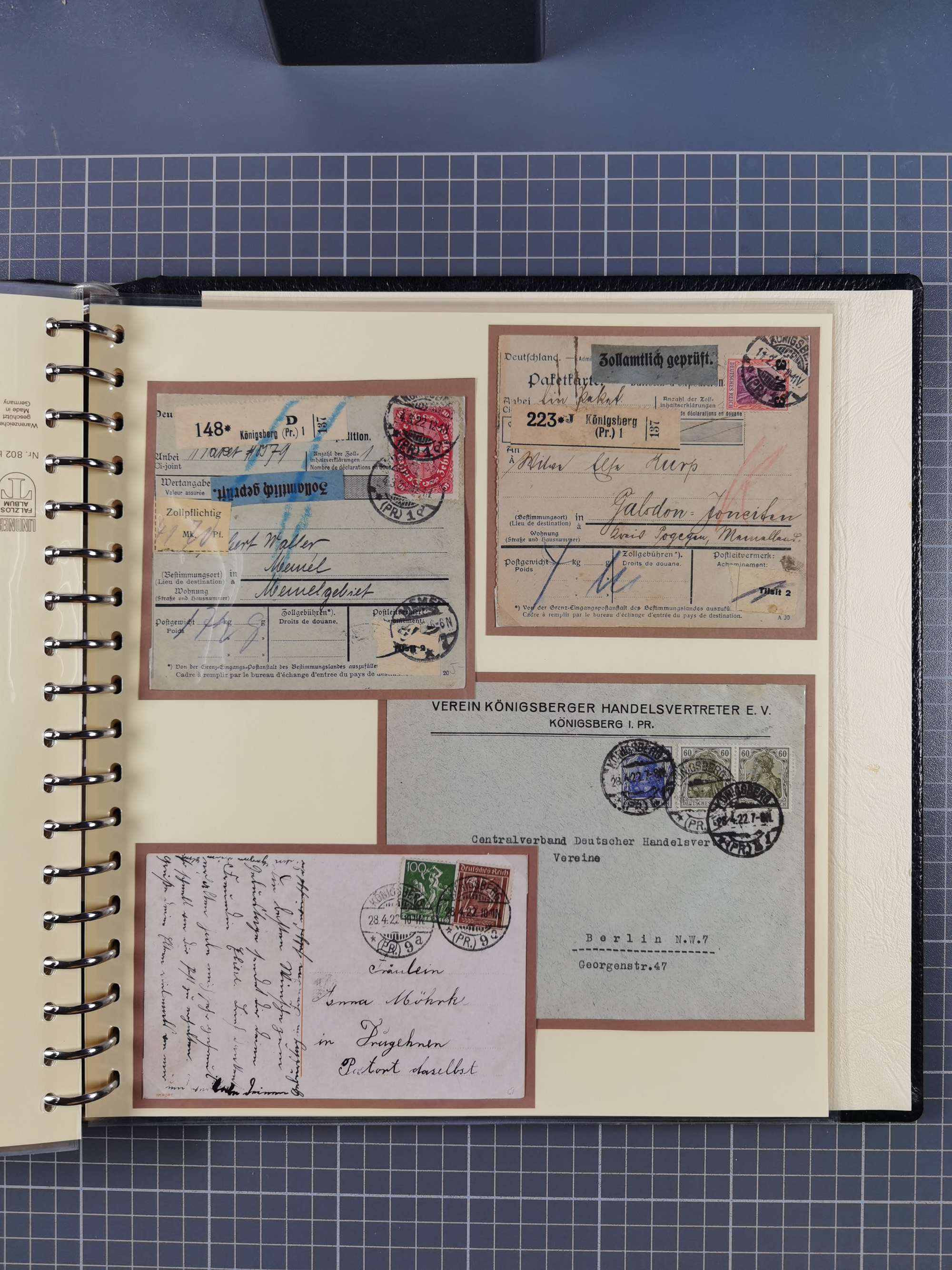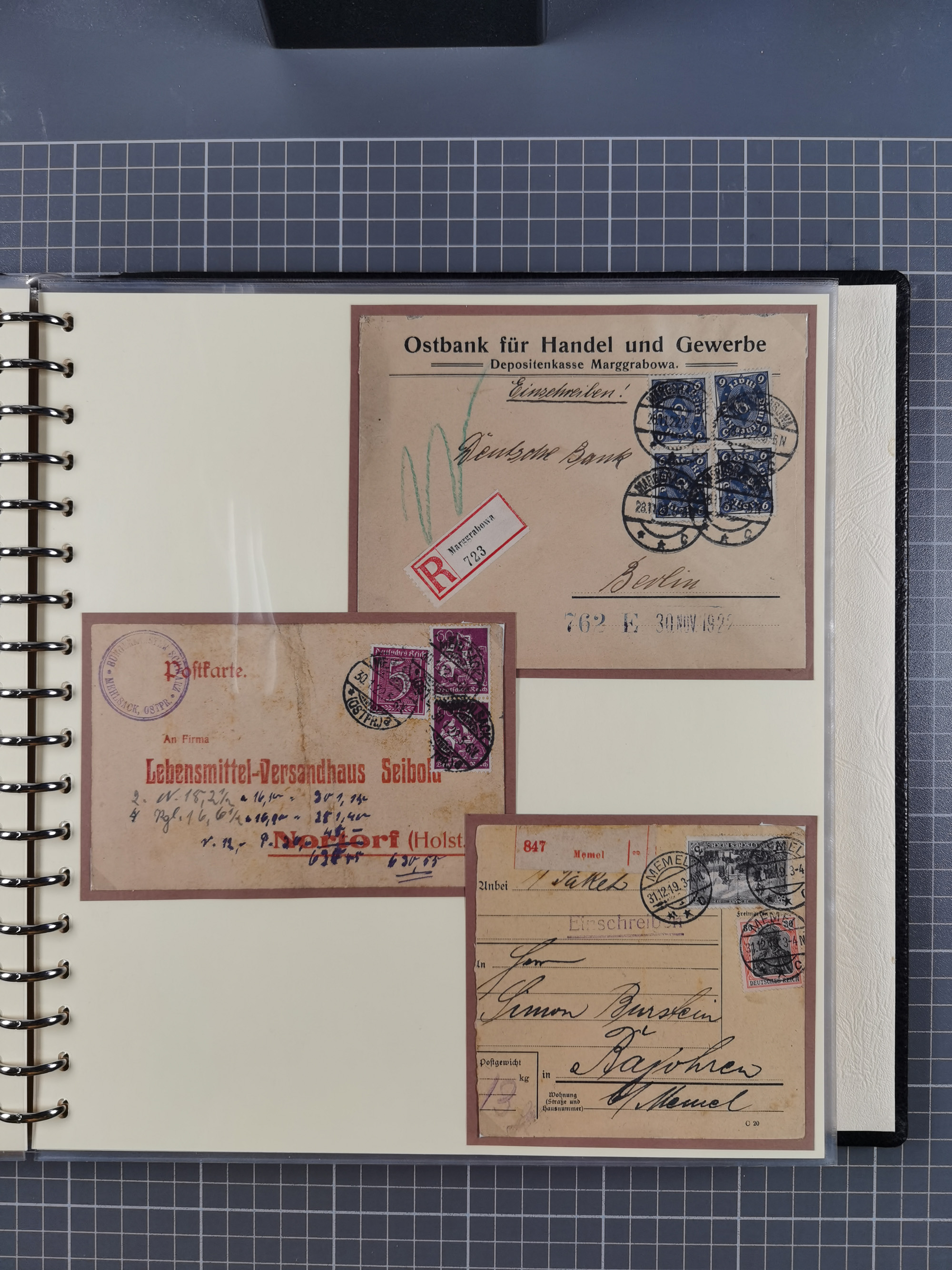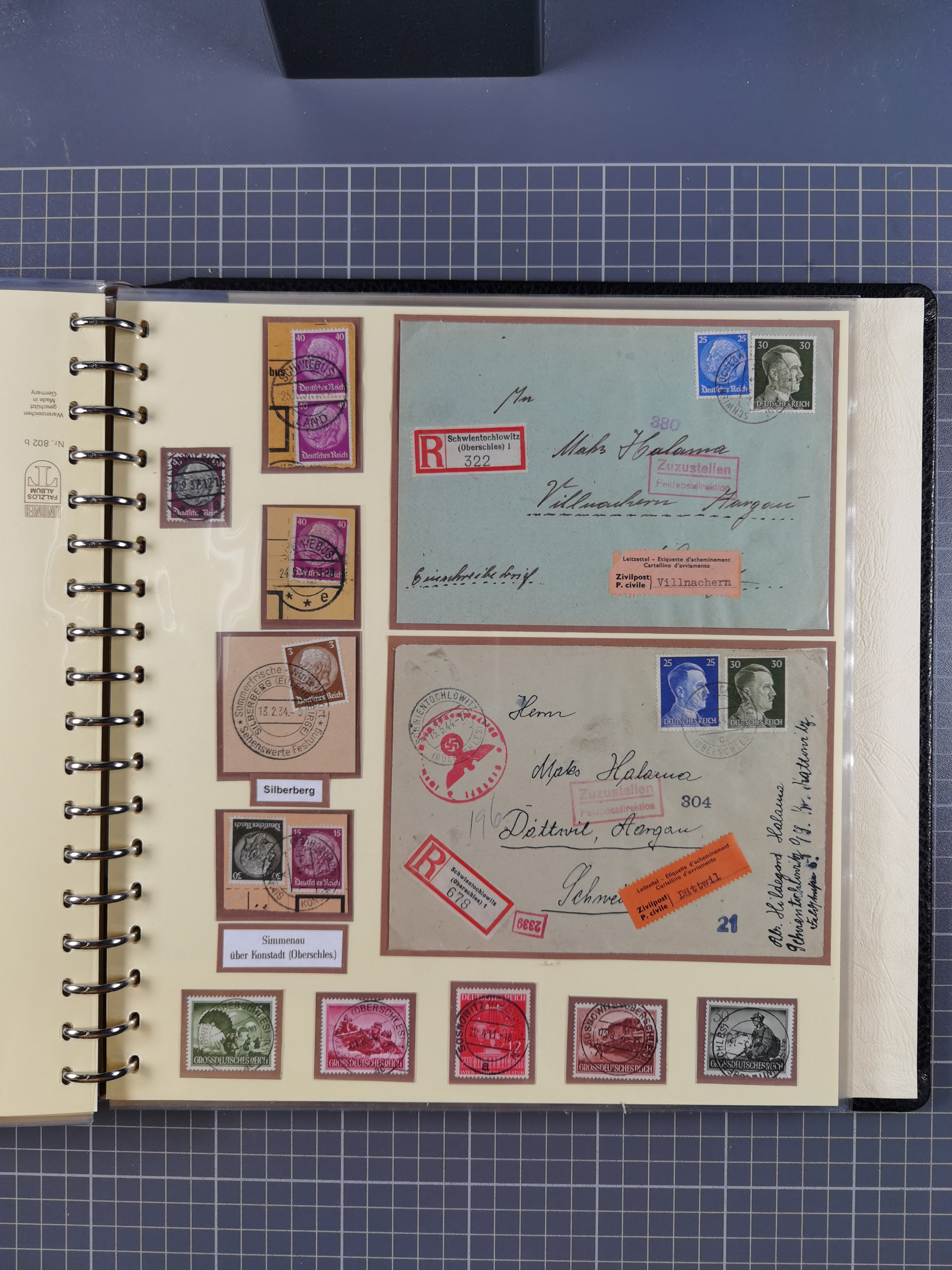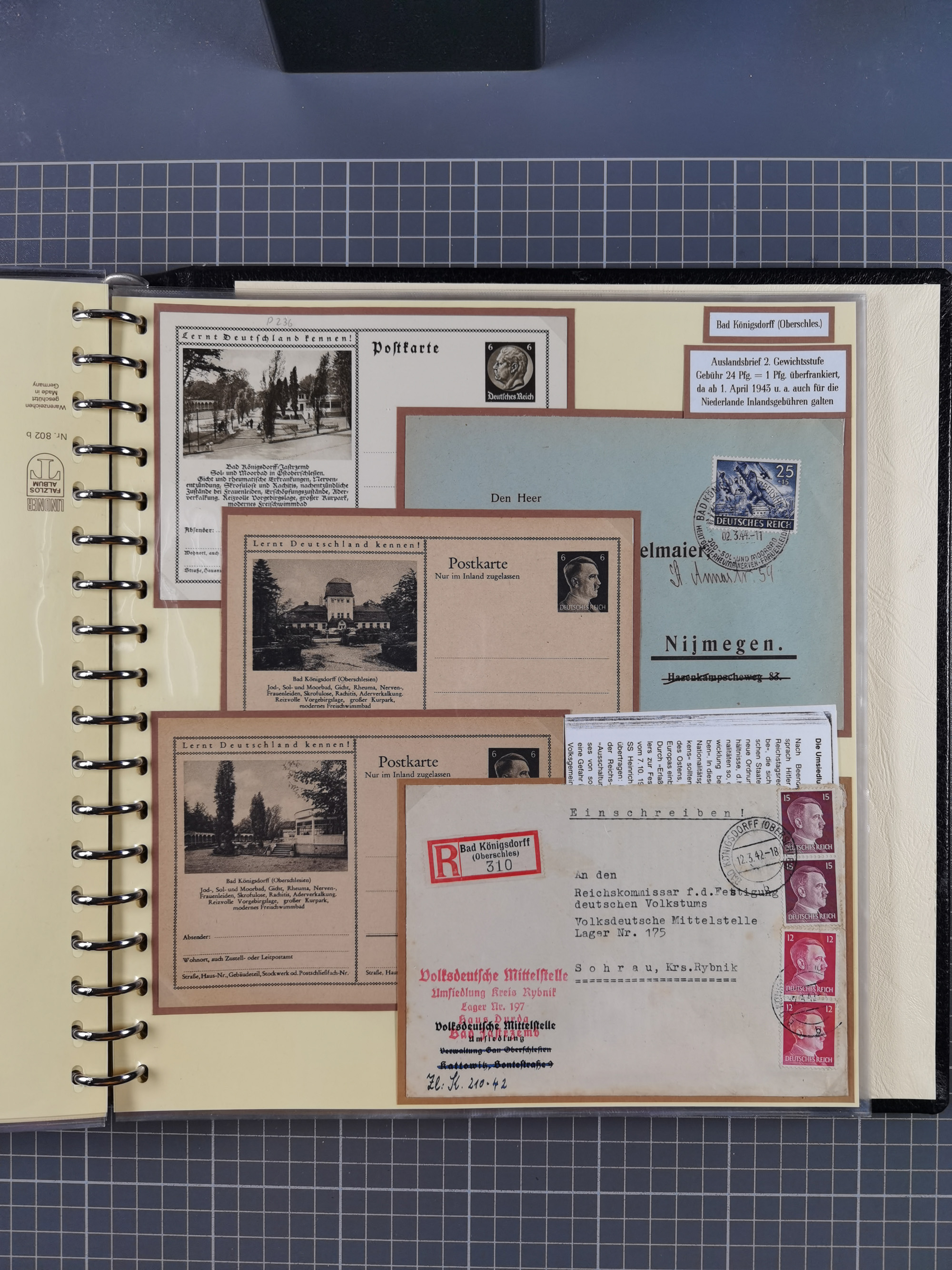 1865/1950 (ca.), Album mit 122 hochwertigen Belegen, diese einzeln vom Einlieferer beschrieben und nach Michel bewertet 15.000 €. Dazu ein Karton mit über 170 Briefen, Karten und Ganzsachen, dabei etliche interessante Belege, meist gute Erhaltung