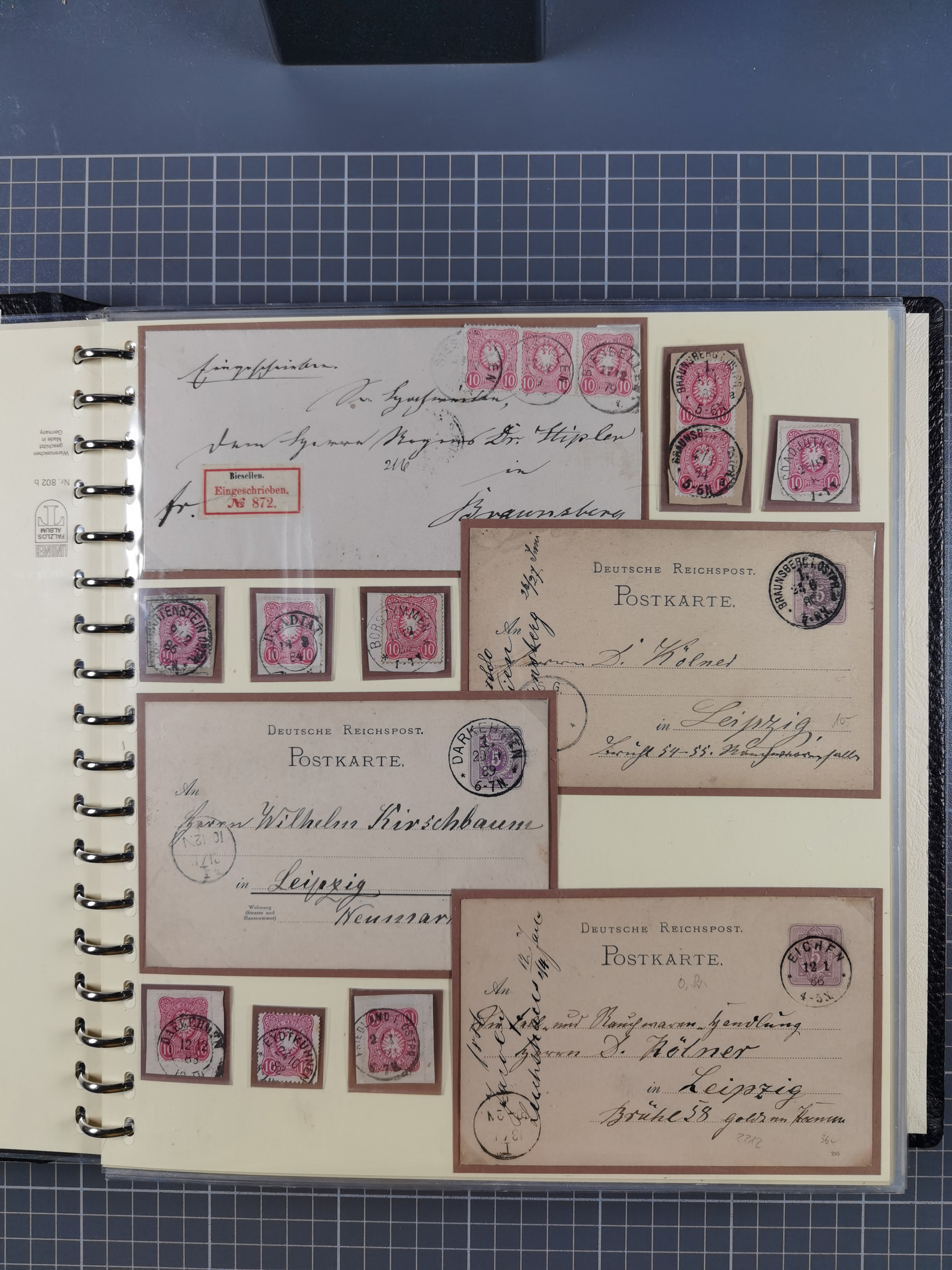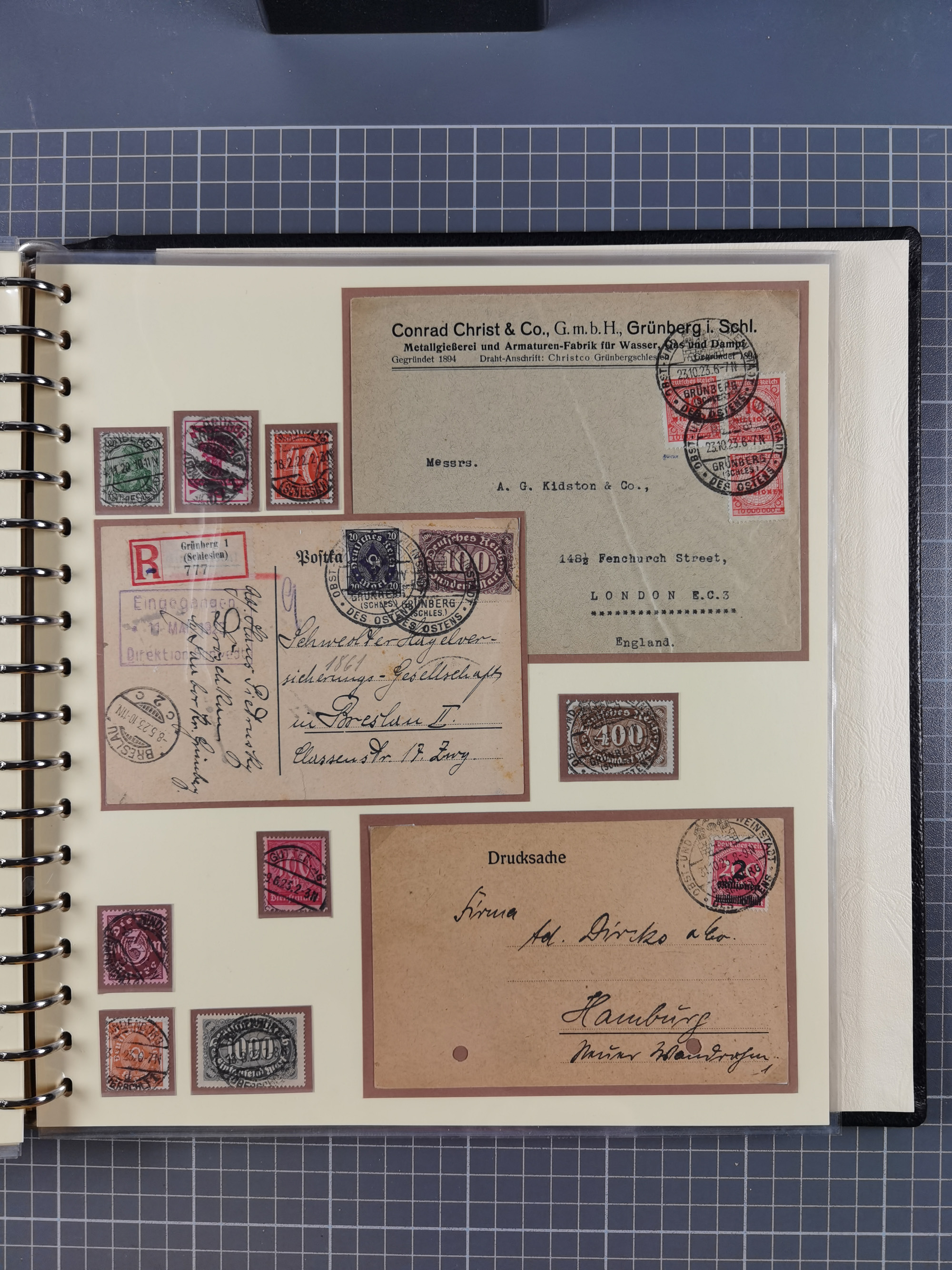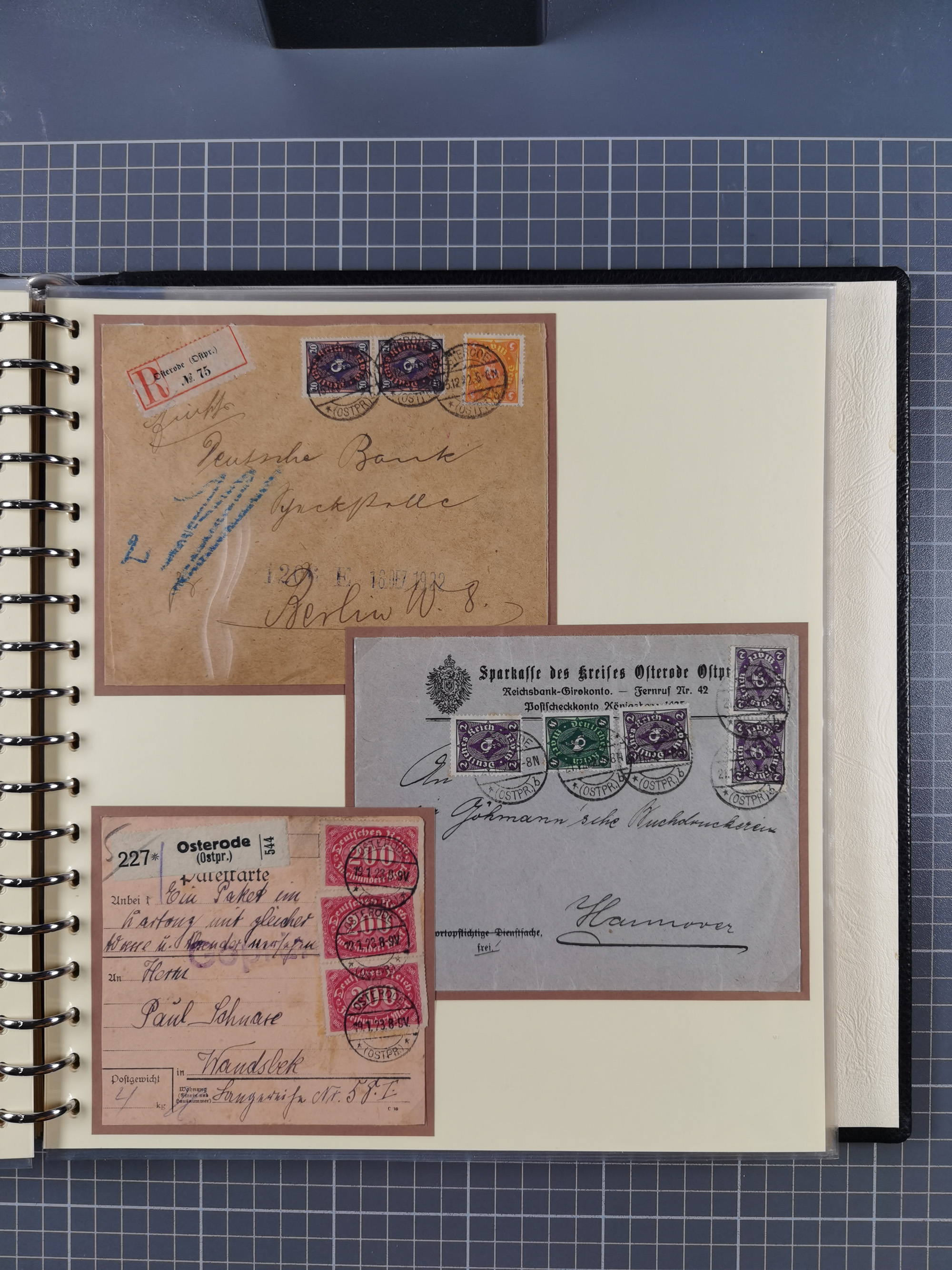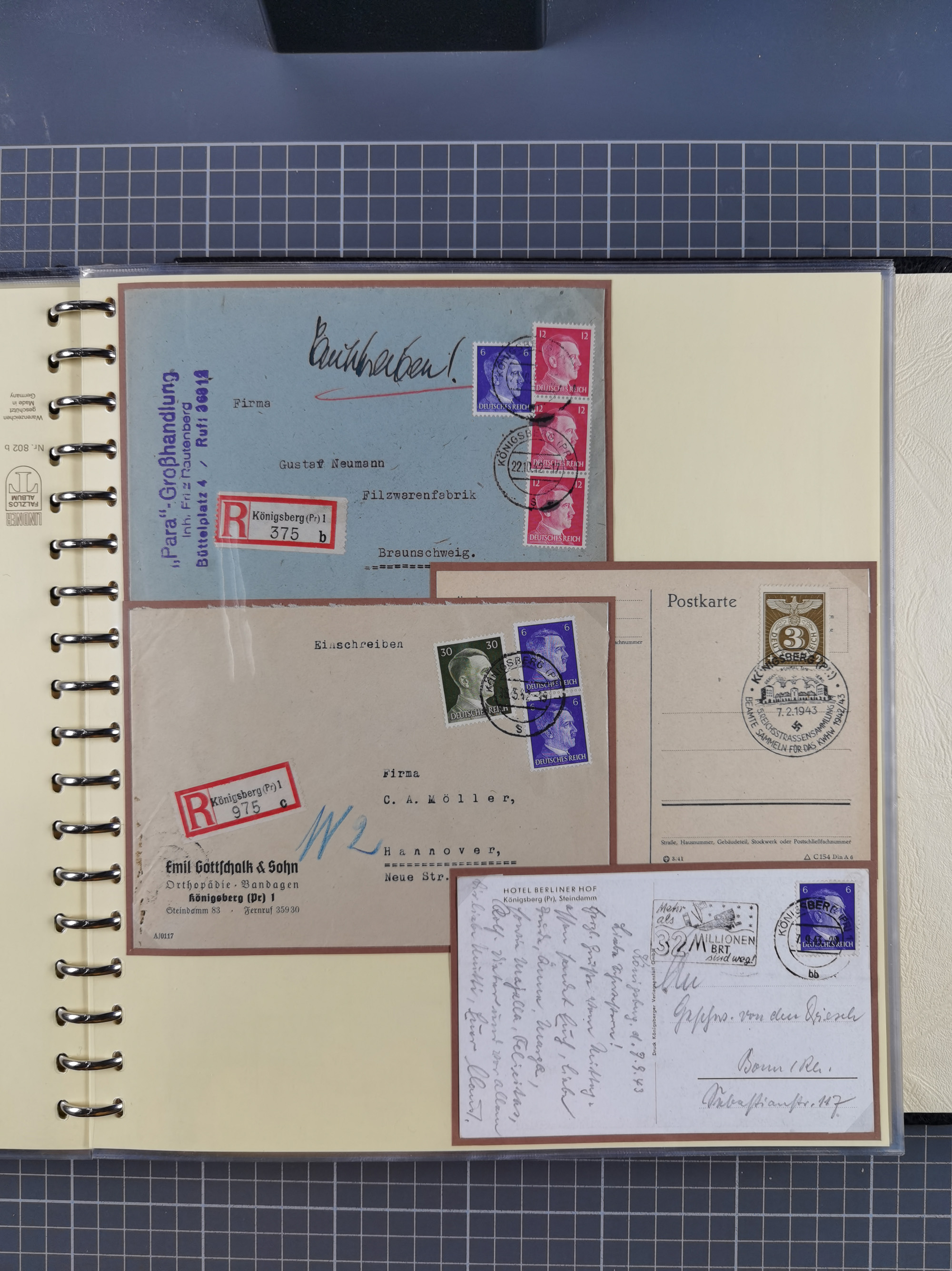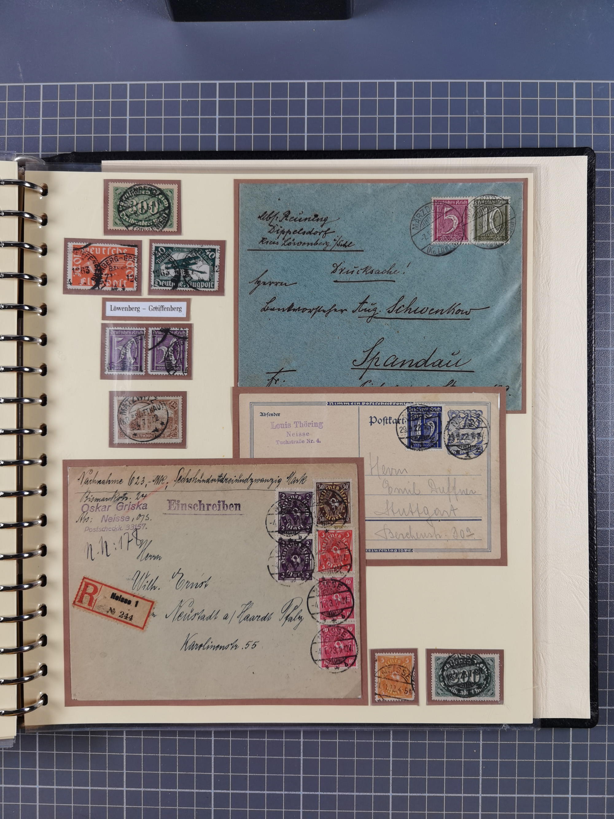 1865/1950 (ca.), Album mit 122 hochwertigen Belegen, diese einzeln vom Einlieferer beschrieben und nach Michel bewertet 15.000 €. Dazu ein Karton mit über 170 Briefen, Karten und Ganzsachen, dabei etliche interessante Belege, meist gute Erhaltung