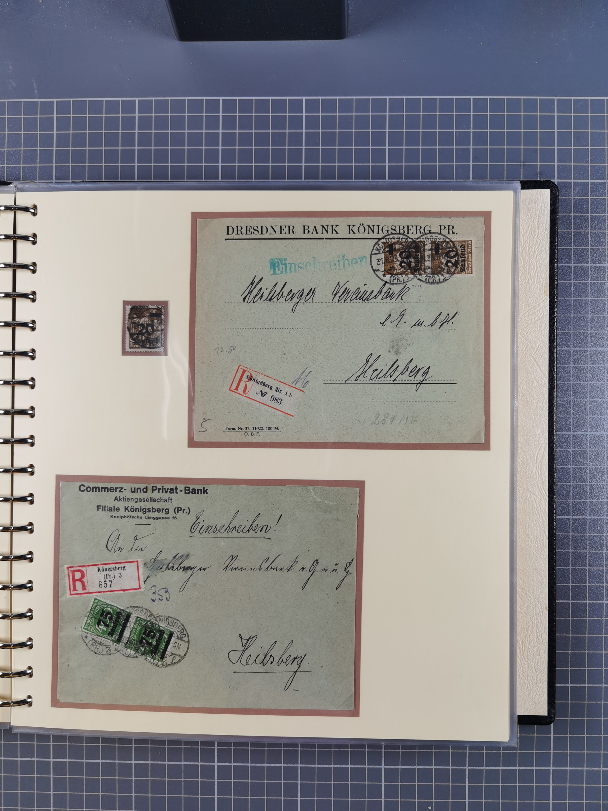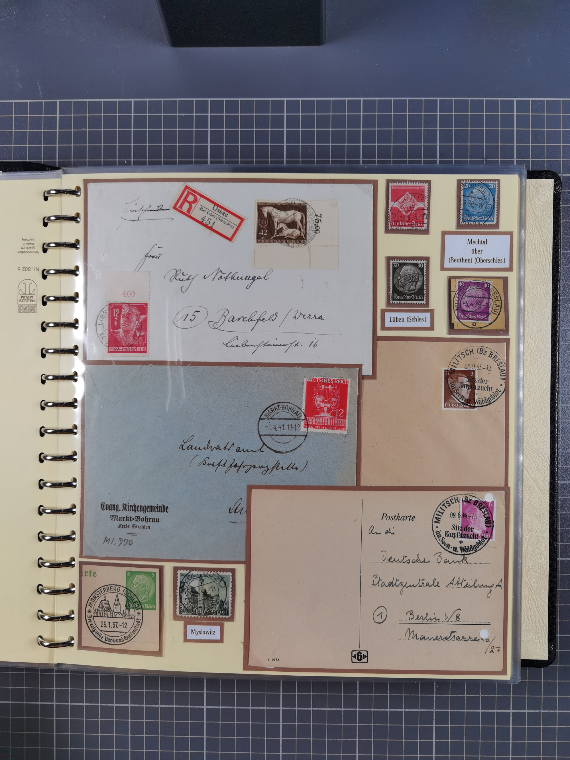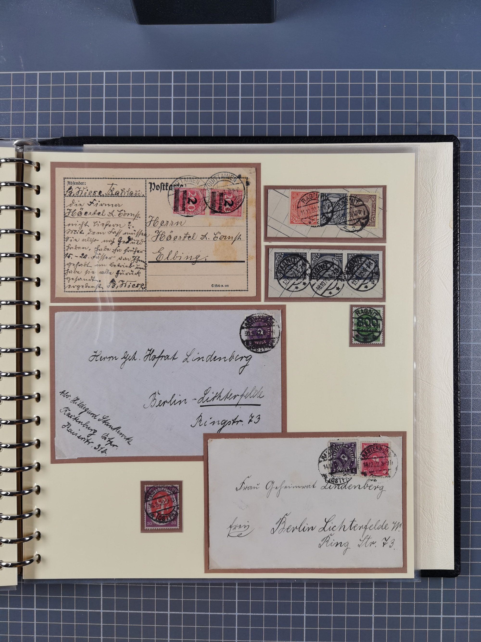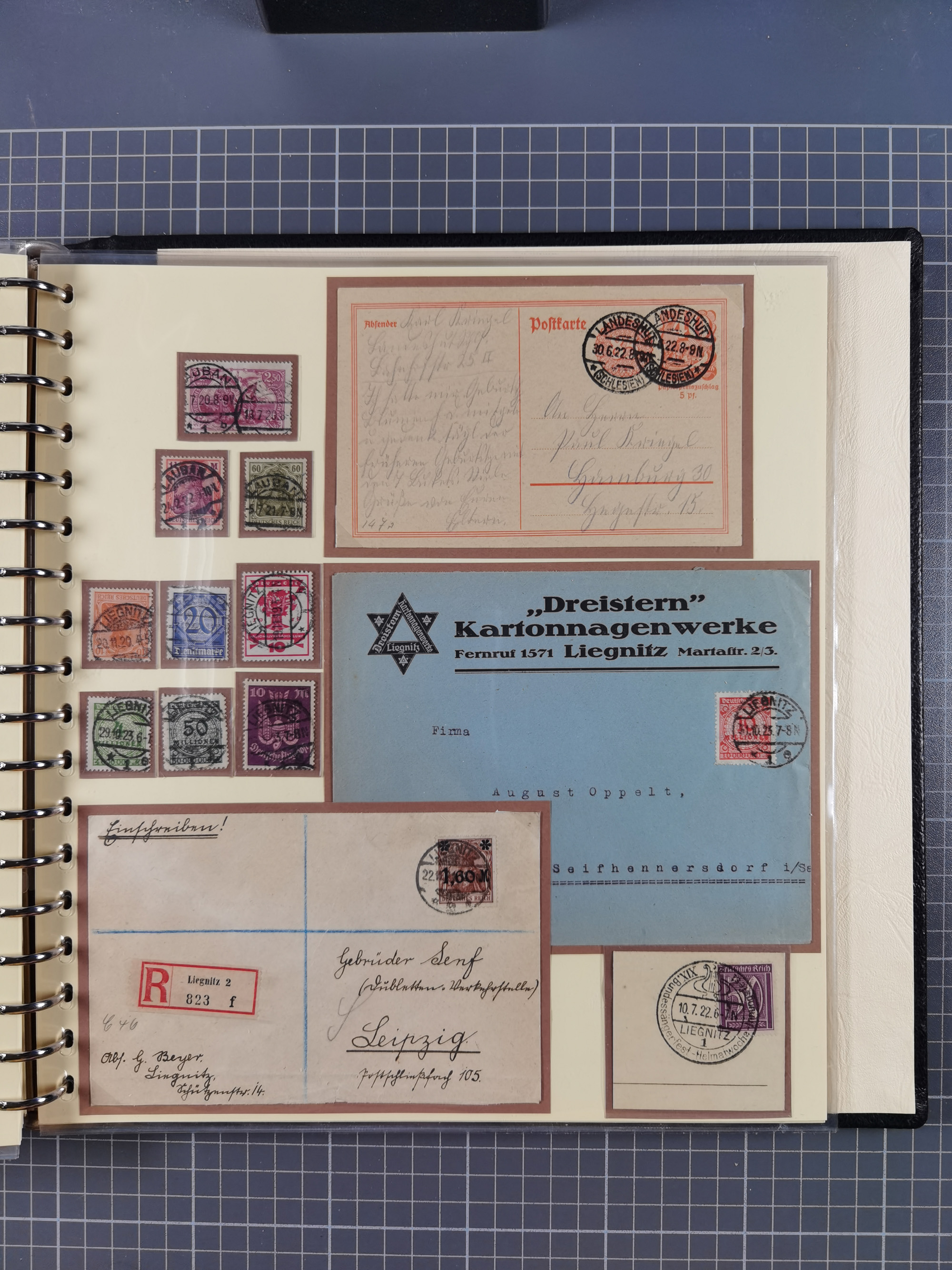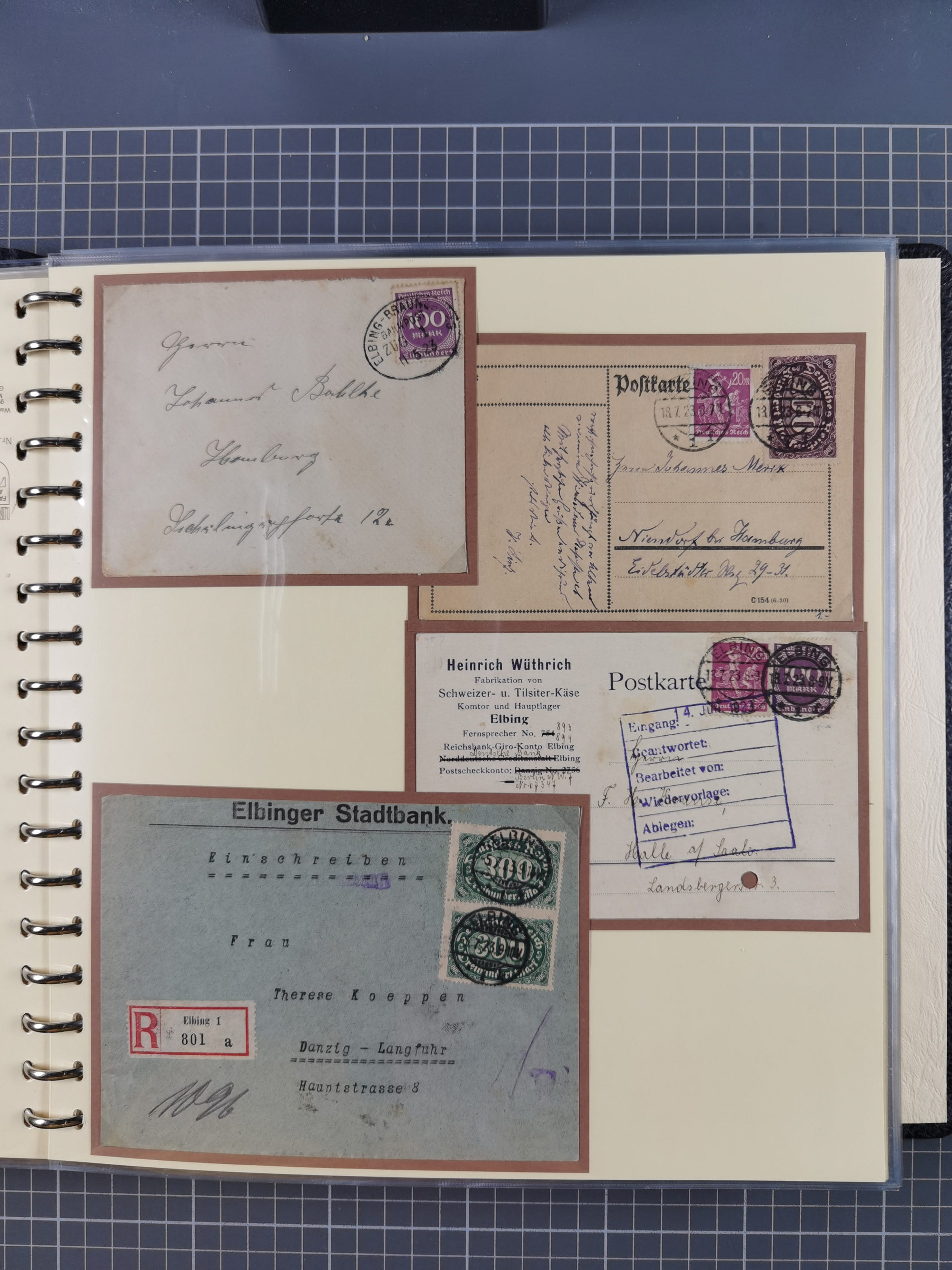 1865/1950 (ca.), Album mit 122 hochwertigen Belegen, diese einzeln vom Einlieferer beschrieben und nach Michel bewertet 15.000 €. Dazu ein Karton mit über 170 Briefen, Karten und Ganzsachen, dabei etliche interessante Belege, meist gute Erhaltung
