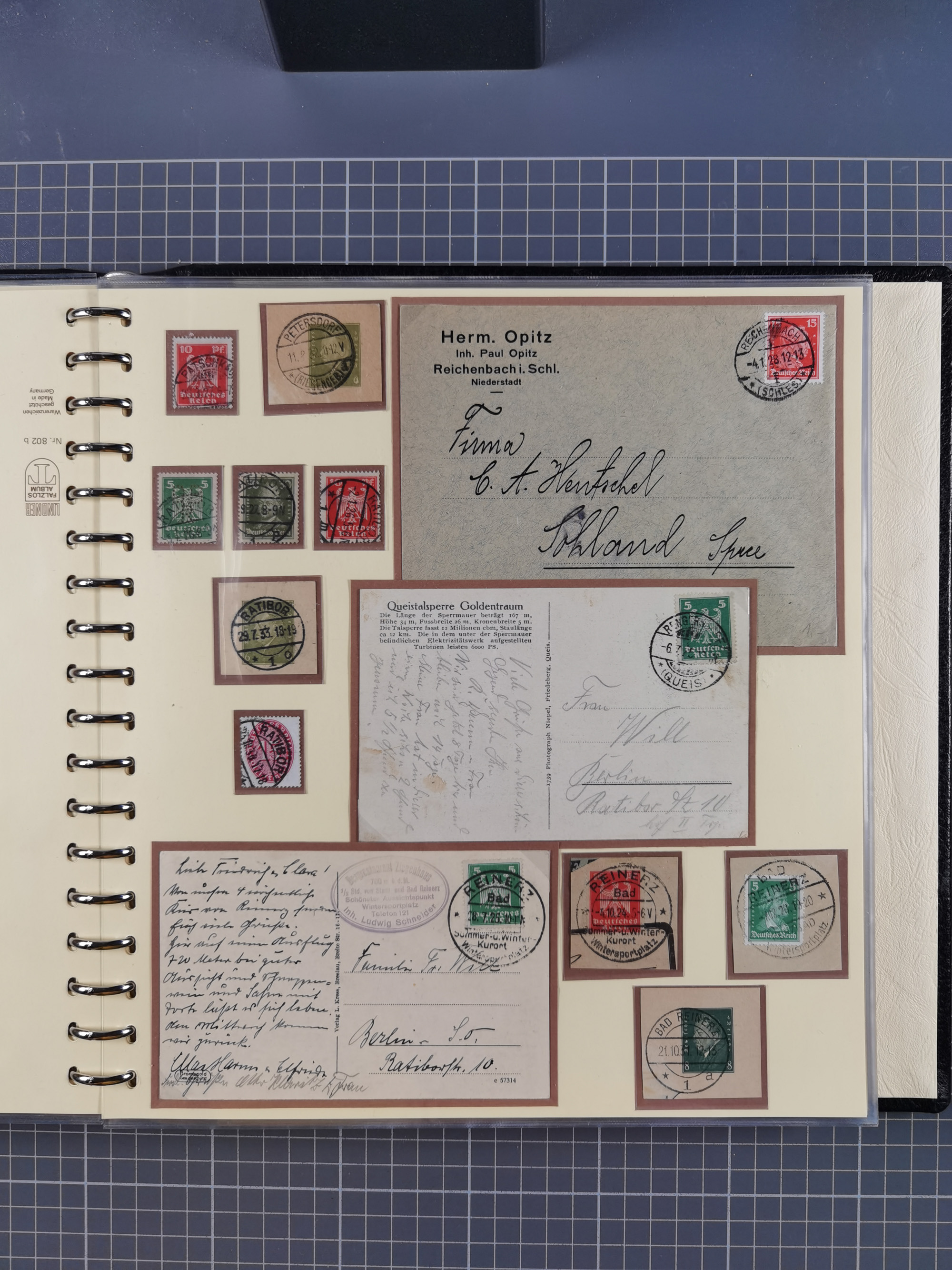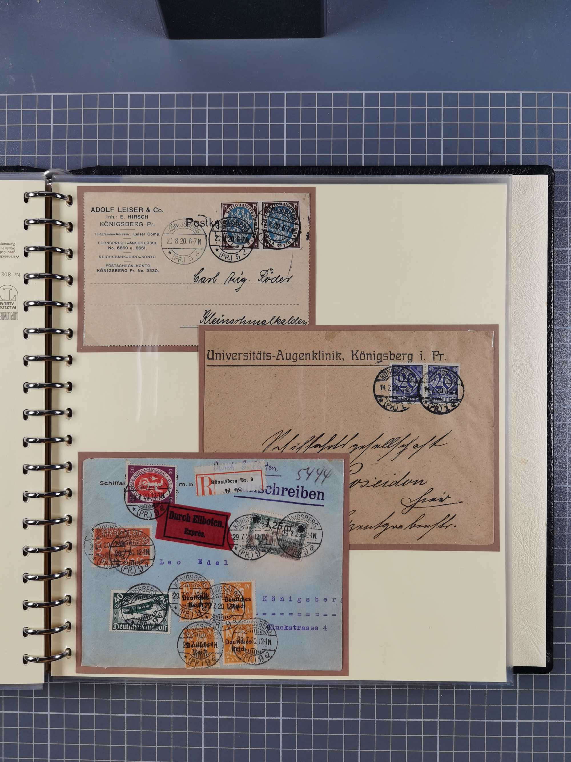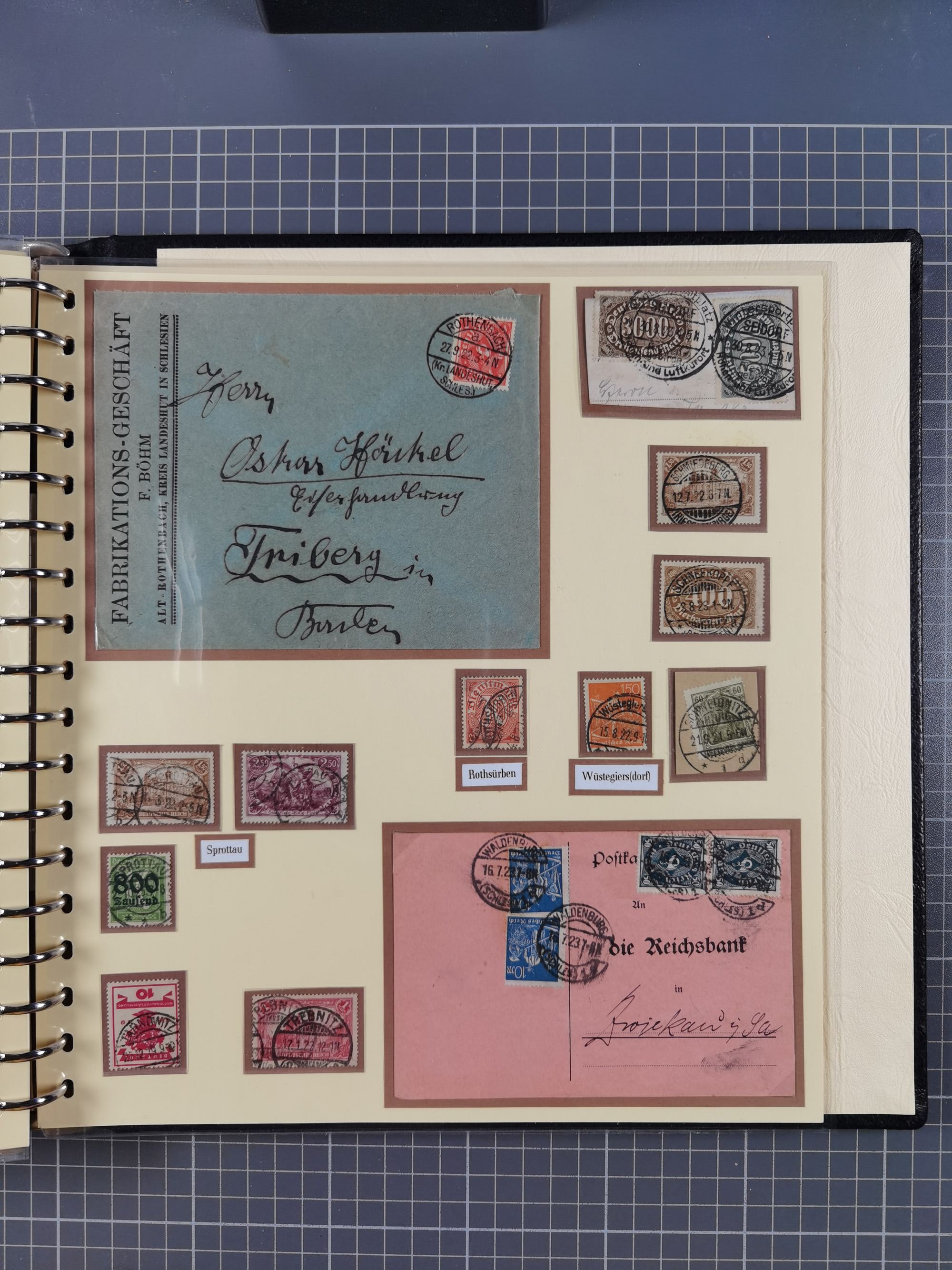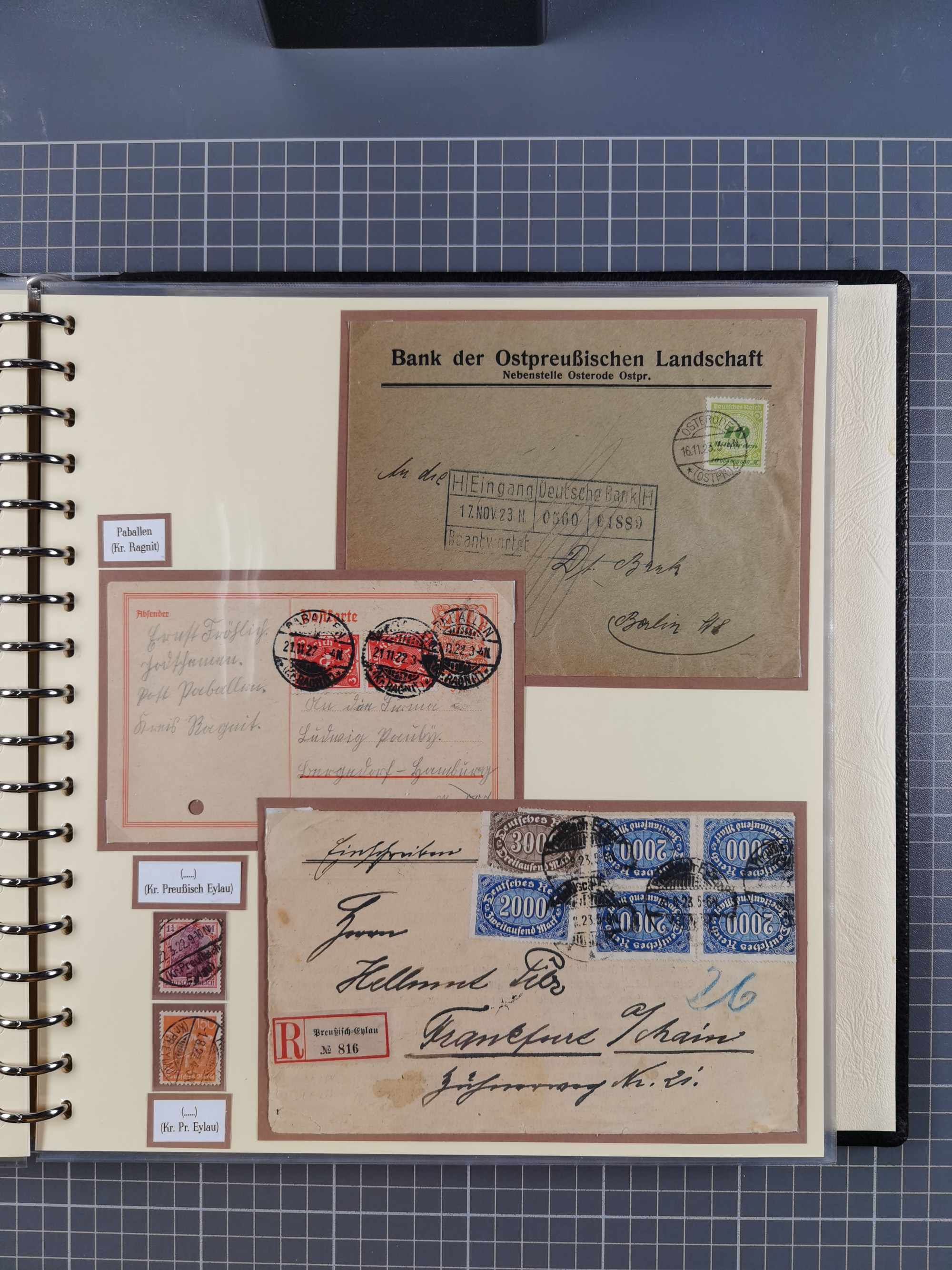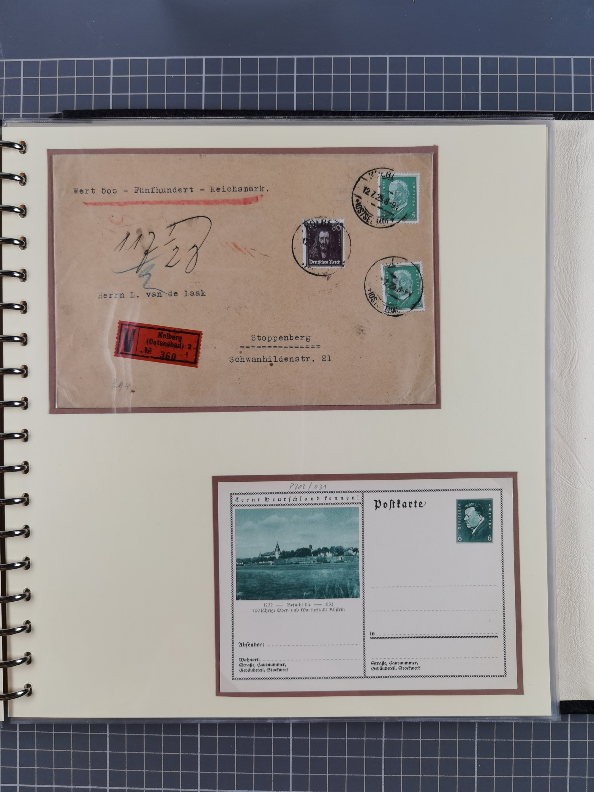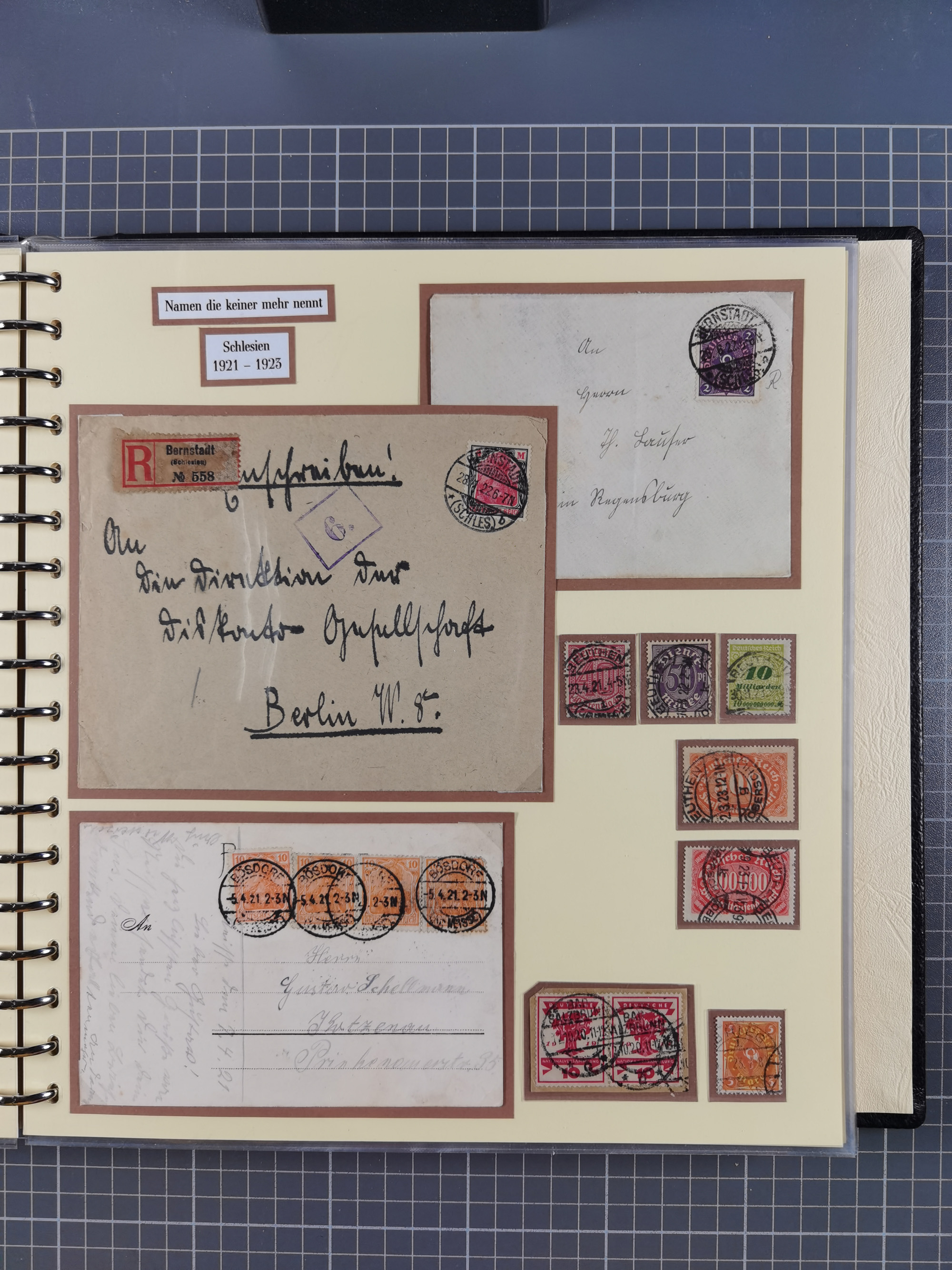 1865/1950 (ca.), Album mit 122 hochwertigen Belegen, diese einzeln vom Einlieferer beschrieben und nach Michel bewertet 15.000 €. Dazu ein Karton mit über 170 Briefen, Karten und Ganzsachen, dabei etliche interessante Belege, meist gute Erhaltung