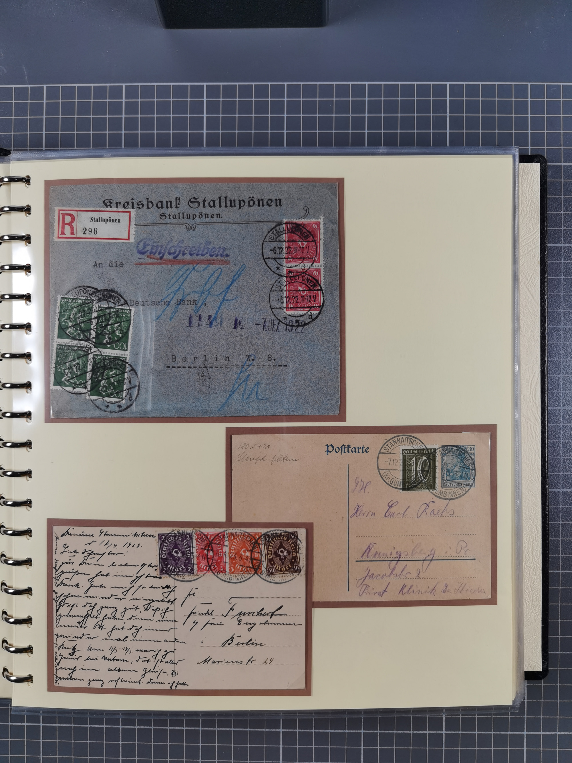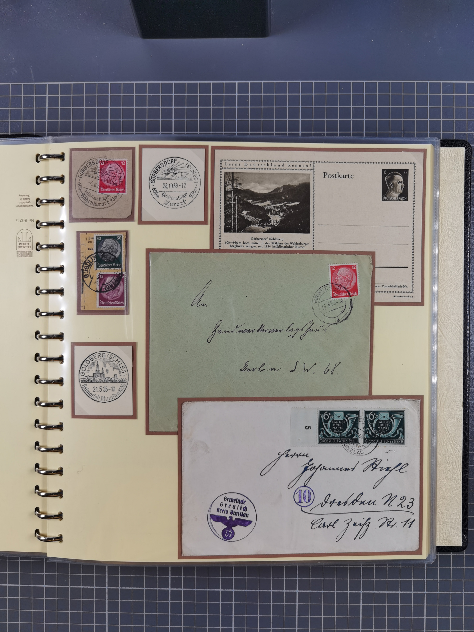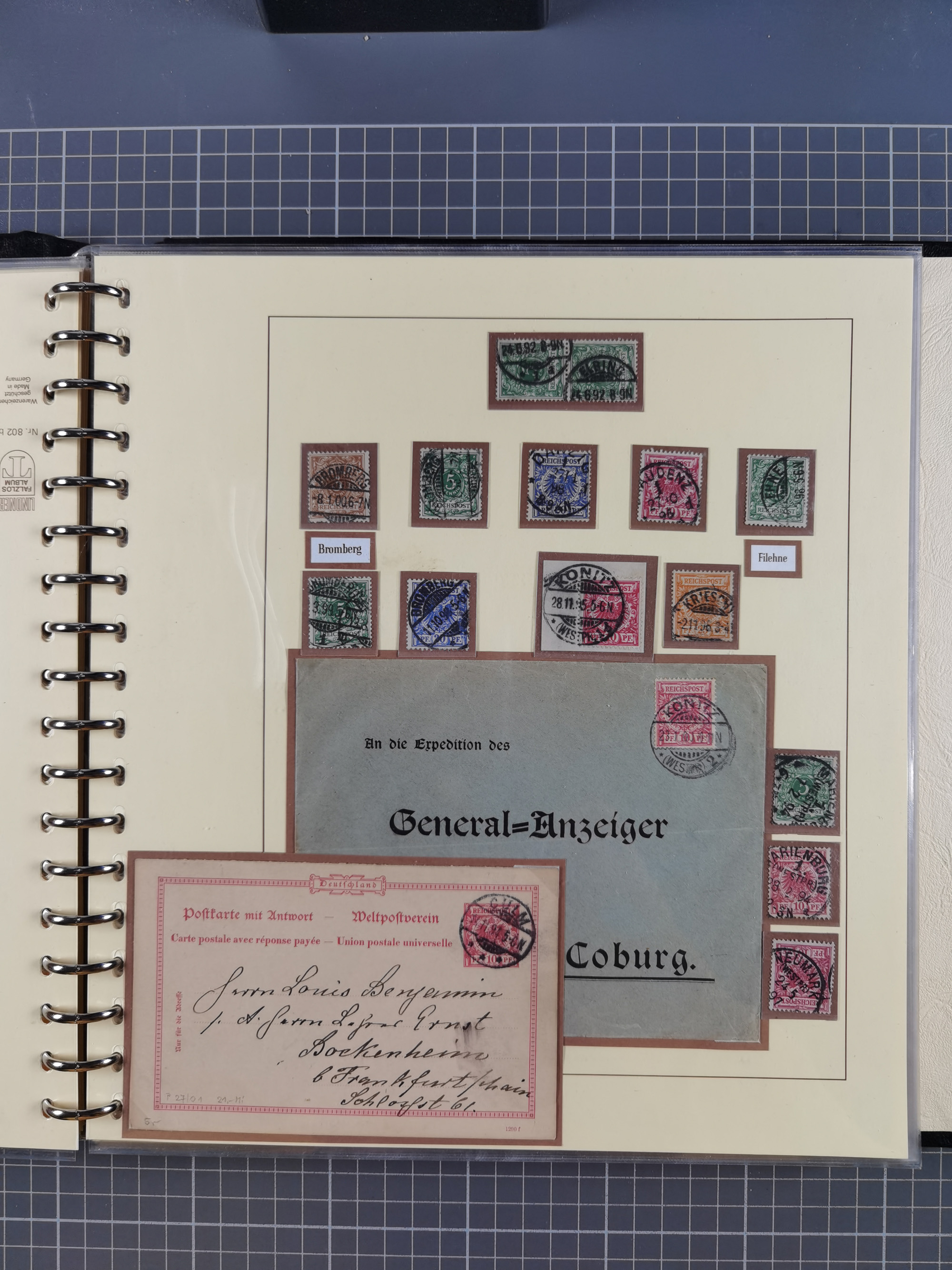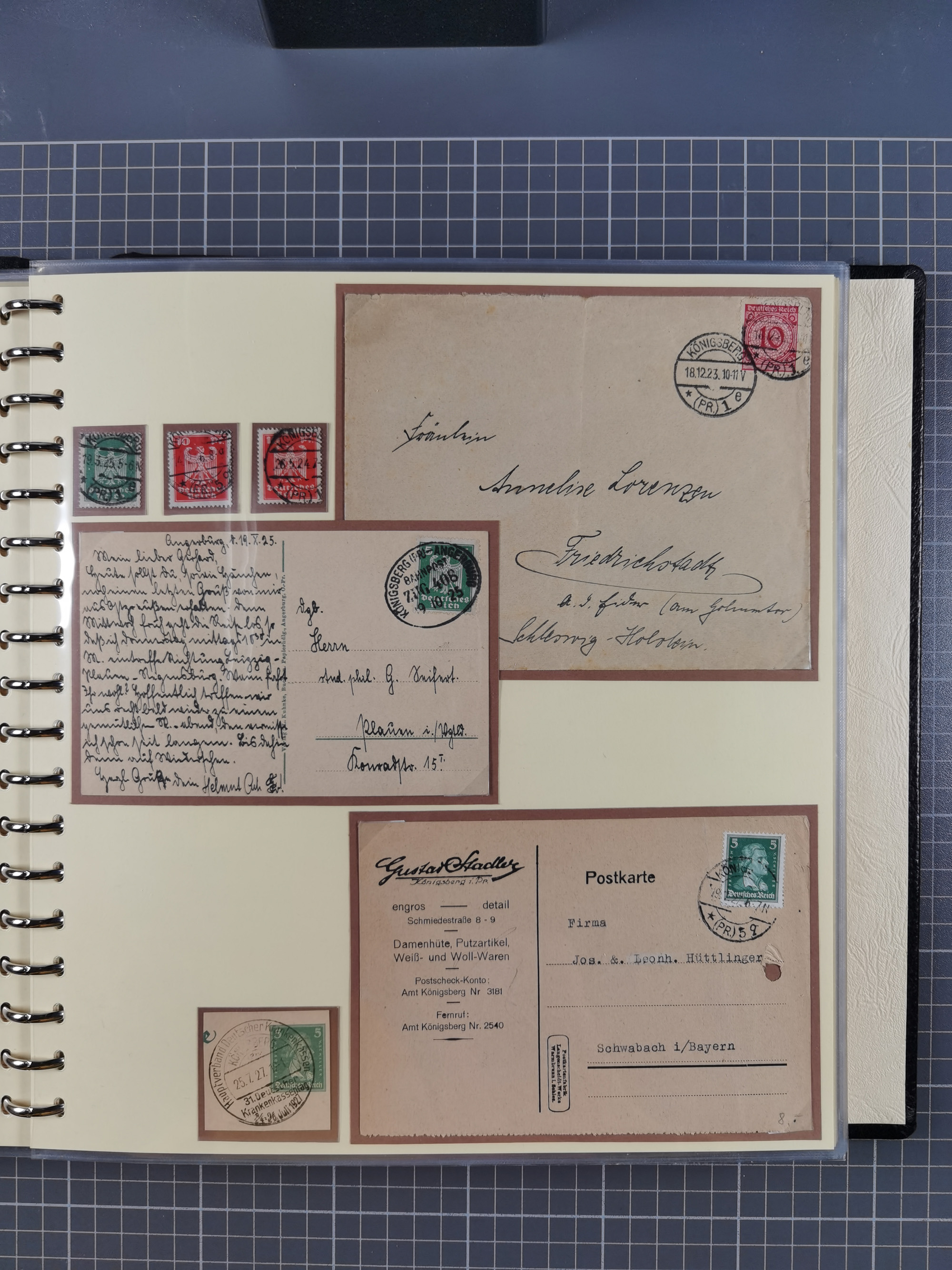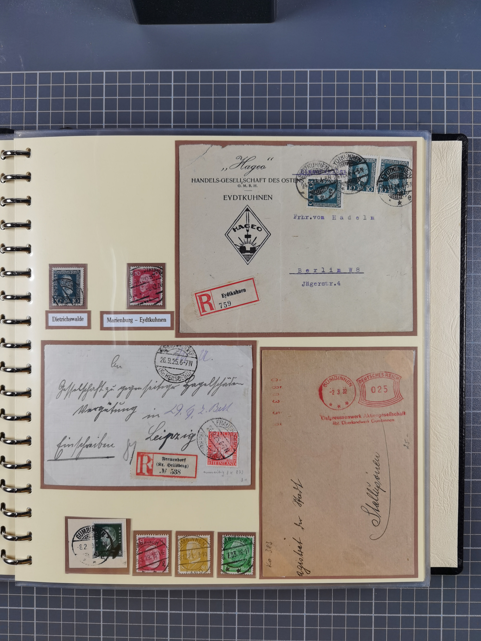 1865/1950 (ca.), Album mit 122 hochwertigen Belegen, diese einzeln vom Einlieferer beschrieben und nach Michel bewertet 15.000 €. Dazu ein Karton mit über 170 Briefen, Karten und Ganzsachen, dabei etliche interessante Belege, meist gute Erhaltung