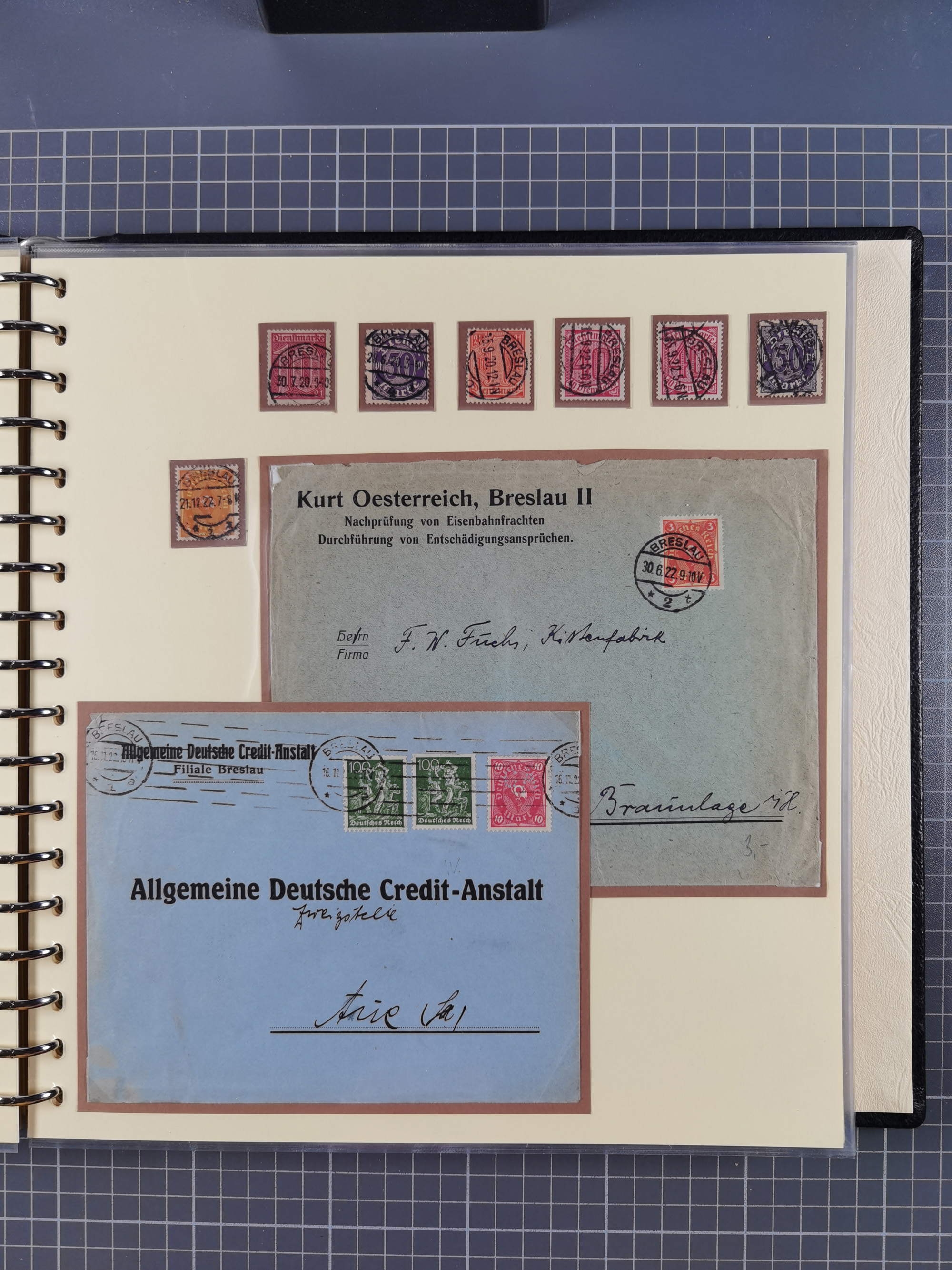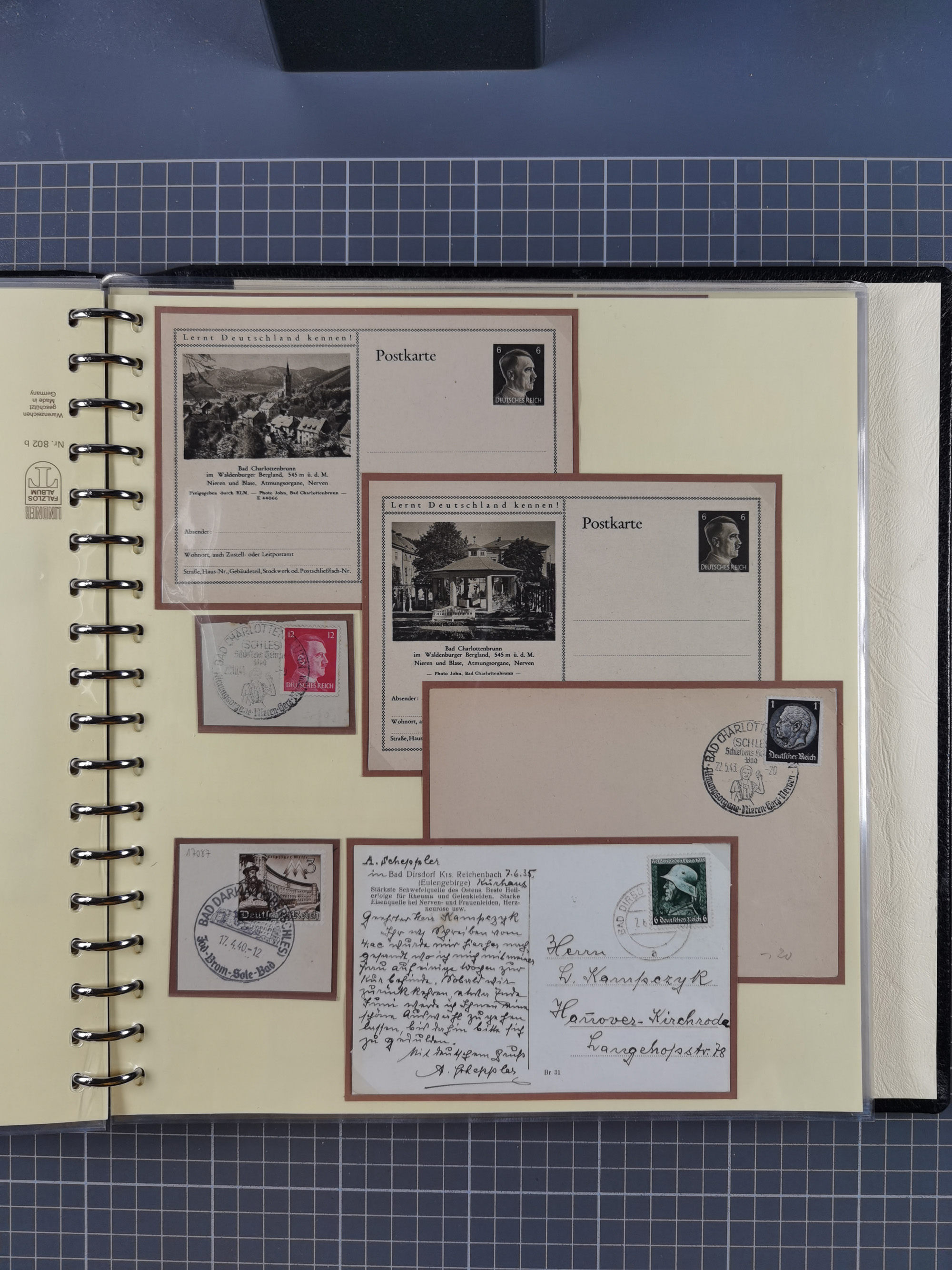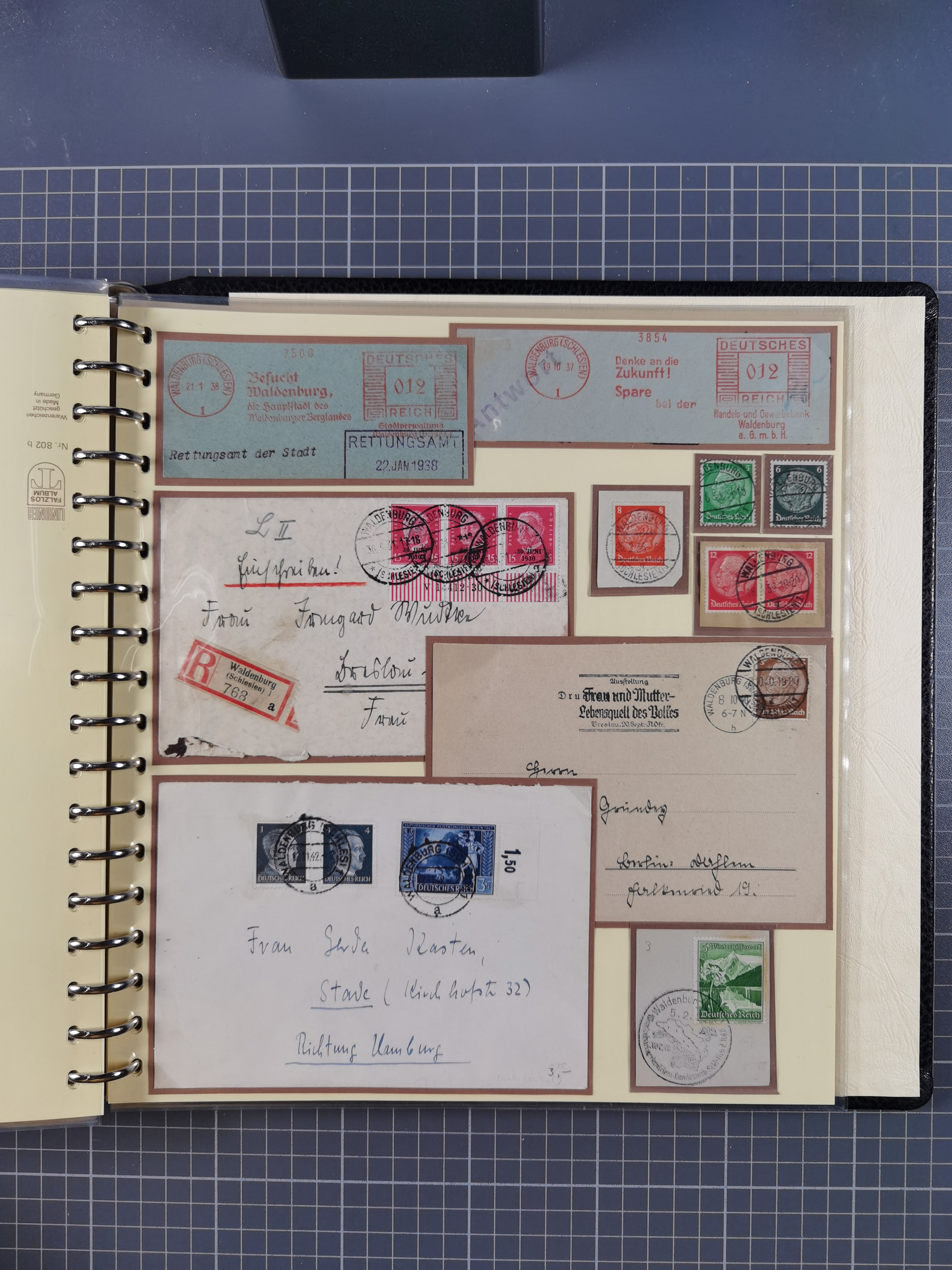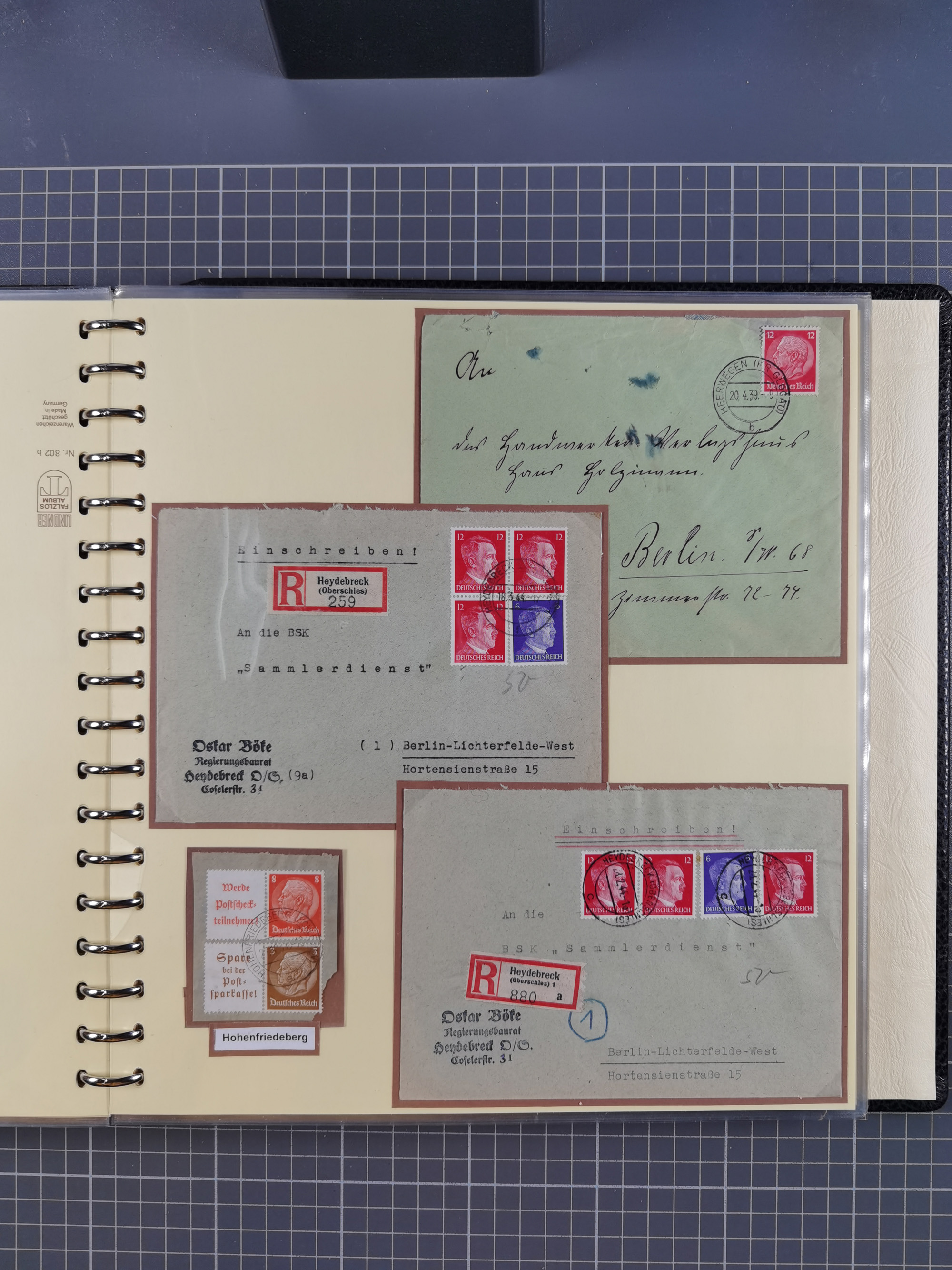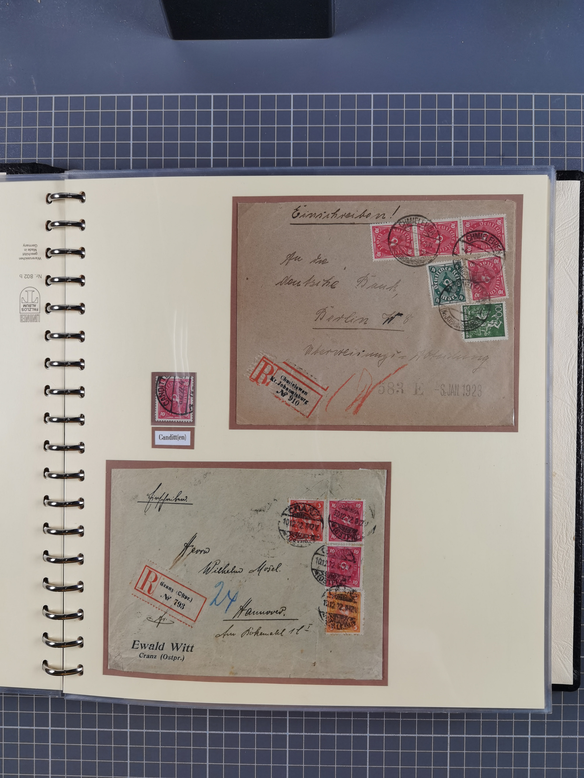 1865/1950 (ca.), Album mit 122 hochwertigen Belegen, diese einzeln vom Einlieferer beschrieben und nach Michel bewertet 15.000 €. Dazu ein Karton mit über 170 Briefen, Karten und Ganzsachen, dabei etliche interessante Belege, meist gute Erhaltung